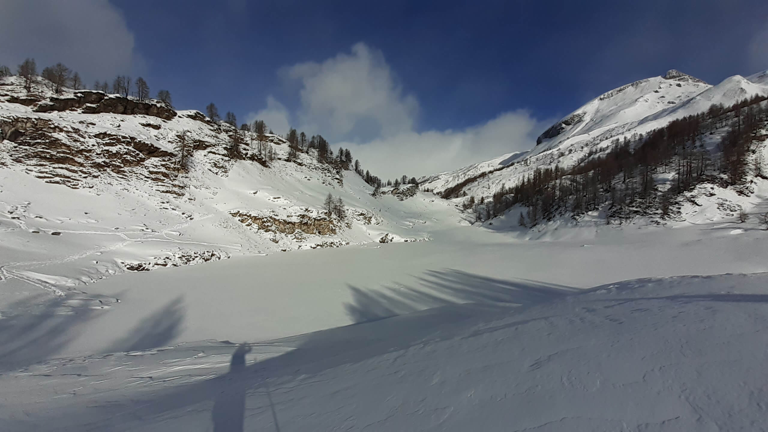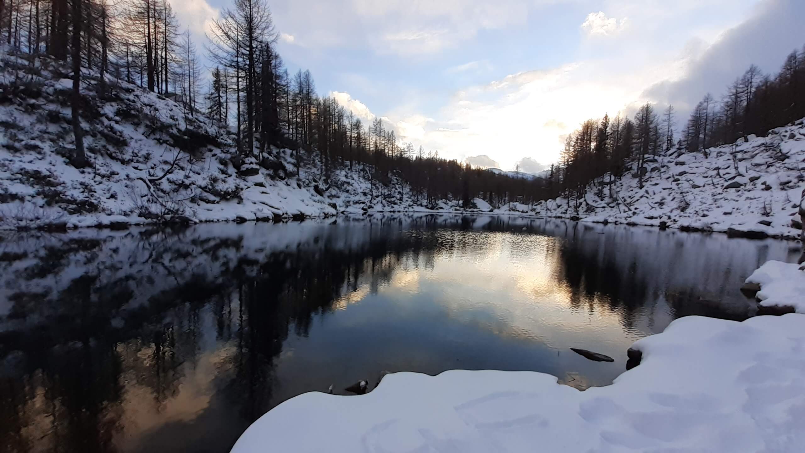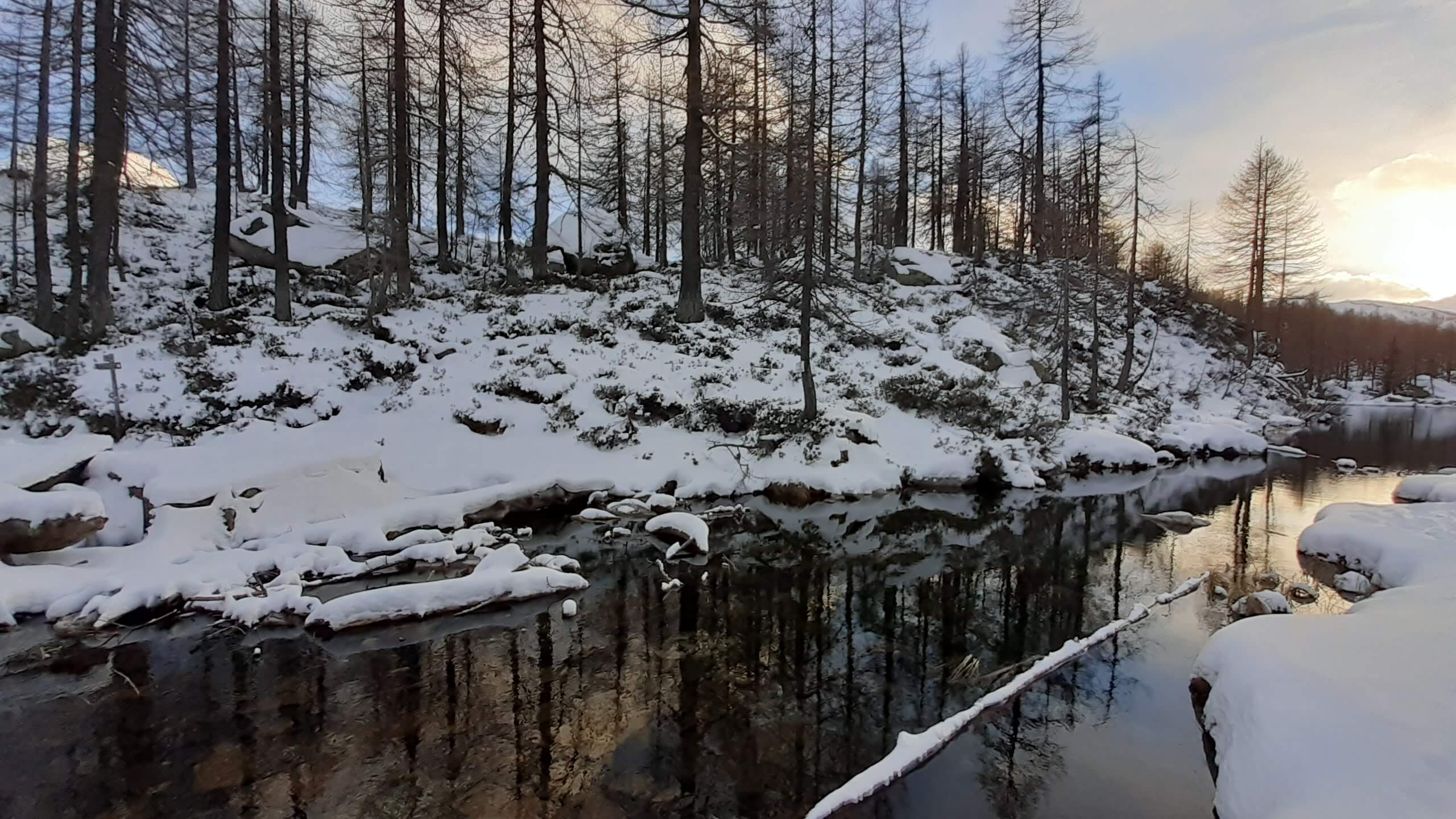 Oggi dobbiamo provare le ciaspole nuove! Quindi pensiamo ad un luogo dove ci sia tanta neve, magari anche fresca…. Alpe Devero! Partiamo dalla Piana dell’ Alpe Devero (1630 m) e, dopo il primo ponte, prendiamo a destra. Infiliamo subito le ciaspole… la neve c’ è, non tantissima ma adatta alle ciaspole. In poco arriviamo alla Corte d’ Ardui (1750 m), dove variamo il percorso estivo, che prosegue dritto, con quello tracciato su neve a destra, passando sul piccolo ponte. Saliamo ancora e arriviamo all’ ampio belvedere, dove facciamo una breve pausa-barretta e scattiamo tante foto! Continuiamo sempre su percorso tracciato e indicato dai cartelli bianco-rossi e arriviamo ad intercettare i tornanti che ci portano in breve all’ ultimo strappo… ed eccoci al Lago del Sangiatto Inferiore (1990 m)! Il panorama è già grandioso… il Monte Corbernas, il Monte Sangiatto e la distesa bianco-latte intatta del primo lago… stupendo! Proseguiamo poi fino all’ Alpe Sangiatto (2000 m), mentre la neve diventa più alta e il percorso inizia a perdersi; ci portiamo al di sopra del Lago del Sangiatto Medio e da qui la neve è completamente intatta e non c’ è più nessun segno di alcun passaggio precedente…. questi significa che, per arrivare al Lago del Sangiatto Superiore, è tutta da tracciare! Io e Francesco ci alterniamo e, un po’ io un po’ lui, apriamo un percorso tracciandolo fino al Lago del Sangiatto Superiore (2050 m)… le ciaspole nuove fanno il loro lavoro e la loro parte molto bene! Il terzo lago è una meraviglia davvero… oggi si presenta come una distesa bianchissima con le tipiche “onde di neve e ghiaccio scolpite dal vento”! Non ci fermiamo qui ma proseguiamo fino alla fine del lago. ATTENZIONE : noi abbiamo aperto e tracciato il percorso perché conosciamo molto bene la zona, soprattutto quella intorno al lago, e perché abbiamo già provato ad aprire percorsi su neve (è sempre consigliabile, con la neve, seguire i percorsi tracciati e battuti!) Cerchiamo un posticino dove mangiare il nostro panino, ma ci fermiamo pochissimo perché, oltre al freddo pungente, soffia anche il vento che abbassa ulteriormente la temperatura avvertita. Indosso il terzo giubbino, oltre ai doppi guanti, e iniziamo la discesa. Piccola sosta al Lago del Sangiatto Inferiore (1990 m) e poi salutiamo questo bellissimo luogo e scendiamo verso la Corte d’ Ardui (1750 m). Qui decidiamo di proseguire per Crampiolo, passando dal Motto di Crampiolo (1765 m). Il piccolo villaggio alpino di Crampiolo (1770 m) è sempre stupendo e si è anche calmato il vento, anche se iniziano ad arrivare grosse nuvole! Parecchie foto e poi raggiungiamo anche il vicino Lago delle Streghe (1780 m) (o Lago Azzurro), oggi circondato da soffice neve e con il valore aggiunto dei tiepidi colori del tramonto che abbelliscono questo piccolo laghetto già bello di suo! Fa sempre più freddo ed è anche arrivato il momento di tornare indietro… acceleriamo in discesa e in poco siamo di nuovo alla Piana dell’ Alpe Devero (1630 m)… ormai la luce è sempre più debole e la sera già molto vicina. Salutiamo l’ Alpe Devero e torniamo alla nostra macchina… felici e soddisfatti di questa spettacolare giornata in montagna!