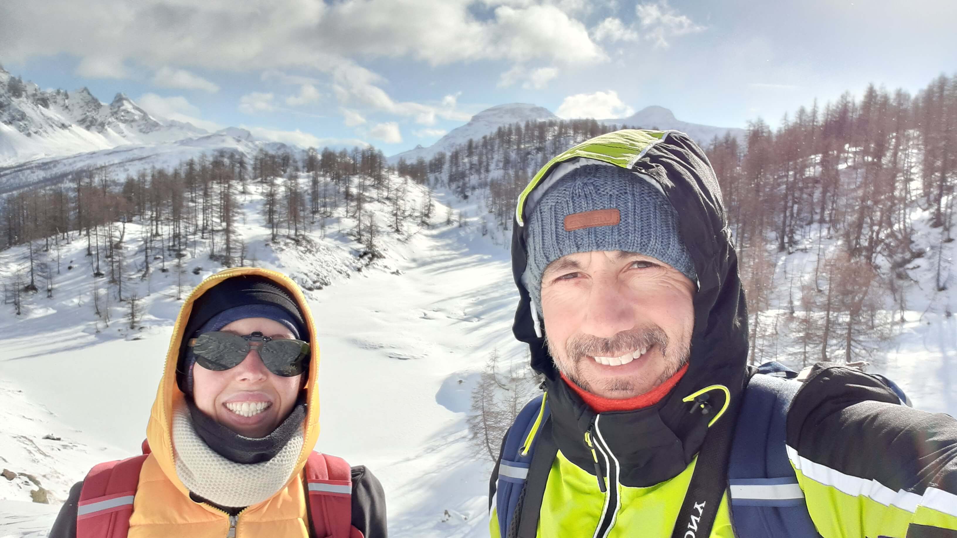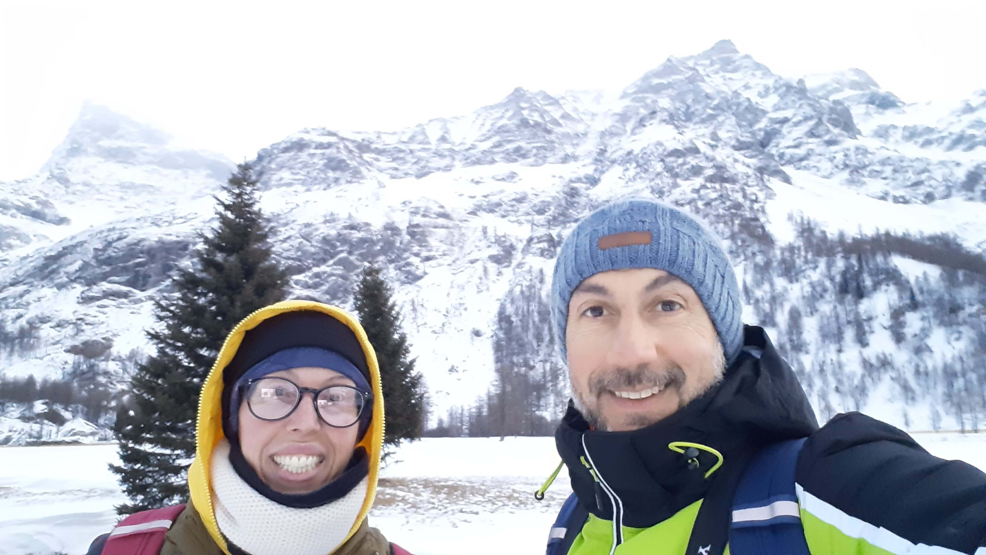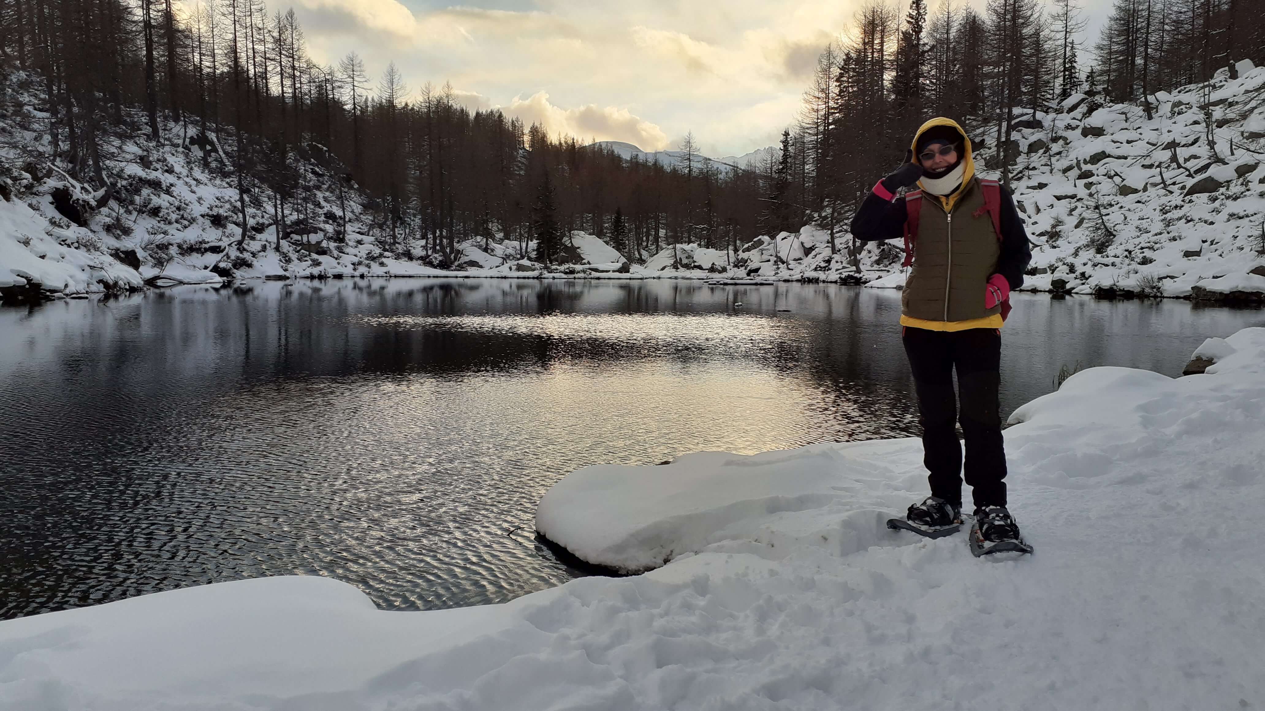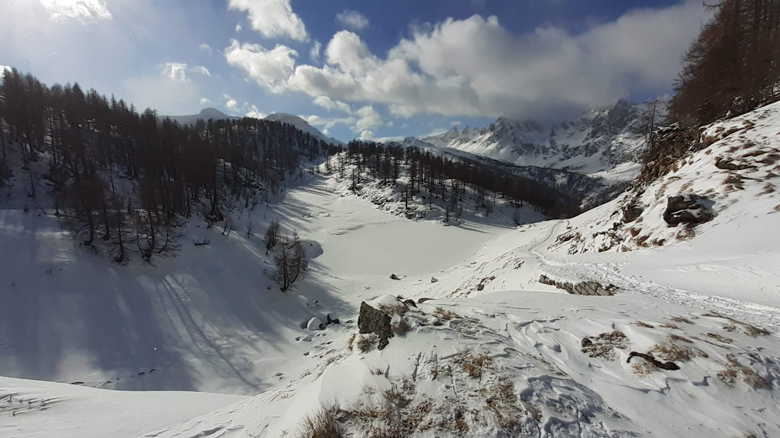 Oggi dobbiamo provare le ciaspole nuove! Quindi pensiamo ad un luogo dove ci sia tanta neve, magari anche fresca…. Alpe Devero! Partiamo dalla Piana dell’ Alpe Devero (1630 m) e, dopo il primo ponte, prendiamo a destra. Infiliamo subito le ciaspole… la neve c’ è, non tantissima ma adatta alle ciaspole. In poco arriviamo alla Corte d’ Ardui (1750 m), dove variamo il percorso estivo, che prosegue dritto, con quello tracciato su neve a destra, passando sul piccolo ponte. Saliamo ancora e arriviamo all’ ampio belvedere, dove facciamo una breve pausa-barretta e scattiamo tante foto! Continuiamo sempre su percorso tracciato e indicato dai cartelli bianco-rossi e arriviamo ad intercettare i tornanti che ci portano in breve all’ ultimo strappo… ed eccoci al Lago del Sangiatto Inferiore (1990 m)! Il panorama è già grandioso… il Monte Corbernas, il Monte Sangiatto e la distesa bianco-latte intatta del primo lago… stupendo! Proseguiamo poi fino all’ Alpe Sangiatto (2000 m), mentre la neve diventa più alta e il percorso inizia a perdersi; ci portiamo al di sopra del Lago del Sangiatto Medio e da qui la neve è completamente intatta e non c’ è più nessun segno di alcun passaggio precedente…. questi significa che, per arrivare al Lago del Sangiatto Superiore, è tutta da tracciare! Io e Francesco ci alterniamo e, un po’ io un po’ lui, apriamo un percorso tracciandolo fino al Lago del Sangiatto Superiore (2050 m)… le ciaspole nuove fanno il loro lavoro e la loro parte molto bene! Il terzo lago è una meraviglia davvero… oggi si presenta come una distesa bianchissima con le tipiche “onde di neve e ghiaccio scolpite dal vento”! Non ci fermiamo qui ma proseguiamo fino alla fine del lago. ATTENZIONE : noi abbiamo aperto e tracciato il percorso perché conosciamo molto bene la zona, soprattutto quella intorno al lago, e perché abbiamo già provato ad aprire percorsi su neve (è sempre consigliabile, con la neve, seguire i percorsi tracciati e battuti!) Cerchiamo un posticino dove mangiare il nostro panino, ma ci fermiamo pochissimo perché, oltre al freddo pungente, soffia anche il vento che abbassa ulteriormente la temperatura avvertita. Indosso il terzo giubbino, oltre ai doppi guanti, e iniziamo la discesa. Piccola sosta al Lago del Sangiatto Inferiore (1990 m) e poi salutiamo questo bellissimo luogo e scendiamo verso la Corte d’ Ardui (1750 m). Qui decidiamo di proseguire per Crampiolo, passando dal Motto di Crampiolo (1765 m). Il piccolo villaggio alpino di Crampiolo (1770 m) è sempre stupendo e si è anche calmato il vento, anche se iniziano ad arrivare grosse nuvole! Parecchie foto e poi raggiungiamo anche il vicino Lago delle Streghe (1780 m) (o Lago Azzurro), oggi circondato da soffice neve e con il valore aggiunto dei tiepidi colori del tramonto che abbelliscono questo piccolo laghetto già bello di suo! Fa sempre più freddo ed è anche arrivato il momento di tornare indietro… acceleriamo in discesa e in poco siamo di nuovo alla Piana dell’ Alpe Devero (1630 m)… ormai la luce è sempre più debole e la sera già molto vicina. Salutiamo l’ Alpe Devero e torniamo alla nostra macchina… felici e soddisfatti di questa spettacolare giornata in montagna!