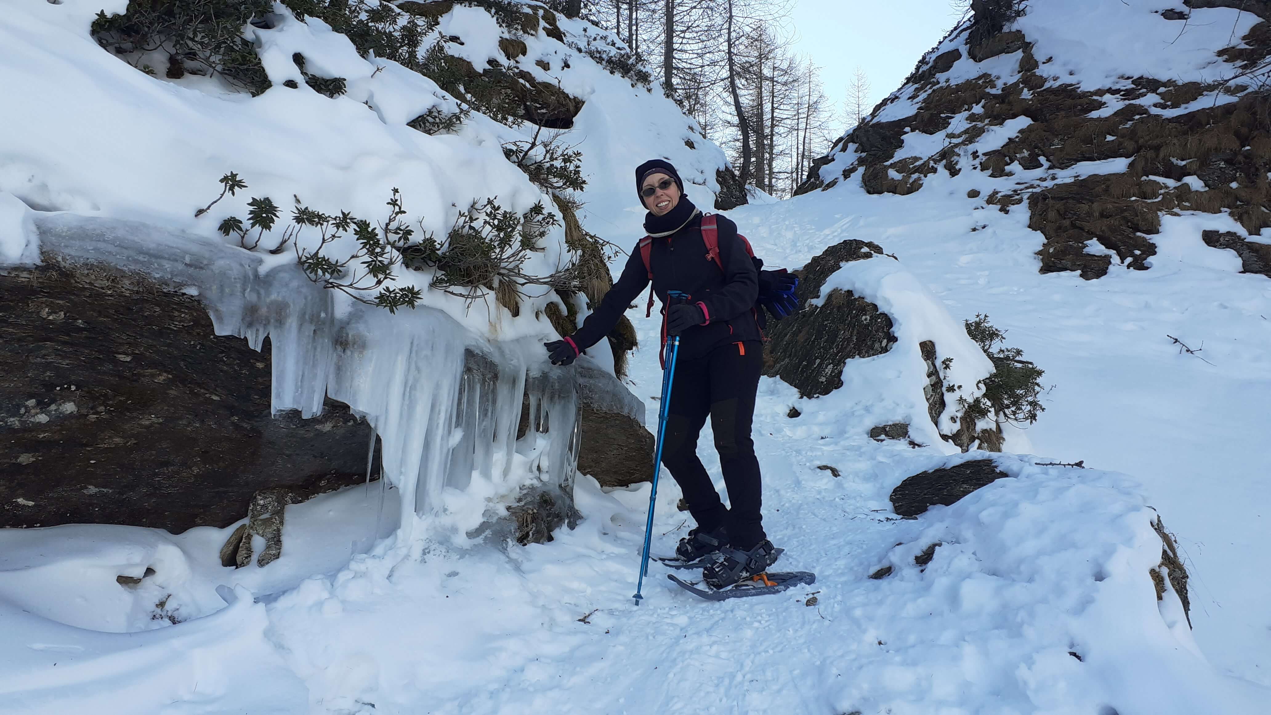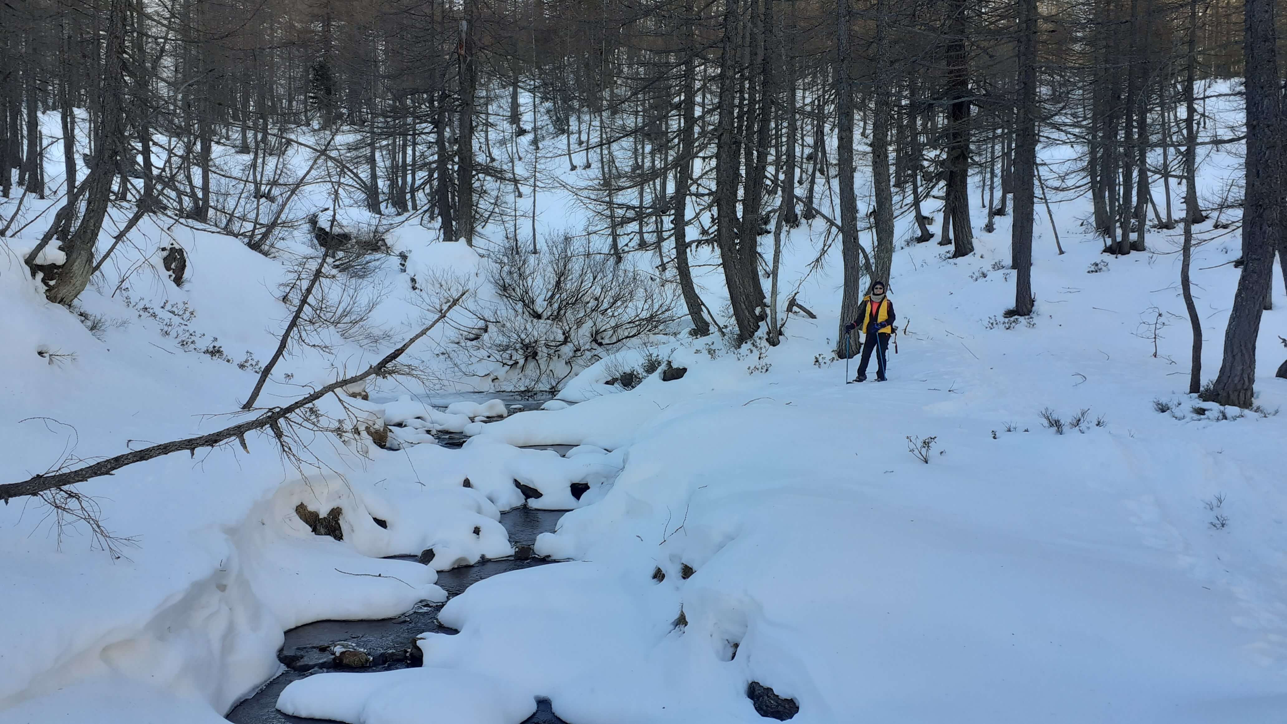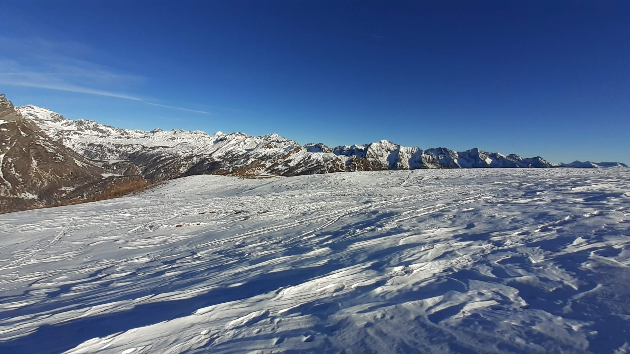 Oggi organizziamo un’ altra ciaspolata! Quest’ anno la neve è poca in tante zone, quindi toniamo a Devero dove di sicuro la neve è più presente rispetto ad altri luoghi. Partiamo dall’ inizio della Piana dell’ Alpe Devero (1630 m) e raggiungiamo la località Pedemonte (1645 m), dove infiliamo le ciaspole… la consistenza della neve ci consente di metterle e le terremo tutto il giorno. Passiamo il piccolo ponte a sinistra e saliamo… alcuni tratti ripidi, altri meno ma il percorso è sempre tracciato e ben visibile. Qualche foto nei pressi del piccolo ponte poco prima di arrivare all’ Alpe Misanco (1907 m), dove facciamo una piccola pausa barretta. Lasciandoci l’ Alpe Misanco alle spalle, saliamo tenendo la sinistra. Il percorso è piuttosto lungo ma è tracciato bene e salire al centro di questo meraviglioso ambiente è davvero unico ed emozionante! Il Monte Cervandone ci accompagna per tutto il percorso ed ecco che spuntano anche il Pizzo Diei e il Monte Cistella, mentre la forma inconfondibile del Monte Cazzola inizia ad apparire. Proseguiamo… ultimo strappo… ultimo sforzo… e siamo in prossimità della vetta, dove dobbiamo togliere le ciaspole perché in prossimità della croce non c’ è neve. La vetta del Monte Cazzola (2340 m) è molto panoramica… Monte Cervandone, Pizzo Diei, Monte Cistella, Punta d’ Orogna, il versante del Grande Est! Qui mangiamo il nostro panino… sotto il sole e con una temperatura perfetta! Foto su foto e poi infiliamo di nuovo le ciaspole e iniziamo la discesa. Poco sopra l’ Alpe Misanco (1907 m) prendiamo a sinistra… verso il Lago Nero. Il primo tratto è piuttosto ripido, poi il percorso “spiana” un po’ e ci porta fino allo stupendo Lago Nero (1990 m)… coperto di bianchissima neve. Percorriamo il versante a destra del Lago e decidiamo di scendere anche in Val Buscagna… uno spettacolo bellissimo… siamo al centro di una immensa meraviglia! La Val Buscagna è stupenda… io la chiamo “il mio piccolo Canada”. Arriviamo fino al piccolo ponte di legno (1970 m) dove facciamo una piccola sosta per le foto. Avendo visto che il percorso di discesa dalla Val Buscagna verso la Piana dell’ Alpe Devero è quasi libero della neve e volendo evitare di dover togliere le ciaspole e doverle portare sulle zaino, decidiamo di salire di nuovo al Lago Nero e rifare lo stesso percorso dell’ andata. Quindi torniamo al Lago Nero (1990 m), scendiamo poi ancora all’ Alpe Misanco (1907 m), dove ci fermiamo per una piccola pausa barretta, poi giù fino a Pedemonte (1645 m) e infine eccoci all’ inizio della Piana dell’ Alpe Devero (1630 m). Giornata spettacolare… splendida… soddisfacente… una giornata da ricordare!
