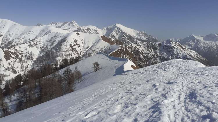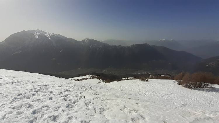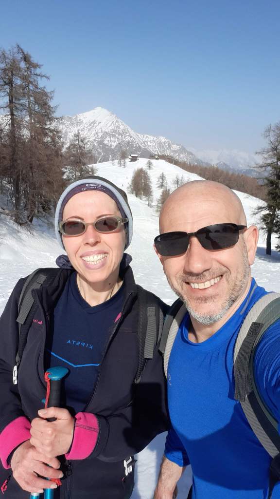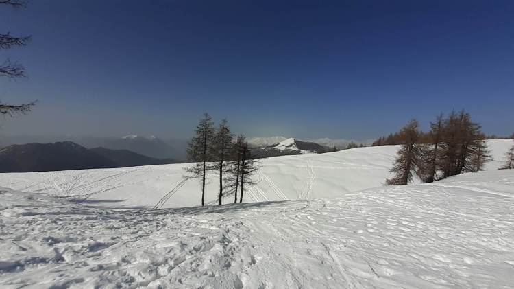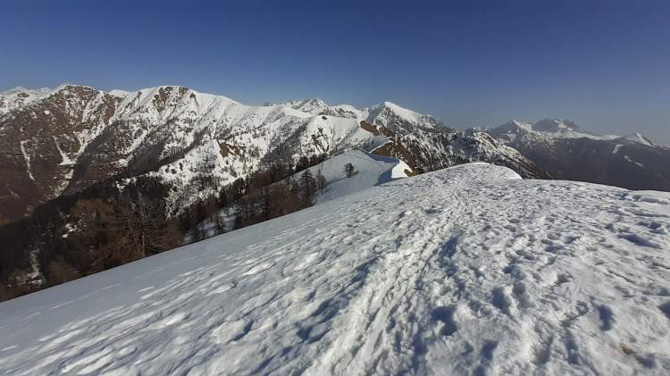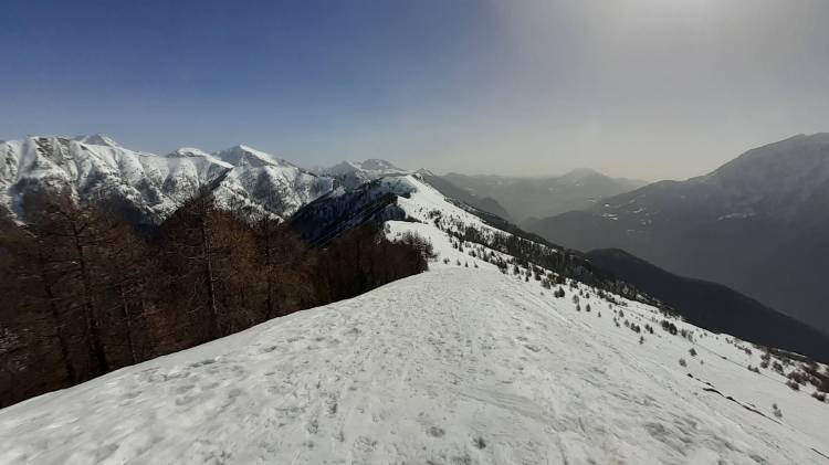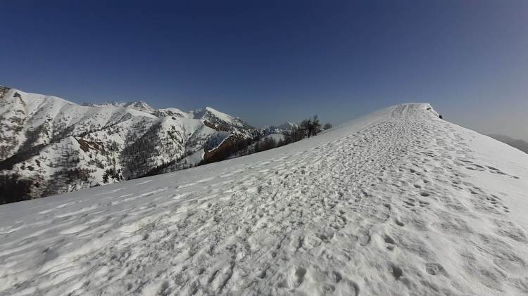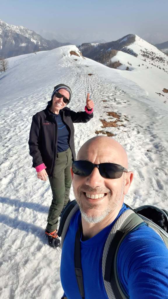 Oggi giornata extra in montagna!! Decidiamo di tornare in Valsassina, in un luogo al quale avevamo dovuto rinunciare, qualche settimana fa, per l’ affollamento e il parcheggio strapieno. Arriviamo all’ Alpe di Paglio (1400 m) e, calzati i ramponi, ci portiamo sotto la pista da sci (vuota e con gli impianti fermi e chiusi). Saliamo su ripido pendio che, in prossimità della Cima del Laghetto, diventa più dolce. Ancora un piccolo tratto e siamo alla Cima del Laghetto (1730 m)… piccola pausa per “riprendere fiato” e poi si continua verso il Cimone di Margno. Il panorama è molto bello, anche se “rovinato” in parte dalla presenza dei tralicci. Proseguiamo e arriviamo al Cimone di Margno (1800 m)… brevissima sosta e poi scendiamo verso Cantone Grande (1740 m), una piccola altura dove ci fermiamo a mangiare. Pausa pranzo, foto su foto… non ci sono più i tralicci che “disturbano” il paesaggio! Continuiamo verso il Larice Bruciato (1708 m), in prossimità del quale è posizionato un piccolo monumento, dove non ci fermiamo… un po’ troppa gente, ci fermeremo al ritorno. Saliamo, con ripidità costante, verso la Cima di Olino (1780 m) e qui si apre un panorama eccezionale! La vista della Grigna, che sembra quasi di toccare, apre la visuale a un alternarsi di vette, cime, pendii… semplicemente uno spettacolo! Qui il nostro percorso si dovrebbe fermare, ma siamo attratti dalla cresta di collegamento che procede oltre la Cima di Olino e che mostra un passaggio sotto il “filo di cresta” davvero bellissimo, ma molto esposto e che può anche risultare pericoloso in alcuni punti. Decidiamo di percorrerne almeno un tratto e, con molta attenzione e prudenza, procediamo per circa 400 m…. stupendo, bellissimo, emozionante! Torniamo poi alla Cima di Olino (1780 m)… pausa e decine e decine di altre foto! E’ arrivato il momento di salutare questo posto incredibilmente bello e scendiamo di nuovo in direzione del Larice Bruciato (1708 m). Da qui scegliamo di proseguire verso Pian delle Betulle per chiudere così un bellissimo percorso ad anello. La discesa è piuttosto tranquilla, su comodo sentiero quasi sempre ampio che ci porta a Pian delle Betulle (1470 m). Ancora qualche foto e poi raggiungiamo l’ Alpe di Paglio (1400 m) e la nostra macchina. Emozione, soddisfazione, gioia… un’ altra meravigliosa giornata in montagna!