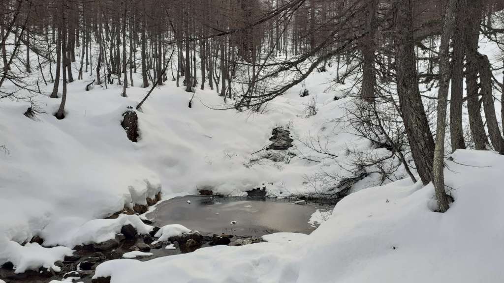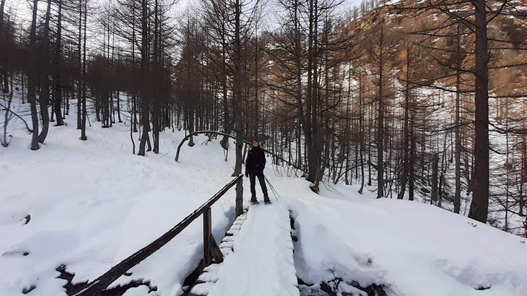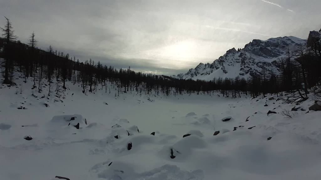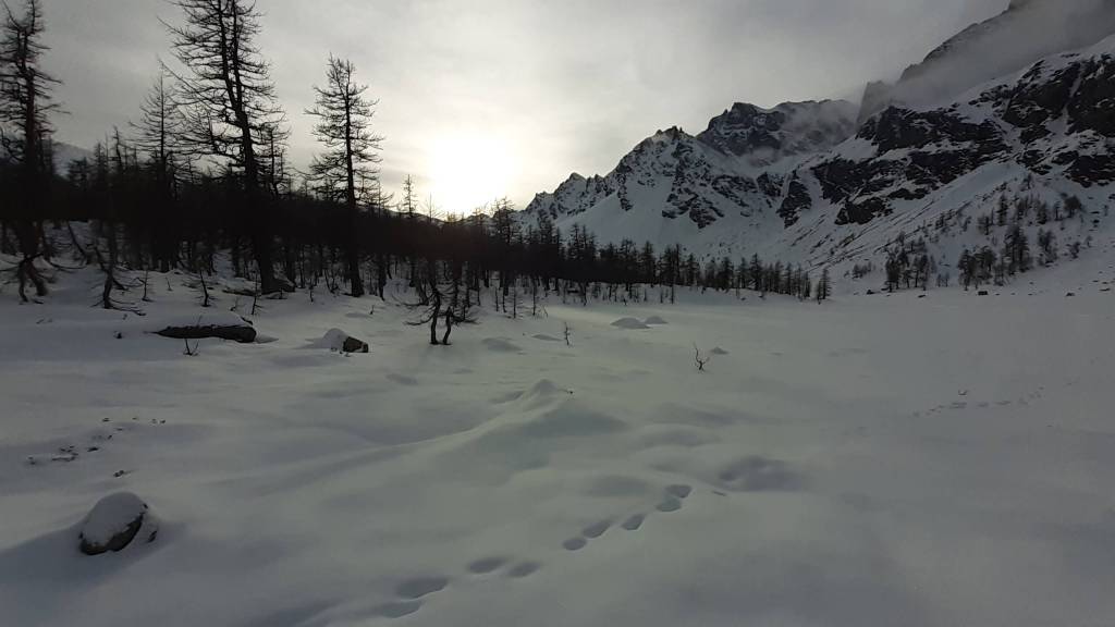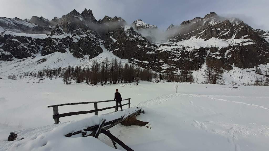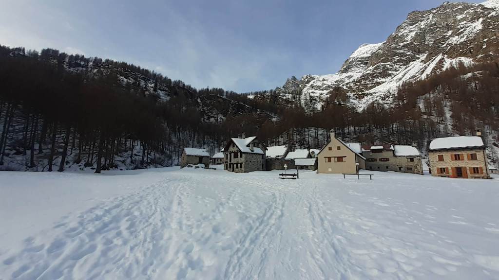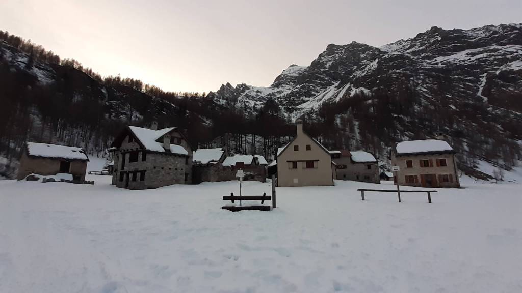 Oggi è l’ ultimo dell’ anno e decidiamo di trascorrerlo in montagna, all’ Alpe Devero. Partiamo dalla Piana dell’ Alpe Devero (1630 m) e raggiungiamo la frazione Pedemonte (1650 m). Oltrepassiamo il piccolo ponte e saliamo in direzione dell’ Alpe Misanco (1910 m). Il percorso fin qui è tracciato e sempre visibile. Piccola sosta e poi saliamo ancora; al bivio con il cartello per il Lago Nero, prendiamo a sinistra. Saliamo su percorso sempre visibile, a tratti però con debole traccia che ci porta fino all’ ultimo strappo per la vetta del Monte Cazzola (2340 m). Qui il panorama è davvero spettacolare! Monte Cistella, Pizzo Diei, Guglie del Cornera, Monte Cervandone, le vette del Grande Est… ci sono proprio tutti e sono davvero stupendi! Pausa panino sulla vetta e poi scendiamo. Al cartello per il Lago Nero, lo seguiamo e, seguendo la traccia a volte ripida, raggiungiamo il Lago Nero (1990 m)… uno spettacolo “da brivido”! Il Lago Nero coperto di bianco ci lascia senza parole! Foto su foto e poi ne raggiugiamo il lato opposto; scendiamo a destra e ci dirigiamo verso la bellissima Val Buscagna… il “mio piccolo Canada” vestito di bianco! Arriviamo fino al piccolo ponte e poi torniamo sui nostri passi. Saliamo di nuovo al Lago Nero (1990 m)… altra piccola sosta fotografica e di ammirazione e poi scendiamo, prima all’ Alpe Misanco (1910 m) e poi eccoci di ritorno a Pedemonte (1650 m) e alla Piana dell’ Alpe Devero (1630 m), dove ci aspetta un meraviglioso tramonto che chiude in bellezza una giornata davvero straordinaria!