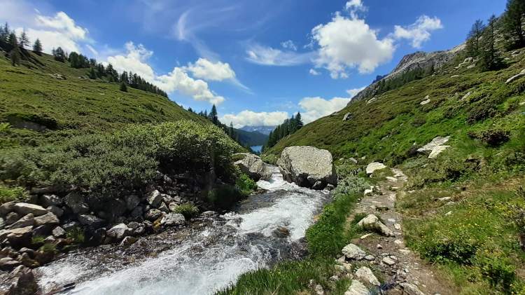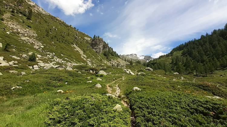 CARATTERISTICHE il percorso di oggi (primo giorno) fa parte del Grande Est del Devero; parte dal parcheggio di Cologno (area sosta camper), raggiunge la Piana di Devero, poi Crampiolo, sale a Codelago (Lago di Devero), percorre la sponda (metà periplo/giro completo) alla sinistra della diga di Codelago, sale ancora fino al Lago di Pianboglio, scende dal Lago di Pianboglio, percorre l’ altra metà del periplo (sponda opposta) di Codelago, torna a Crampiolo, alla Piana di Devero e, infine, al parcheggio di Cologno.