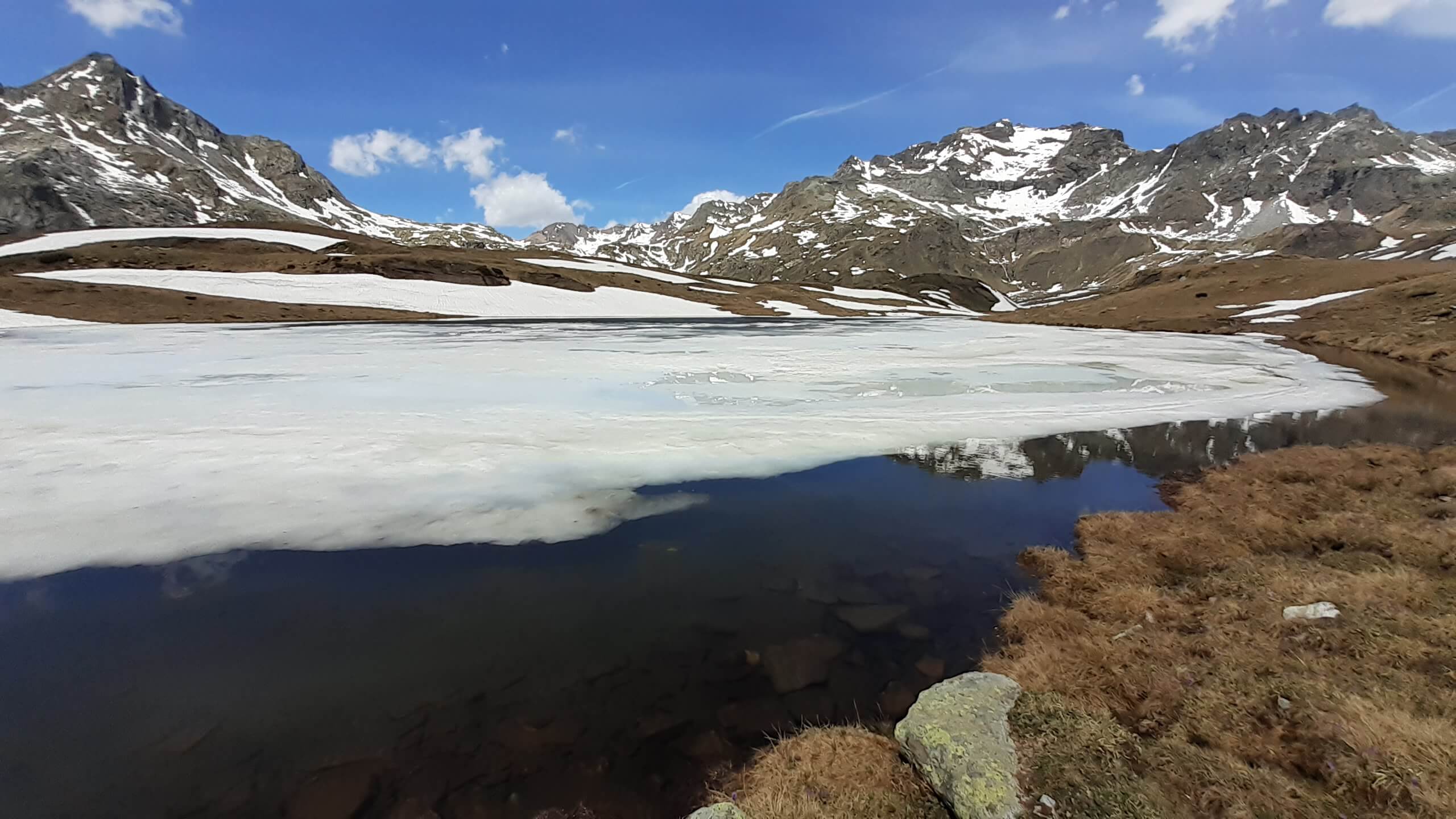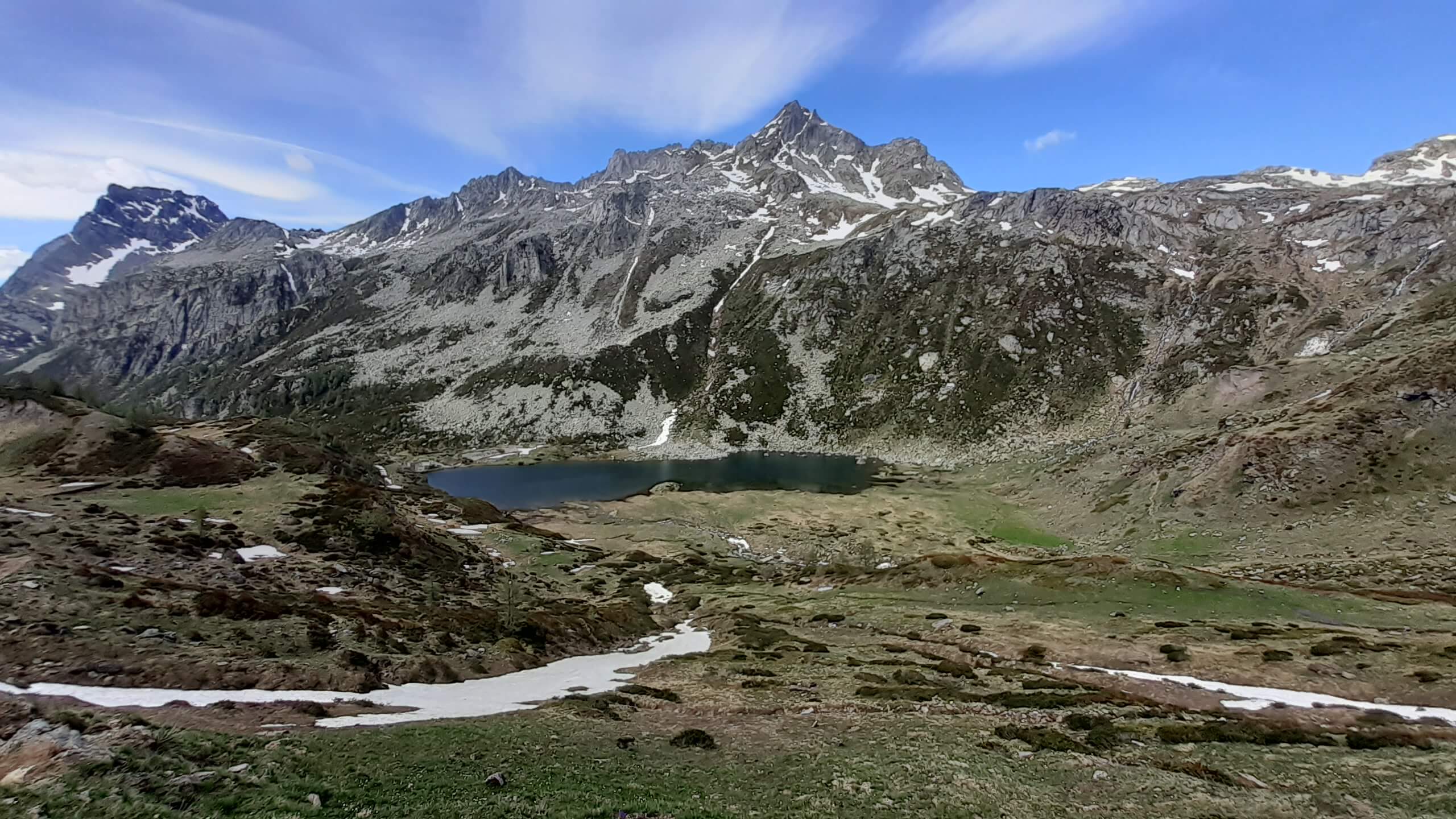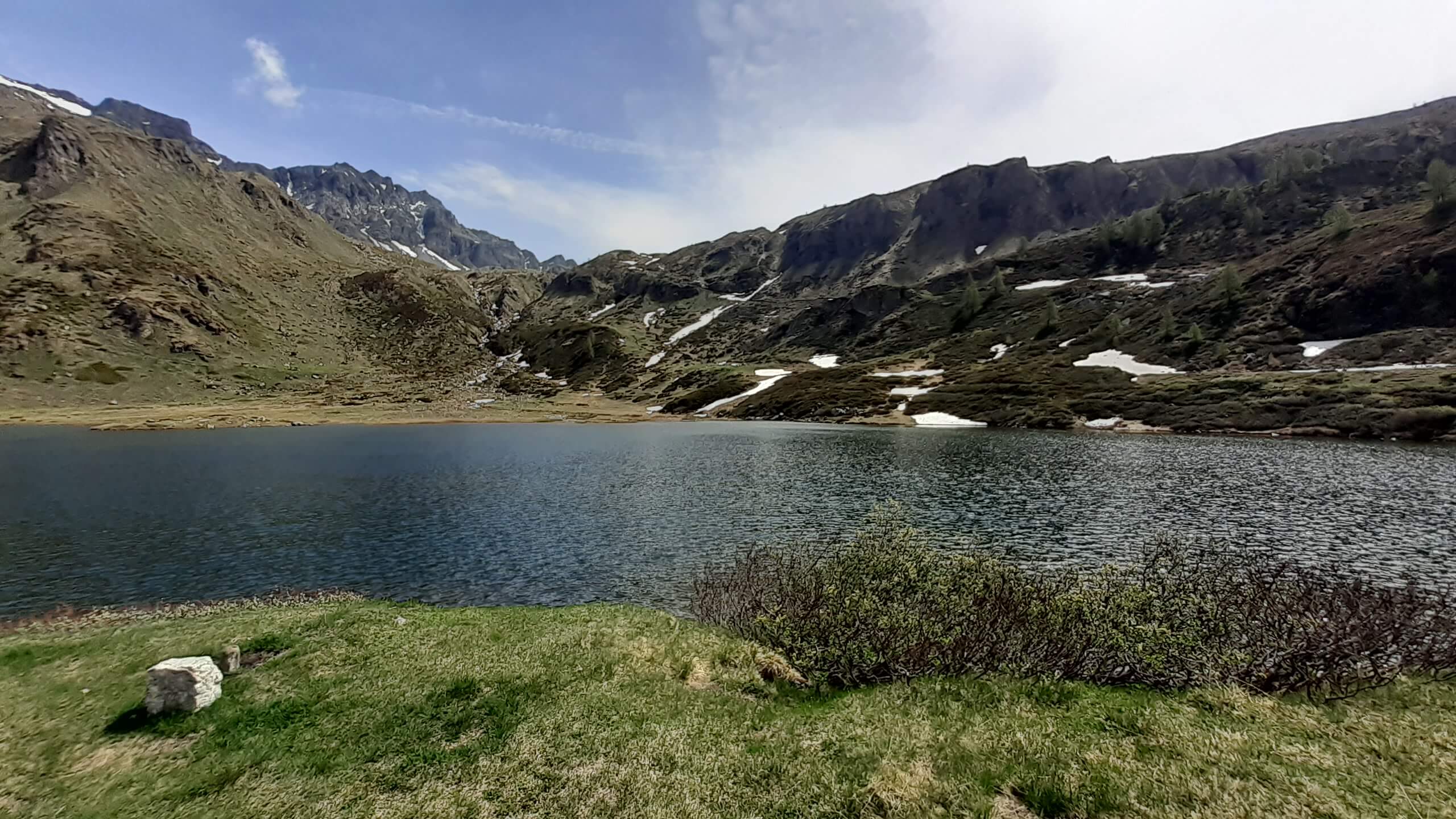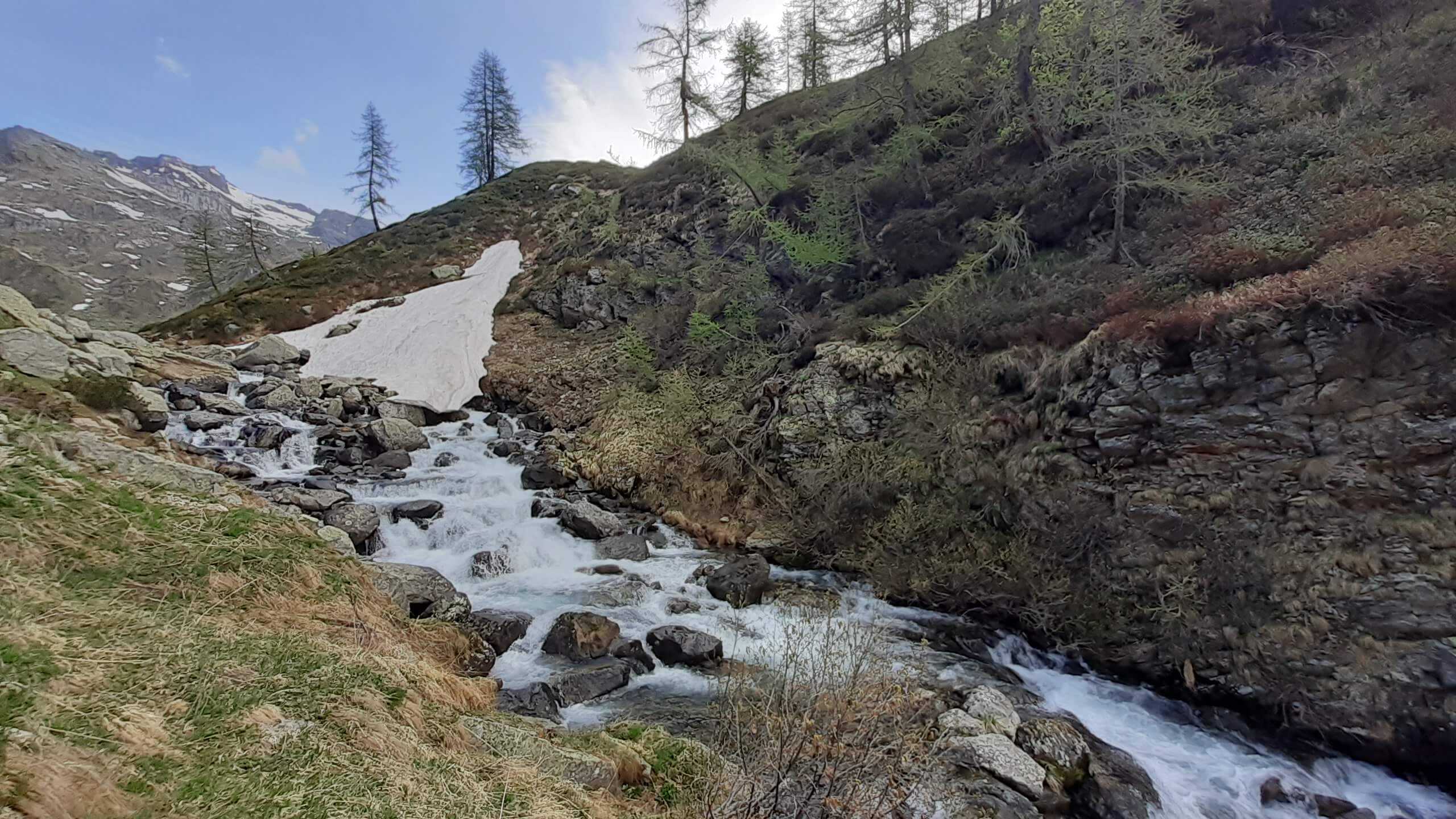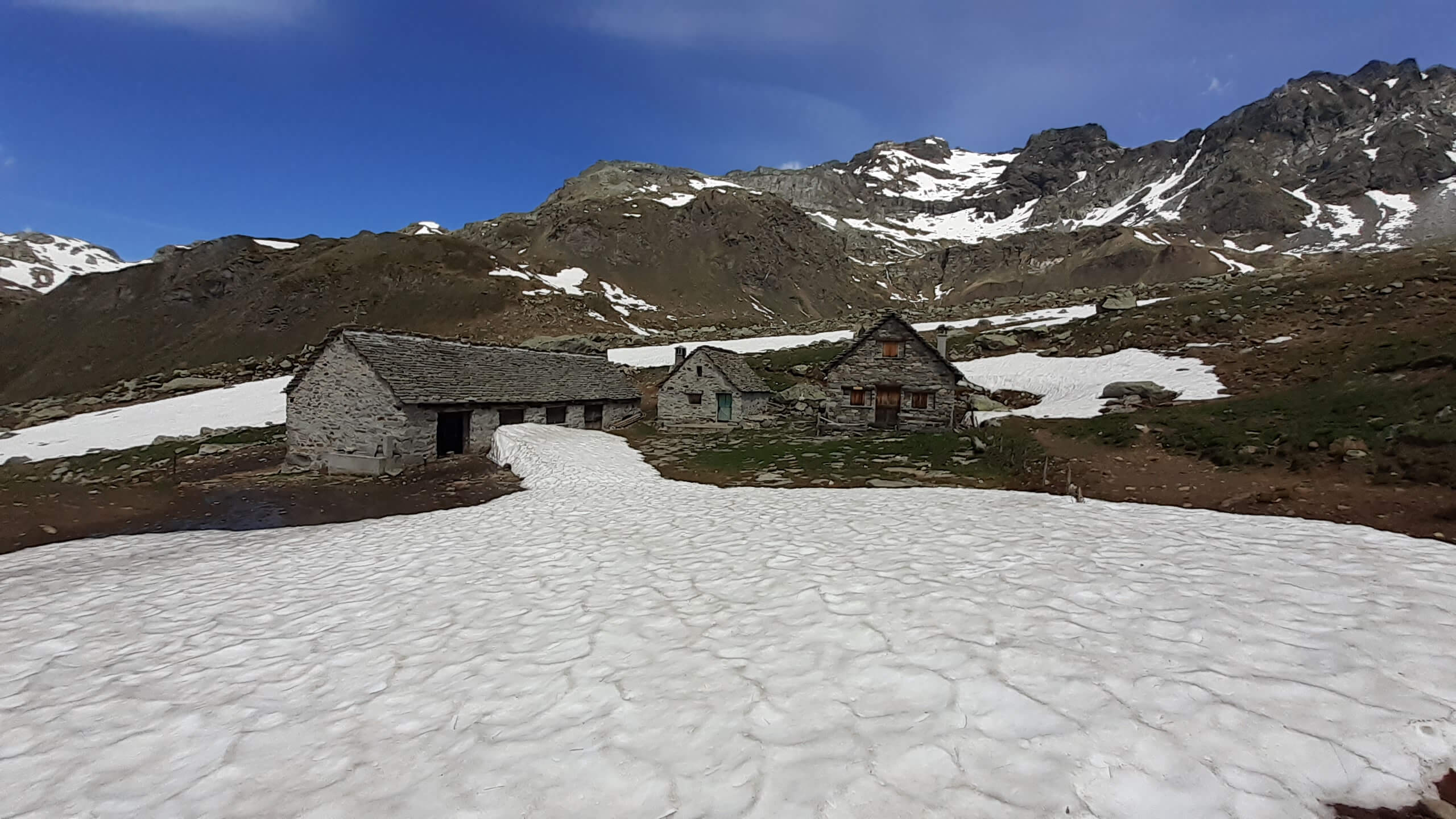 Oggi ci svegliamo a Devero! E… si parte di nuovo. Dal parcheggio di Cologno (1580 m) saliamo alla Piana dell’ Alpe Devero (1630 m) e, prendendo a sinistra, arriviamo alla località Pedemonte (1645 m), oltrepassiamo il ponte sul rio Buscagna e saliamo sul percorso a sinistra (indicazione “Lago Nero”). Arriviamo così all’ Alpe Misanco (1907 m), dove facciamo una piccola pausa-barretta. Lasciandoci poi l’ Alpe Misanco alle spalle e seguendo l’ indicazione su un cartello di legno, arriviamo al bellissimo Lago Nero (1990 m)… anche con poca acqua è uno spettacolo stupendo! Foto su foto e poi, percorrendone il versante a destra, arriviamo alla fine del lago e scendiamo a destra, verso la Val Buscagna che è una immensa valle dai colori rigogliosi. Al piccolo ponte poco distante ci dirigiamo a sinistra e arriviamo all’ Alpe Buscagna (1967 m), un rudere abbandonato. Decidiamo di proseguire, tra nevai residui e passaggi su sassaie e pietraie non semplici; su una roccia un po’ più “comoda” ci fermiamo a mangiare il nostro panino e poi continuiamo il percorso fino a Curt Vita (2230 m). Curt Vita è un piccolo “angolo di paradiso” immerso tra neve e ghiaccio in scioglimento, roccia che fuoriesce e il torrente Buscagna che delinea cascatelle e curve di acqua e neve molto caratteristiche. Il panorama è davvero superlativo! E’ arrivato il momento di scendere e, ripercorrendo lo stesso itinerario della salita, torniamo in Val Buscagna, proseguiamo verso la località Buscagna (1950 m), con l’ alpeggio più recente. Da qui scendiamo direttamente alla Piana dell’ Alpe Devero (1630 m) e poi al parcheggio di Cologno (1580 m). Un’ altra splendida giornata in montagna… da vivere e poi ricordare a lungo.