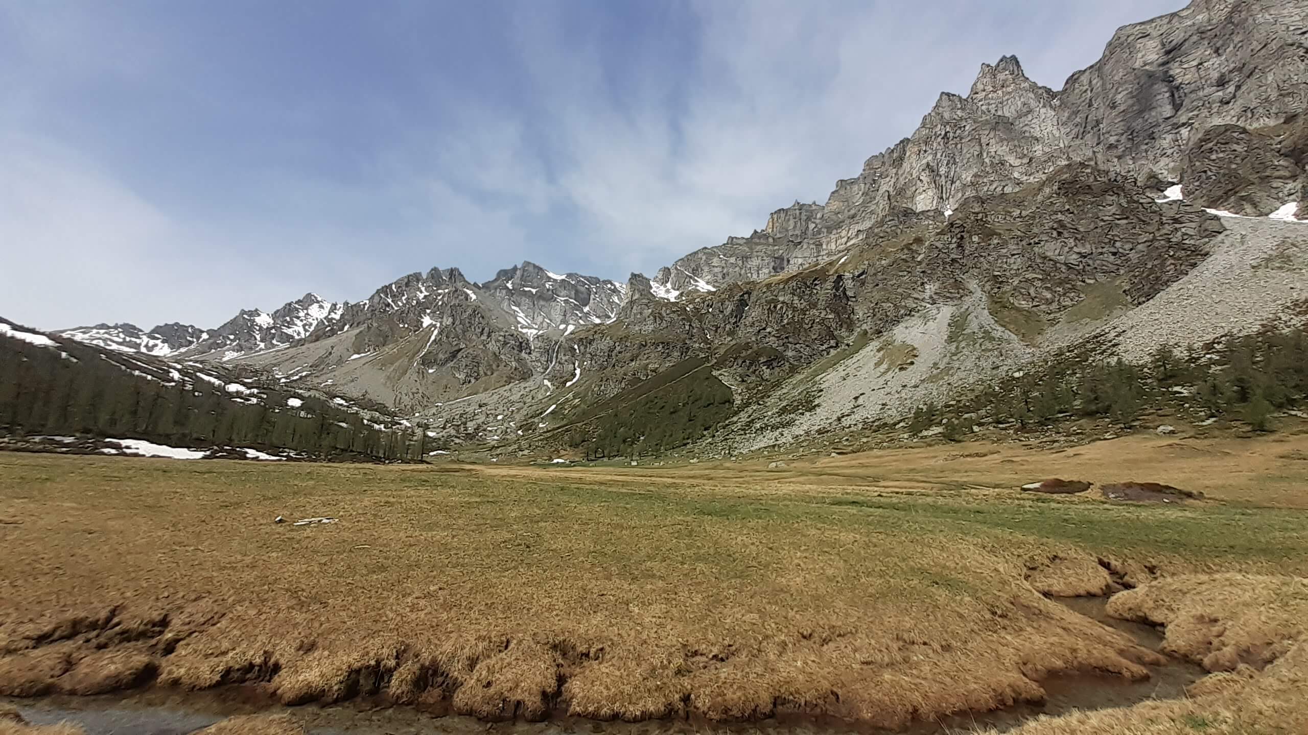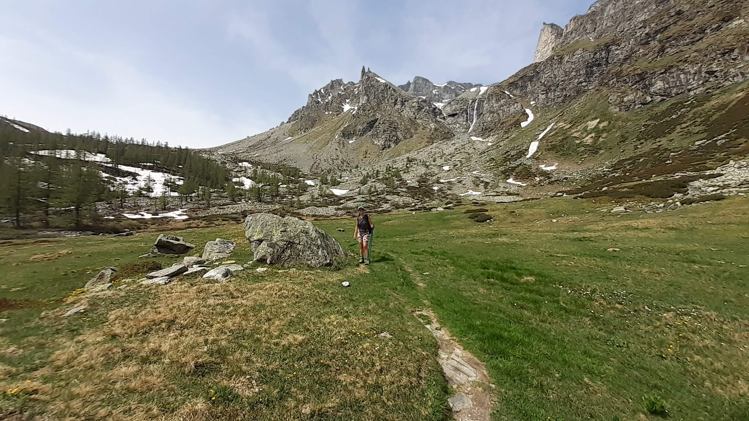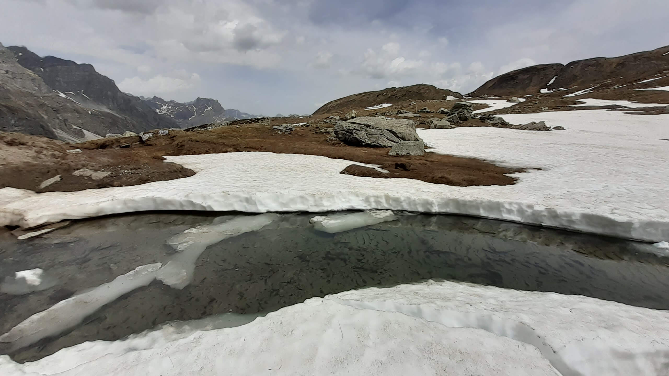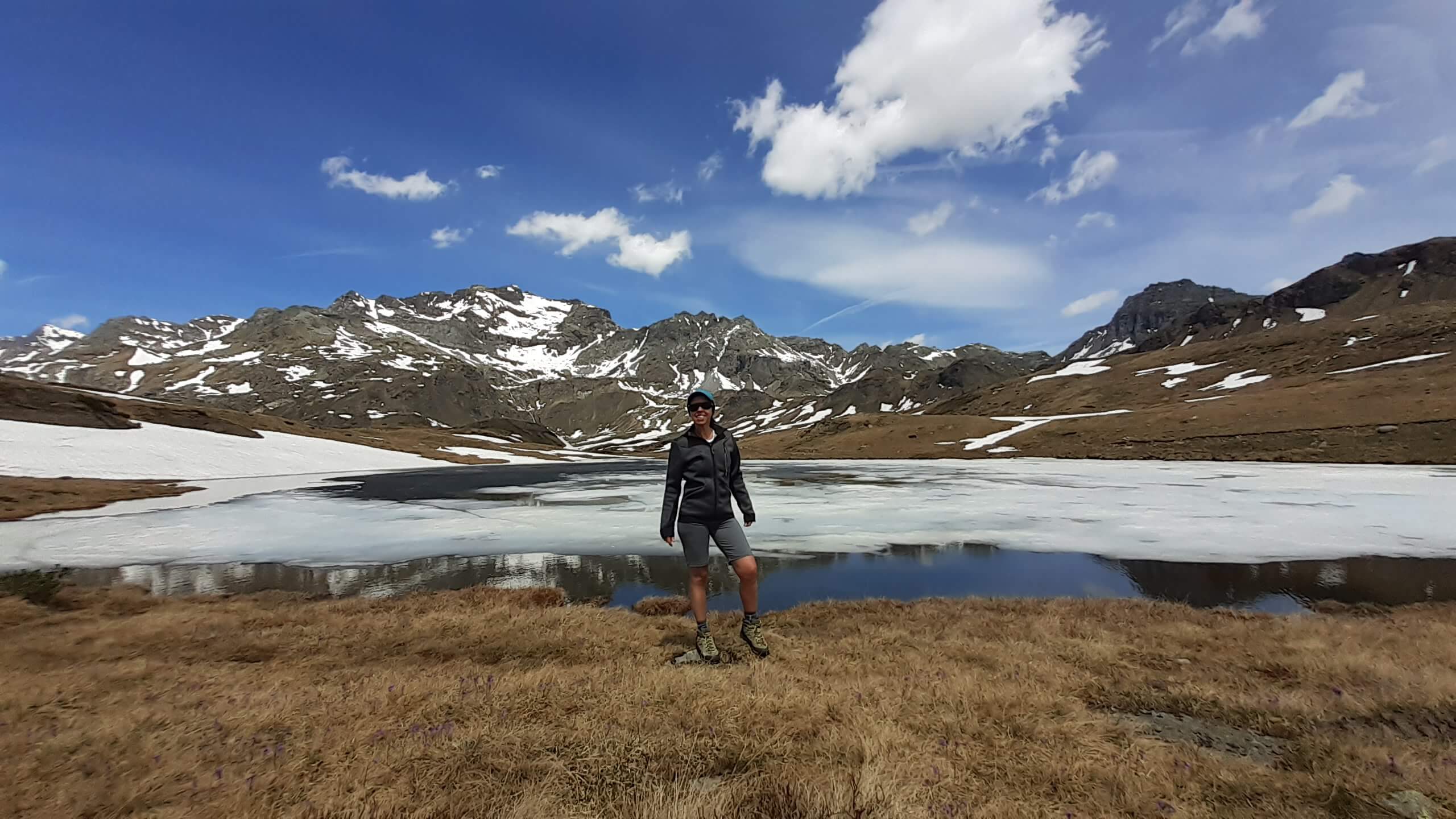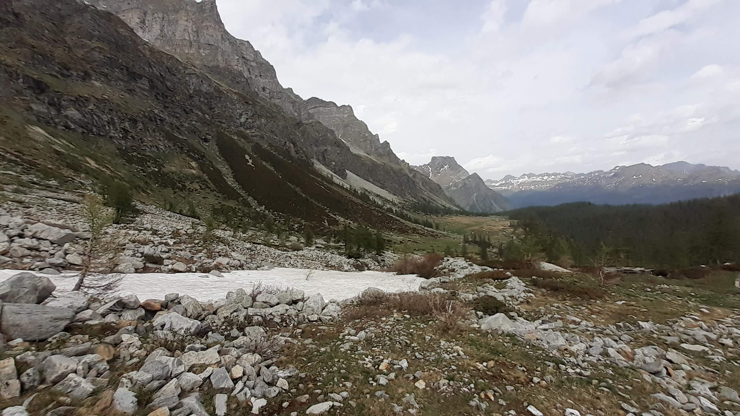 Oggi ci svegliamo a Devero! E… si parte di nuovo. Dal parcheggio di Cologno (1580 m) saliamo alla Piana dell’ Alpe Devero (1630 m) e, prendendo a sinistra, arriviamo alla località Pedemonte (1645 m), oltrepassiamo il ponte sul rio Buscagna e saliamo sul percorso a sinistra (indicazione “Lago Nero”). Arriviamo così all’ Alpe Misanco (1907 m), dove facciamo una piccola pausa-barretta. Lasciandoci poi l’ Alpe Misanco alle spalle e seguendo l’ indicazione su un cartello di legno, arriviamo al bellissimo Lago Nero (1990 m)… anche con poca acqua è uno spettacolo stupendo! Foto su foto e poi, percorrendone il versante a destra, arriviamo alla fine del lago e scendiamo a destra, verso la Val Buscagna che è una immensa valle dai colori rigogliosi. Al piccolo ponte poco distante ci dirigiamo a sinistra e arriviamo all’ Alpe Buscagna (1967 m), un rudere abbandonato. Decidiamo di proseguire, tra nevai residui e passaggi su sassaie e pietraie non semplici; su una roccia un po’ più “comoda” ci fermiamo a mangiare il nostro panino e poi continuiamo il percorso fino a Curt Vita (2230 m). Curt Vita è un piccolo “angolo di paradiso” immerso tra neve e ghiaccio in scioglimento, roccia che fuoriesce e il torrente Buscagna che delinea cascatelle e curve di acqua e neve molto caratteristiche. Il panorama è davvero superlativo! E’ arrivato il momento di scendere e, ripercorrendo lo stesso itinerario della salita, torniamo in Val Buscagna, proseguiamo verso la località Buscagna (1950 m), con l’ alpeggio più recente. Da qui scendiamo direttamente alla Piana dell’ Alpe Devero (1630 m) e poi al parcheggio di Cologno (1580 m). Un’ altra splendida giornata in montagna… da vivere e poi ricordare a lungo.
