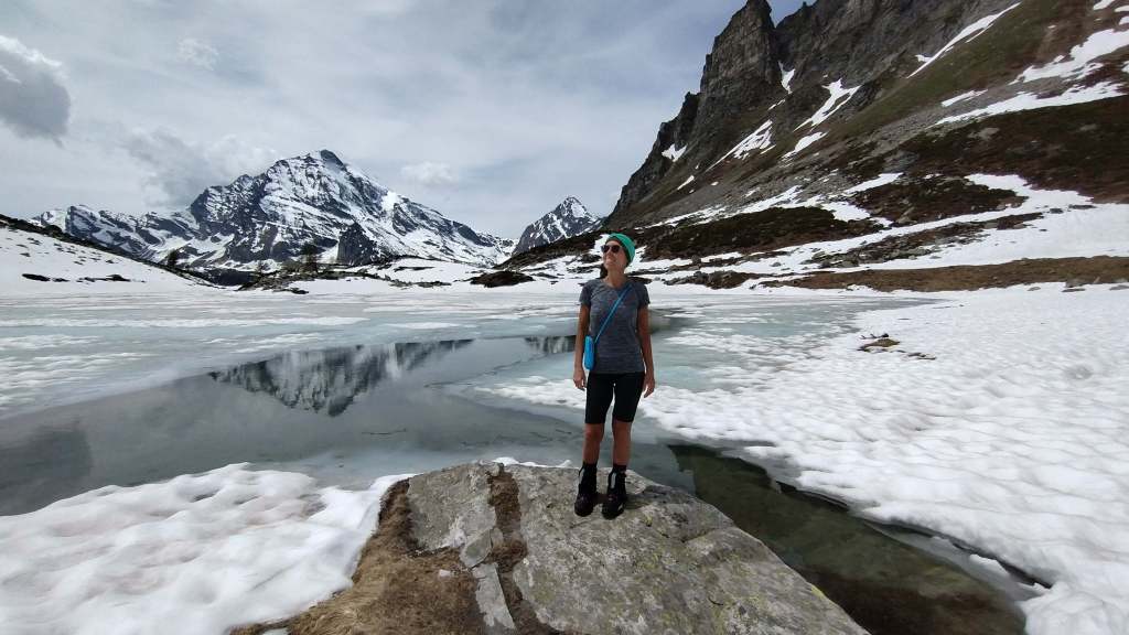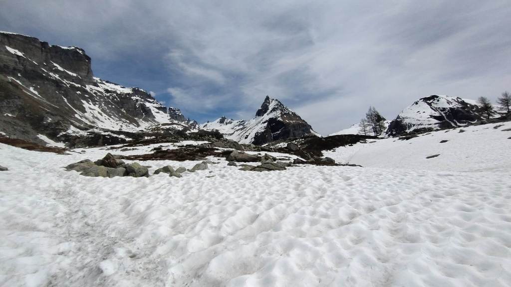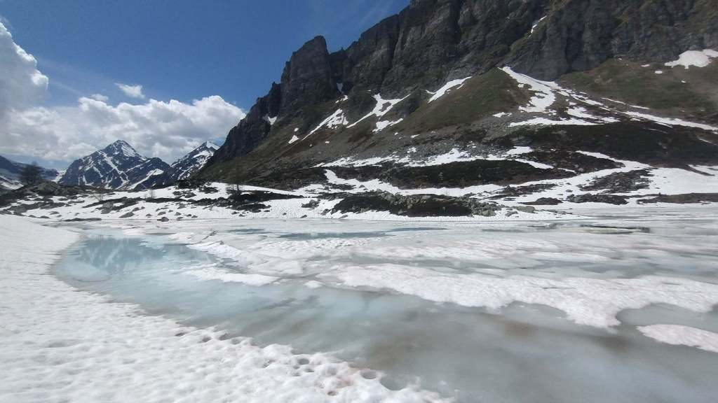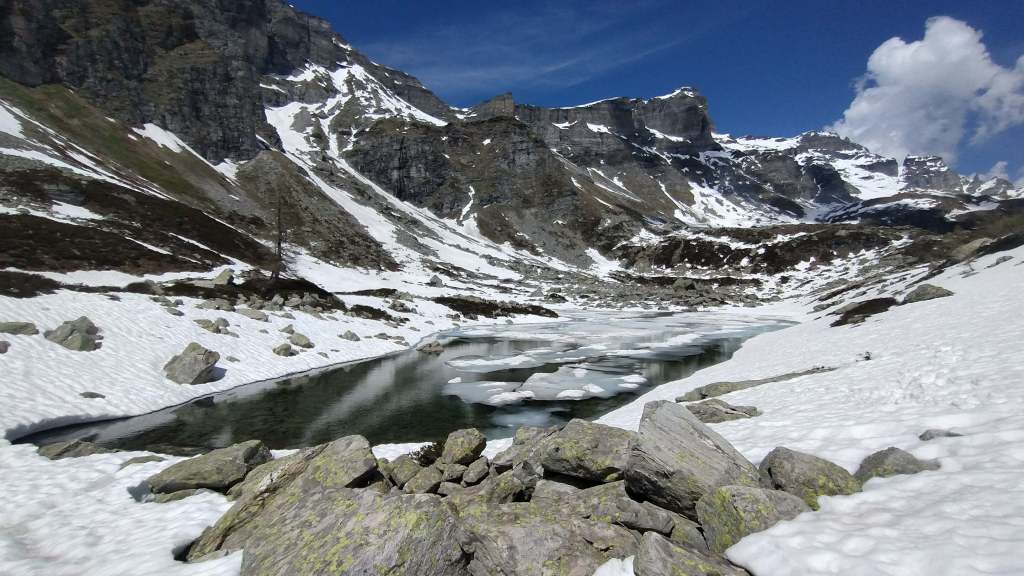 Oggi siamo all’ Alpe Veglia! Partiamo da Pontecampo (1320 m) e, segendo i tornanti, raggiungiamo l’ ingresso dell’ Alpe Veglia, il ponte sul rio Cianciavero e la Piana dell’ Alpe Veglia (1740 m). Ci teniamo sulla destra e arriviamo al Rifugio Cai Arona (1770 m), lo oltrepassiamo e saliamo in direttissima al Lago Bianco (2160 m). Il Lago Bianco è in disgelo ed è spettacolare! Facciamo due volte il giro (bordo lago e piccola cresta pietrosa quota 2200 m con breve tratto esposto sul Pian du Scricc). Scendiamo sempre lungo la direttissima fino al Rifugio Cai Arona (1770 m) e poi torniamo all’ ingresso dell’ Alpe Veglia (1740 m) e poi a Pontecampo (1320 m).
