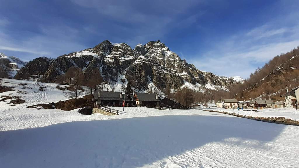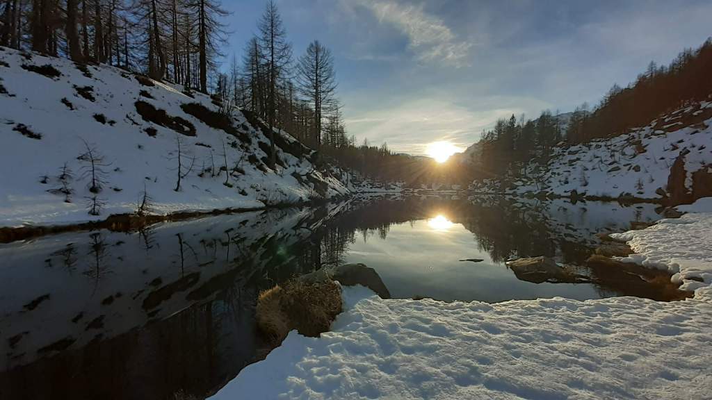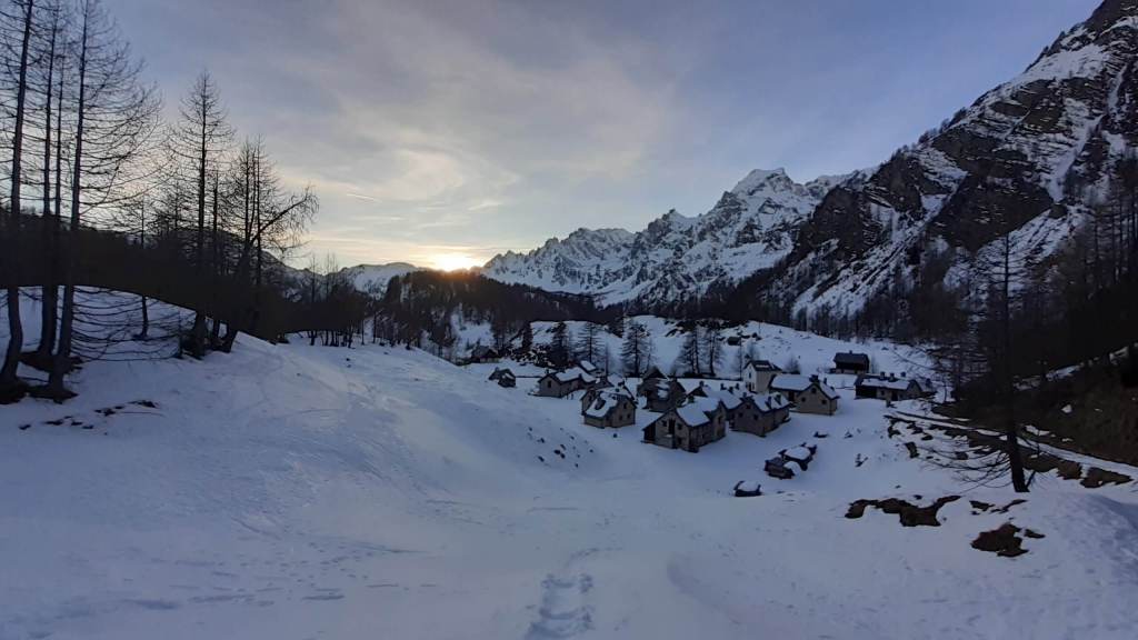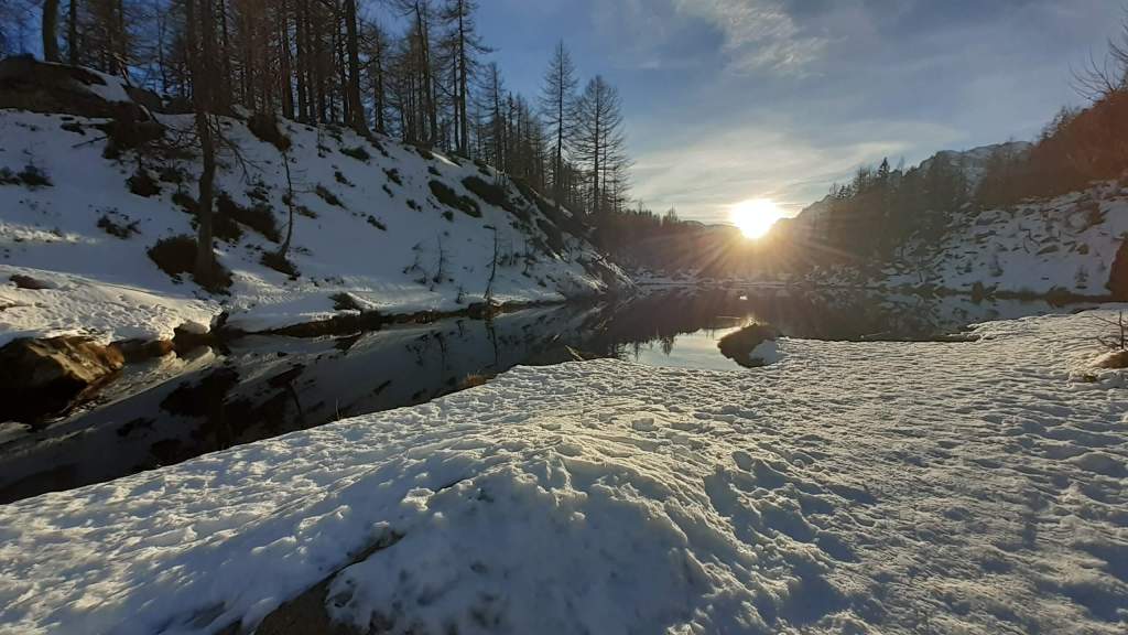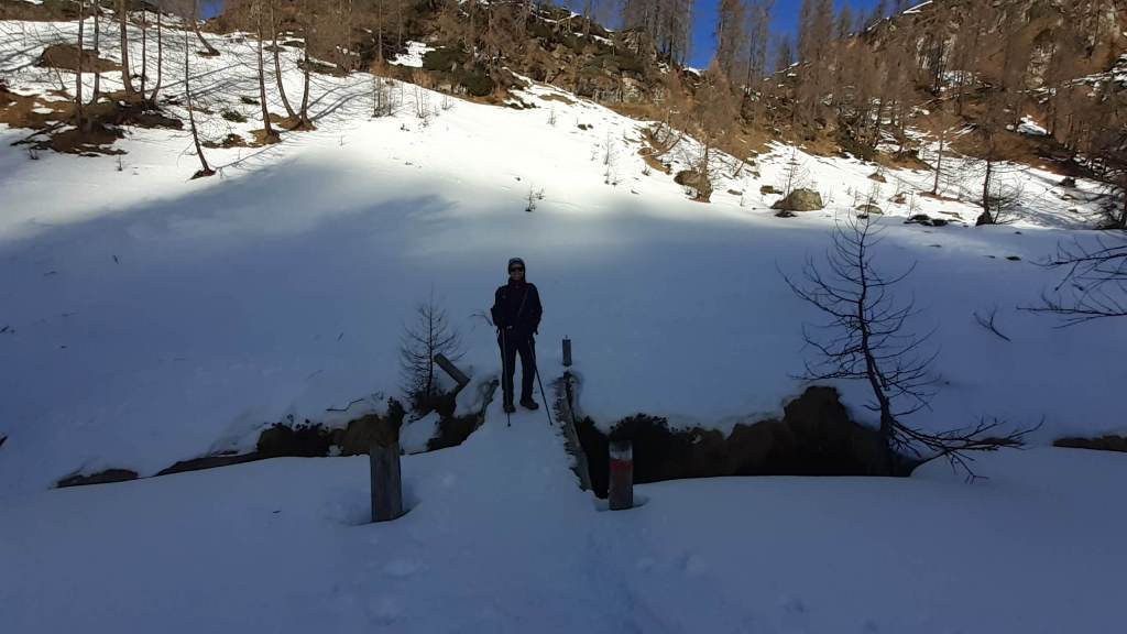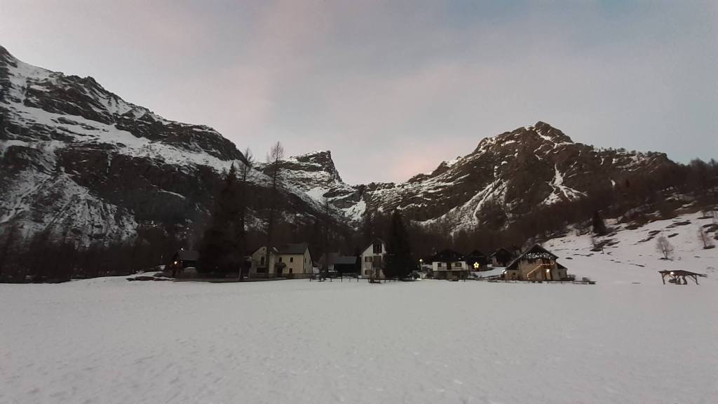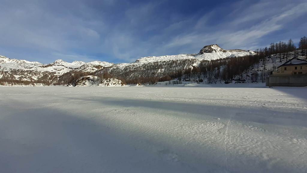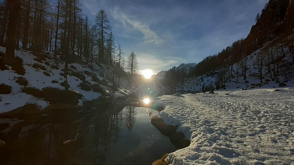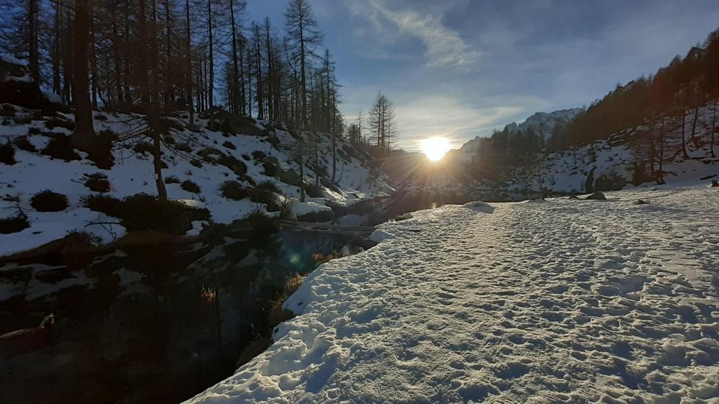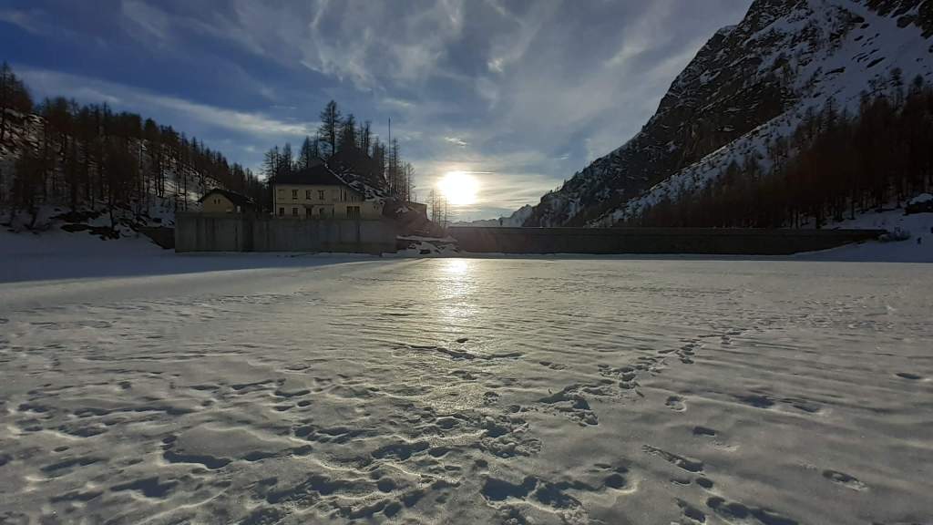 Oggi siamo a Devero! Partiamo dalla Piana dell’ Alpe Devero (1630 m) e, al primo ponte, prendiamo a destra e saliamo fino alla Corte d’ Ardui (1750 m). Da qui teniamo sempre la destra e saliamo fino ad un piccolo ponte di legno, oltre il quale iniziano i tornanti che portano al Primo Lago del Sangiatto (Lago del Sangiatto Inferiore) (1990 m)… con la neve è stupendo! Fin qui la neve è presente ma si sale senza problemi con scarponi e ramponcini. Proseguiamo poi fino all’ Alpe Sangiatto e da qui la neve aumenta parecchio e noi siamo senza ciaspole… quindi si sprofonda!! Riusciamo lo stesso, passando nei pressi del Lago del Sangiatto di mezzo, ad arrivare alla parte alta del Lago del Sangiatto Superiore (2070 m). Torniamo al Lago del Sangiatto Inferiore (1990 m) e poi scendiamo, lungo lo stesso percorso della salita, fino alla Corte d’ Ardui (1750 m), dove seguiamo per Crampiolo (1770 m)… un piccolo villaggio walser bellissimo! Foto su foto e poi saliamo alla Diga di Codelago (1860 m) e camminiamo per un breve tratto anche sul lago! Tormiamo a Crampiolo (1770 m), raggiungiamo il vicino Lago delle Streghe (bellissimo!) e poi di nuovo a Crampiolo per il tramonto. Infine torniamo alla Piana dell’ Alpe Devero (1630 m).