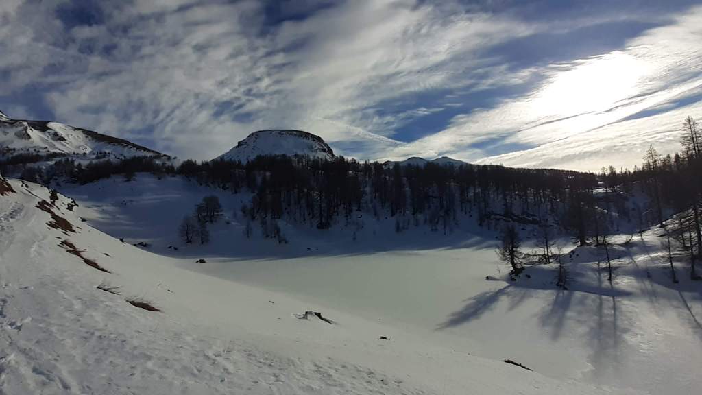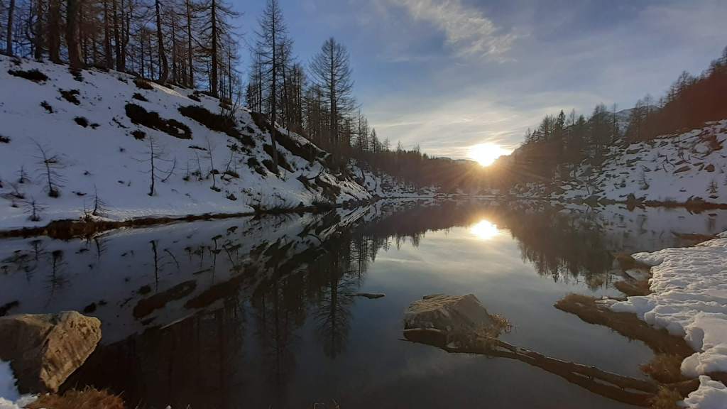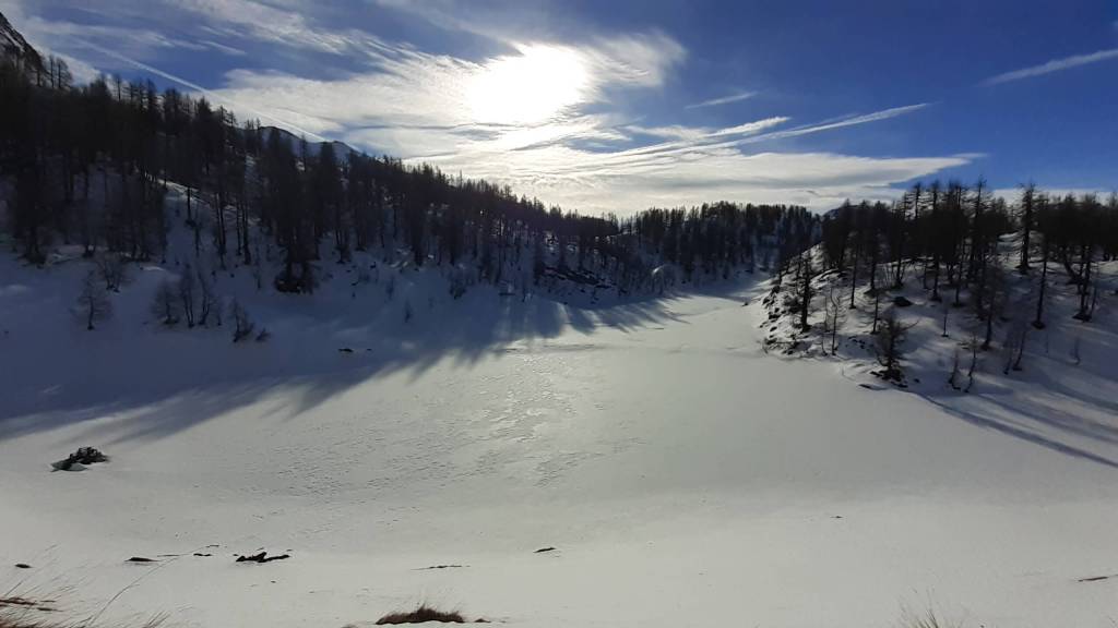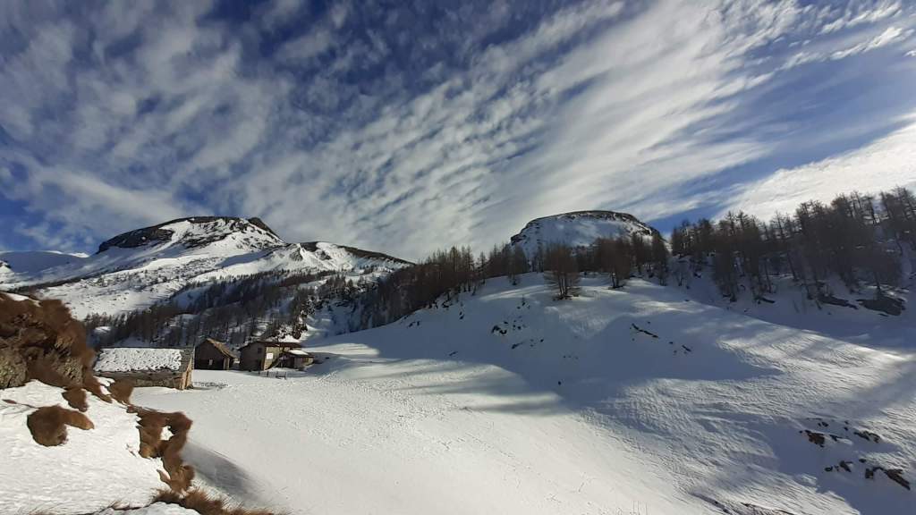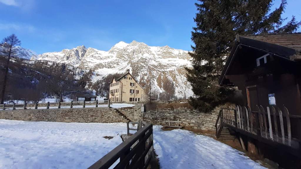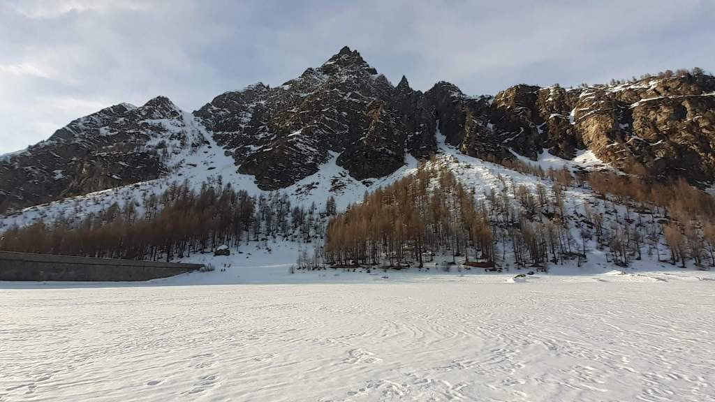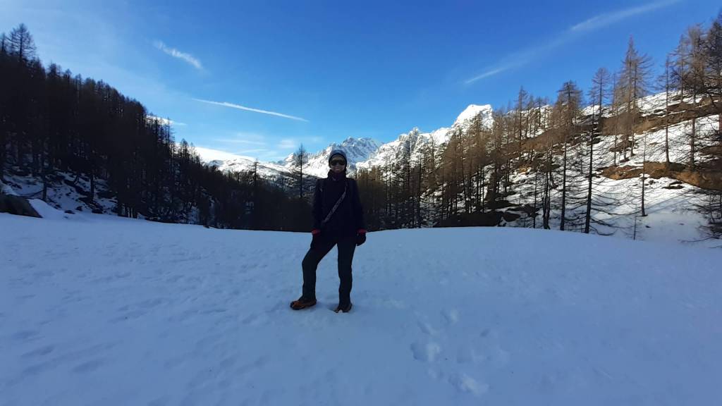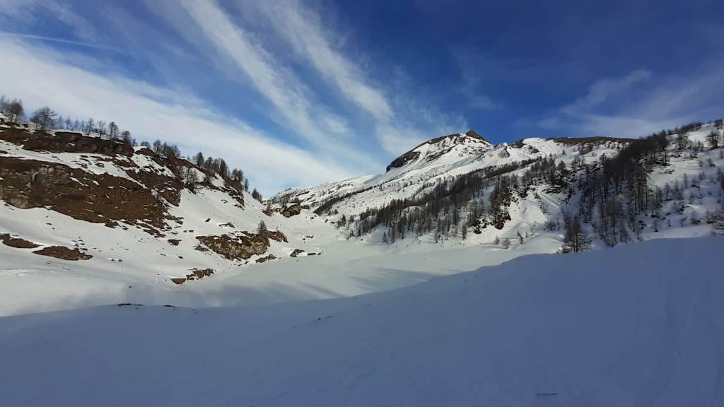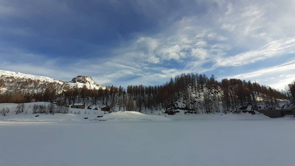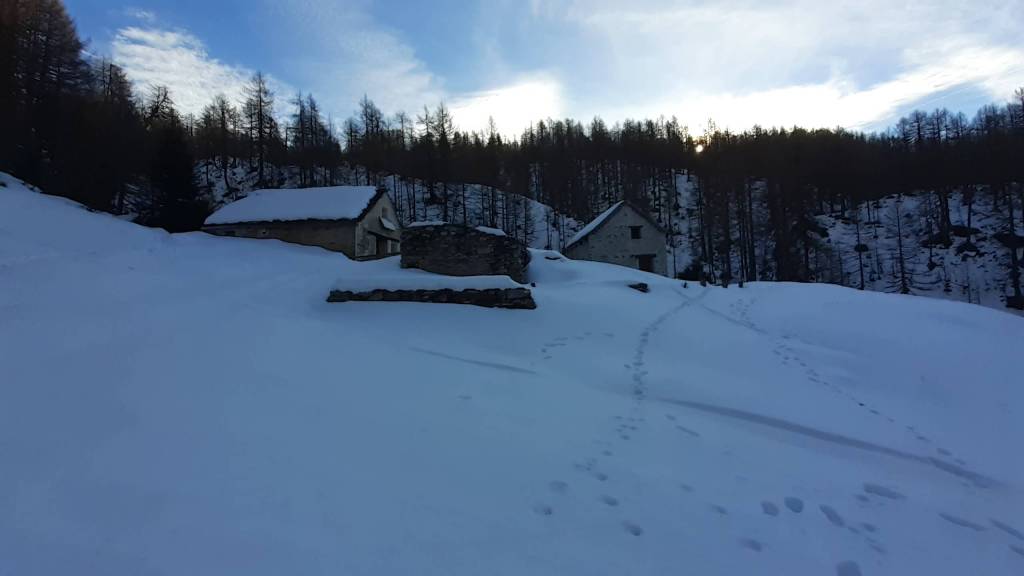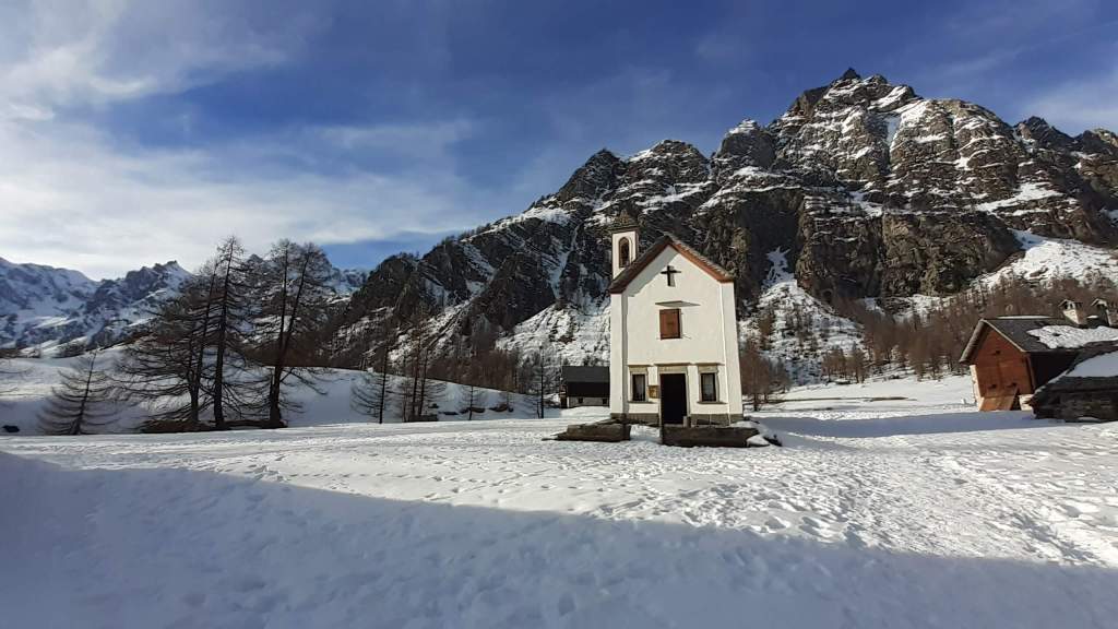 Oggi siamo a Devero! Partiamo dalla Piana dell’ Alpe Devero (1630 m) e, al primo ponte, prendiamo a destra e saliamo fino alla Corte d’ Ardui (1750 m). Da qui teniamo sempre la destra e saliamo fino ad un piccolo ponte di legno, oltre il quale iniziano i tornanti che portano al Primo Lago del Sangiatto (Lago del Sangiatto Inferiore) (1990 m)… con la neve è stupendo! Fin qui la neve è presente ma si sale senza problemi con scarponi e ramponcini. Proseguiamo poi fino all’ Alpe Sangiatto e da qui la neve aumenta parecchio e noi siamo senza ciaspole… quindi si sprofonda!! Riusciamo lo stesso, passando nei pressi del Lago del Sangiatto di mezzo, ad arrivare alla parte alta del Lago del Sangiatto Superiore (2070 m). Torniamo al Lago del Sangiatto Inferiore (1990 m) e poi scendiamo, lungo lo stesso percorso della salita, fino alla Corte d’ Ardui (1750 m), dove seguiamo per Crampiolo (1770 m)… un piccolo villaggio walser bellissimo! Foto su foto e poi saliamo alla Diga di Codelago (1860 m) e camminiamo per un breve tratto anche sul lago! Tormiamo a Crampiolo (1770 m), raggiungiamo il vicino Lago delle Streghe (bellissimo!) e poi di nuovo a Crampiolo per il tramonto. Infine torniamo alla Piana dell’ Alpe Devero (1630 m).