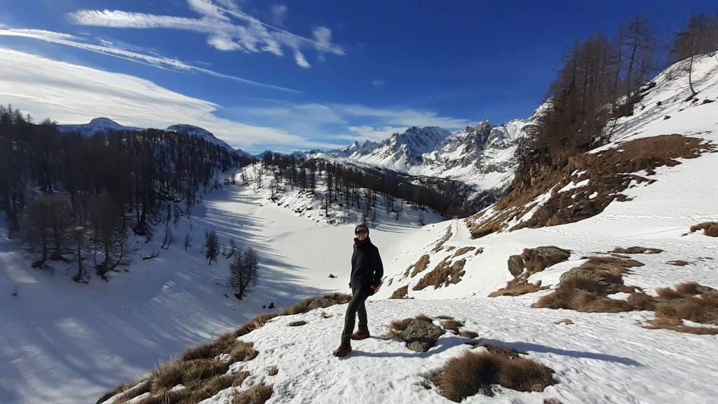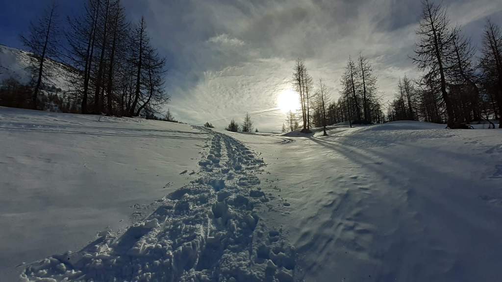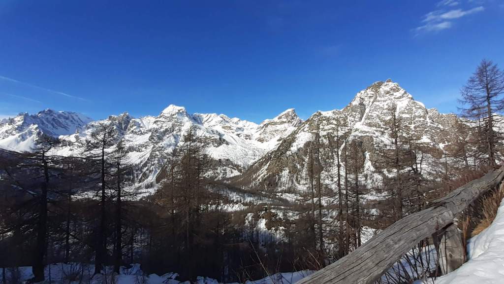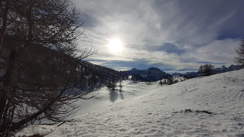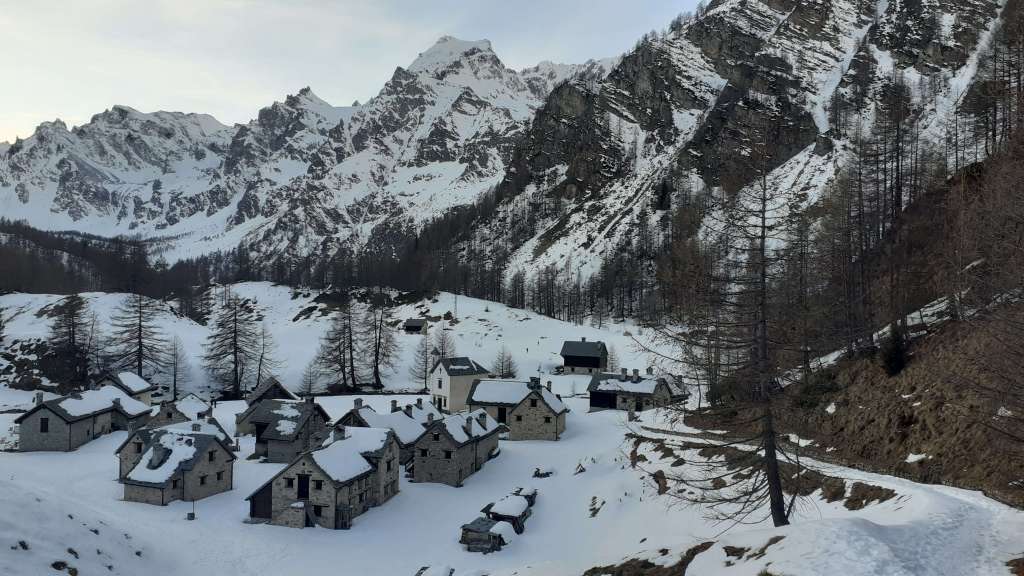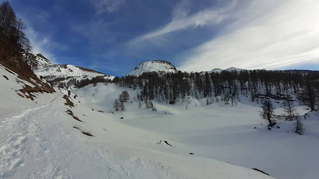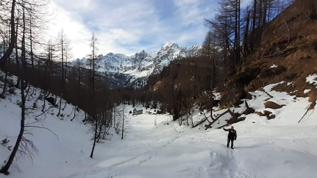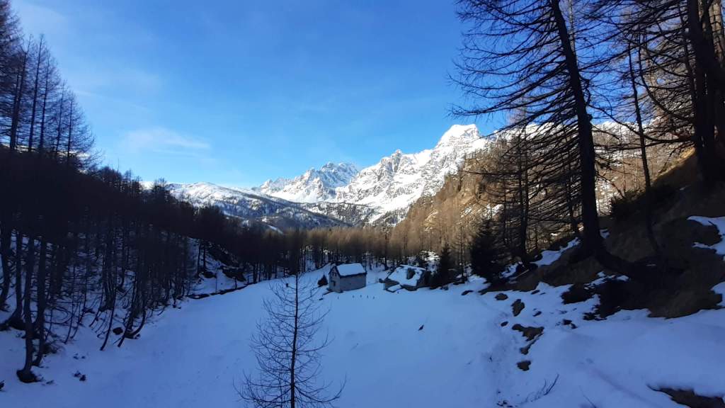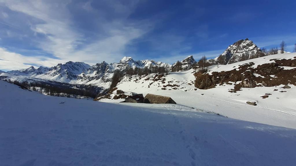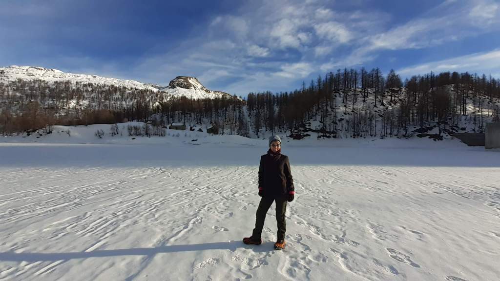 Oggi siamo a Devero! Partiamo dalla Piana dell’ Alpe Devero (1630 m) e, al primo ponte, prendiamo a destra e saliamo fino alla Corte d’ Ardui (1750 m). Da qui teniamo sempre la destra e saliamo fino ad un piccolo ponte di legno, oltre il quale iniziano i tornanti che portano al Primo Lago del Sangiatto (Lago del Sangiatto Inferiore) (1990 m)… con la neve è stupendo! Fin qui la neve è presente ma si sale senza problemi con scarponi e ramponcini. Proseguiamo poi fino all’ Alpe Sangiatto e da qui la neve aumenta parecchio e noi siamo senza ciaspole… quindi si sprofonda!! Riusciamo lo stesso, passando nei pressi del Lago del Sangiatto di mezzo, ad arrivare alla parte alta del Lago del Sangiatto Superiore (2070 m). Torniamo al Lago del Sangiatto Inferiore (1990 m) e poi scendiamo, lungo lo stesso percorso della salita, fino alla Corte d’ Ardui (1750 m), dove seguiamo per Crampiolo (1770 m)… un piccolo villaggio walser bellissimo! Foto su foto e poi saliamo alla Diga di Codelago (1860 m) e camminiamo per un breve tratto anche sul lago! Tormiamo a Crampiolo (1770 m), raggiungiamo il vicino Lago delle Streghe (bellissimo!) e poi di nuovo a Crampiolo per il tramonto. Infine torniamo alla Piana dell’ Alpe Devero (1630 m).