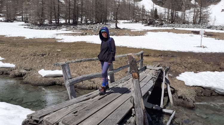 Finalmente iniziamo con i weekend! Hymer…. sei pronto? Si parte!! Destinazione : Alpe Devero! Sabato mattina ci svegliamo e… siamo già qui… dunque… parte subito il percorso! Dal parcheggio di Cologno (1580 m) raggiungiamo la Piana dell’ Alpe Devero (1631 m). All’ inizio della Piana, in prossimità del primo piccolo ponte, prendiamo a destra verso il ‘Sangiatto’ (il percorso è indicato). Percorriamo il sentiero, sempre piuttosto ampio e poco ripido fino alla Corte d’ Ardui (1748 m); piccola sosta e poi saliamo, lasciandocela alle spalle. Oltrepassiamo un piccolo ponte molto carino, da dove inizia la neve a tratti, e saliamo lungo i tornanti che ci portano al primo lago, il Lago del Sangiatto Inferiore (1990 m). Come al solito, è di una bellezza rara… e in scongelamento lo è ancora di più! Il Monte Sangiatto si specchia in modo artistico… il tutto sembra un dipinto. Arriviamo poi all’ Alpe Sangiatto (2010 m) dalla quale si vede il secondo lago, il Lago del Sangiatto di Mezzo (2000 m), che è un piccolo specchio d’ acqua in scongelamento. Continuiamo salendo a destra, verso il terzo lago, il Lago del Sangiatto Superiore (2040 m). Percorriamo tutto il giro, prestando molta attenzione a dove passare (anche questo lago è in scongelamento!). Purtroppo il tempo inizia a peggiorare e, abbastanza velocemente, ci apprestiamo a scendere, seguendo lo stesso percorso dell’ andata. Comincia anche a piovere e, anche se poco, acceleriamo l’ andatura. Piccola sosta nei pressi di una casa vuota con tanto di tetto sporgente per ripararci e poi… smette di piovere! Camminata di fine pomeriggio a Pedemonte (piccola frazione della Piana dell’ Alpe Devero, dalla parte opposta del primo ponte oltrepassato il mattino) (1645 m). Infine torniamo al parcheggio di Cologno (1580 m)… felici di questa prima giornata del weekend!