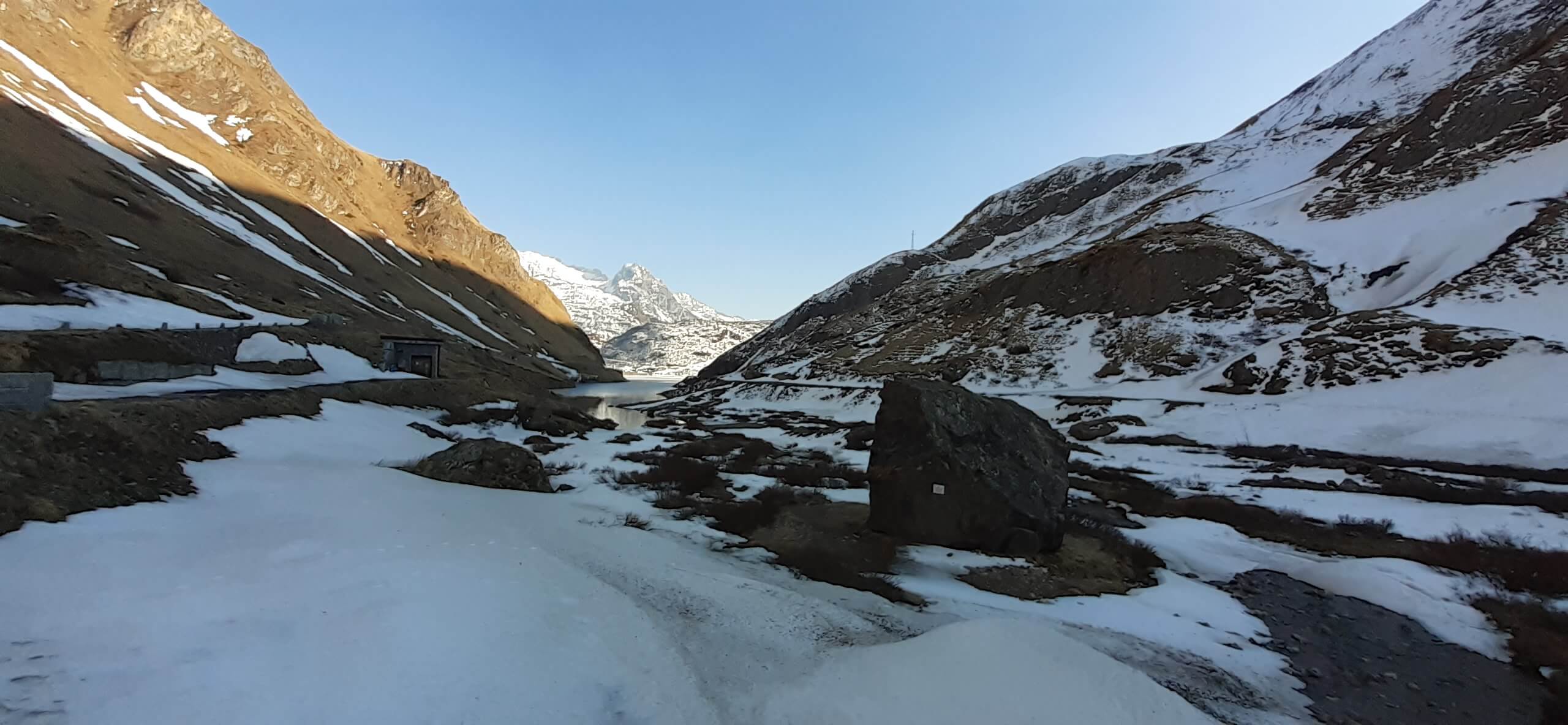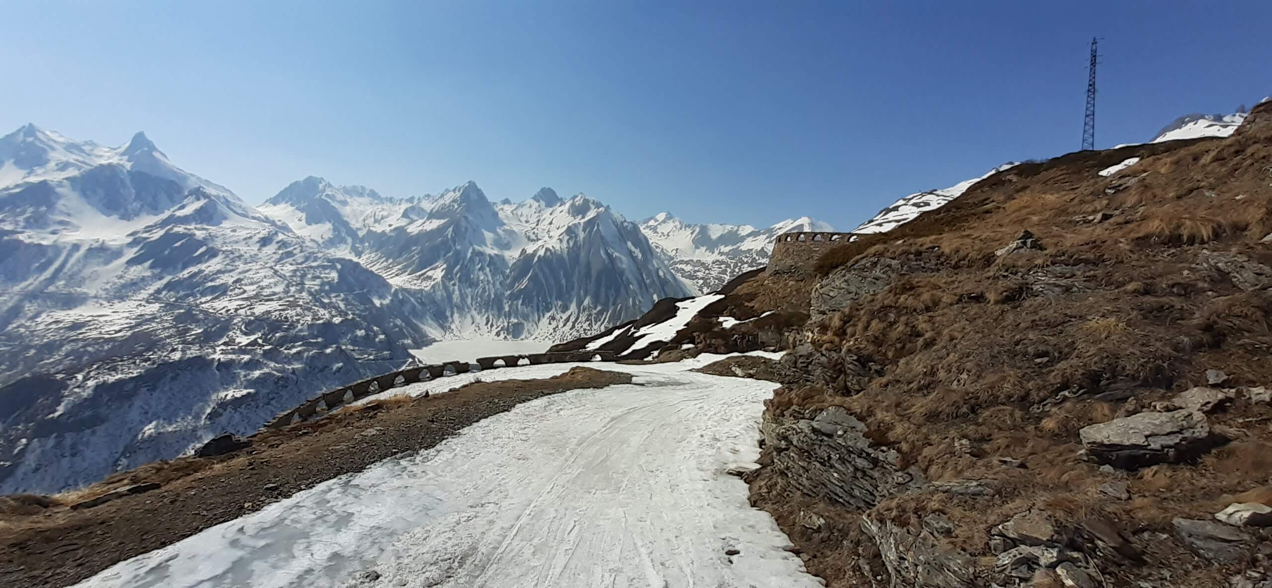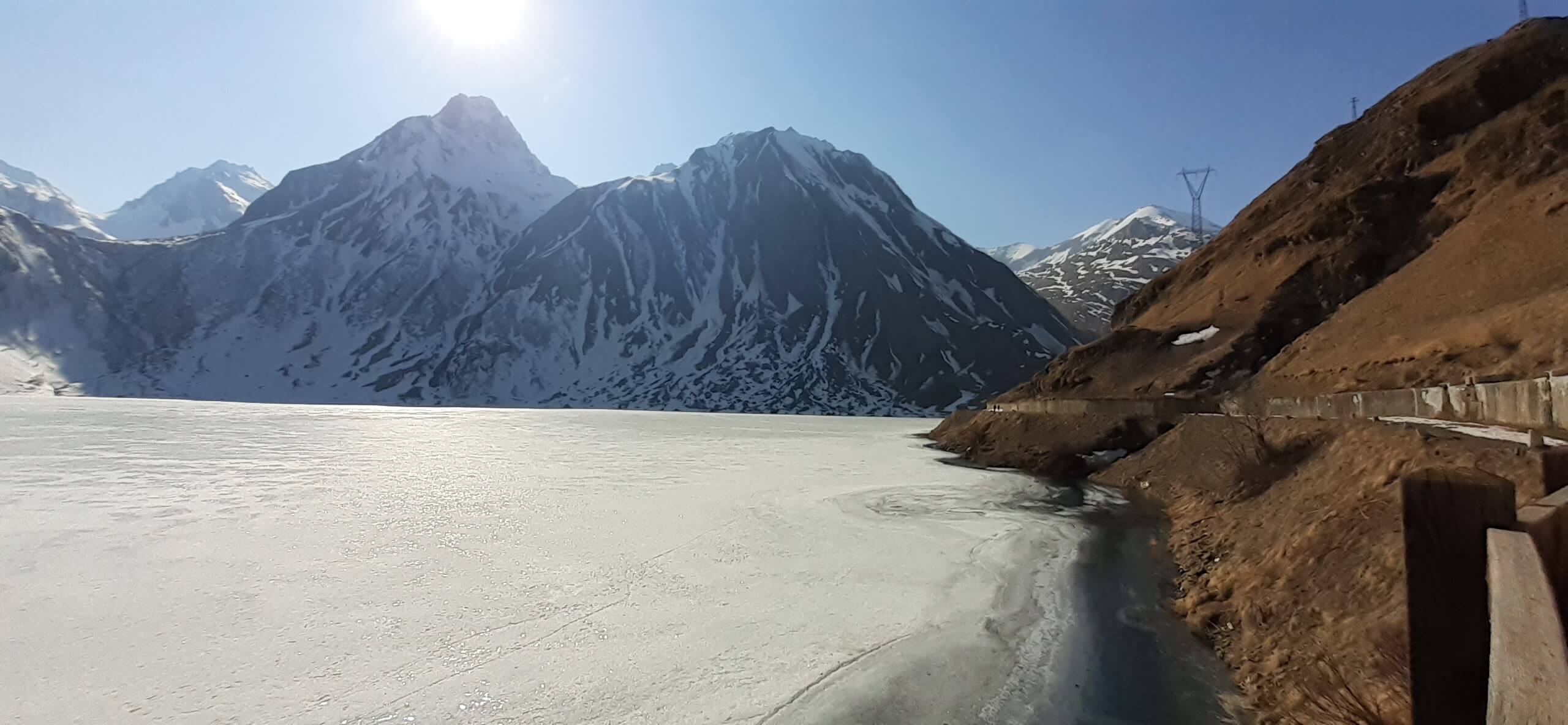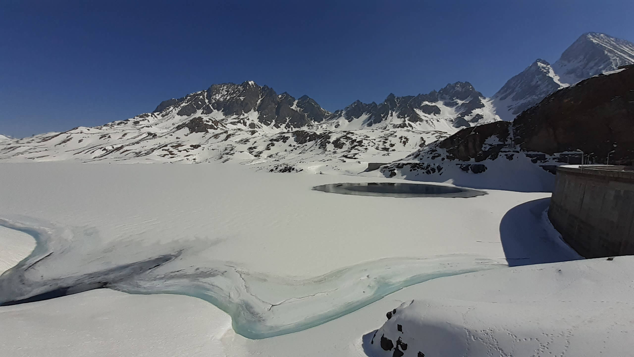 Inizia il weekend e finalmente riusciamo a organizzare e a partire per 2 giorni con il nostro camper! Parcheggiamo il camper a Passo (790 m), frazione del comune di Premia, perché a Riale le temperature scendono ancora sotto lo zero di notte e l’ area sosta camper sotto la Diga del Lago di Morasco è ancora destinata alla pista da sci di fondo. Sabato mattina ci spostiamo e raggiungiamo il piccolo borgo di Riale (1730 m). Saliamo lungo il versante del Lago Kastel (le indicazioni sono sempre presenti) seguendo tutti i numerosi e lunghi tornanti (la “direttissima” presenta un mix di neve, fango e terra; la neve lungo i tornanti invece è poca ma battuta, quindi molto più agevole). Arriviamo al bivio Kastel/Toggia e prendiamo a destra fino alla Diga del Lago Kastel (2230 m)…. il Lago Kastel è stupendo come al solito e, sulla riva, si vedono i primi accenni di scongelamento! Percorriamo il versante a destra della diga fino alla piccola chiesetta… panorama super! Torniamo alla diga e scendiamo fino alla riva… foto su foto e poi ci apprestiamo a scendere in direzione del Rifugio Maria Luisa (2150 m) e poi saliamo alla Diga del Lago Toggia (2190 m). Il disgelo al Lago Toggia è già iniziato e, al centro del lago, si può ammirare una “macchia di un blu intenso” dell’ acqua che fuoriesce dal ghiaccio e dalla neve! Qui ci fermiamo a mangiare il nostro panino e poi scendiamo di nuovo verso il Rifugio Maria Luisa (2150 m) e, dopo essere passati dal bivio Kastel/Toggia, facciamo una piccola deviazione per raggiungere il piccolo Laghetto Effimero poco distante… anche lui in scongelamento e davvero bellissimo! Riprendiamo i lunghi e numerosi tornanti che ci riportano a Riale (1730 m). Il percorso non finisce qui; decidiamo di raggiungere il versante opposto al Kastel e salire anche alla Diga del Lago di Morasco (1820 m), dalla quale ci incamminiamo lungo tutto il versante a destra della diga fino alla fine del lago. Anche qui possiamo ammirarne il disgelo, soprattutto nella sua parte finale. Torniamo poi all’ inizio della diga e iniziamo la discesa prima fino a Riale (1730) e poi al parcheggio. Giornata spettacolare con un percorso molto molto lungo ma davvero stupendo… 3 laghi… 3 disgeli differenti l’ un l’ altro ma tutti e 3 da rimanere senza parole… oggi uno spettacolo dietro l’ altro!