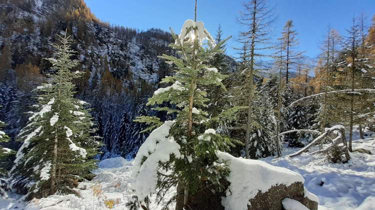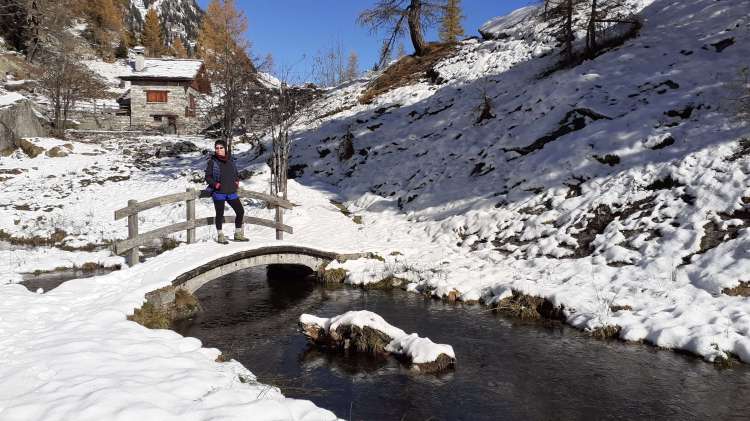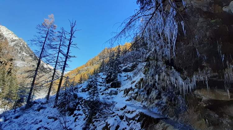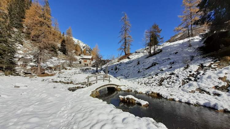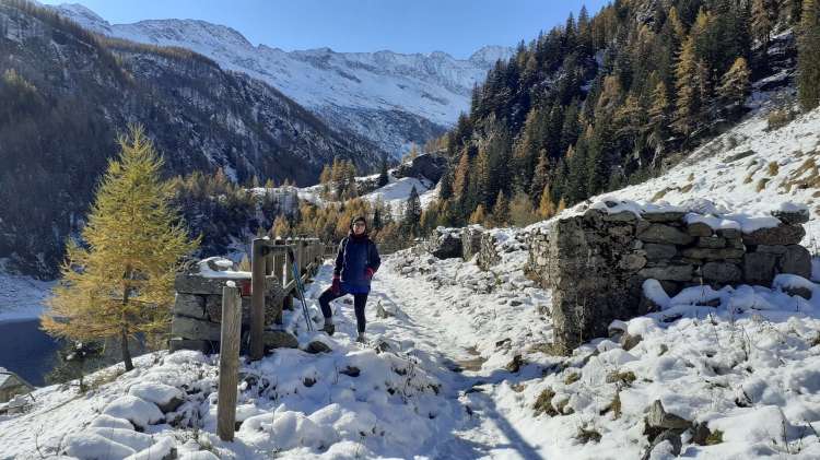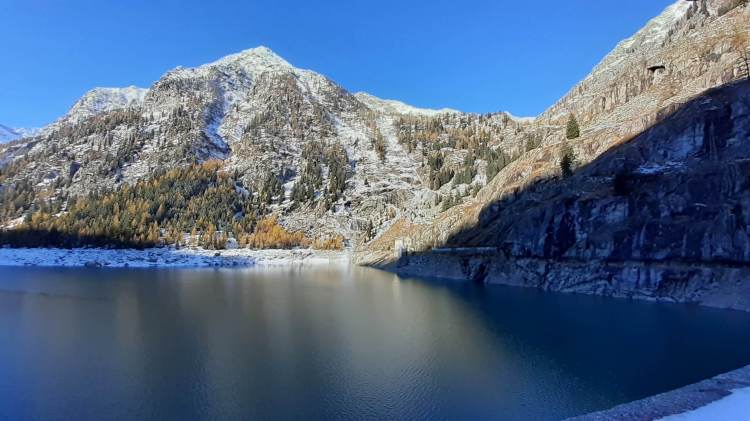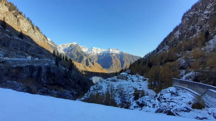 E’ arrivata la prima neve in montagna! Essendo la prima nevicata, decidiamo di mantenerci ad altitudini contenuti e su un percorso che conosciamo molto bene… partiamo per la Valle Antrona!! Sabato mattina ci svegliamo presto e, dal Lago di Antrona (1100 m), saliamo in ‘direttissima’ (percorso ben segnalato lungo il versante a sinistra del Lago di Antrona) verso il Lago di Campliccioli. Nell’ ultima parte troviamo già un po’ di neve ma, a parte qualche piccolo e breve tratto ghiacciato, saliamo senza problemi. Arriviamo alla diga del Lago di Campliccioli (1360 m) e già qui i panorami sono eccezionali! I colori caldi e tiepidi del foliage “cedono il passo” al bianco freddo della neve e questo spettacolo ci accompagnerà per tutto il giro completo del lago di Campliccioli che iniziamo, dopo aver attraversato la diga, alla destra di quest’ ultima. Arriviamo alla Cascata della Banella… in parte ghiacciata…. bellissima! Proseguiamo, mentre la neve accenna ad aumentare sul percorso… ma si prosegue abbastanza tranquillamente. Raggiungiamo anche l’ Alpe Vassoncino (1410 m) e poi la fine del lago… la neve è sempre più consistente e solo pochi punti ghiacciati, che si evitano senza problemi. Eccoci all’ Alpe Granarioli (1415 m)… le baite e il piccolo ponte sono davvero una cartolina! Siamo attratti dal mix perfetto di foliage e neve… adesso molta più neve, anche sugli alberi… e quindi procediamo un po’ anche oltre il piccolo ponte. Torniamo all’ Alpe Granarioli e cerchiamo un posticino al sole dove mangiare… la giornata è stupenda, ma fa freddo, quindi veloce pausa pranzo e, poi, di nuovo in cammino. Arriviamo al ponte sul torrente Troncone e da qui iniziamo la seconda metà del giro del Lago di Campliccioli. Incontriamo subito il tratto più difficile e più pericoloso di oggi… una ventina di metri coperti completamente da uno spesso strato di ghiaccio lucido, sovrastato da decine e decine di stalattiti ghiacciate! Procediamo molto lentamente, aiutandoci anche con la fune d’ acciaio posta lungo la roccia…. superato! La seconda metà del giro presenta più neve, ma non ghiacciata e, così, in poco arriviamo al “mio sperone roccioso preferito”... oggi al top! Piccola pausa, più che altro di ammirazione e per scattare tantissime foto e poi, lungo le rotaie della vecchia ferrovia (decauville), torniamo al principio del Lago di Campliccioli. Non è tardi, quindi decidiamo di scendere seguendo tutti i numerosi e lunghi tornanti, sperando di non trovare neve… invece, almeno per la metà della discesa, c’ è ed è anche ghiacciata! Con molta prudenza e attenzione scendiamo al principio del Lago di Antrona (1100 m) e, ripercorrendo il versante a sinistra, raggiungiamo prima la piccola cascata del Torrente Troncone e poi scendiamo verso la riva del Lago di Antrona… dalla quale abbiamo una vista privilegiata sulla bellissima Cascata del Sajont! Si sta facendo quasi buio, quindi salutiamo la Cascata del Sajont, il Lago di Antrona e torniamo al parcheggio del nostro camper… dove ci aspetta una cenetta al caldo e una buona notte di sonno, dopo una spettacolare giornata in un luogo da favola.