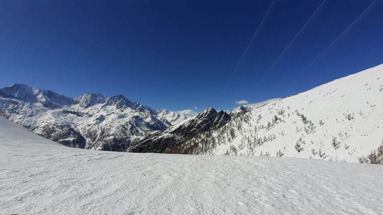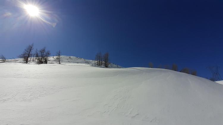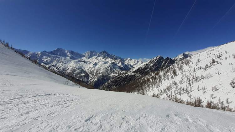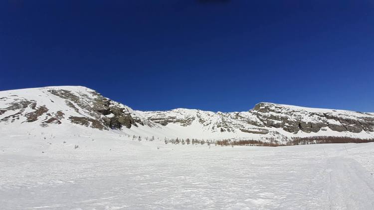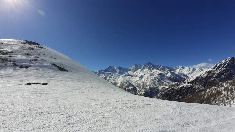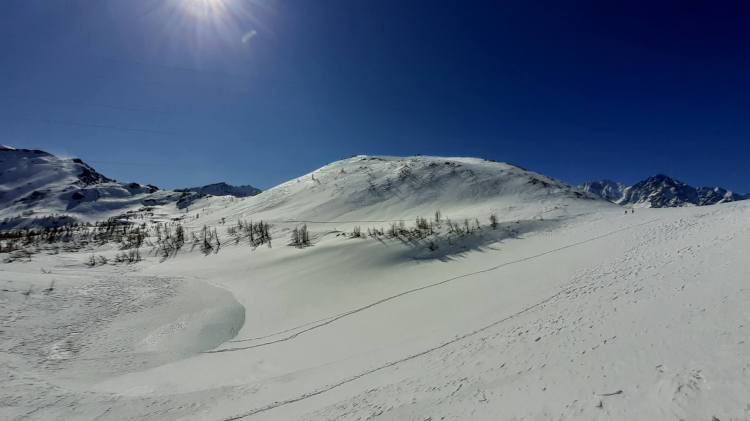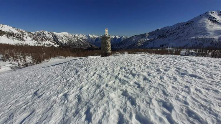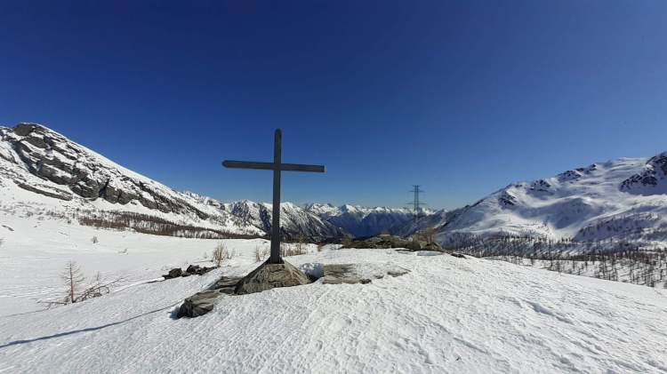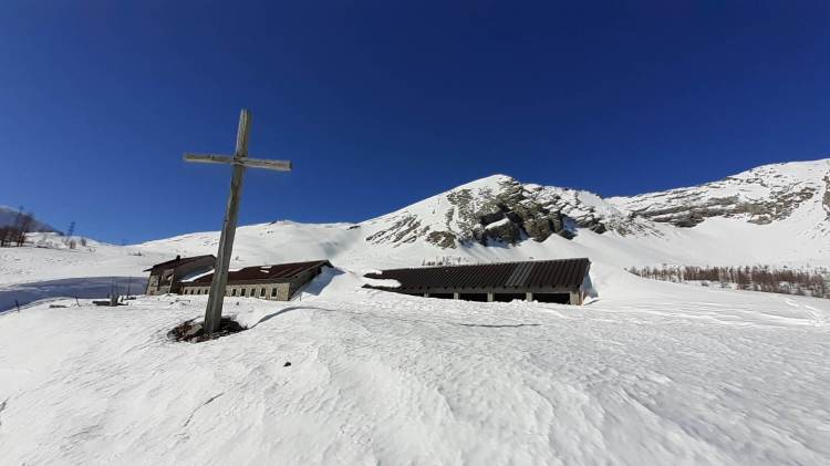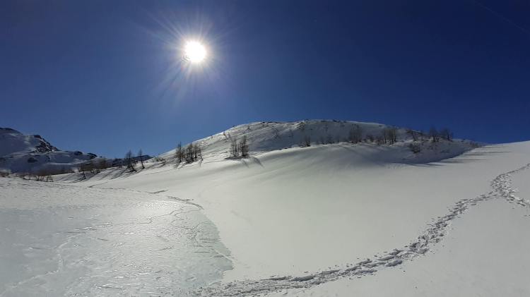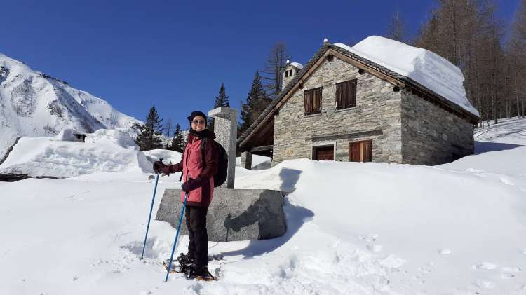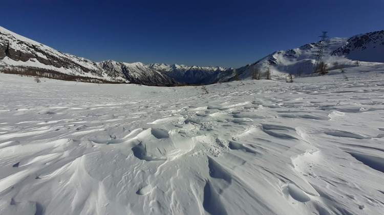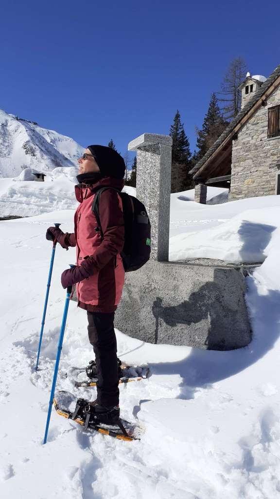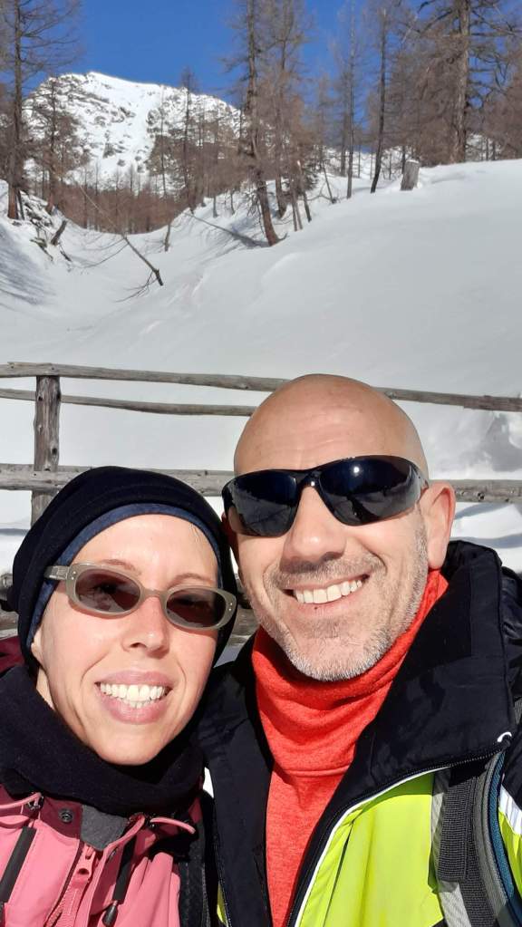 Oggi decidiamo di tornare in Val Bognanco e percorrere una “variante” dell’ Anello del Monscera (fatto qualche settimana fa). Vogliamo raggiungere prima il Lago del Monscera, poi il Passo del Monscera. Arriviamo a San Bernardo (1628 m) e dobbiamo parcheggiare sulla strada prima della chiesetta degli alpini, perché i 2 parcheggi sono già pieni. Infiliamo le ciaspole (oggi la neve è piuttosto fresca e soffice!) Arriviamo al ponte sul rio Rasiga e poi al Rifugio Il Dosso (1740 m). Proseguiamo su neve, non battuta di recente, ma abbastanza compatta… il percorso è sempre piuttosto ampio. Raggiungiamo Quota 2000, una montagnetta che io chiamo “piccola montagna con monumento”, dove ci fermiamo a mangiare velocemente… il vento non consente una sosta prolungata. Il panorama inizia già ad essere spettacolare e spazia su innumerevoli montagne bellissime! Procediamo verso l’ attacco del sentiero che porta al Lago del Monscera… il sentiero adesso non è più ampio, praticamente si riduce ad un paio di tracce lasciate dai ciaspolatori precedenti. In poco arriviamo alla croce che sovrasta il Lago e lo sguardo inizia a “catturare” più immagini possibili! Il Lago del Monscera (2072 m) è coperto da un manto nevoso che riflette la luce del sole e, in fondo a questo “specchio di neve”, parte una debole traccia che porta al Passo. Costeggiamo il Lago sulla destra piano e con attenzione, in quanto la traccia si restringe ancora e, in più tratti, devo procedere con una ciaspola davanti all’ altra. Il vento adesso è ancora più potente, ma proseguiamo. Arriviamo così al Passo del Monscera (2103 m) e lì si apre la meraviglia! Mi trovo esattamente al centro di un paesaggio che ha dell’ incredibile! Alla mia destra il Camoscellahorn (Pizzo Pioltone), alla mia sinistra la Cima Mattaroni e davanti i Giganti Svizzeri! Una sequenza di montagne stupende coperte di neve. Purtroppo possiamo fermarci solo pochissimi minuti, perché c’ è in atto una tormenta di vento! Ci copriamo con diversi strati tecnici, lasciando fuori solo gli occhi… anzi gli occhiali! Scendiamo veloci, ma dal versante opposto del Lago, in quanto abbiamo scorto un passaggio “fattibile” su neve fresca. Raggiungiamo la fine del Lago, che presenta una particolare “chiazza” di un colore azzurrino… vista la presenza un’ altra traccia lì vicino, che attraversa addirittura tutto il Lago bianchissimo, ci fidiamo dei “predecessori” e ci avviciniamo con tantissima cautela e solo per pochi secondi (comunque voi non fatelo!!). Torniamo alla bellissima croce e decidiamo di variare di pochissimo la discesa, passando anche per l’ Alpe Monscera (2020 m), sommersa di neve! Ritorniamo poi a Quota 2000 e poi si scende giù verso il Rifugio Il Dosso (1740 m). Pausa barretta e poi di nuovo al ponte del rio Rasiga e, infine, al parcheggio. Una giornata eccezionale, unica e meravigliosa!