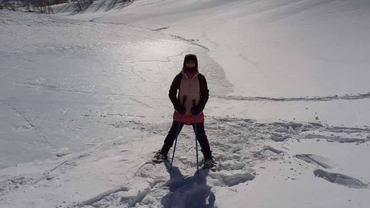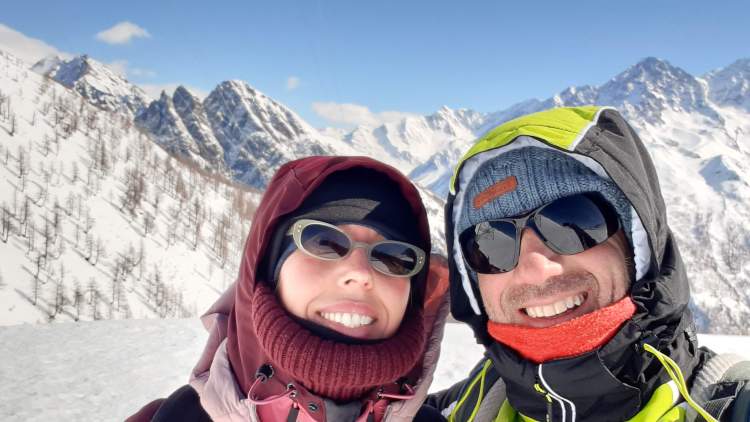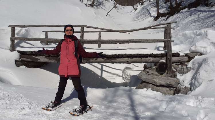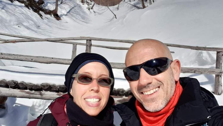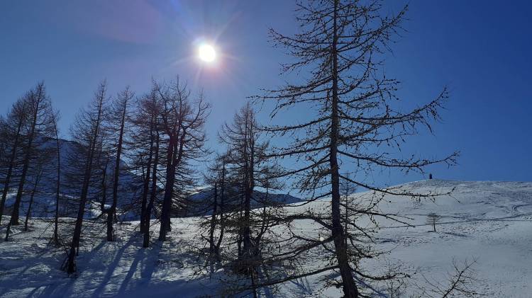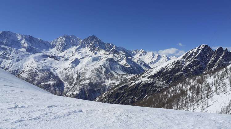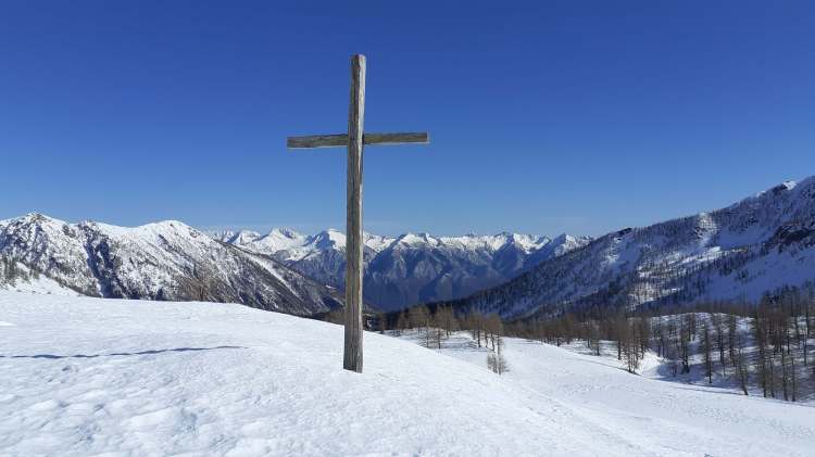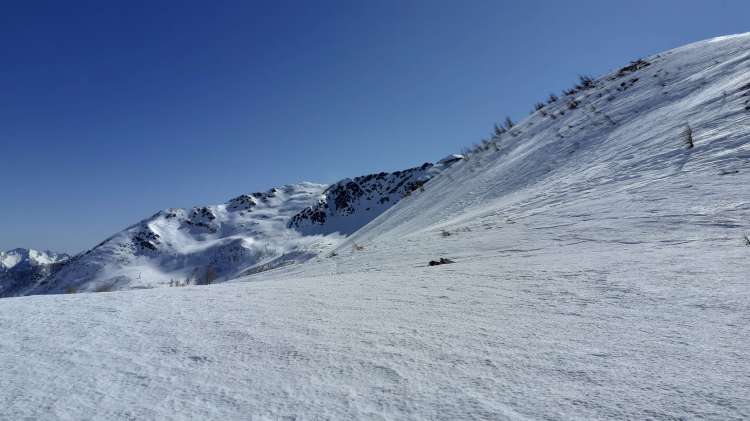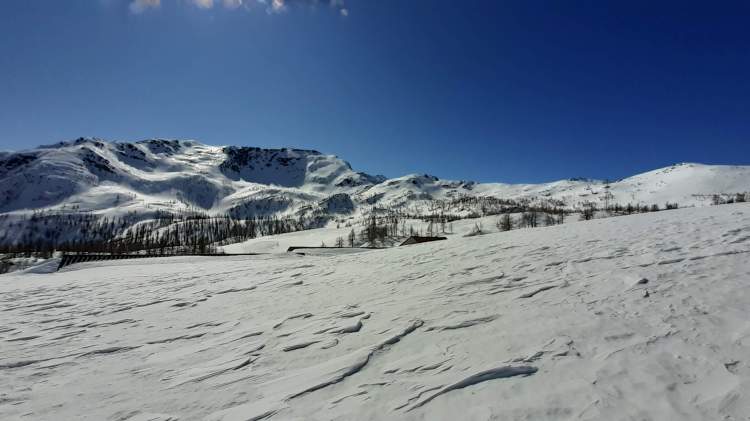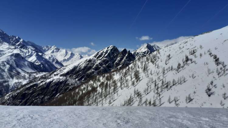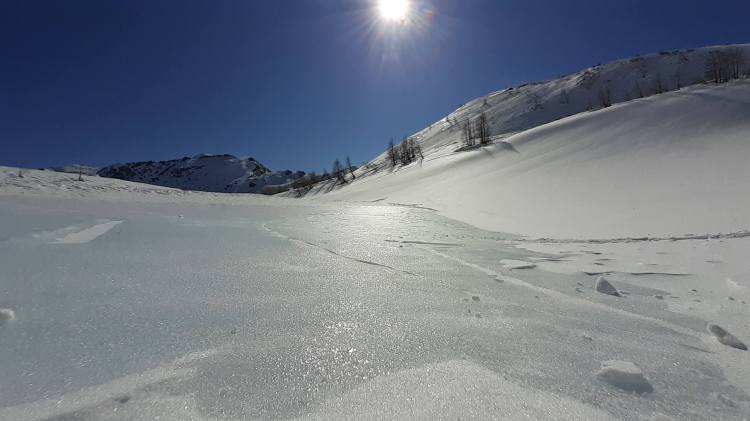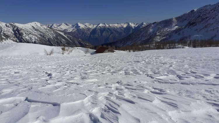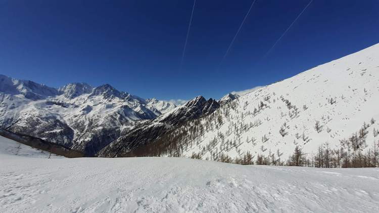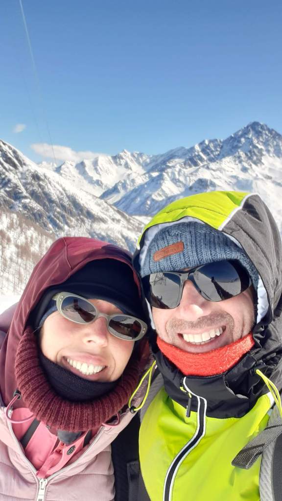 Oggi decidiamo di tornare in Val Bognanco e percorrere una “variante” dell’ Anello del Monscera (fatto qualche settimana fa). Vogliamo raggiungere prima il Lago del Monscera, poi il Passo del Monscera. Arriviamo a San Bernardo (1628 m) e dobbiamo parcheggiare sulla strada prima della chiesetta degli alpini, perché i 2 parcheggi sono già pieni. Infiliamo le ciaspole (oggi la neve è piuttosto fresca e soffice!) Arriviamo al ponte sul rio Rasiga e poi al Rifugio Il Dosso (1740 m). Proseguiamo su neve, non battuta di recente, ma abbastanza compatta… il percorso è sempre piuttosto ampio. Raggiungiamo Quota 2000, una montagnetta che io chiamo “piccola montagna con monumento”, dove ci fermiamo a mangiare velocemente… il vento non consente una sosta prolungata. Il panorama inizia già ad essere spettacolare e spazia su innumerevoli montagne bellissime! Procediamo verso l’ attacco del sentiero che porta al Lago del Monscera… il sentiero adesso non è più ampio, praticamente si riduce ad un paio di tracce lasciate dai ciaspolatori precedenti. In poco arriviamo alla croce che sovrasta il Lago e lo sguardo inizia a “catturare” più immagini possibili! Il Lago del Monscera (2072 m) è coperto da un manto nevoso che riflette la luce del sole e, in fondo a questo “specchio di neve”, parte una debole traccia che porta al Passo. Costeggiamo il Lago sulla destra piano e con attenzione, in quanto la traccia si restringe ancora e, in più tratti, devo procedere con una ciaspola davanti all’ altra. Il vento adesso è ancora più potente, ma proseguiamo. Arriviamo così al Passo del Monscera (2103 m) e lì si apre la meraviglia! Mi trovo esattamente al centro di un paesaggio che ha dell’ incredibile! Alla mia destra il Camoscellahorn (Pizzo Pioltone), alla mia sinistra la Cima Mattaroni e davanti i Giganti Svizzeri! Una sequenza di montagne stupende coperte di neve. Purtroppo possiamo fermarci solo pochissimi minuti, perché c’ è in atto una tormenta di vento! Ci copriamo con diversi strati tecnici, lasciando fuori solo gli occhi… anzi gli occhiali! Scendiamo veloci, ma dal versante opposto del Lago, in quanto abbiamo scorto un passaggio “fattibile” su neve fresca. Raggiungiamo la fine del Lago, che presenta una particolare “chiazza” di un colore azzurrino… vista la presenza un’ altra traccia lì vicino, che attraversa addirittura tutto il Lago bianchissimo, ci fidiamo dei “predecessori” e ci avviciniamo con tantissima cautela e solo per pochi secondi (comunque voi non fatelo!!). Torniamo alla bellissima croce e decidiamo di variare di pochissimo la discesa, passando anche per l’ Alpe Monscera (2020 m), sommersa di neve! Ritorniamo poi a Quota 2000 e poi si scende giù verso il Rifugio Il Dosso (1740 m). Pausa barretta e poi di nuovo al ponte del rio Rasiga e, infine, al parcheggio. Una giornata eccezionale, unica e meravigliosa!