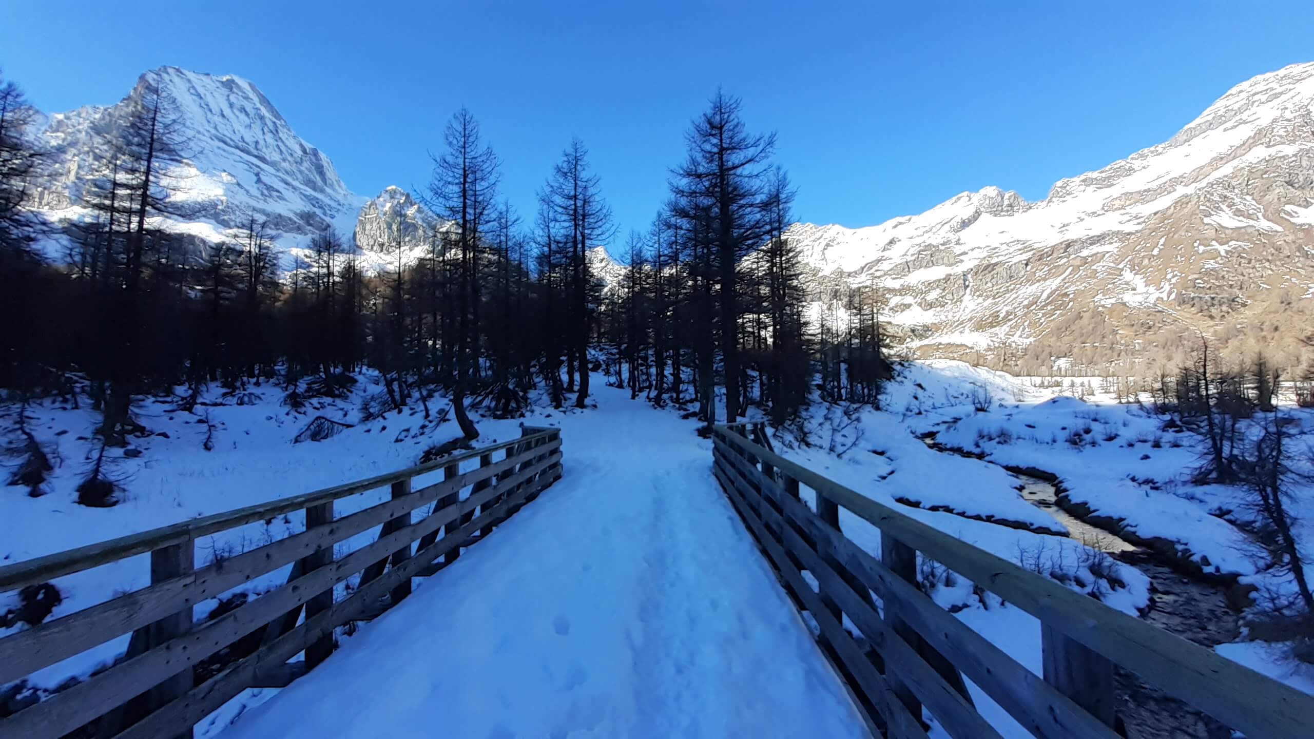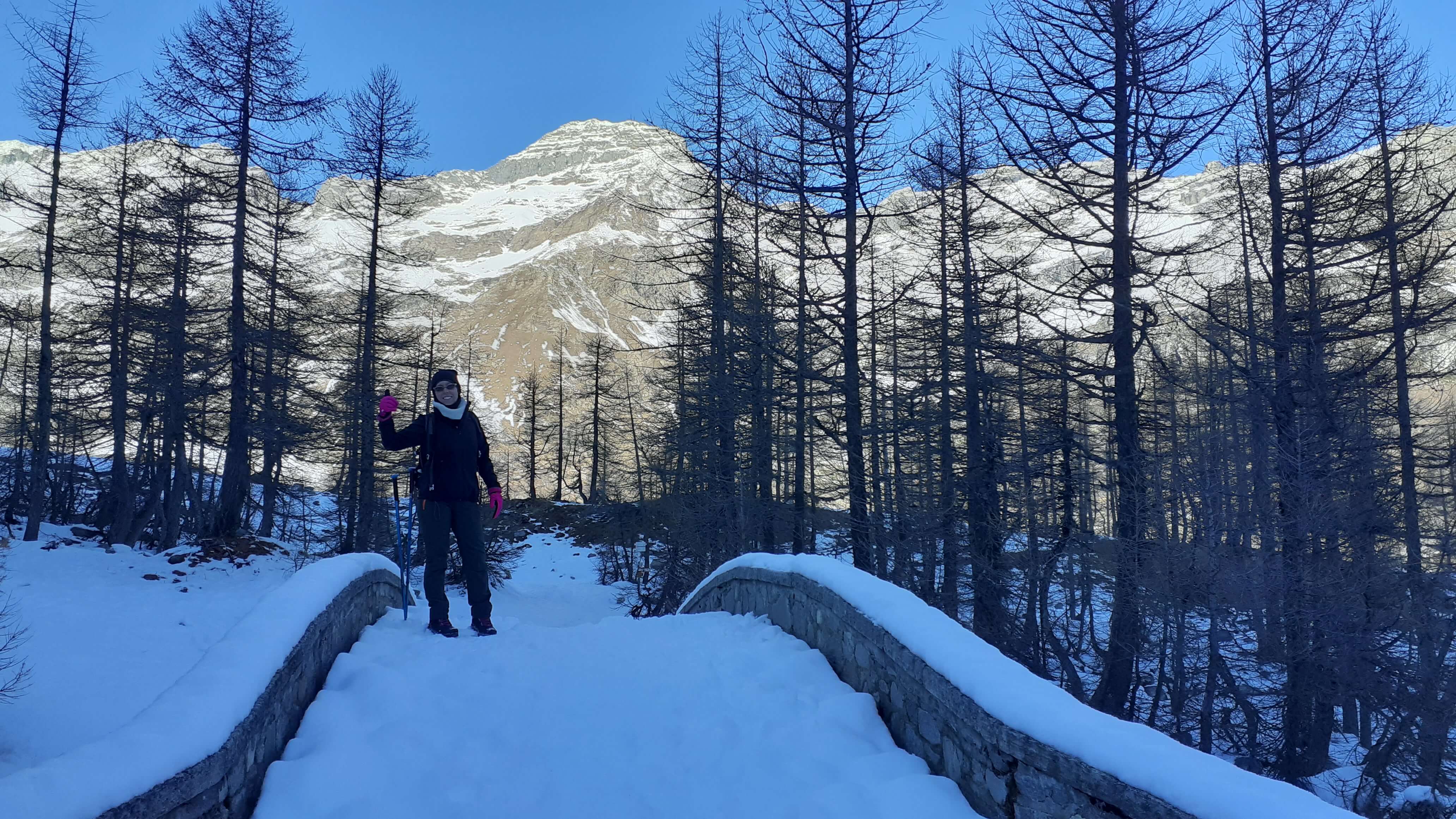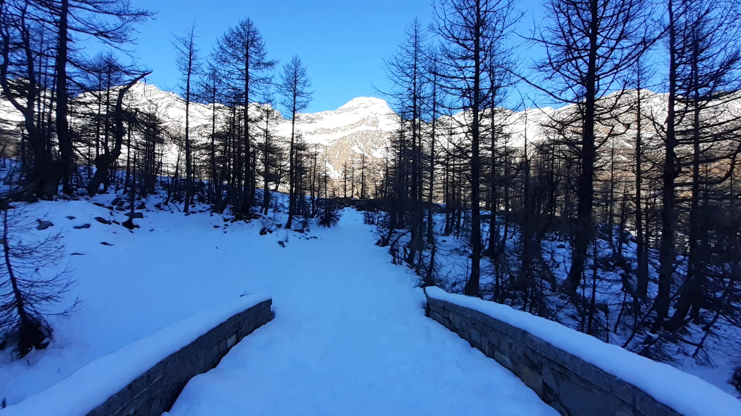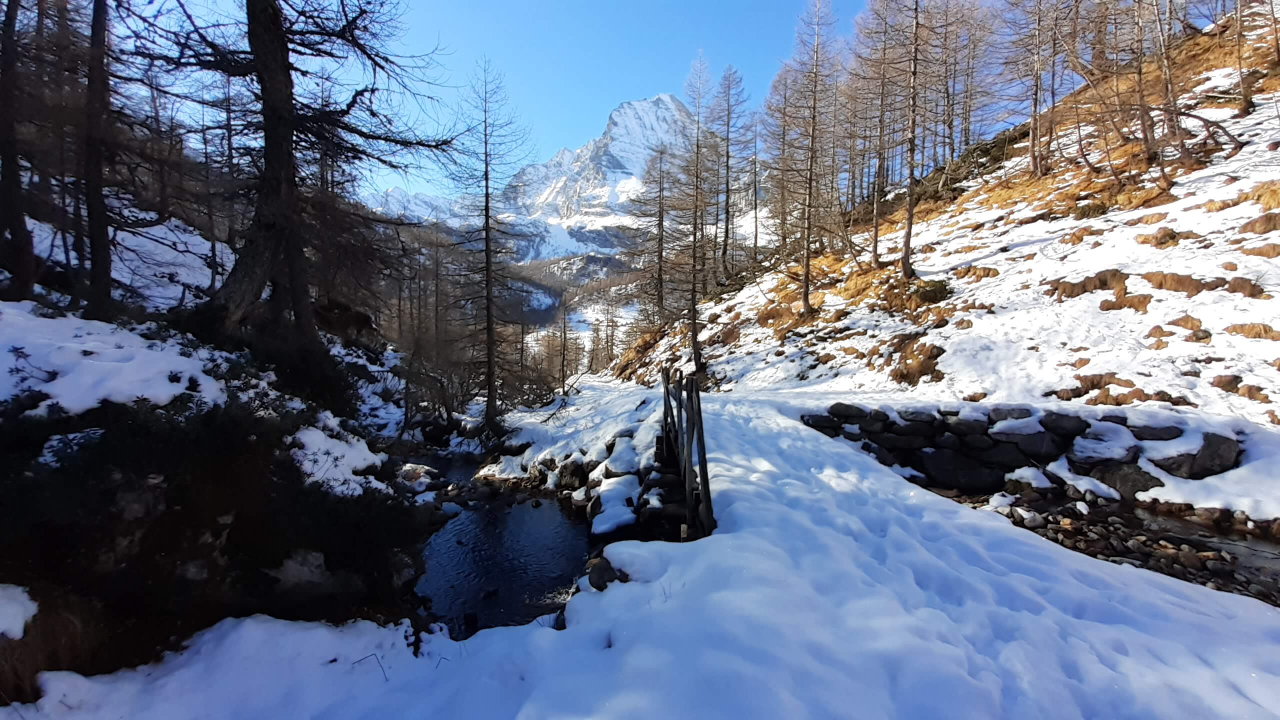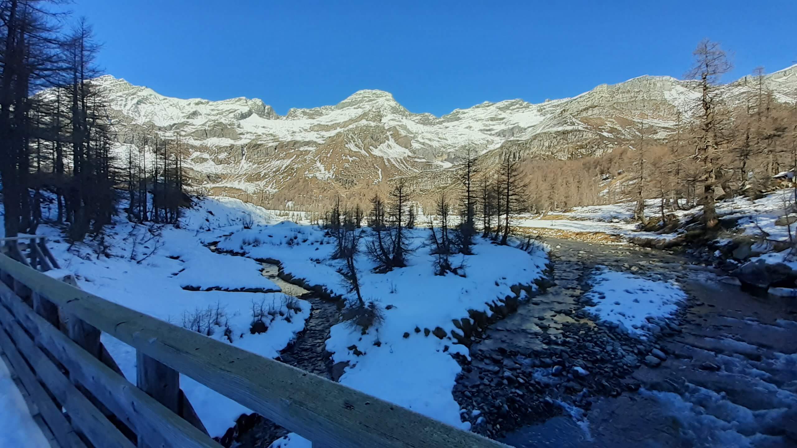 Secondo giorno del weekend… e decidiamo di salire all’ Alpe Veglia. L’ Alpe Veglia, dopo le prime nevicate, rimane isolata e non è più possibile raggiugerla da Pontecampo, per l’ alto rischio di slavine; in questi giorni però la neve è presente solo nella Piana dell’ Alpe Veglia e non sul percorso da Pontecampo, quindi non vogliamo perderci lo spettacolo dell’ Alpe Veglia “vestita di bianco” (cosa non sempre facile o scontata). Partiamo da Pontecampo (1320 m)… il parcheggio è vuoto… adoro l’ autunno in montagna! Al ponte prendiamo a destra sulla “direttissima” che taglia ed evita il primo tornante (si può anche procedere dritti subito su gippabile). Intercettiamo la gippabile e continuiamo a salire fino alla Cappella del Groppallo… senza neve. Da qui iniziano i tratti con la neve, alcuni dei quali sono ghiacciati e risultano scivolosi… procediamo con molta attenzione, perché la neve ha reso questi tratti più ripidi e più esposti, quindi anche pericolosi! Arriviamo all’ ingresso dell’ Alpe Veglia (1730 m) e la neve già conferisce a questo luogo stupendo un valore aggiunto! Prima piccola sosta al ponte sul rio Cianciavero per salutare il Monte Leone… sempre bellissimo! Oggi variamo il percorso e, dopo aver preso a destra e superato il grosso ponte di legno, saliamo seguendo le indicazioni per “La Balma” che raggiungiamo in poco tempo. La neve è della consistenza giusta per procedere solo con gli scarponi. La Balma (1780 m) è una località turistica abitata e frequentata solo d’ estate e adesso è completamente deserta… ci siamo solo noi! Pausa-pranzo, foto su foto e poi torniamo alla Piana dell’ Alpe Veglia; proseguiamo verso la località Cornù e poi verso la località Isola (1745 m). Oltrepassiamo il ponte e poi ci ritroviamo davanti alla sterrata che attraversa tutta la Piana dell’ Alpe Veglia. La percorriamo su neve fresca e morbida, ma si procede tranquillamente senza problemi. Ci fermiamo ad ammirare tutto il panorama… con il Monte Leone che domina in modo spettacolare tutta la scena e tutte le immagini! Passiamo davanti al piccolo borgo di Cianciavero, poi salutiamo l’ Alpe Veglia e, infine, ci apprestiamo a scendere e a tornare a Pontecampo (1320 m). Bellissima giornata in un ambiente favoloso… e siamo riusciti a vedere l’ Alpe Veglia “vestita di bianco”!