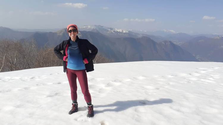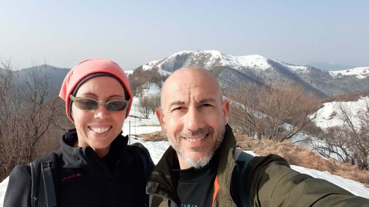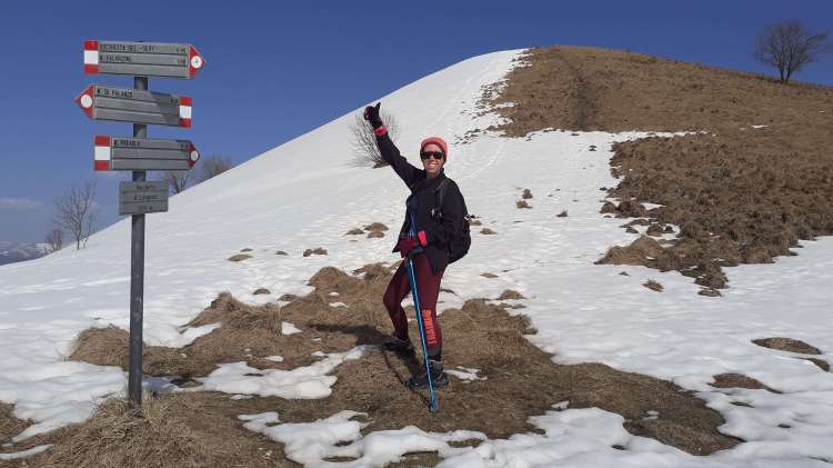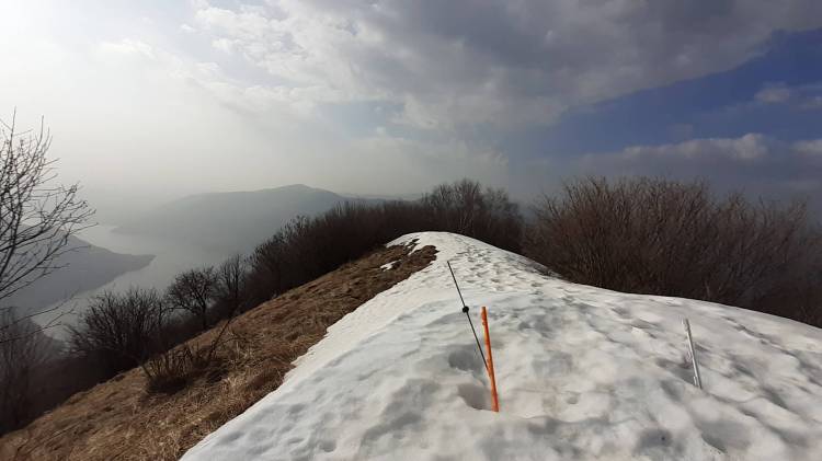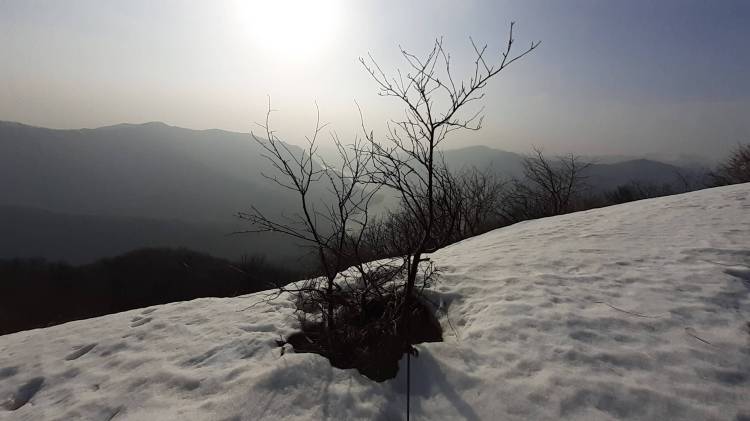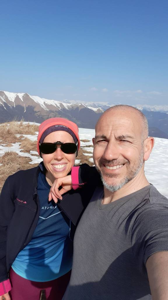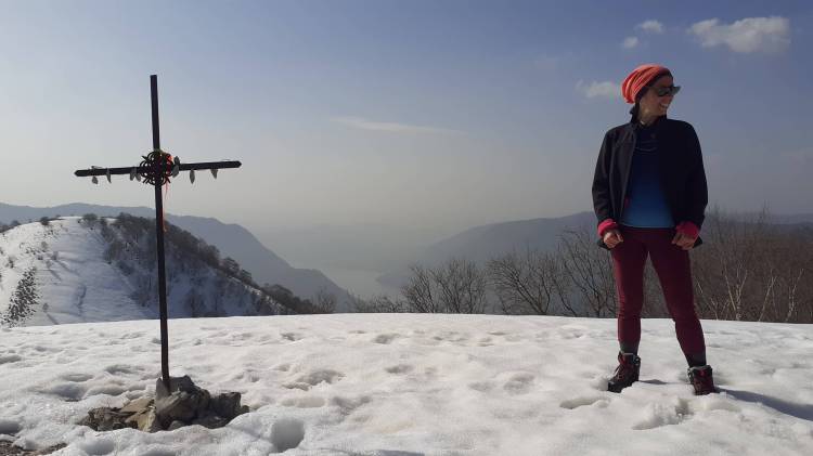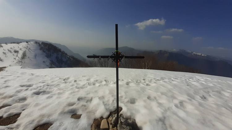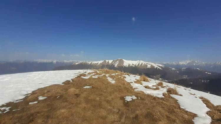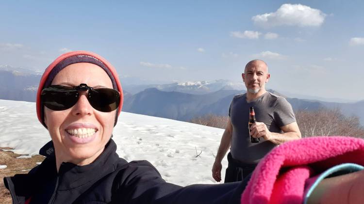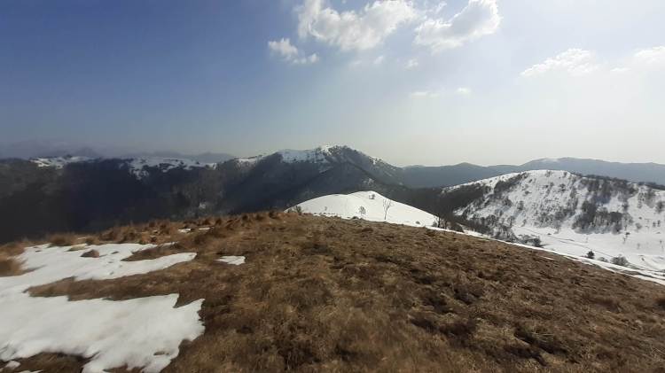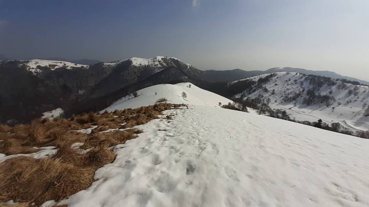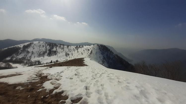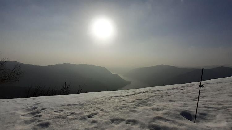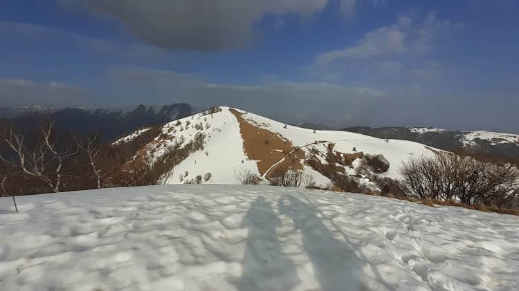 Oggi, prevedendo un po’ troppo affollamento nelle zone più conosciute, scegliamo 2 vette meno conosciute e meno frequentate ma belle ugualmente… il Monte Preaola e il Monte di Palanzo. Arriviamo alla Colma di Sormano (parcheggi già strapieni!) ma noi continuiamo verso Piano del Tivano, poi Piano di Nesso dove svoltiamo a sinistra e percorriamo una strada minore fino alla Boccola del Piano (980 m). Parcheggiamo circa 100 m prima della Cappella Alpina dalla quale, proseguendo dritti, parte il nostro percorso (indicato anche dal cartello bianco/rosso). La prima parte del percorso è tutta all’ interno del bosco e non presenta neve; dobbiamo “guadare” un piccolo torrente, senza nessuna difficoltà perché c’ è pochissima acqua, e poi continuiamo facendo molta attenzione al percorso perché si perde facilmente la traccia, non sempre evidente e non sempre segnata. In corrispondenza di alcune casette in pietra noi abbiamo proseguito salendo sul ripido pendio, facendoci strada sulla neve, fino ad intercettare un sentiero più ampio e pieno di neve, però più battuta. Da lì, in poco, si arriva alla Bocchetta del Sciff (1260 m). Ormai siamo fuori dal bosco e il panorama adesso è molto più ampio! Piccola pausa e poi si continua, seguendo le indicazioni, verso la Bocchetta di Lavignacc che raggiungiamo seguendo un ampio e comodo sentiero, sempre su neve. Siamo alla Bocchetta di Lavignacc (1330 m) e la vista inizia a spaziare dappertutto! Da qui a destra si sale al Monte Preaola, a sinistra al Monte di Palanzo; decidiamo di salire prima al Monte Preaola. Questo versante rimane più esposto al sole, quindi procediamo facendoci strada tra i ciuffi d’ erba e la poca neve. Arriviamo sulla vetta del Monte Preaola (1415 m) con superlativa vista sul Monte San Primo… e non solo! Pausa pranzo e poi infiliamo i ramponi (fini qui abbiamo proseguito solo con gli scarponi). Scendiamo lungo una piccola cresta di neve bianchissima, intatta e morbida… ci apriamo il percorso sprofondando più volte nella neve fino al ginocchio! Arriviamo alla fine della cresta e poi torniamo giù, intercettando il comodo sentiero che ci riporta alla Bocchetta di Lavignacc (1330 m). Da qui saliamo sul Monte di Palanzo (1390 m)… altra bellissima vista e poi seguiamo anche la cresta del Monte di Palanzo. La discesa verso la Bocchetta del Sciff non è delle più semplici… tanta neve, non battuta e molto morbida… si sprofonda quasi ad ogni passo e anche oltre il ginocchio! Finalmente arriviamo alla Bocchetta del Sciff (1260 m)… un’ altra piccola pausa che ci permette di ammirare ancora il Monte Palanzone, ma non solo, che ci ha accompagnati per tutto il percorso. Rientriamo di nuovo nel bosco e torniamo alla Boccola del Piano (980 m) e alla nostra macchina. Bellissima giornata che ci ha permesso di raggiungere 2 vette e di ammirare stupendi panorami sulle montagne circostanti e su Lago di Como… il tutto nell’ assoluto silenzio e solitudine… 2 sole persone incontrate in tutto il percorso e in tutta l’ intera giornata!