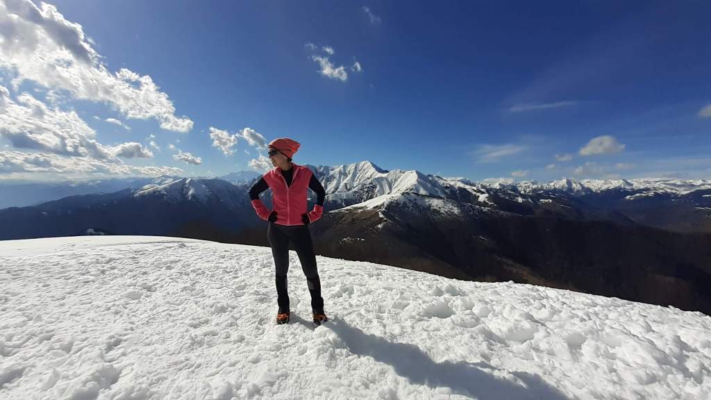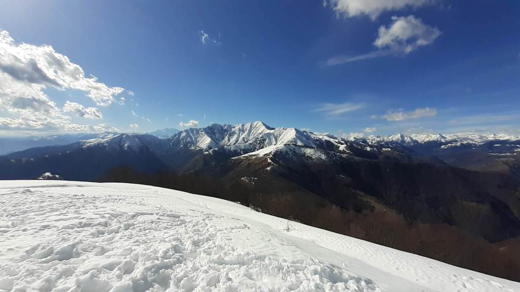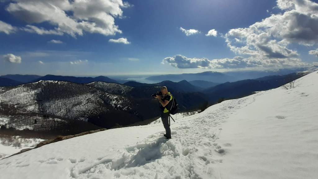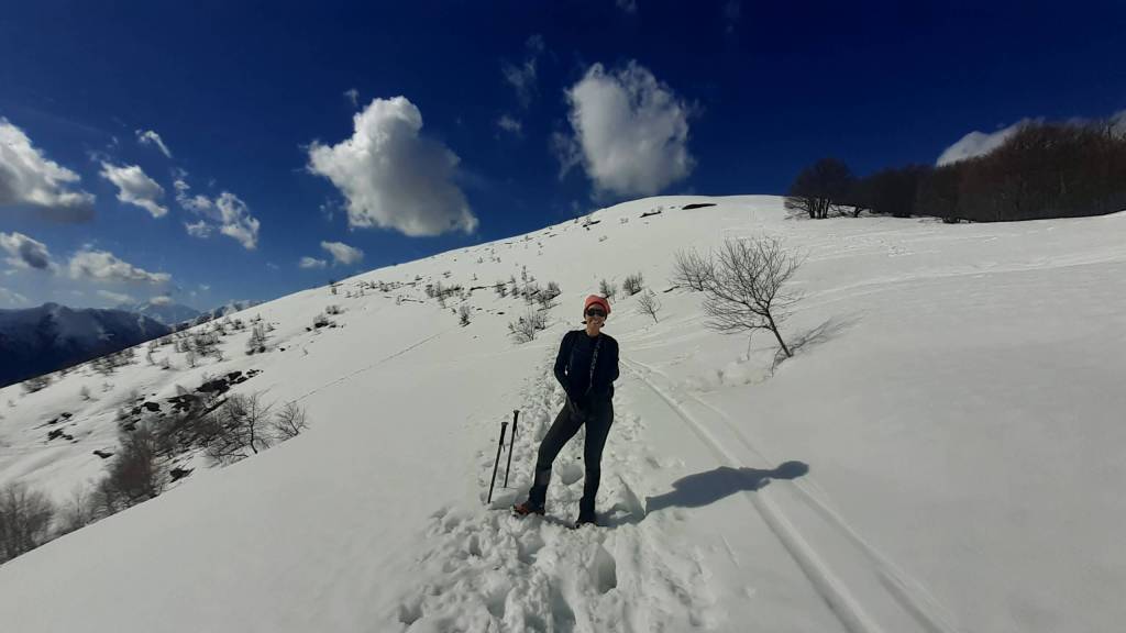 Oggi solo metà giornata a disposizione, quindi organizziamo una salita breve e non particolarmente impegnativa. Dalla località Il Colle (1220 m) iniziamo a salire sul primo tratto con neve acquosa, che ci porta ai tornanti dove la neve aumenta e si inizia a sprofondare! Alcuni tornanti risultano un po’ esposti a causa della quantità di neve che si è accumulata… procediamo con cautela e attenzione. Questo percorso, di per sè semplice, oggi risulta impegnativo per la quantità e la condizione della neve. Eccoci in Vetta al Monte Spalavera (1536 m)… panorama infinito! Foto su foto e poi iniziamo la discesa, lungo lo stesso percorso della salita fino a Il Colle (1220 m).