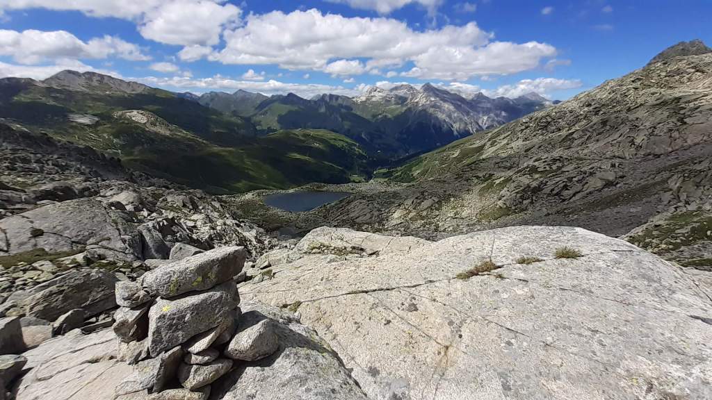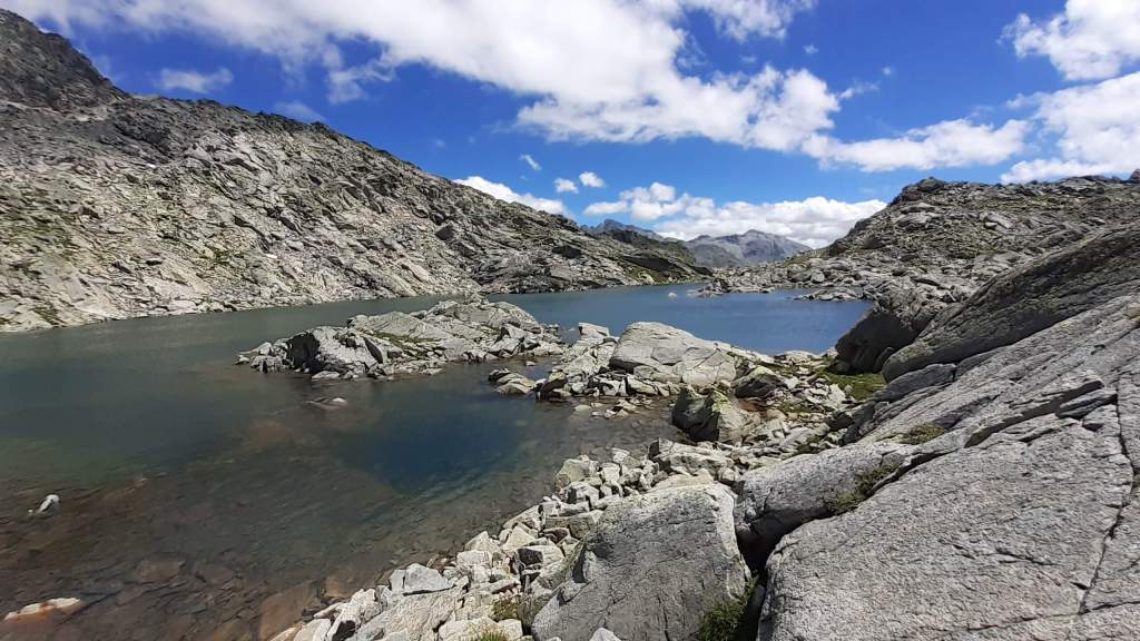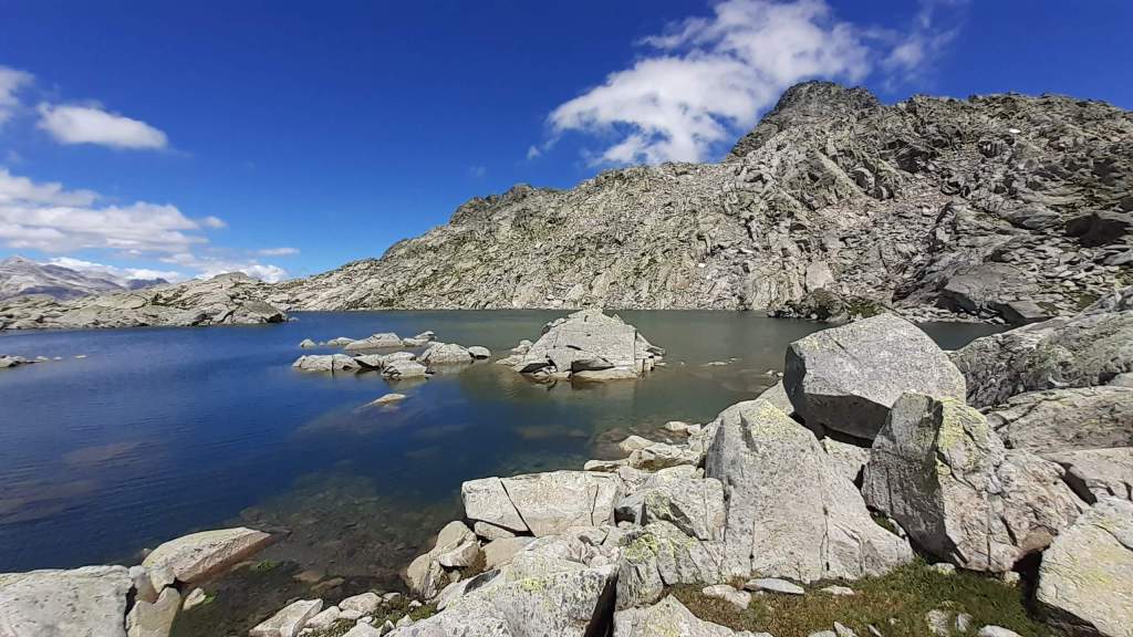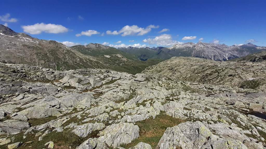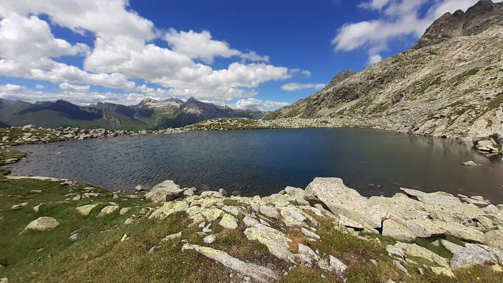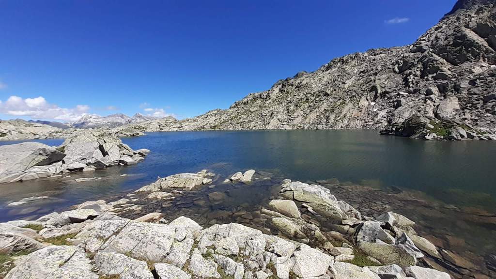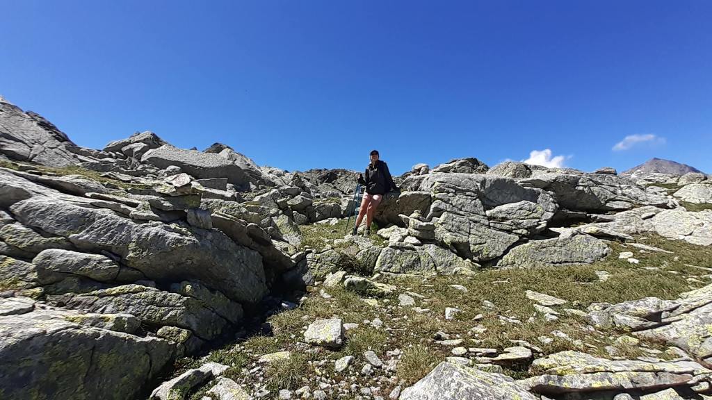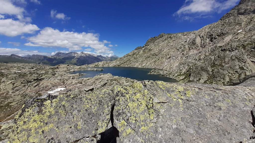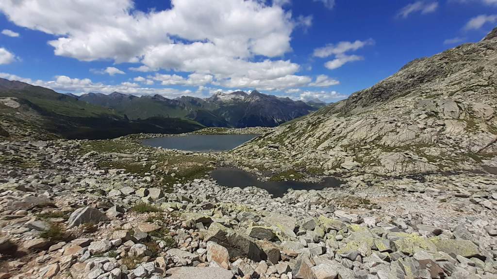 Weekend a Montespluga! Stamattina partiamo da Montespluga (1910 m) e, poco prima del parcheggio dell’ albergo e dei camper, seguiamo il sentiero indicato dal cartello “Laghi Azzurri” e segnato da alcune piccole bandierine rosse tra l’ erba. Ad un piccolo bivio le bandierine proseguono dritte, noi invece saliamo in maniera decisa a sinistra… inizia il Vallone della Zocapel (Vallone della Caurghetta)!! Si tratta di un vallone piuttosto ripido costituito da una prima parte di erba e terra, con il percorso sempre ben tracciato e visibile; la seconda parte (dai 2200 m circa) si sviluppa su pietraia e sassaia ripida e molto impegnativa! (P.S. si procede tra grossi massi, alternati a brevi tratti di percorso su terra che indicano la via di salita). Infilo i guanti di arrampicata e… si sale!! Arriviamo alla Bocchetta della Zocapel (2450 m) e qui il panorama è eccezionale!!!… verso il Lago di Montespluga e verso le montagne intorno!! Sono presenti dei piccoli specchi d’ acqua, i Laghetti Azzurri, che anticipano la bellezza del Lago Azzurro (2440 m) che nasce direttamente tra le pietre e i sassi!! Stupendo!! Foto su foto… una piccola pausa e poi… si sale ancora verso il Pizzo della Casa. Non c’ è un percorso… si sale, non senza difficoltà, su pietraia e sassaia tenendo conto di alcuni “omini di pietra” lungo la salita. Ed eccoci all’ ultimo tratto, ripido e piuttosto esposto, che ci porta alla vetta del Pizzo della Casa (2525 m)!! Panorama che diventa infinito… infinita bellezza! Il Lago di Montespluga, il Pizzo Ferré, il Pizzo Tambò, il Pizzo Spadolazzo, il Pizzo di Emet, il Lago Azzurro raggiunto poco prima, il Lago Nero… ci sono proprio tutti!! Mangiamo qui il nostro panino e poi, con molta attenzione e prudenza, torniamo al Lago Azzurro (2440 m). Ci portiamo alla fine del lago e da qui, sentiero indicato dai cartelli, scendiamo in direzione del Lago di Bergseeli (il Lago Bergseeli si vede già dall’ alto!). Anche il vallone per Bergseeli, ovvero il sentiero Bergseeli-Lago Azzurro, si sviluppa su pietraia e sassaia ripida! Scendiamo con molta cautela e… eccoci al bellissimo Lago Bergseeli (2309 m)… foto su foto… pausa merenda e poi giù, verso il Passo dello Spluga. Il percorso diventa meno impegnativo e si procede tranquillamente su sentiero terroso con qualche sporadico e semplice passaggio su pietre (il Passo dello Spluga è sempre visibile). In poco arriviamo al Passo dello Spluga (2115 m) e, per evitare di tornare a Montespluga “su asfalto”, prendiamo il sentiero che costeggia il torrente Liro, al principio della Val Loga, che ci riporta a Montespluga (1910 m). Percorso ad anello spettacolare… impegnativo ma unico e decisamente favoloso!!