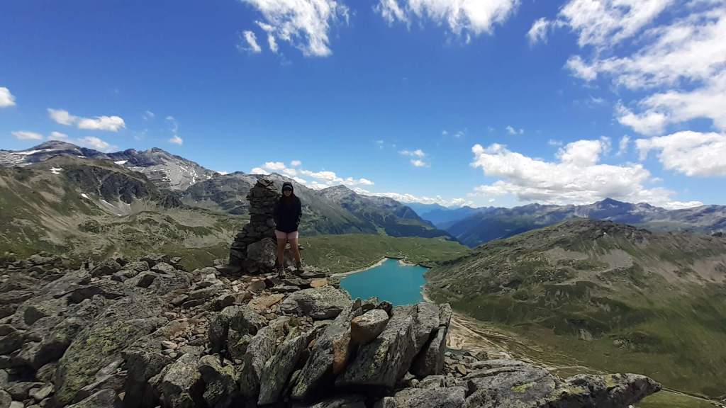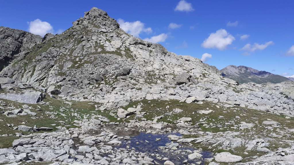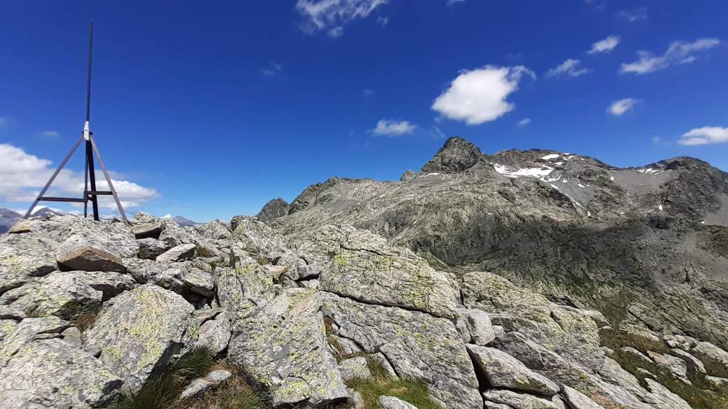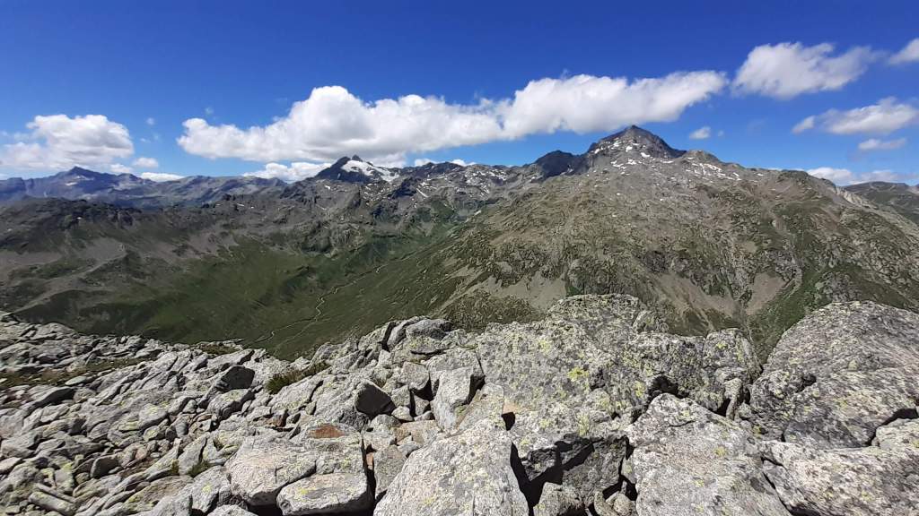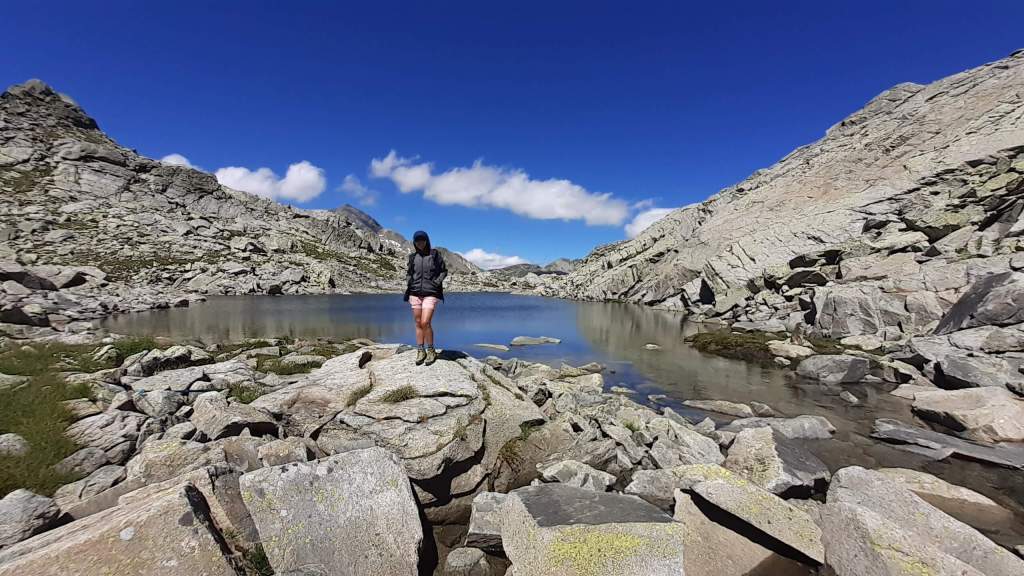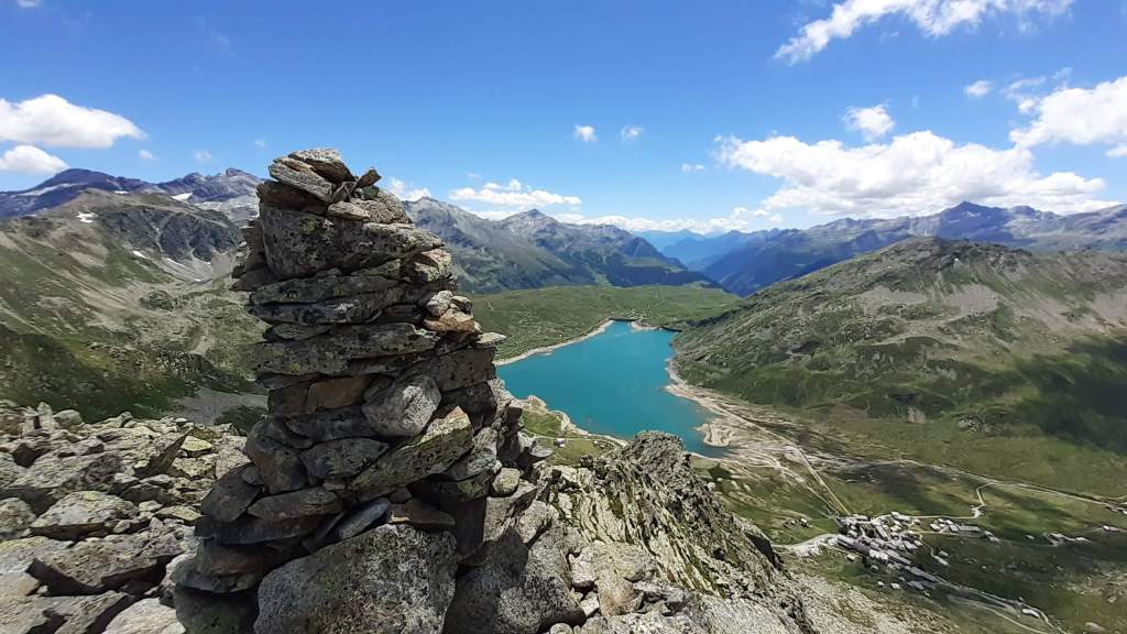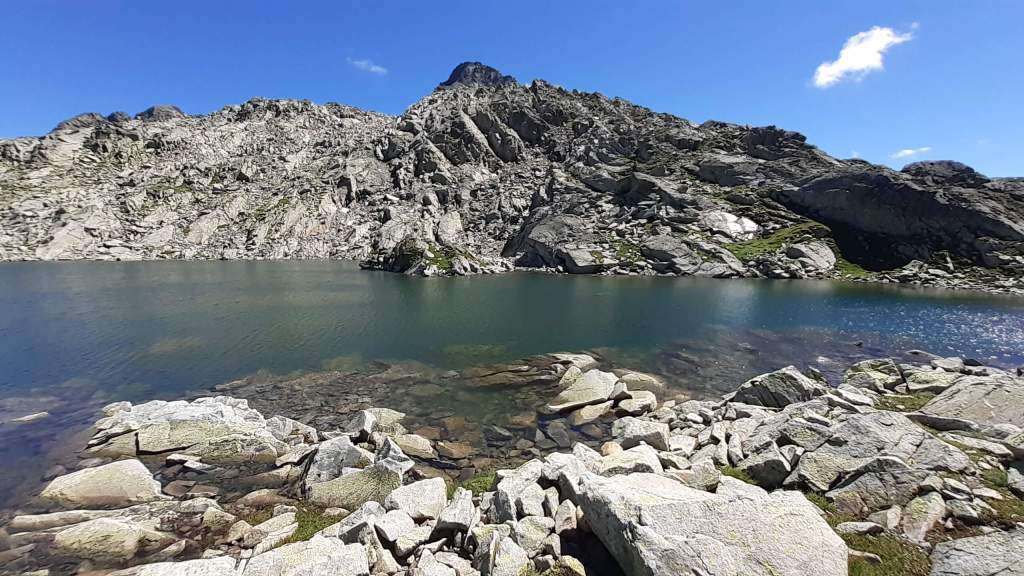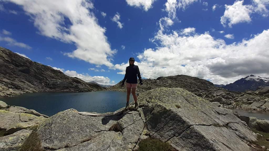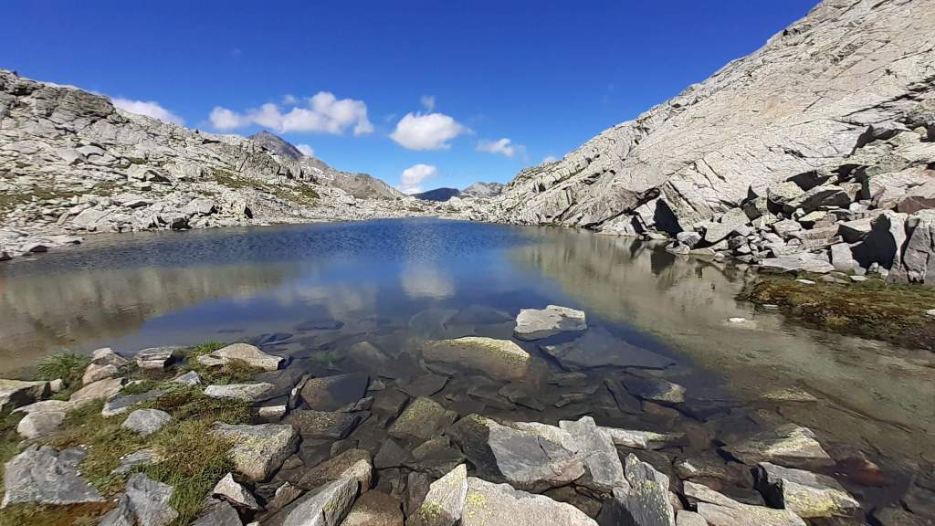 Weekend a Montespluga! Stamattina partiamo da Montespluga (1910 m) e, poco prima del parcheggio dell’ albergo e dei camper, seguiamo il sentiero indicato dal cartello “Laghi Azzurri” e segnato da alcune piccole bandierine rosse tra l’ erba. Ad un piccolo bivio le bandierine proseguono dritte, noi invece saliamo in maniera decisa a sinistra… inizia il Vallone della Zocapel (Vallone della Caurghetta)!! Si tratta di un vallone piuttosto ripido costituito da una prima parte di erba e terra, con il percorso sempre ben tracciato e visibile; la seconda parte (dai 2200 m circa) si sviluppa su pietraia e sassaia ripida e molto impegnativa! (P.S. si procede tra grossi massi, alternati a brevi tratti di percorso su terra che indicano la via di salita). Infilo i guanti di arrampicata e… si sale!! Arriviamo alla Bocchetta della Zocapel (2450 m) e qui il panorama è eccezionale!!!… verso il Lago di Montespluga e verso le montagne intorno!! Sono presenti dei piccoli specchi d’ acqua, i Laghetti Azzurri, che anticipano la bellezza del Lago Azzurro (2440 m) che nasce direttamente tra le pietre e i sassi!! Stupendo!! Foto su foto… una piccola pausa e poi… si sale ancora verso il Pizzo della Casa. Non c’ è un percorso… si sale, non senza difficoltà, su pietraia e sassaia tenendo conto di alcuni “omini di pietra” lungo la salita. Ed eccoci all’ ultimo tratto, ripido e piuttosto esposto, che ci porta alla vetta del Pizzo della Casa (2525 m)!! Panorama che diventa infinito… infinita bellezza! Il Lago di Montespluga, il Pizzo Ferré, il Pizzo Tambò, il Pizzo Spadolazzo, il Pizzo di Emet, il Lago Azzurro raggiunto poco prima, il Lago Nero… ci sono proprio tutti!! Mangiamo qui il nostro panino e poi, con molta attenzione e prudenza, torniamo al Lago Azzurro (2440 m). Ci portiamo alla fine del lago e da qui, sentiero indicato dai cartelli, scendiamo in direzione del Lago di Bergseeli (il Lago Bergseeli si vede già dall’ alto!). Anche il vallone per Bergseeli, ovvero il sentiero Bergseeli-Lago Azzurro, si sviluppa su pietraia e sassaia ripida! Scendiamo con molta cautela e… eccoci al bellissimo Lago Bergseeli (2309 m)… foto su foto… pausa merenda e poi giù, verso il Passo dello Spluga. Il percorso diventa meno impegnativo e si procede tranquillamente su sentiero terroso con qualche sporadico e semplice passaggio su pietre (il Passo dello Spluga è sempre visibile). In poco arriviamo al Passo dello Spluga (2115 m) e, per evitare di tornare a Montespluga “su asfalto”, prendiamo il sentiero che costeggia il torrente Liro, al principio della Val Loga, che ci riporta a Montespluga (1910 m). Percorso ad anello spettacolare… impegnativo ma unico e decisamente favoloso!!