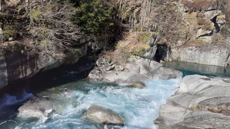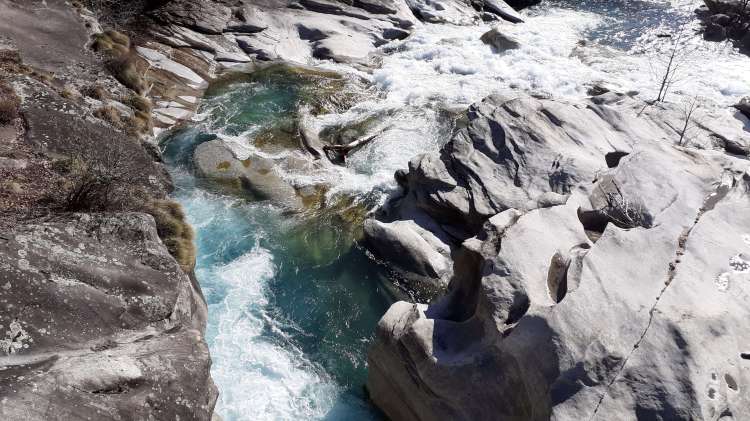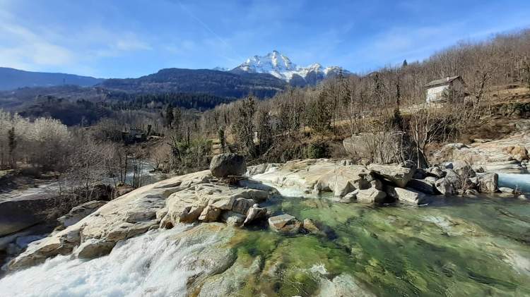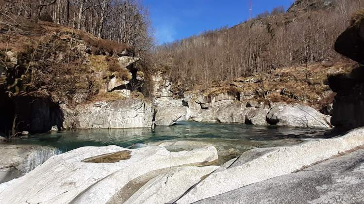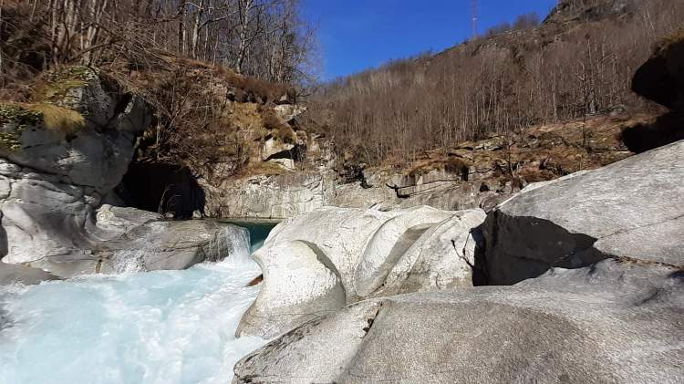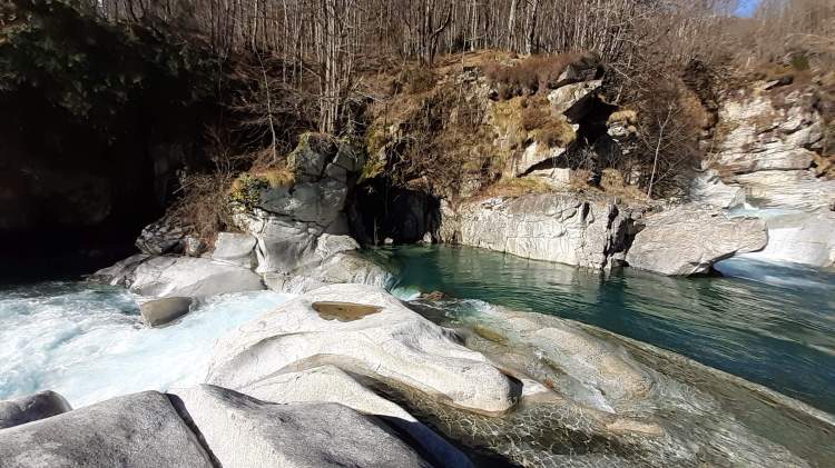 Terza tappa : Marmitte dei Giganti di Maiesso (550 m). La potenza dell’ acqua, nell’ arco dei secoli, ha ‘scolpito’ in modo unico la roccia, trasformando il paesaggio in un alternarsi di rocce lucide, cunette di pietra, vortici di schiuma bianca e vasche che vanno dal turchese all’azzurro intenso.