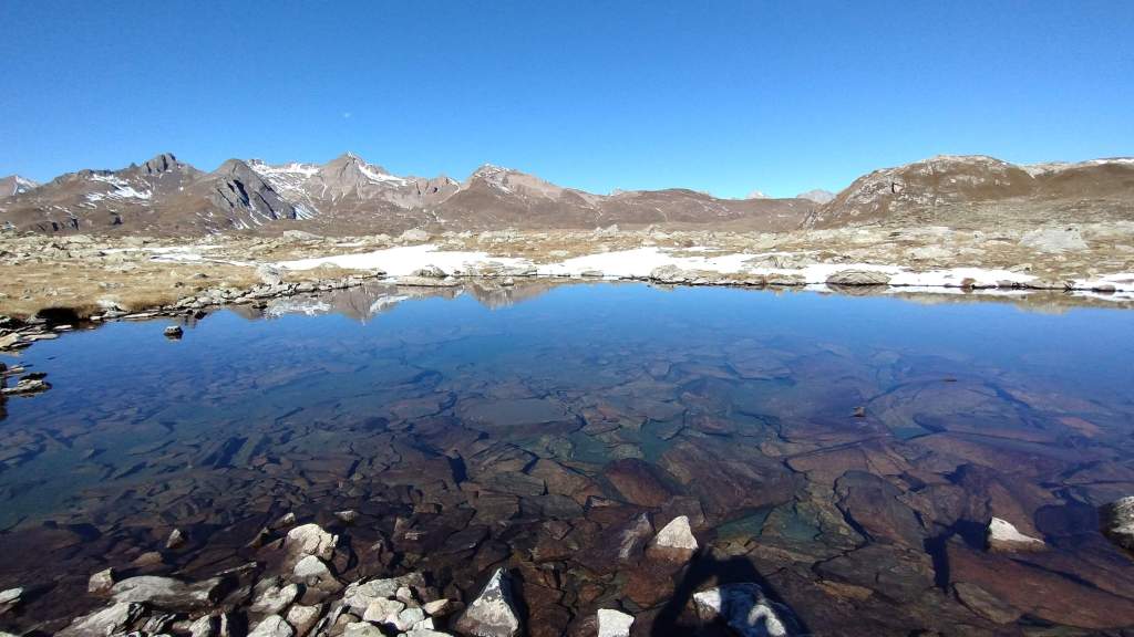 Partiamo da Riale (1740 m) e saliamo, su direttissime, fino al bivio Kastel/Toggia e poi al Lago Kastel (2220 m). Proseguiamo fino all’ Alpe Kastel (2250 m) e poi agli spettacolari Laghi del Boden (da 2290 m a 2370 m)… diversi specchi d’ acqua e 2 più grandi : Lago del Boden Inferiore e Superiore. Tra questi ultimi due saliamo sul versante della Bocchetta di Valmaggia : primo tratto con un po’ di neve; secondo tratto tra pietre, sassi, massi e neve; quando la neve diventa instabile, non tiene più e si sprofonda, torniamo giù (quota 2540 m). Saliamo alla Rupe del Gesso (2440 m) e poi scendiamo dal versante svizzero fino al Passo San Giacomo (2320 m) con il suo laghetto. Proseguiamo costeggiando il Lago Toggia (vuoto per lavori) e passando davanti al Rifugio Maria Luisa (2150 m). Piccola sosta al Laghetto Roni e poi, lungo le direttissime, torniamo a Riale (1740 m).