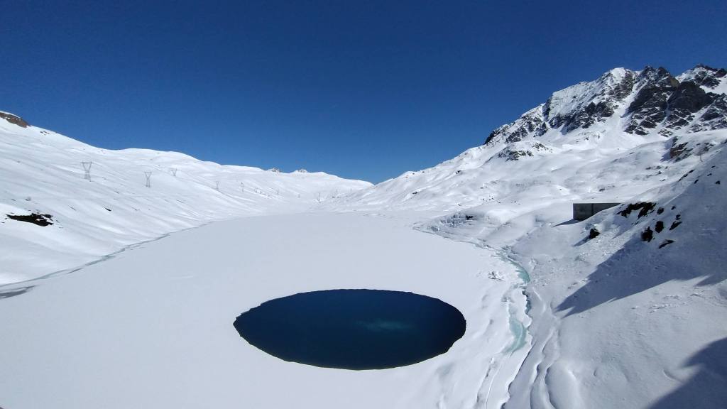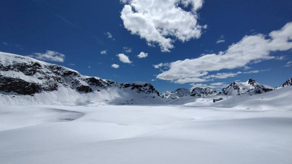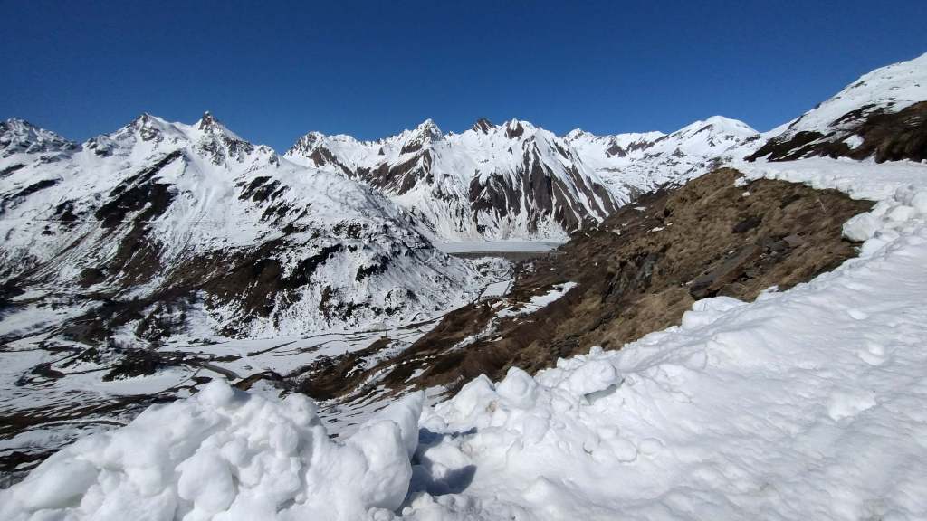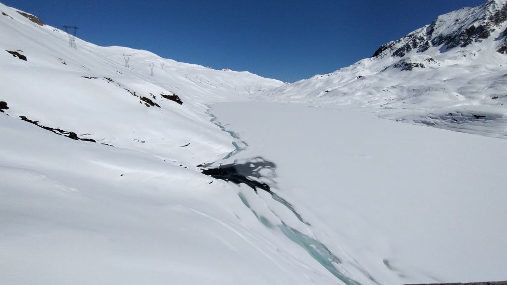 Partiamo da Riale (1730 m) e, salendo lungo il versante del Kastel sui tornanti, raggiungiamo il piccolo Laghetto Roni, ancora tutto coperto di bianco. Proseguiamo fino al bivio Kastel/Toggia e poi, passando davanti al Rifugio Maria Luisa (2150 m), saliamo anche alla Diga del Lago Toggia (2190 m)… disgelo del Lago Toggia spettacolare!! Pausa panino e poi scendiamo verso il Rifugio Maria Luisa (2150 m) e il bivio Kastel/Toggia; saliamo al Lago Kastel (2230 m)… coperto di bianco e suggestivo, come sempre!! Scendiamo di nuovo lungo i tornanti fino a Riale (1720 m) e poi saliamo anche al Lago di Morasco (1820 m)… disgelo bellissimo! Infine torniamo a Riale (1730 m).