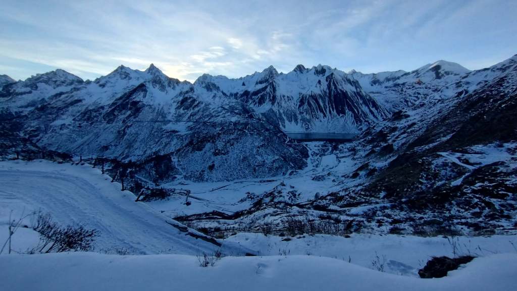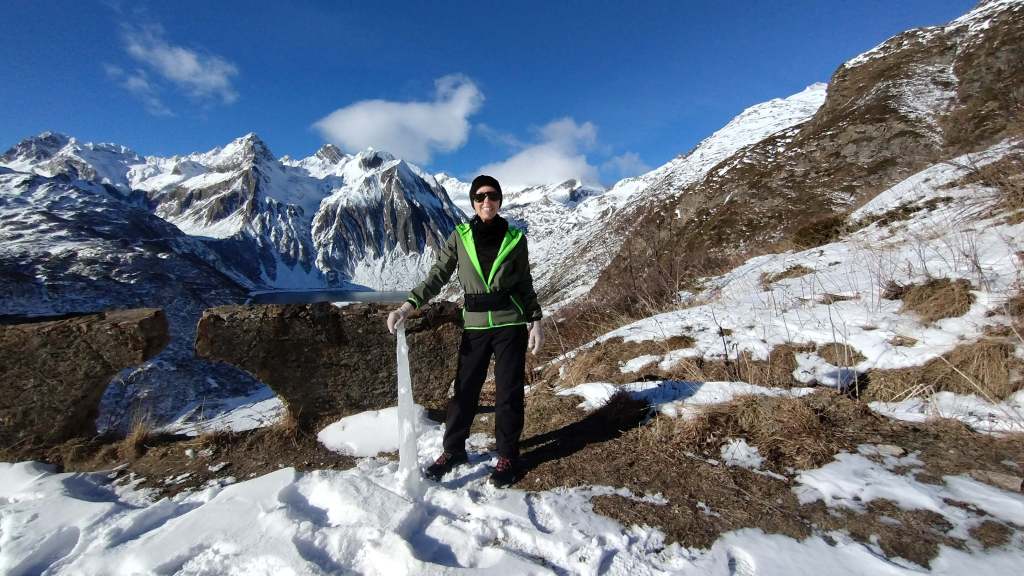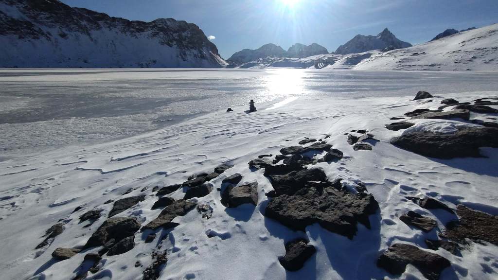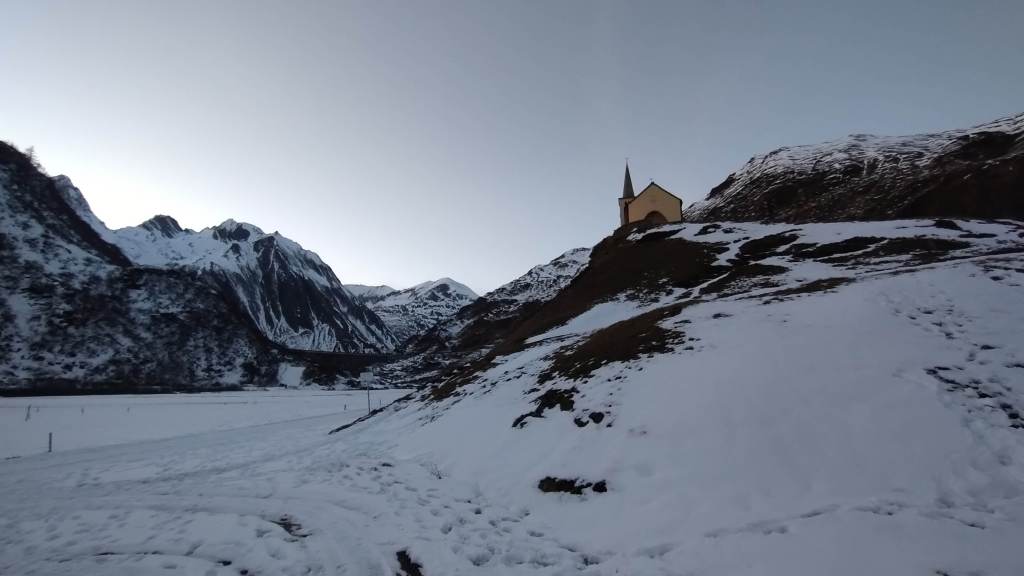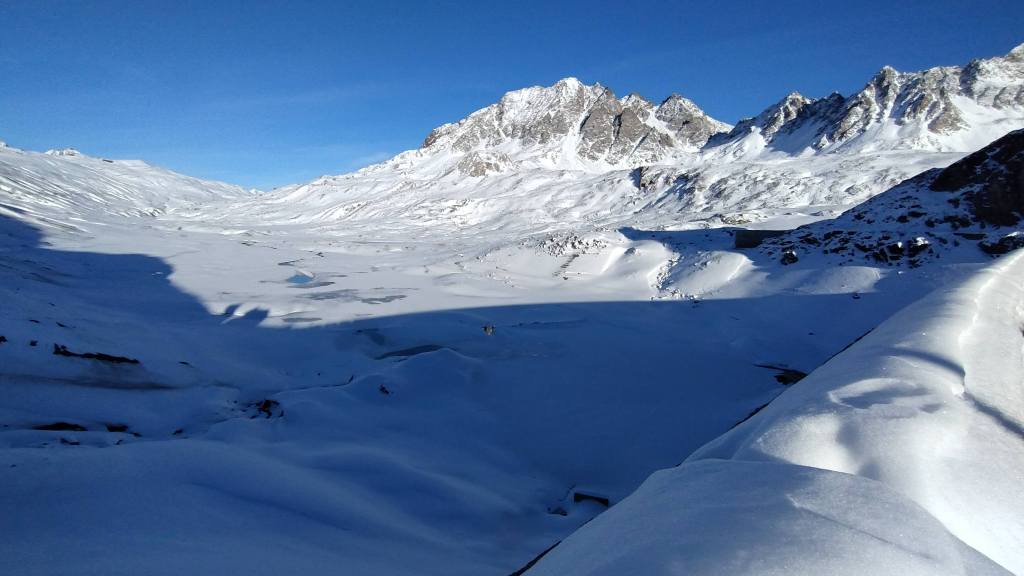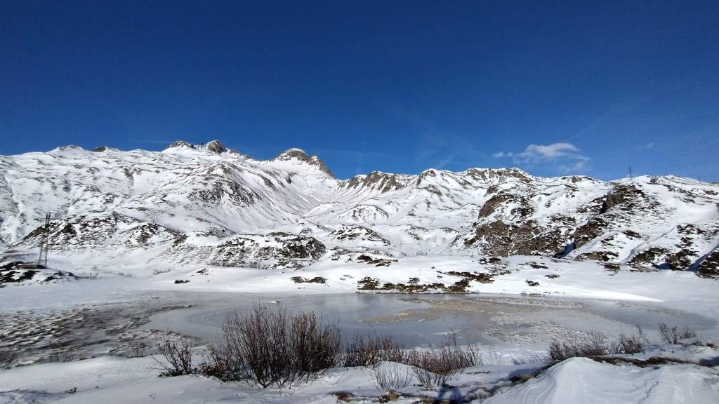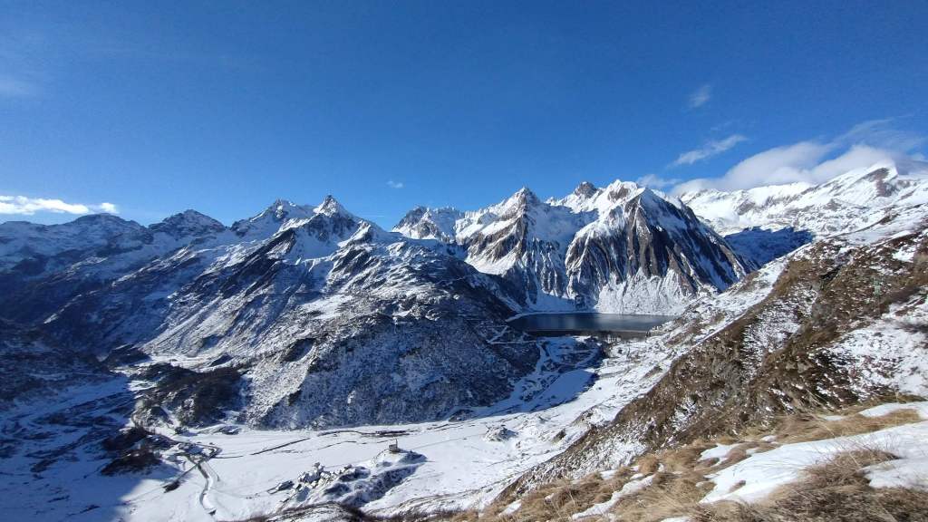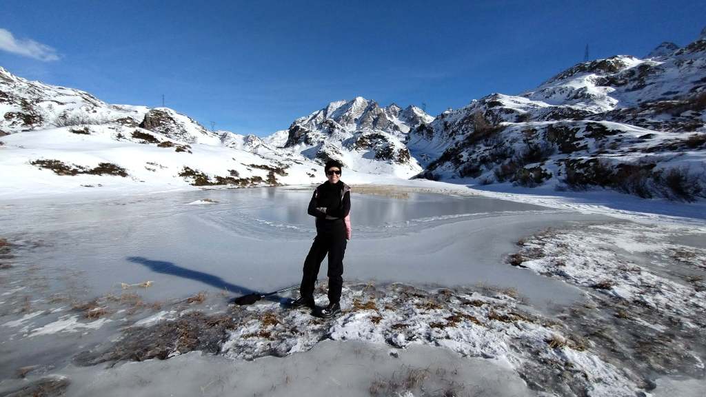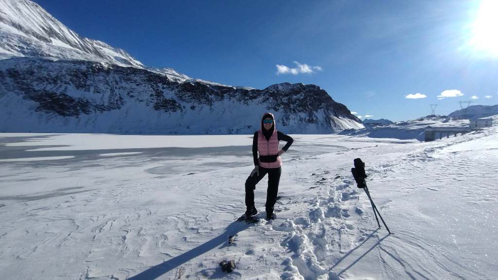 Oggi prima salita su neve!! Partiamo da Riale (1730 m) e saliamo lungo i tornanti del versante del Lago Kastel (neve battuta, si sale solo con gli scarponi). Piccola sosta al bellissimo Laghetto Roni e poi raggiungiamo il Lago Kastel (2230 m)… congelamento quasi ultimato e di una bellezza straordinaria! Seguiamo il versante a destra della diga (solo una traccia dove si sprofonda anche fino alle ginocchia) e arriviamo a fine lago… pausa panino, foto su foto e poi torniamo indietro. Veloce salita anche alla Diga del Lago Toggia (2190 m) e poi scendiamo, sempre lungo tutti i numerosi e panoramici tornanti, fino a tornare a Riale (1730 m).