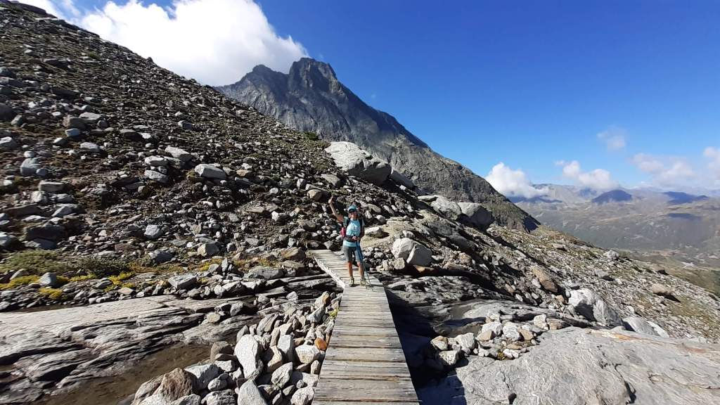 Inizia una mini-vacanza in Svizzera! Siamo al Passo del Sempione (2005 m) e da qui partiamo per un percorso grandioso che era da un po’ che volevamo fare… il Rifugio Monte Leone (Monte Leone Hutte)! Raggiungiamo l’ Ospizio del Sempione e, lasciandoci prima a destra e poi alle spalle il piccolo Laghetto Rotelsee, saliamo su percorso inizialmente con leggera pendenza costante e poi più ripido. Si attraversano anche alcuni ponti di legno su torrenti e lunghe passerelle molto caratteristiche sempre su torrenti. Il percorso è piuttosto lungo ma il panorama che ci accompagna è sempre grandioso!… il Monte Leone fa sicuramente da padrone! Il percorso è sempre ben tracciato e… un ultimo strappo… ed eccoci a Kaltwasserpass (2785 m). L’ ambiente è già favoloso! Il Monte Leone… il Laghetto Chaltwassersee… il Rifugio Monte Leone (Monte Leone Hutte) già visibile… il Maderhorn! Decidiamo di salire prima sul Maderhorn… saliamo a sinistra, indicazione ‘Maderlicka’ (2887 m) che raggiungiamo in breve e, da qui, prendendo a sinistra arriviamo alla Vetta Centrale del Maderhorn (2900 m)… stupenda!! Foto su foto e poi torniamo a Maderlicka (2887 m) e, percorrendo un traverso molto esposto, ripido e roccioso/pietroso (tratto pericoloso!), arriviamo anche alla Cima nord-est del Maderhorn (2945 m)…. spettacolo!!! Da qui la vista sul Monte Leone e sulla Punta di Terrarossa è spettacolare!! Scendiamo in direzione del bivio per poi proseguire, dopo la pausa-panino, verso il Rifugio Monte Leone (Monte Leone Hutte) (2848 m). Oltrepassiamo il rifugio e seguiamo il percorso che ci porta fino ai resti del Bivacco Beniamino Farello (2740 m)… vista incredibile su tutta Veglia! Da qui poi proseguiamo verso la Bocchetta di Aurona (2770 m) con vista stupenda sul Laghetto Chaltwassersee al quale passiamo molto vicini… le foto qui si rincorrono! Da qui continuiamo anche verso il vicino Ghiacciaio Chaltwassergletscher… purtroppo molto ridotto! Lo lasciamo poi alle spalle e saliamo verso Kaltwasserpass ma, invece di tornare lì, prendiamo a sinistra e percorriamo la bellissima cresta che ci porta, dopo un po’, ad intercettare il percorso dell’ andata. Quindi passiamo di nuovo le passerelle di legno e i ponti di legno sui torrenti (P.S. al pomeriggio l’ acqua dei torrenti è molto più abbondante e vorticosa rispetto alla mattina!) ed eccoci di nuovo in vista del Laghetto Rotelsee che decidiamo di raggiungere (2050 m) prima di tornare all’ Ospizio del Sempione e quindi anche al Passo del Sempione (2005 m). Giornata spettacolare… percorso stupendo, bellissimo, unico ed emozionante…. una giornata decisamente da ricordare!!