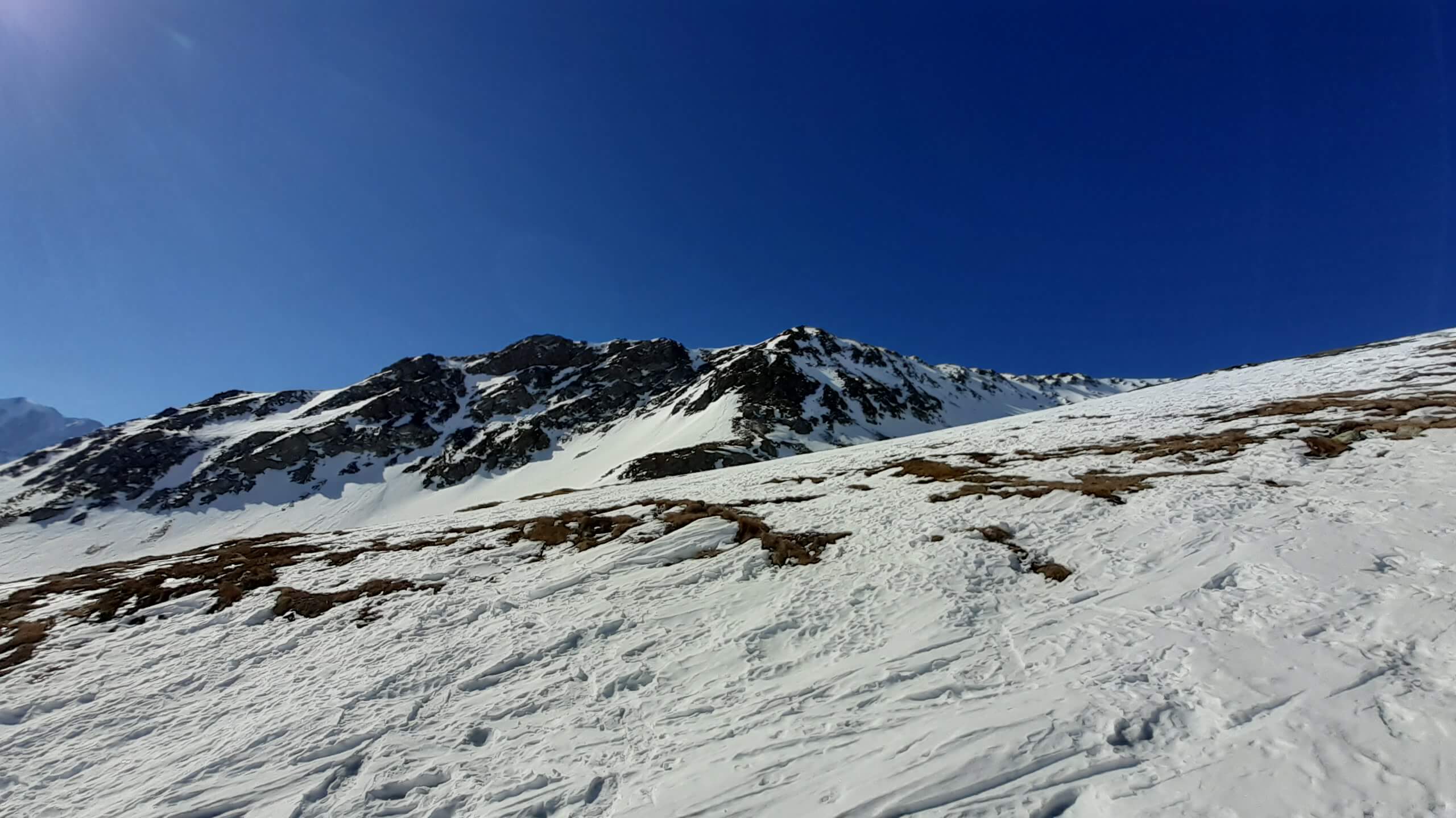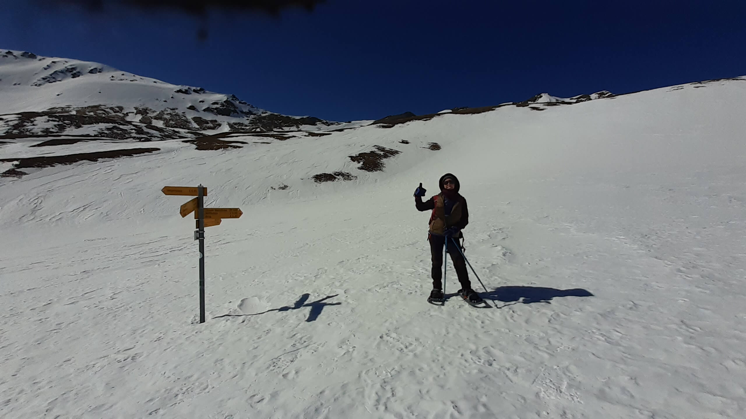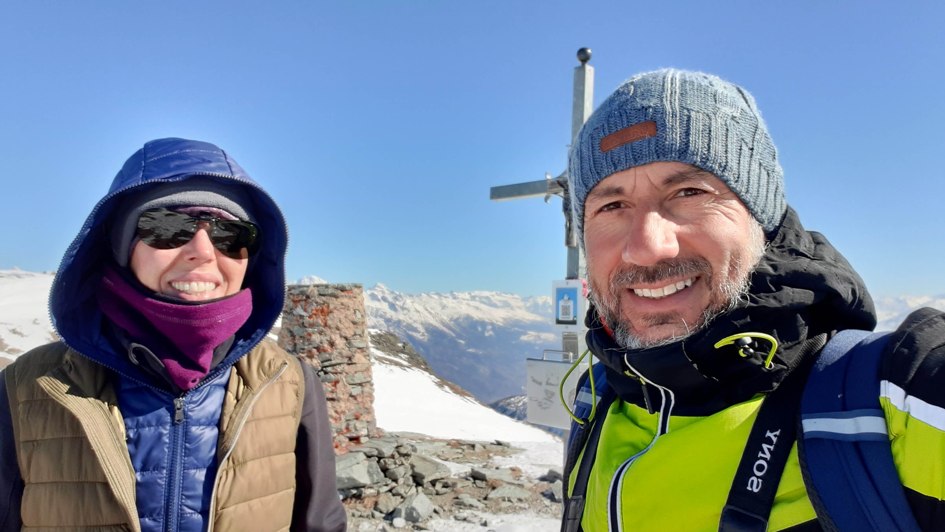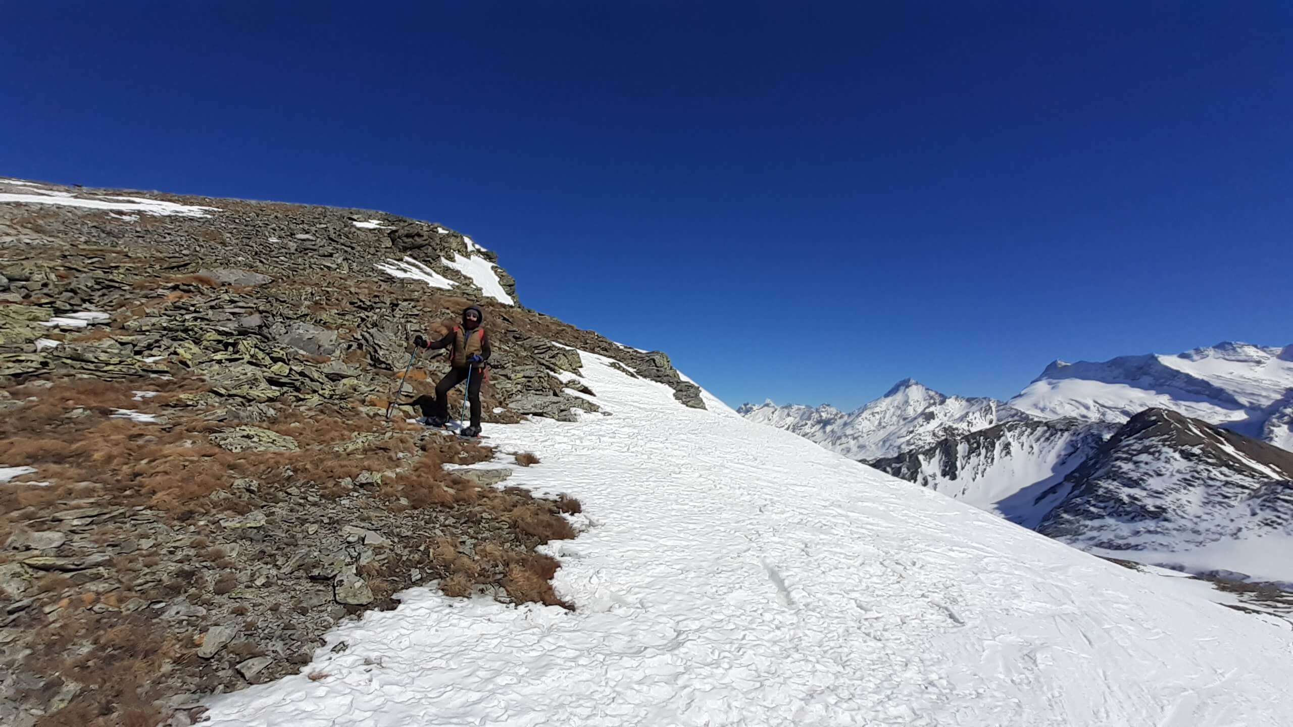Oggi andiamo in Svizzera! Partiamo dal Passo del Sempione (2005 m)… fa freddissimo… – 8 gradi! Iniziamo a muoverci per scaldarci; la neve consente di infilare da subito le ciaspole e, dopo essere passati vicino all’ Aquila del Sempione, arriviamo a Hopsche (un piccolo nucleo di poche case) e a Hopschelsee (il suo laghetto, coperto di neve) (2040 m). Qualche foto e riprendiamo il percorso… raggiungiamo un piccolo laghetto coperto di neve, il Laghetto Effimero; rallentiamo poi in corrispondenza di 2 traversi, stretti e su ripido versante di neve ghiacciata; superati questi 2 traversi, aumentiamo il passo e raggiungiamo il versante, ampio ma sempre ripido, che ci porta a Undre Rossusee (2472 m). Sembra di essere al centro dell’ infinito… intorno a noi “svettano” stupende cime innevate, a tratti già rocciose, che costituiscono il contorno ideale di una meraviglia infinita! Proseguiamo su ripido pendio e ci fermiamo su alcune rocce poco prima della bocchetta di Usserie Nanzlicke… ai piedi dello Spitzhorli. Qui mangiamo il nostro panino, qualche foto, tanta ammirazione e poi raggiungiamo Usserie Nanzlicke (2602 m). Da qui saliamo in modo decisamente ripido tra neve, un po’ di ghiaccio e pietre/rocce che già spuntano dalla neve! Raggiungiamo il primo omino di vetta… il secondo omino di vetta, a poca distanza dal primo… ed eccoci! Siamo sulla vetta dello Spitzhorli (2737 m)… e inizia lo spettacolo dalla vetta!! L’ Arezhorn, lo Straffelgrat, il Tochuhorn e, più lontano, il Monte Leone… bellissimo e infinito panorama!! Foto su foto e poi ci prepariamo a scendere. Il ripido versante ci fa perdere subito quota e, in poco, siamo di nuovo alla bocchetta di Usserie Nanzlicke (2602 m) e, da qui, scendiamo ancora fino a Undre Rossusee (2472 m)… da qui prendiamo a sinistra e raggiungiamo anche il Piccolo Laghetto Ghiacciato (Rossusee) (si distingue pochissimo tra la bianchissima neve!). Torniamo a Undre Rossusee (2472 m) e, prima dei traversi della salita, decidiamo di variare il percorso scendendo prima lungo un canalone (la neve tiene bene) e poi un ultimo traverso ci riporta al bivio sotto il Laghetto Effimero, incontrato durante la salita. Da qui una tranquilla e semplice discesa fino a Hopsche e a Hopschelsee (il suo laghetto) (2040 m); continuiamo fino sotto l’ Aquila del Sempione e poi torniamo al Passo del Sempione (2005 m). Giornata spettacolare… salita a tratti impegnativa, che ci ha regalato un’ esperienza unica, emozioni da sogno e una soddisfazione incredibile!