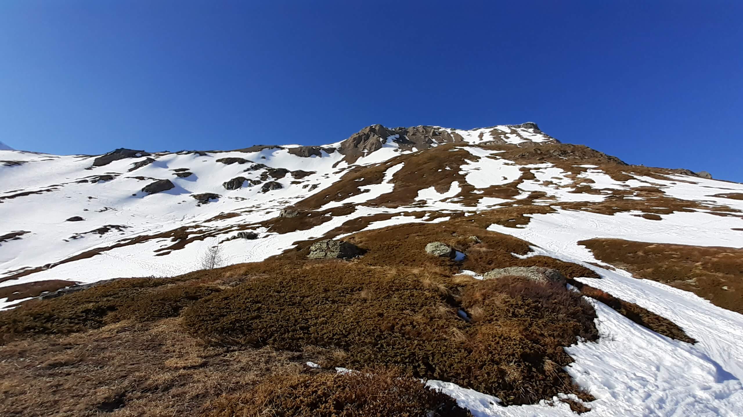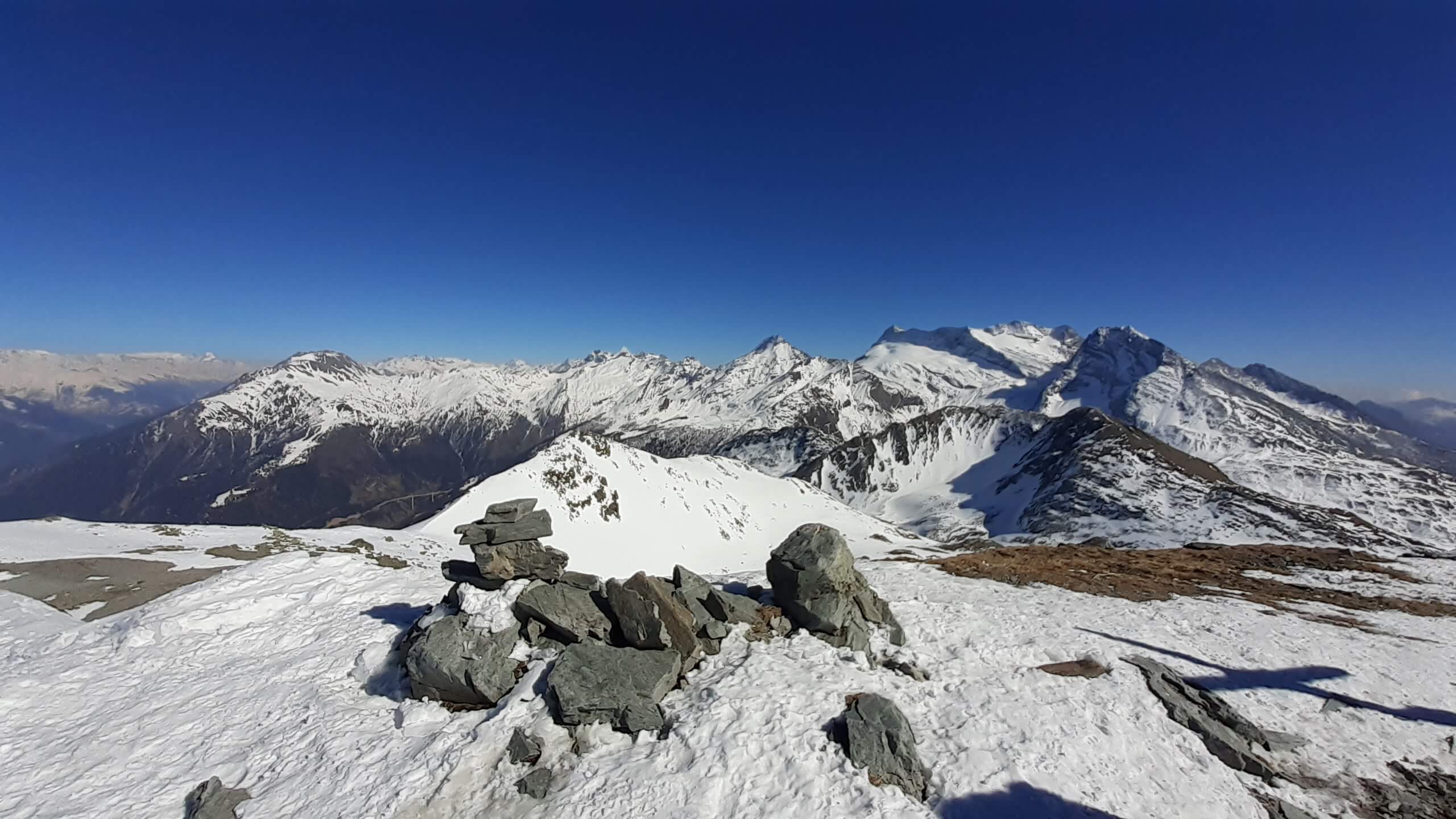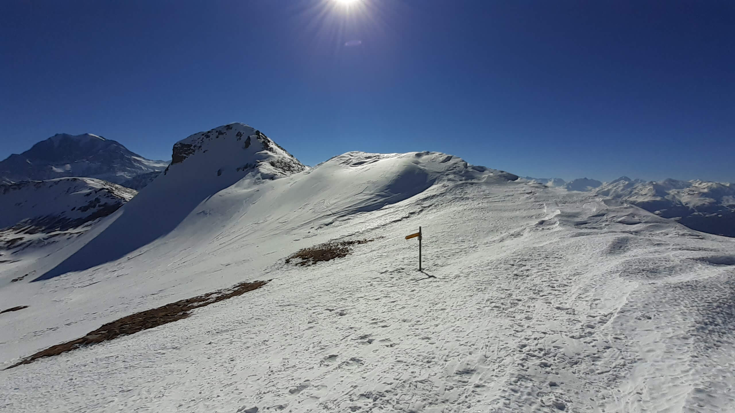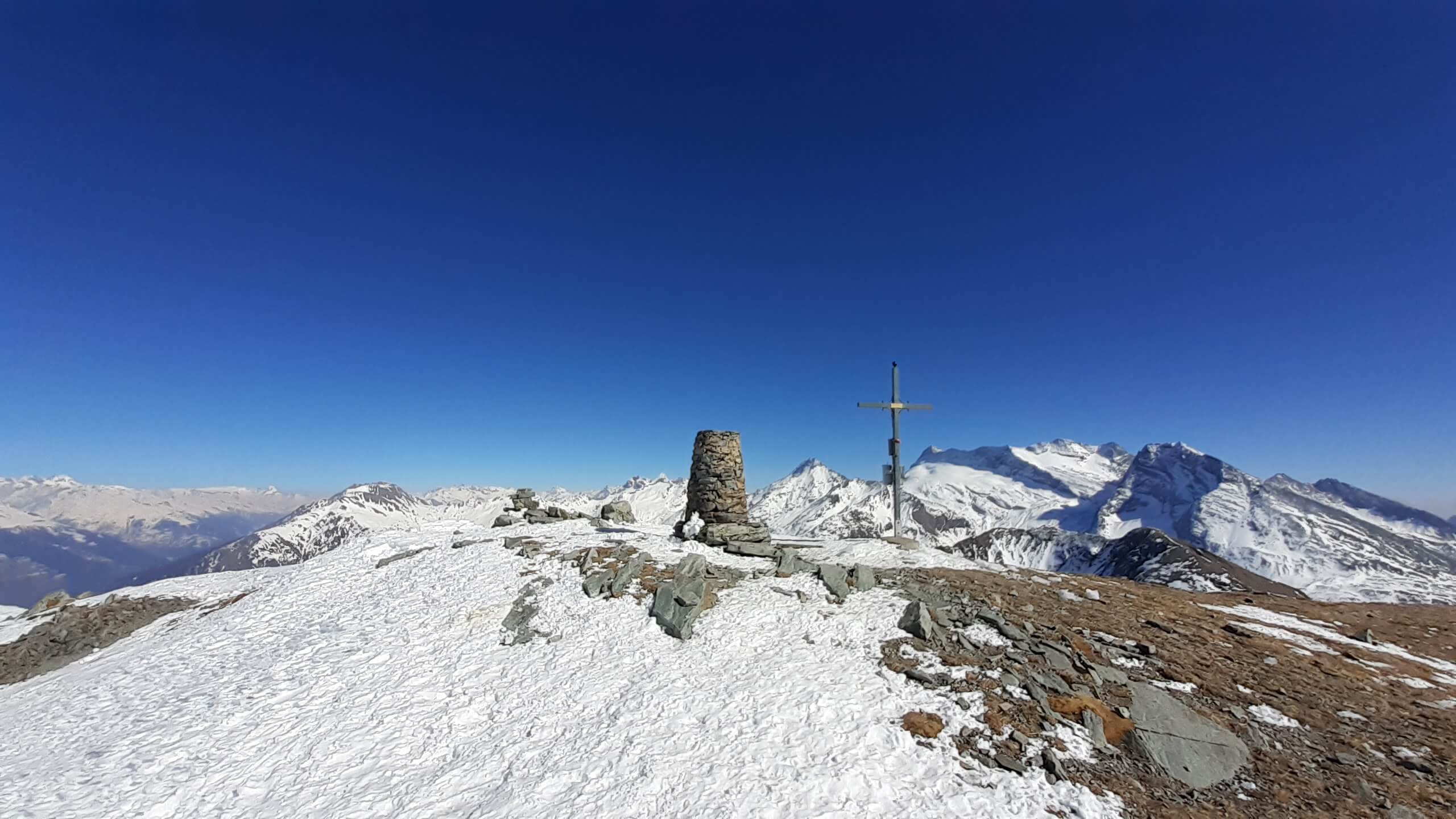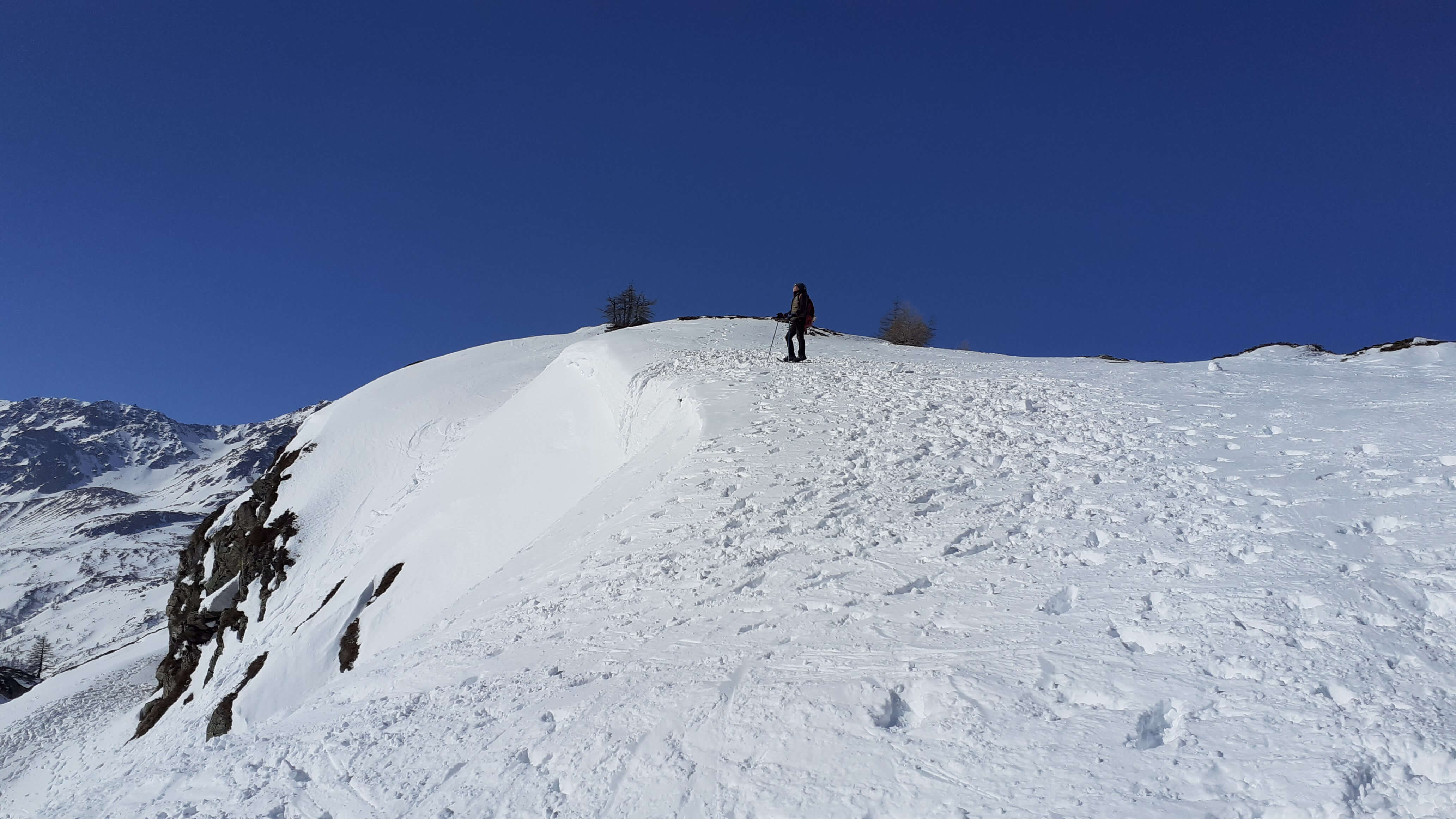 Oggi andiamo in Svizzera! Partiamo dal Passo del Sempione (2005 m)… fa freddissimo… – 8 gradi! Iniziamo a muoverci per scaldarci; la neve consente di infilare da subito le ciaspole e, dopo essere passati vicino all’ Aquila del Sempione, arriviamo a Hopsche (un piccolo nucleo di poche case) e a Hopschelsee (il suo laghetto, coperto di neve) (2040 m). Qualche foto e riprendiamo il percorso… raggiungiamo un piccolo laghetto coperto di neve, il Laghetto Effimero; rallentiamo poi in corrispondenza di 2 traversi, stretti e su ripido versante di neve ghiacciata; superati questi 2 traversi, aumentiamo il passo e raggiungiamo il versante, ampio ma sempre ripido, che ci porta a Undre Rossusee (2472 m). Sembra di essere al centro dell’ infinito… intorno a noi “svettano” stupende cime innevate, a tratti già rocciose, che costituiscono il contorno ideale di una meraviglia infinita! Proseguiamo su ripido pendio e ci fermiamo su alcune rocce poco prima della bocchetta di Usserie Nanzlicke… ai piedi dello Spitzhorli. Qui mangiamo il nostro panino, qualche foto, tanta ammirazione e poi raggiungiamo Usserie Nanzlicke (2602 m). Da qui saliamo in modo decisamente ripido tra neve, un po’ di ghiaccio e pietre/rocce che già spuntano dalla neve! Raggiungiamo il primo omino di vetta… il secondo omino di vetta, a poca distanza dal primo… ed eccoci! Siamo sulla vetta dello Spitzhorli (2737 m)… e inizia lo spettacolo dalla vetta!! L’ Arezhorn, lo Straffelgrat, il Tochuhorn e, più lontano, il Monte Leone… bellissimo e infinito panorama!! Foto su foto e poi ci prepariamo a scendere. Il ripido versante ci fa perdere subito quota e, in poco, siamo di nuovo alla bocchetta di Usserie Nanzlicke (2602 m) e, da qui, scendiamo ancora fino a Undre Rossusee (2472 m)… da qui prendiamo a sinistra e raggiungiamo anche il Piccolo Laghetto Ghiacciato (Rossusee) (si distingue pochissimo tra la bianchissima neve!). Torniamo a Undre Rossusee (2472 m) e, prima dei traversi della salita, decidiamo di variare il percorso scendendo prima lungo un canalone (la neve tiene bene) e poi un ultimo traverso ci riporta al bivio sotto il Laghetto Effimero, incontrato durante la salita. Da qui una tranquilla e semplice discesa fino a Hopsche e a Hopschelsee (il suo laghetto) (2040 m); continuiamo fino sotto l’ Aquila del Sempione e poi torniamo al Passo del Sempione (2005 m). Giornata spettacolare… salita a tratti impegnativa, che ci ha regalato un’ esperienza unica, emozioni da sogno e una soddisfazione incredibile!
