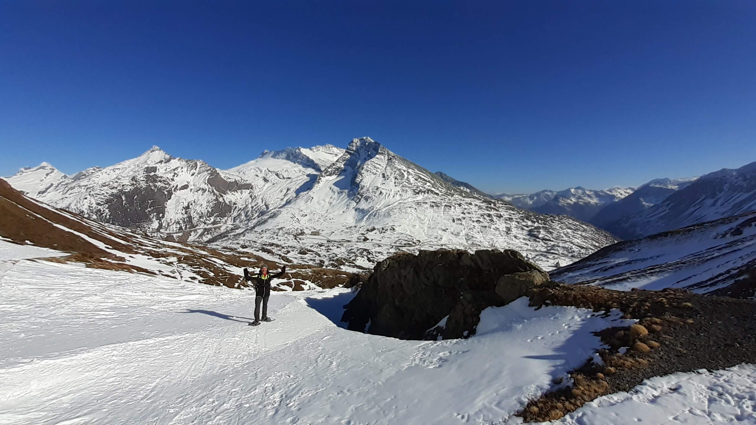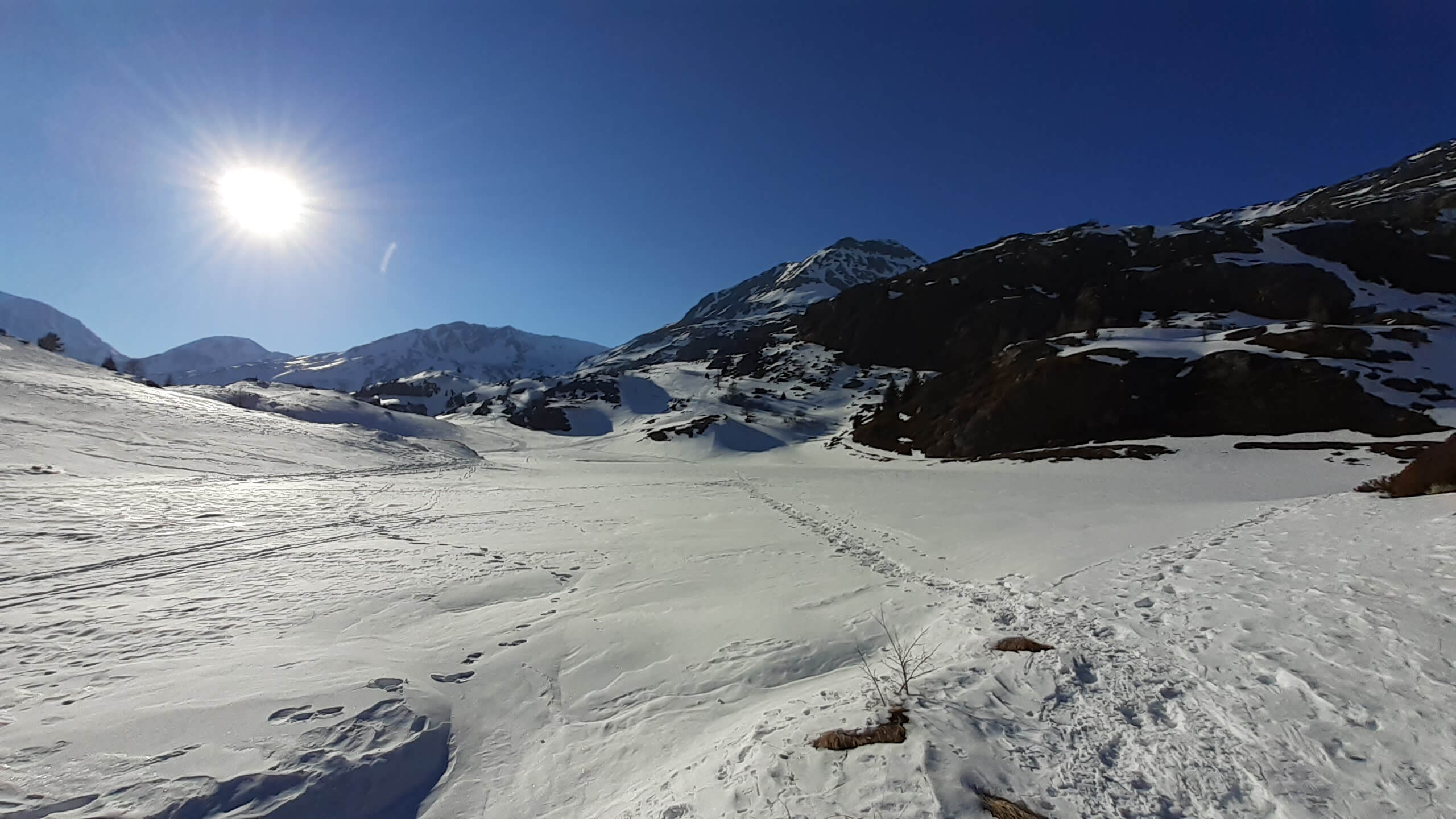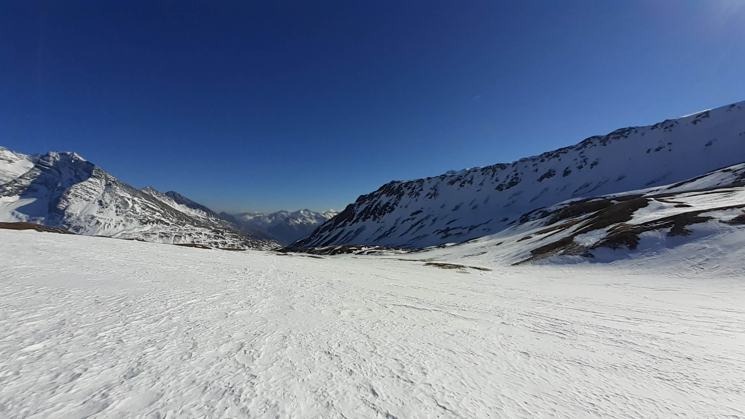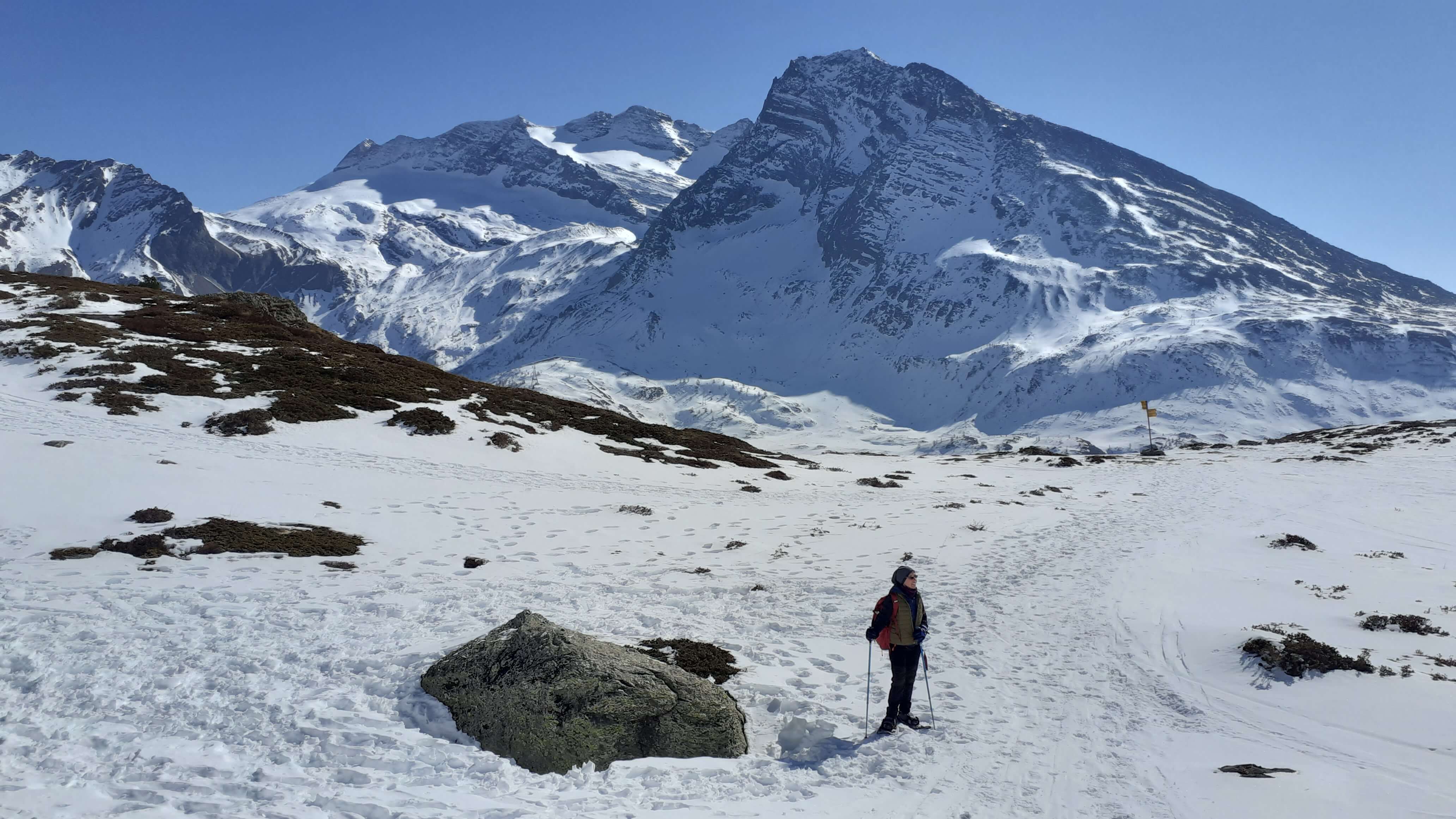 Oggi andiamo in Svizzera! Partiamo dal Passo del Sempione (2005 m)… fa freddissimo… – 8 gradi! Iniziamo a muoverci per scaldarci; la neve consente di infilare da subito le ciaspole e, dopo essere passati vicino all’ Aquila del Sempione, arriviamo a Hopsche (un piccolo nucleo di poche case) e a Hopschelsee (il suo laghetto, coperto di neve) (2040 m). Qualche foto e riprendiamo il percorso… raggiungiamo un piccolo laghetto coperto di neve, il Laghetto Effimero; rallentiamo poi in corrispondenza di 2 traversi, stretti e su ripido versante di neve ghiacciata; superati questi 2 traversi, aumentiamo il passo e raggiungiamo il versante, ampio ma sempre ripido, che ci porta a Undre Rossusee (2472 m). Sembra di essere al centro dell’ infinito… intorno a noi “svettano” stupende cime innevate, a tratti già rocciose, che costituiscono il contorno ideale di una meraviglia infinita! Proseguiamo su ripido pendio e ci fermiamo su alcune rocce poco prima della bocchetta di Usserie Nanzlicke… ai piedi dello Spitzhorli. Qui mangiamo il nostro panino, qualche foto, tanta ammirazione e poi raggiungiamo Usserie Nanzlicke (2602 m). Da qui saliamo in modo decisamente ripido tra neve, un po’ di ghiaccio e pietre/rocce che già spuntano dalla neve! Raggiungiamo il primo omino di vetta… il secondo omino di vetta, a poca distanza dal primo… ed eccoci! Siamo sulla vetta dello Spitzhorli (2737 m)… e inizia lo spettacolo dalla vetta!! L’ Arezhorn, lo Straffelgrat, il Tochuhorn e, più lontano, il Monte Leone… bellissimo e infinito panorama!! Foto su foto e poi ci prepariamo a scendere. Il ripido versante ci fa perdere subito quota e, in poco, siamo di nuovo alla bocchetta di Usserie Nanzlicke (2602 m) e, da qui, scendiamo ancora fino a Undre Rossusee (2472 m)… da qui prendiamo a sinistra e raggiungiamo anche il Piccolo Laghetto Ghiacciato (Rossusee) (si distingue pochissimo tra la bianchissima neve!). Torniamo a Undre Rossusee (2472 m) e, prima dei traversi della salita, decidiamo di variare il percorso scendendo prima lungo un canalone (la neve tiene bene) e poi un ultimo traverso ci riporta al bivio sotto il Laghetto Effimero, incontrato durante la salita. Da qui una tranquilla e semplice discesa fino a Hopsche e a Hopschelsee (il suo laghetto) (2040 m); continuiamo fino sotto l’ Aquila del Sempione e poi torniamo al Passo del Sempione (2005 m). Giornata spettacolare… salita a tratti impegnativa, che ci ha regalato un’ esperienza unica, emozioni da sogno e una soddisfazione incredibile!