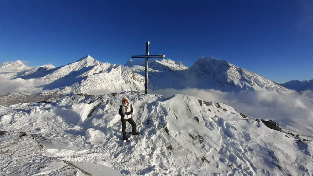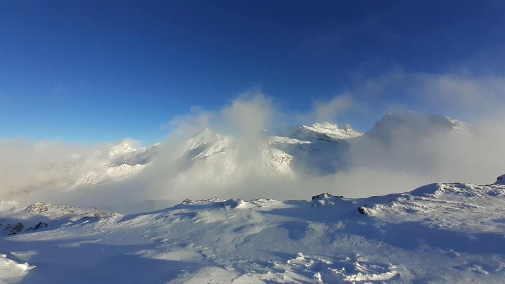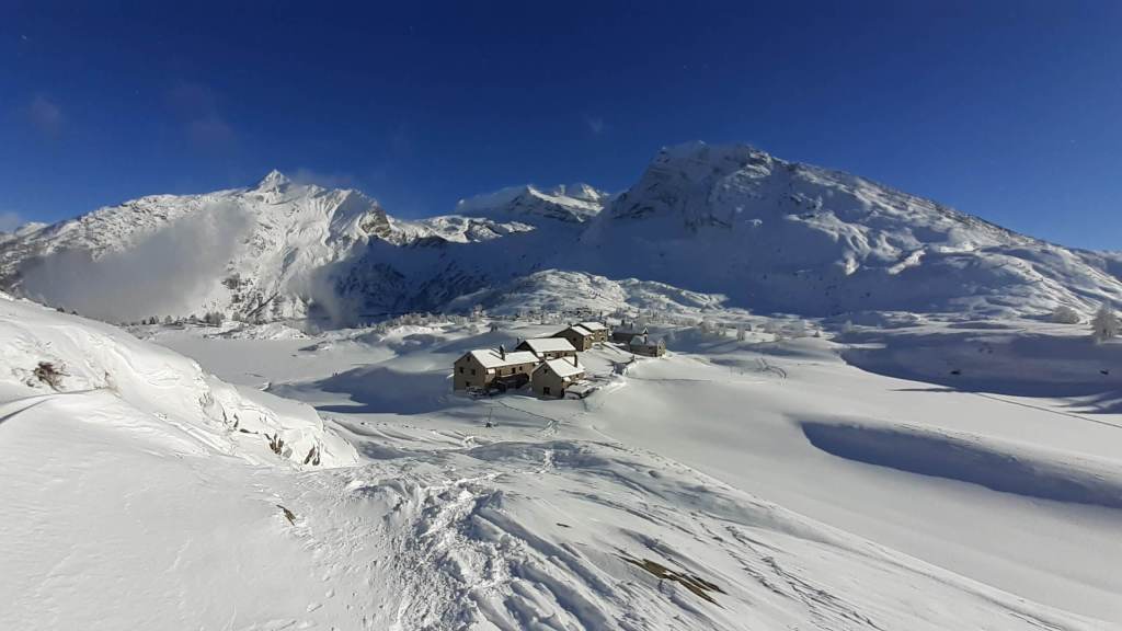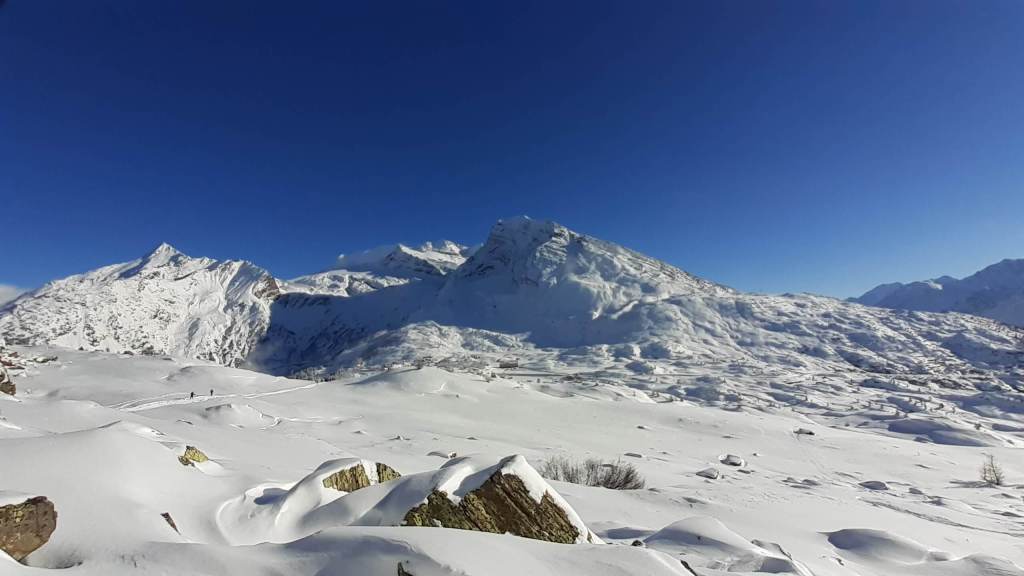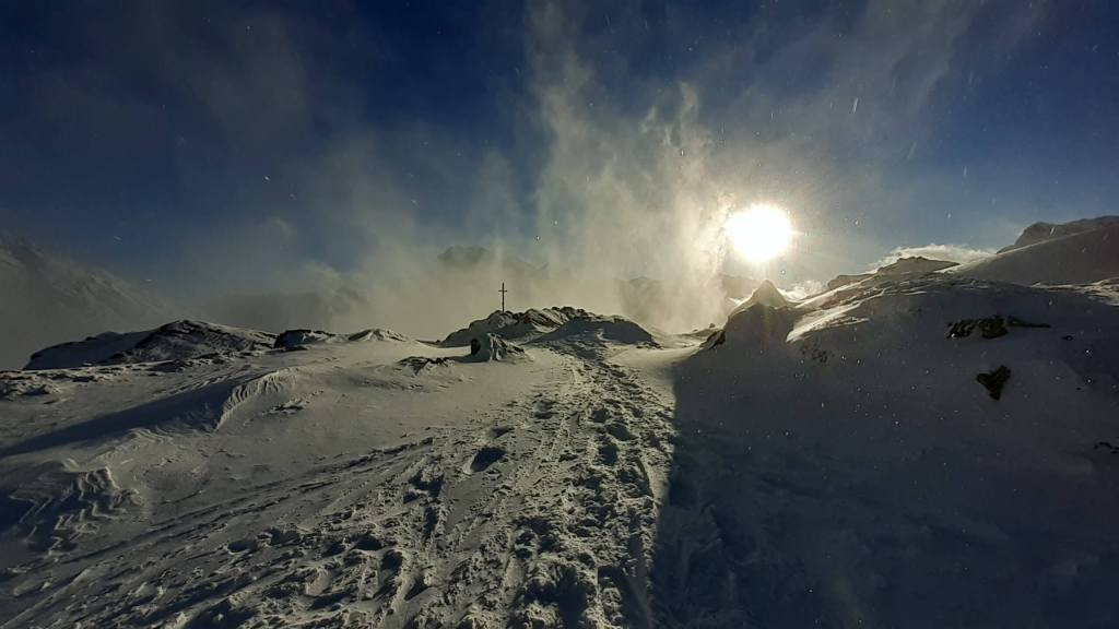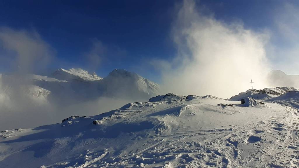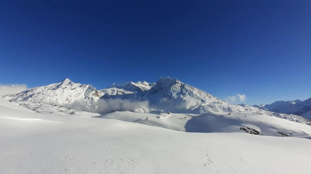 Oggi andiamo in Svizzera! Arriviamo al Passo del Sempione (2005 m)… – 12 gradi solo al parcheggio e un vento gelido che arriva a raffiche! Ci copriamo più che possiamo e… si parte! L’ ambiente è favoloso! il bianco della neve e del ghiaccio copre tutto… sembra quasi un paesaggio “artico”. Il percorso non è battuto ma solo tracciato e la neve è molto abbondante, quindi si sprofonda anche con le ciaspole! Raggiungiamo Hopsche (2040 m), un piccolo nucleo di case disabitate nel periodo invernale e freddo. Cerchiamo un posticino riparato per mangiare… fa davvero freddissimo! Proseguiamo, su alcuni tratti più ripidi, e arriviamo al Laghetto del bivio (2200 m)… è completamente coperto di neve intatta e non si riesce quasi a distinguere! Prendiamo a destra e saliamo… tra le raffiche di vento che sollevano la neve creando delle vere e proprie “nuvole di neve”. Con impegno e fatica arriviamo nei pressi di Galmji e poi alla base dello Staldhorn, dove ci aspetta l’ ultimo “strappo” che ci porta alla Vetta dello Staldhorn con la sua bellissima croce (2465 m). Il panorama è spettacolare! Davanti a noi il Monte Leone domina tutto il panorama… coperto da un bianco stupendo! Piccola sosta… fa sempre più freddo… e poi ci apprestiamo a scendere, lungo lo stesso percorso. Non troviamo più, a tratti, la traccia che abbiamo lasciato con le ciaspole in salita e dobbiamo tracciarla di nuovo. Torniamo così al Passo del Sempione (2005 m). Giornata spettacolare in un ambiente favoloso… quasi una “piccola Patagonia”… quasi un “piccolo Polo Nord”.