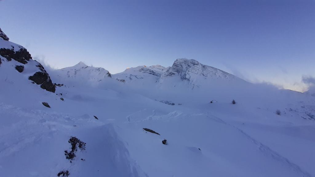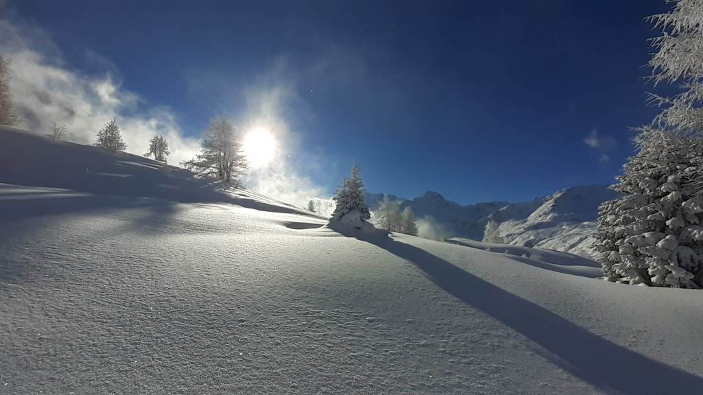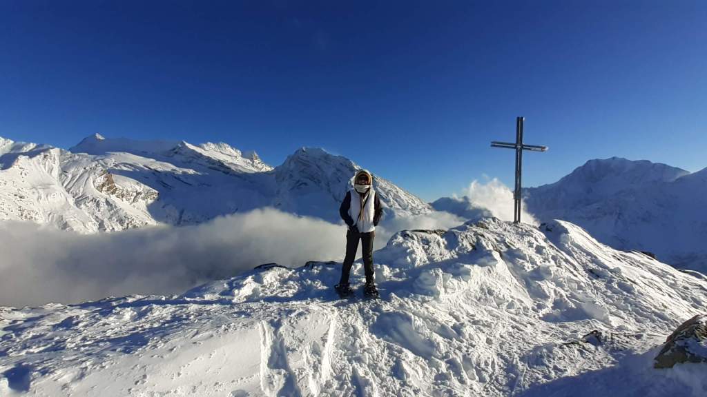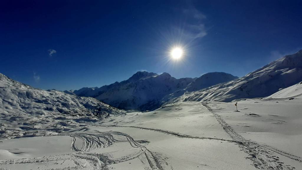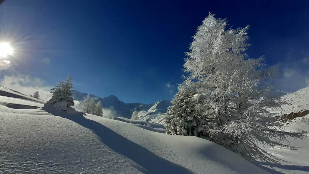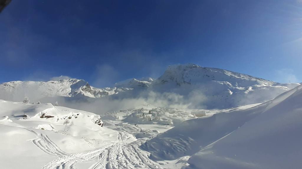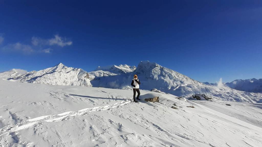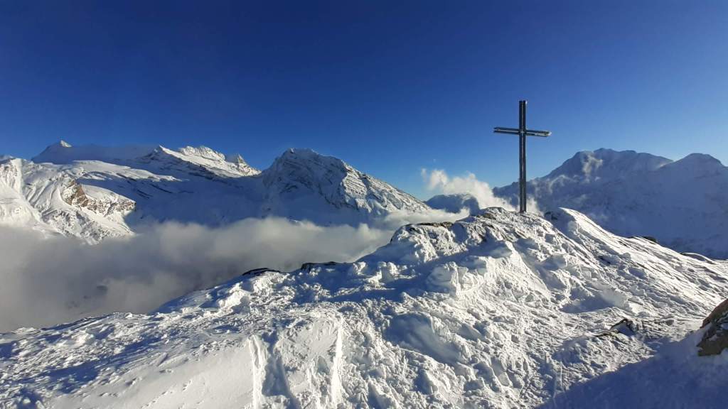 Oggi andiamo in Svizzera! Arriviamo al Passo del Sempione (2005 m)… – 12 gradi solo al parcheggio e un vento gelido che arriva a raffiche! Ci copriamo più che possiamo e… si parte! L’ ambiente è favoloso! il bianco della neve e del ghiaccio copre tutto… sembra quasi un paesaggio “artico”. Il percorso non è battuto ma solo tracciato e la neve è molto abbondante, quindi si sprofonda anche con le ciaspole! Raggiungiamo Hopsche (2040 m), un piccolo nucleo di case disabitate nel periodo invernale e freddo. Cerchiamo un posticino riparato per mangiare… fa davvero freddissimo! Proseguiamo, su alcuni tratti più ripidi, e arriviamo al Laghetto del bivio (2200 m)… è completamente coperto di neve intatta e non si riesce quasi a distinguere! Prendiamo a destra e saliamo… tra le raffiche di vento che sollevano la neve creando delle vere e proprie “nuvole di neve”. Con impegno e fatica arriviamo nei pressi di Galmji e poi alla base dello Staldhorn, dove ci aspetta l’ ultimo “strappo” che ci porta alla Vetta dello Staldhorn con la sua bellissima croce (2465 m). Il panorama è spettacolare! Davanti a noi il Monte Leone domina tutto il panorama… coperto da un bianco stupendo! Piccola sosta… fa sempre più freddo… e poi ci apprestiamo a scendere, lungo lo stesso percorso. Non troviamo più, a tratti, la traccia che abbiamo lasciato con le ciaspole in salita e dobbiamo tracciarla di nuovo. Torniamo così al Passo del Sempione (2005 m). Giornata spettacolare in un ambiente favoloso… quasi una “piccola Patagonia”… quasi un “piccolo Polo Nord”.
