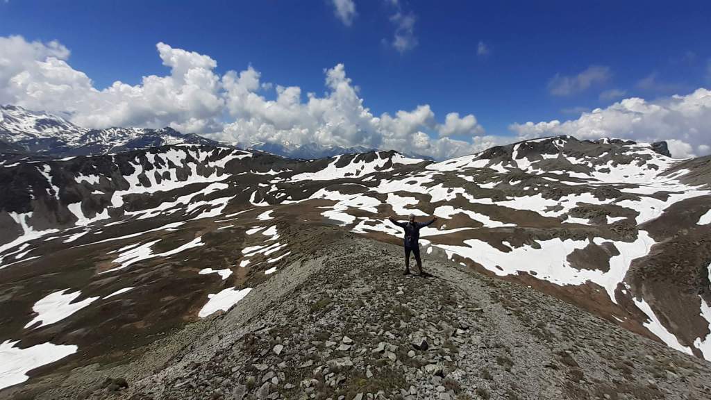 Oggi siamo ancora al Passo del Sempione (2005 m). Il tempo è migliorato e quindi… si parte anche oggi! In breve raggiungiamo Hopsche (2040 m) e poi saliamo al Laghetto del bivio (2200 m) ma oggi prendiamo a sinistra e percorriamo il lungo traverso che ci porta fino alla Piana stupenda con al centro Undre Rossuse (2470 m). Da qui continuiamo a destra fino al piccolo Laghetto Rossusee, che ha quasi ultimato il disgelo… mai visto così bello! Proseguiamo al di là del laghetto e iniziamo a salira sulla cresta che ci porterà fino alla Vetta del Tochuhorn… la cresta è per lo più rocciosa e pietrosa, con alcuni tratti esposti e ripidi (l’ ultimo tratto invece “spiana”… la vetta è ampia ed erbosa)… tutta la cresta non presenta neve. Ed eccoci sulla Vetta del Tochuhorn (2660 m) e qui inizia lo spettacolo! Siamo al centro di una meraviglia infinita… montagne, laghetti, ripidi versanti… tutto spettacolare! Sosta un po’ più lunga e poi iniziamo la discesa fina al Laghetto Rossusee e a Undre Rossusee (2470 m). Qui decidiamo di raggingere un altro piccolo laghetto… che nasce direttamente tra le rocce! Anche il Laghetto Ghiacciato (2510 m) ha quasi ultimato il disgelo… favoloso! E ora iniziamo la discesa… Laghetto del bivio (2200 m) e Hopsche (2040 m), fino a tornare al Passo del Sempione (2005 m). Giornata fantastica… con il valore di essere ritornati oltre i 2600 m!