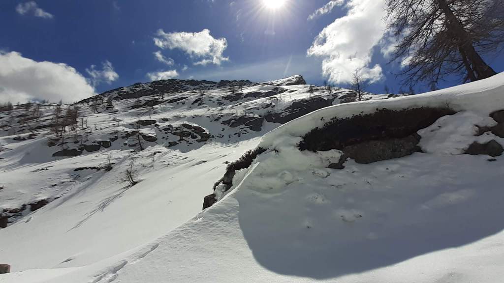 Oggi siamo in Alta Valle Maggia! Partiamo da Fusio (1290 m) e, su comoda strada, saliamo al Lago del Sambuco (1460 m)… un lago artificiale molto bello e suggestivo. Ne percorriamo il versante a destra della Diga del Sambuco e, a fine lago, iniziamo a salire fino all’ Alpe Campo (1800 m). Da qui inizia la neve che diventa sempre più abbondante. Saliamo lungo numerosi tornanti che presentano diversi traversi esposti e pericolosi (uno di questi lo abbiamo dovuto aggirare!) Arriviamo, non senza fatica, nei pressi della conca dei Laghi del Naret (2300 m)… ma un ultimo e lungo traverso su abbondante neve, esposto e piuttosto pericoloso, ci obbliga a tornare indietro!… a qualche centinaia di metri dai Laghi del Naret, ma è giusto così. Scendiamo, non senza difficoltà, lungo lo stesso percorso fino all’ Alpe Campo (1800 m)… qui la neve finisce e scendiamo tranquillamente fino al Lago e Diga del Sambuco (1460 m) e poi eccoci di nuovo a Fusio (1290 m). Giornata stupenda in un ambiente unico!