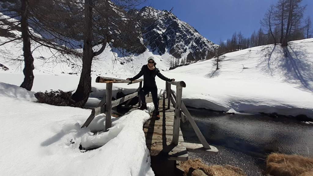 Oggi saliamo ad un altro bellissimo lago. Partiamo da Fusio (1290 m) e, su percorso libero da neve, raggiungiamo diversi alpeggi : l’ Alpe Vaccariscio (1520 m), l’ Alpe Cort da l’ Ovi (1620 m) e la Corte Mognola (1840 m). Da qui inizia la neve e la salita al Lago di Mognola è abbastanza impegnativa… a tratti si sprofonda, a tratti bisogna procedere su traversi di neve abbastanza esposti. Ma eccoci al ponte di legno del bellissimo Lago di Mognola (2003 m). L’ ambiente è spettacolare! Il lago è coperto di un bianco intatto e il panorama è favoloso! Ne percorriamo il versante a sinistra, fino a dove riusciamo e poi iniziamo la discesa, lungo lo stesso percorso della salita, passando di nuovo per i 3 alpeggi e poi torniamo a Fusio (1290 m). Giornata meravigliosa!
