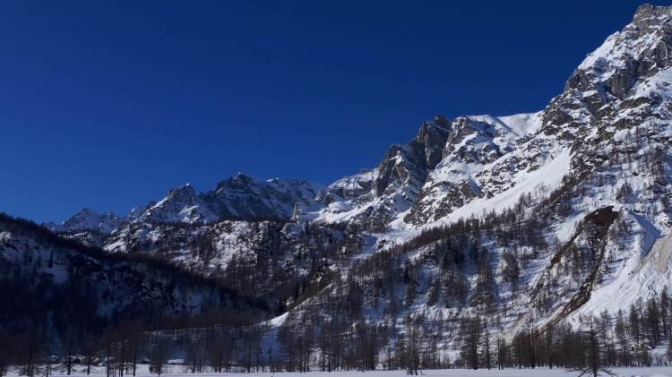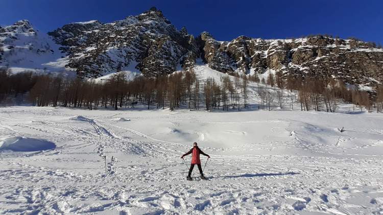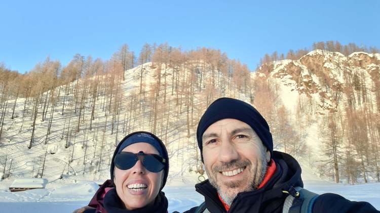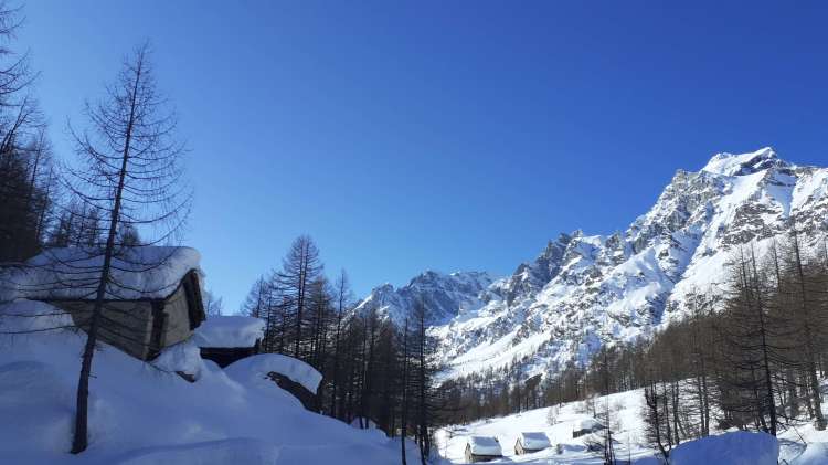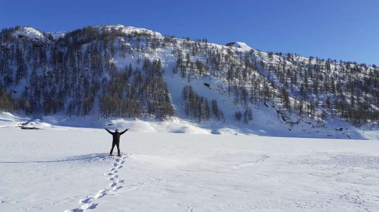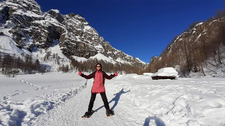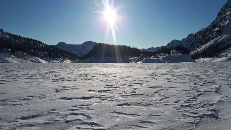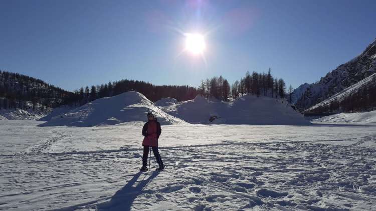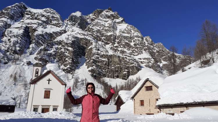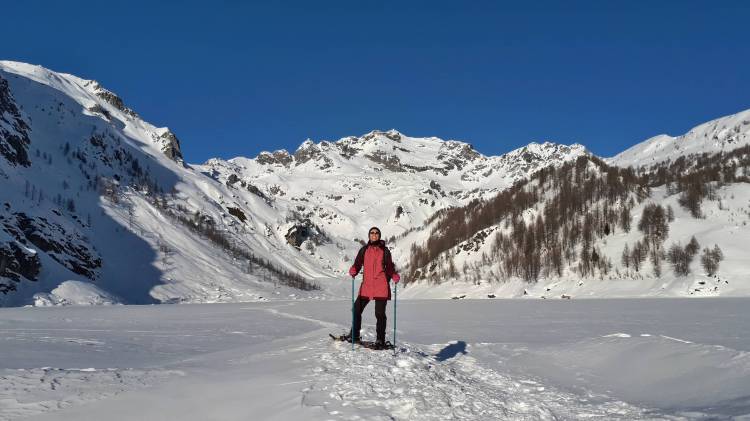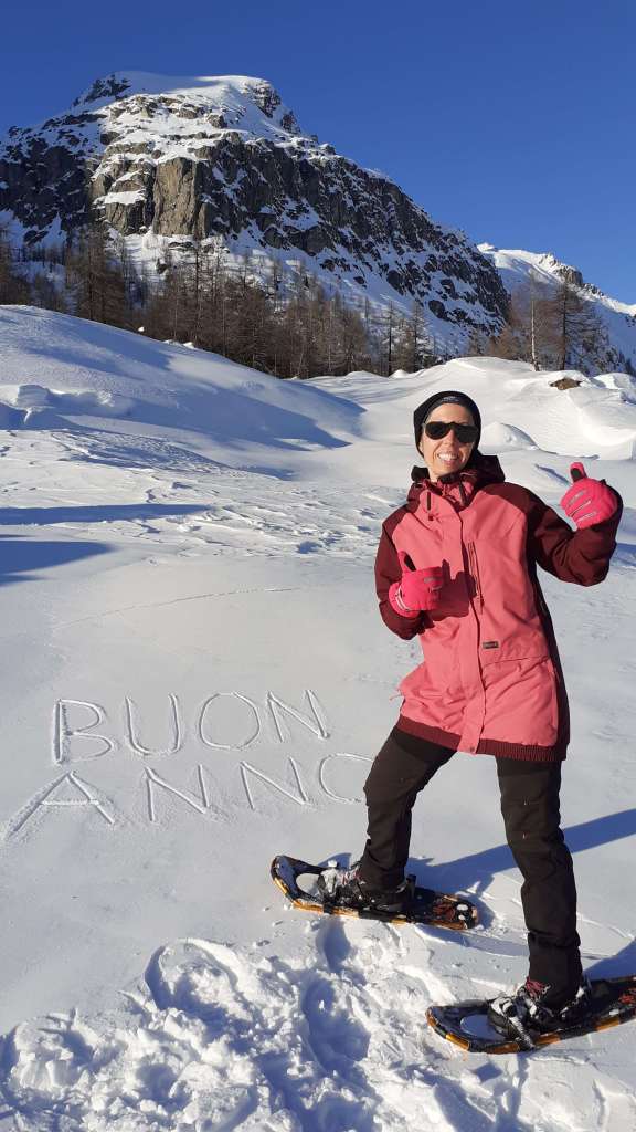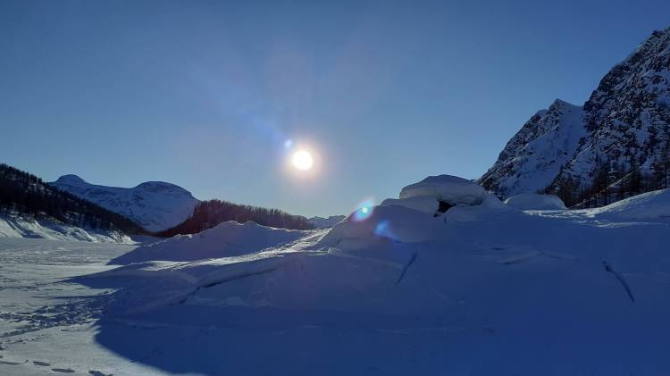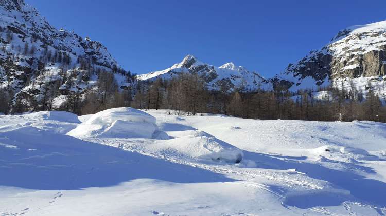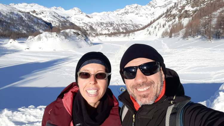 Oggi è il 1° Gennaio 2020 e noi decidiamo di andare a salutare il nuovo anno dalle nostre montagne. Sveglia presto e… si parte! Direzione : Alpe Devero, che conosciamo piuttosto bene e che è sempre una meravigliosa scoperta. Oggi vogliamo compiere una ‘traversata’ che include anche la camminata sul Lago di Devero (se le condizioni della copertura nevosa lo permettono). Parcheggiamo fuori dalla sbarra, perché i parcheggi sono già tutti pieni… quindi il nostro percorso si allungherà un po’ (pazienza!). Partiamo all’ inizio della Piana di Devero (1631 m) in prossimità del ponte; questa meravigliosa Piana è circondata da splendide montagne che le regalano un contorno invidiabile, tra cui la Punta della Rossa (2887 m) e il Monte Cervandone (3210 m). Il percorso è battuto bene, la traccia sempre visibile e proseguiamo tranquillamente con le nostre ciaspole, mentre le bellissime vette ci accompagnano. In breve arriviamo allo splendido paesino di Crampiolo (1780 m) “sommerso” in parte dalla neve e anche lì lo sguardo comincia a spaziare dappertutto : Pizzo Crampiolo (2776 m), Monte Cistella (2880 m) e Corno del Cistella (2688 m), Pizzo Diei (2906 m)… mi sorprendo ad ammirarli con gli occhi spalancati… sono una meraviglia, sono sempre una meraviglia!! Cerchiamo un posticino dove mangiare e, subito dopo, riprendiamo la strada per Codelago (1856 m) (o Lago di Devero). Con la speranza di poterlo attraversare, percorriamo velocemente la distanza, mentre alla nostra sinistra arriva a tratti il suono forte e potente delle slavine che si staccano dai massicci rocciosi. Finalmente siamo sul Lago, guardo davanti a me e… wow! Vedo delle tracce! Si può continuare con la camminata sul Lago! Scendiamo veloci verso il centro… ed è uno spettacolo. Alzo gli occhi al cielo e poi guardo intorno.… sono esattamente al centro di una meraviglia unica e spettacolare, costituita da montagne di un bianco inconfondibile nel blu del cielo e interrotto solo dal colore potente della roccia. Cerco di imprimere quella visione sia negli occhi sia scattando decine e decine di foto. E poi percorriamo tutta la lunghezza del Lago… soddisfazione e meraviglia! Non me ne andrei mai via da lì, ma l’orologio e il sole che si abbassa nel cielo ci impongono di tornare indietro. Ripercorriamo tutto il Lago, saliamo sulla diga per altre foto e poi ritorniamo a Crampiolo. Pausa barretta e poi… ci incamminiamo verso la Piana di Devero con quelle immagini spettacolari impresse nella memoria. Fa più freddo, ma non importa; infatti facciamo anche una sosta in più per andare a vedere una strana costruzione di ghiaccio che assomiglia ad una piccola igloo (molto caratteristica). Alla fine della giornata, salutiamo le nostre montagne e… via lungo gli ultimi 2 km che ci separano dalla nostra macchina! Salgo in macchina, chiudo gli occhi e ripercorro tutte quelle bellissime immagini che ho vissuto in questa spettacolare giornata… in questo spettacolare Capodanno.
