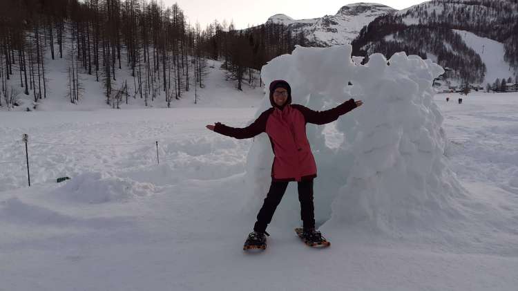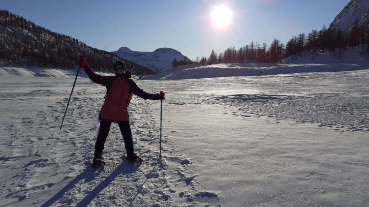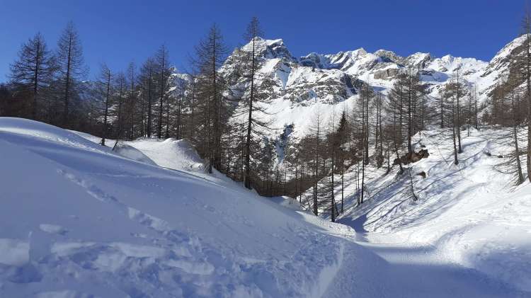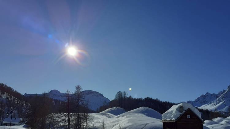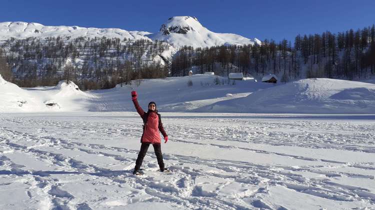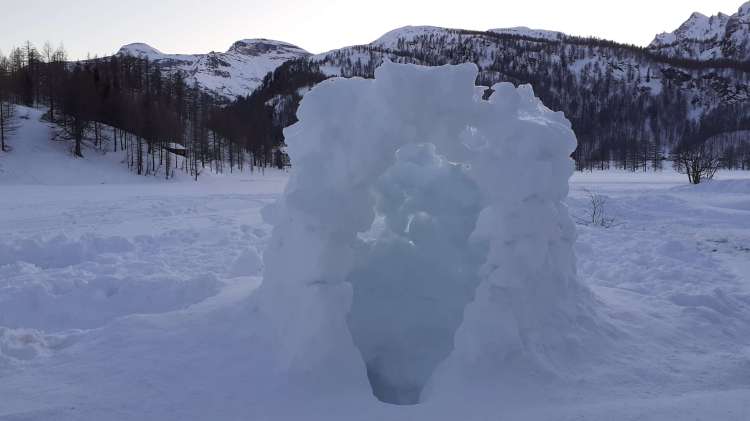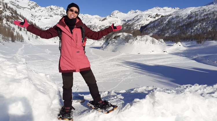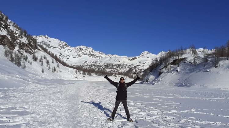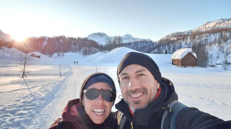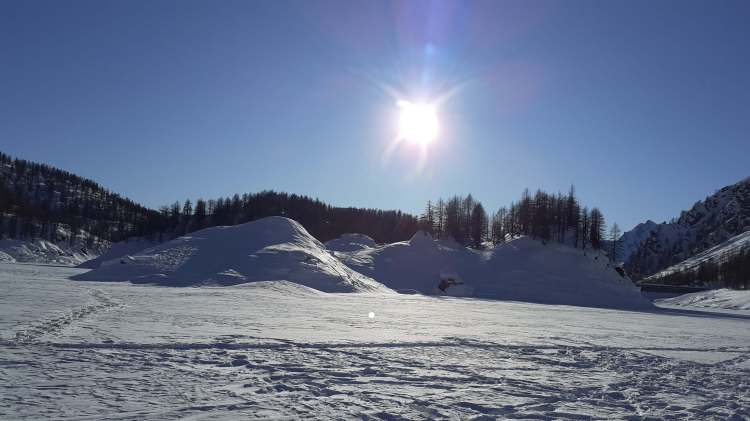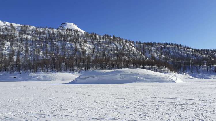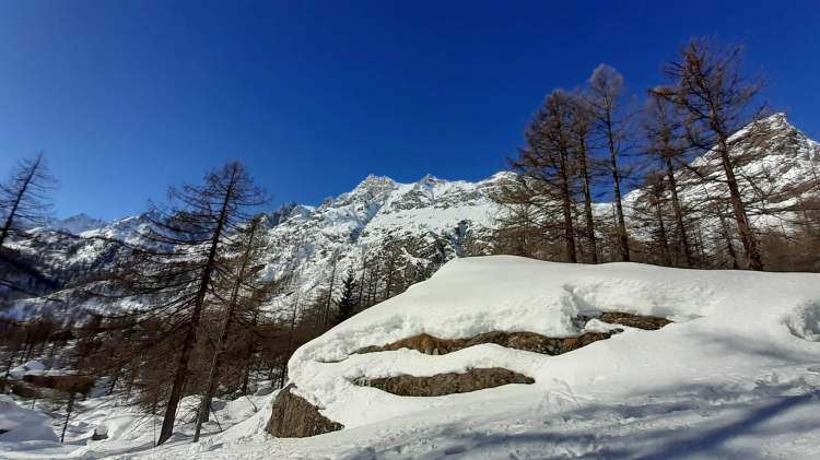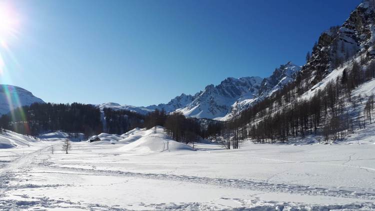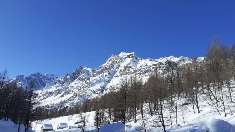 Oggi è il 1° Gennaio 2020 e noi decidiamo di andare a salutare il nuovo anno dalle nostre montagne. Sveglia presto e… si parte! Direzione : Alpe Devero, che conosciamo piuttosto bene e che è sempre una meravigliosa scoperta. Oggi vogliamo compiere una ‘traversata’ che include anche la camminata sul Lago di Devero (se le condizioni della copertura nevosa lo permettono). Parcheggiamo fuori dalla sbarra, perché i parcheggi sono già tutti pieni… quindi il nostro percorso si allungherà un po’ (pazienza!). Partiamo all’ inizio della Piana di Devero (1631 m) in prossimità del ponte; questa meravigliosa Piana è circondata da splendide montagne che le regalano un contorno invidiabile, tra cui la Punta della Rossa (2887 m) e il Monte Cervandone (3210 m). Il percorso è battuto bene, la traccia sempre visibile e proseguiamo tranquillamente con le nostre ciaspole, mentre le bellissime vette ci accompagnano. In breve arriviamo allo splendido paesino di Crampiolo (1780 m) “sommerso” in parte dalla neve e anche lì lo sguardo comincia a spaziare dappertutto : Pizzo Crampiolo (2776 m), Monte Cistella (2880 m) e Corno del Cistella (2688 m), Pizzo Diei (2906 m)… mi sorprendo ad ammirarli con gli occhi spalancati… sono una meraviglia, sono sempre una meraviglia!! Cerchiamo un posticino dove mangiare e, subito dopo, riprendiamo la strada per Codelago (1856 m) (o Lago di Devero). Con la speranza di poterlo attraversare, percorriamo velocemente la distanza, mentre alla nostra sinistra arriva a tratti il suono forte e potente delle slavine che si staccano dai massicci rocciosi. Finalmente siamo sul Lago, guardo davanti a me e… wow! Vedo delle tracce! Si può continuare con la camminata sul Lago! Scendiamo veloci verso il centro… ed è uno spettacolo. Alzo gli occhi al cielo e poi guardo intorno.… sono esattamente al centro di una meraviglia unica e spettacolare, costituita da montagne di un bianco inconfondibile nel blu del cielo e interrotto solo dal colore potente della roccia. Cerco di imprimere quella visione sia negli occhi sia scattando decine e decine di foto. E poi percorriamo tutta la lunghezza del Lago… soddisfazione e meraviglia! Non me ne andrei mai via da lì, ma l’orologio e il sole che si abbassa nel cielo ci impongono di tornare indietro. Ripercorriamo tutto il Lago, saliamo sulla diga per altre foto e poi ritorniamo a Crampiolo. Pausa barretta e poi… ci incamminiamo verso la Piana di Devero con quelle immagini spettacolari impresse nella memoria. Fa più freddo, ma non importa; infatti facciamo anche una sosta in più per andare a vedere una strana costruzione di ghiaccio che assomiglia ad una piccola igloo (molto caratteristica). Alla fine della giornata, salutiamo le nostre montagne e… via lungo gli ultimi 2 km che ci separano dalla nostra macchina! Salgo in macchina, chiudo gli occhi e ripercorro tutte quelle bellissime immagini che ho vissuto in questa spettacolare giornata… in questo spettacolare Capodanno.
