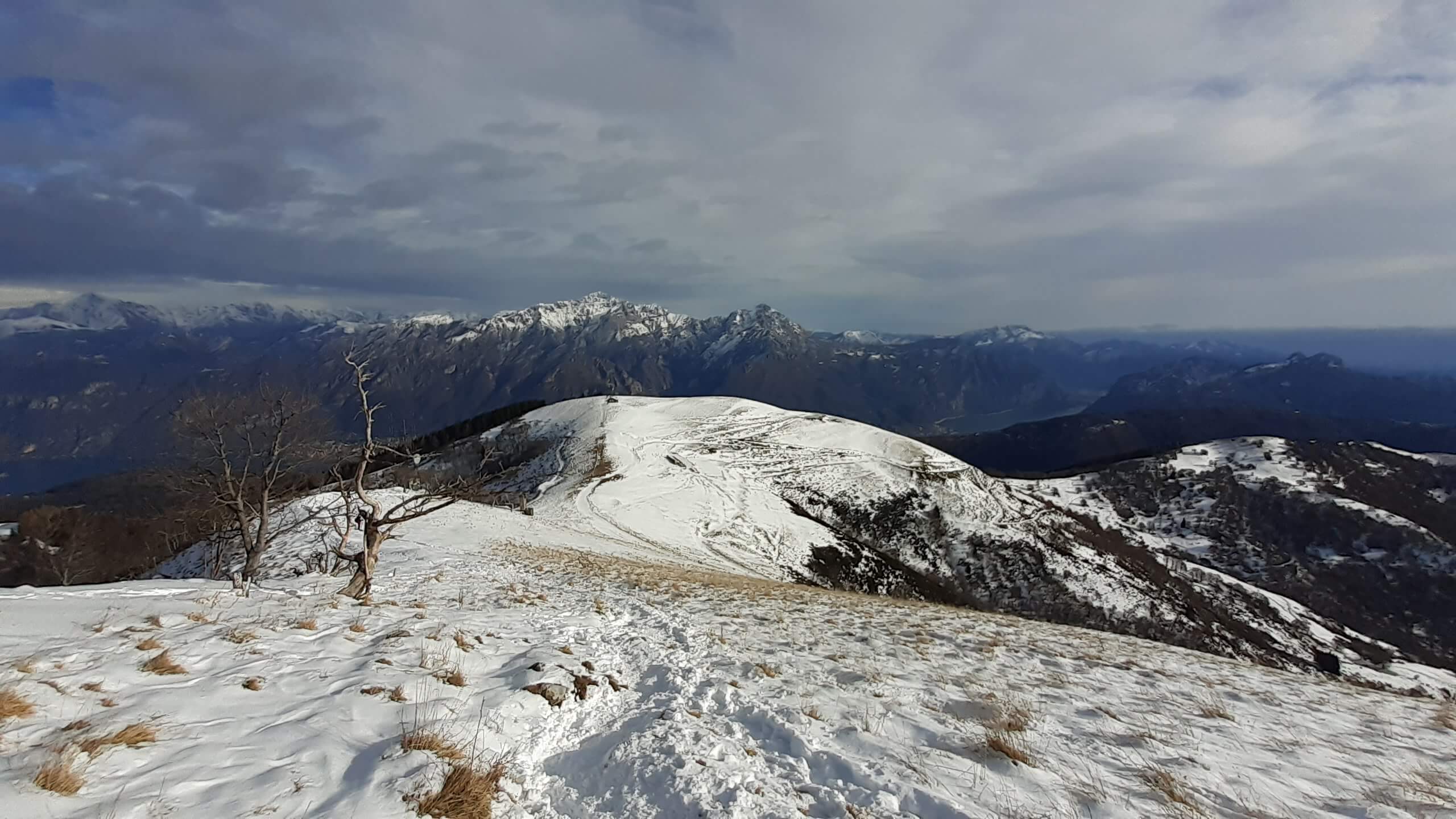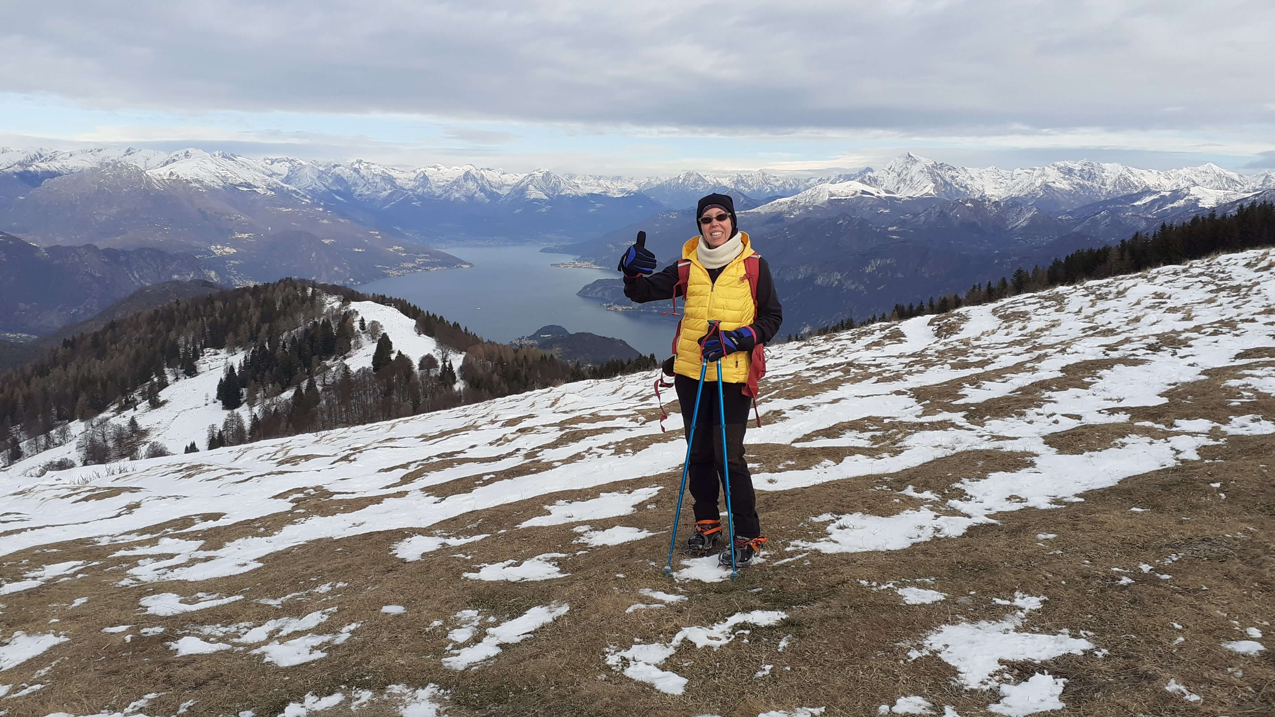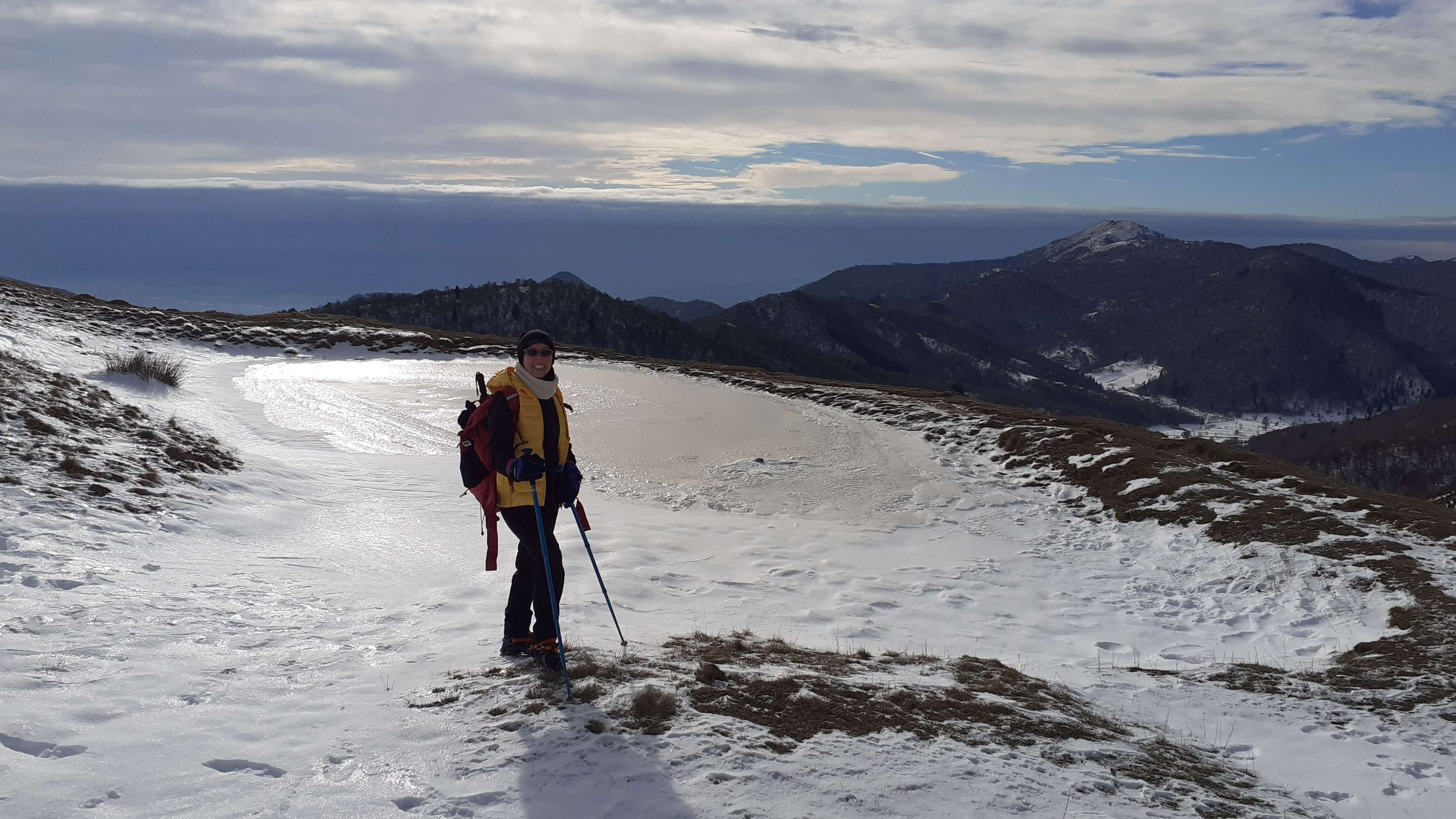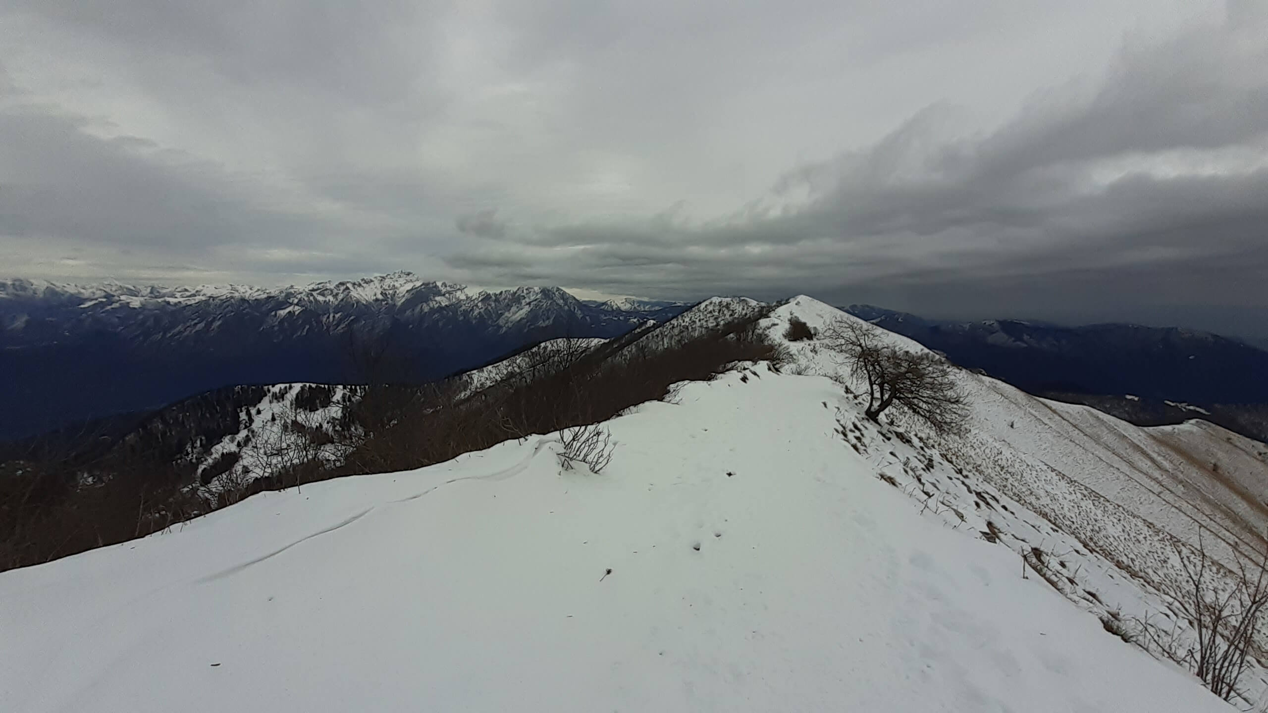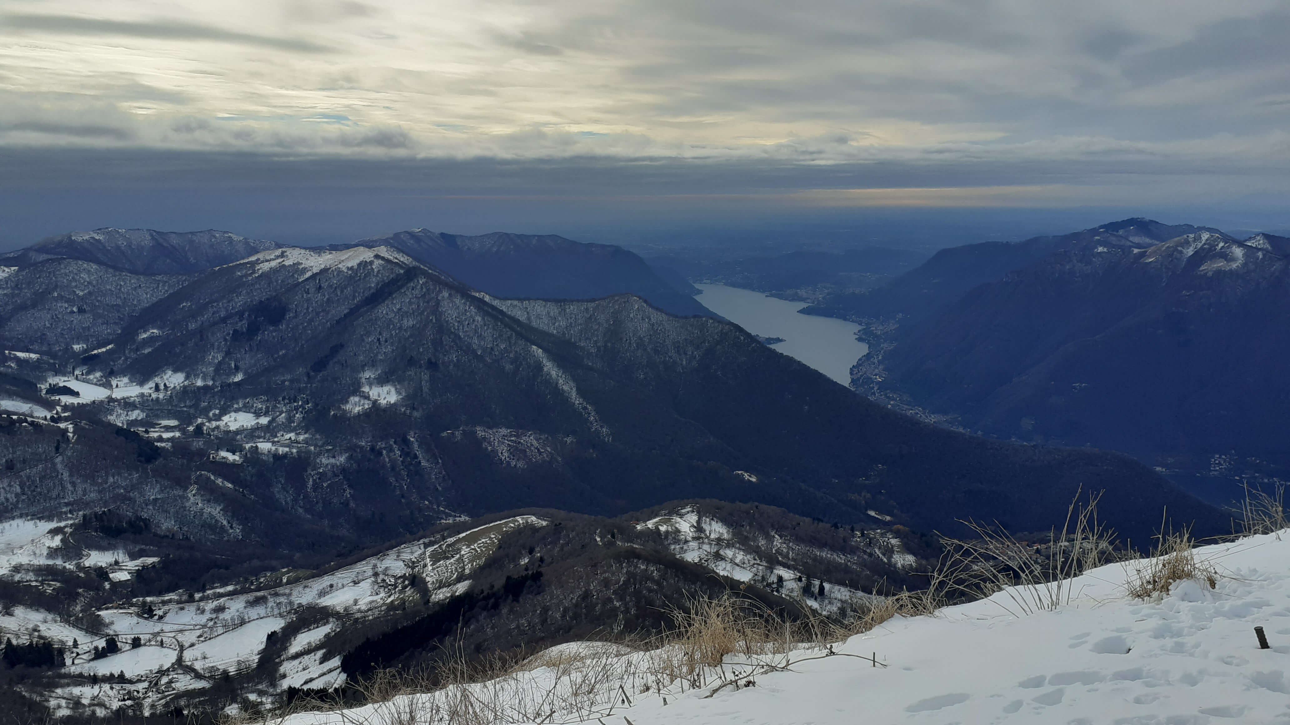 Oggi organizziamo una salita nel percorso che io preferisco all’ interno del Triangolo Lariano… la “traversata” del Monte San Primo. Partiamo dalla Colma di Sormano (1120 m), dietro il bar. Troviamo subito un lastrone di ghiaccio compatto; proseguiamo solo con gli scarponi, ma ci fermiamo quasi subito per infilare i ramponi da ghiaccio… e, così, continuiamo più agevolmente (li terremo per tutto il percorso, sia in salita che in discesa). Arriviamo alla Colma del Bosco (1230 m) e poi alla Bocchetta di Spessola (1235 m). Ci fermiamo per scattare parecchie foto lungo il percorso… il panorama è stupendo e spazia dappertutto! La neve in alcuni tratti è morbida, in altri è ghiacciata e scivolosa… con i ramponi procediamo abbastanza tranquillamente. Raggiungiamo la Bocchetta di Terrabiotta (1430 m) e da qui è possibile salire direttamente sulla Cresta Est del Monte San Primo (“dorsale per cresta) o prendere a sinistra e seguire la “dorsale bassa”. Decidiamo di salire sulla Cresta Est, molto più panoramica anche se più impegnativa. Arriviamo alla Cima del Costone (1610 m) e cerchiamo un posticino, uscendo un po’ dal percorso, per mangiare il nostro panino (senza soffermarci troppo… fa davvero freddo!!) Proseguiamo e arriviamo alla vetta del Monte San Primo, con la sua croce (1680 m). Ammiro tutto il bellissimo panorama, anche portandolo all’ interno della fotocamera del mio cellulare. Non ci fermiamo tanto… il cielo si è coperto di nubi grigie ed è meglio iniziare subito la discesa. Ripercorriamo la Cresta Est (“dorsale per cresta”), passando per la Cima del Costone (1610 m), arriviamo alla Bocchetta di Terrabiotta (1430 m), alla Bocchetta di Spessola (1235 m) e, infine, torniamo alla Colma del Bosco (1230 m). Alla fine del percorso, eccoci di nuovo alla Colma di Sormano (1120 m) e alla nostra macchina. Giornata stupenda… e abbiamo rimesso i ramponi che erano fermi dall’ inverno scorso!