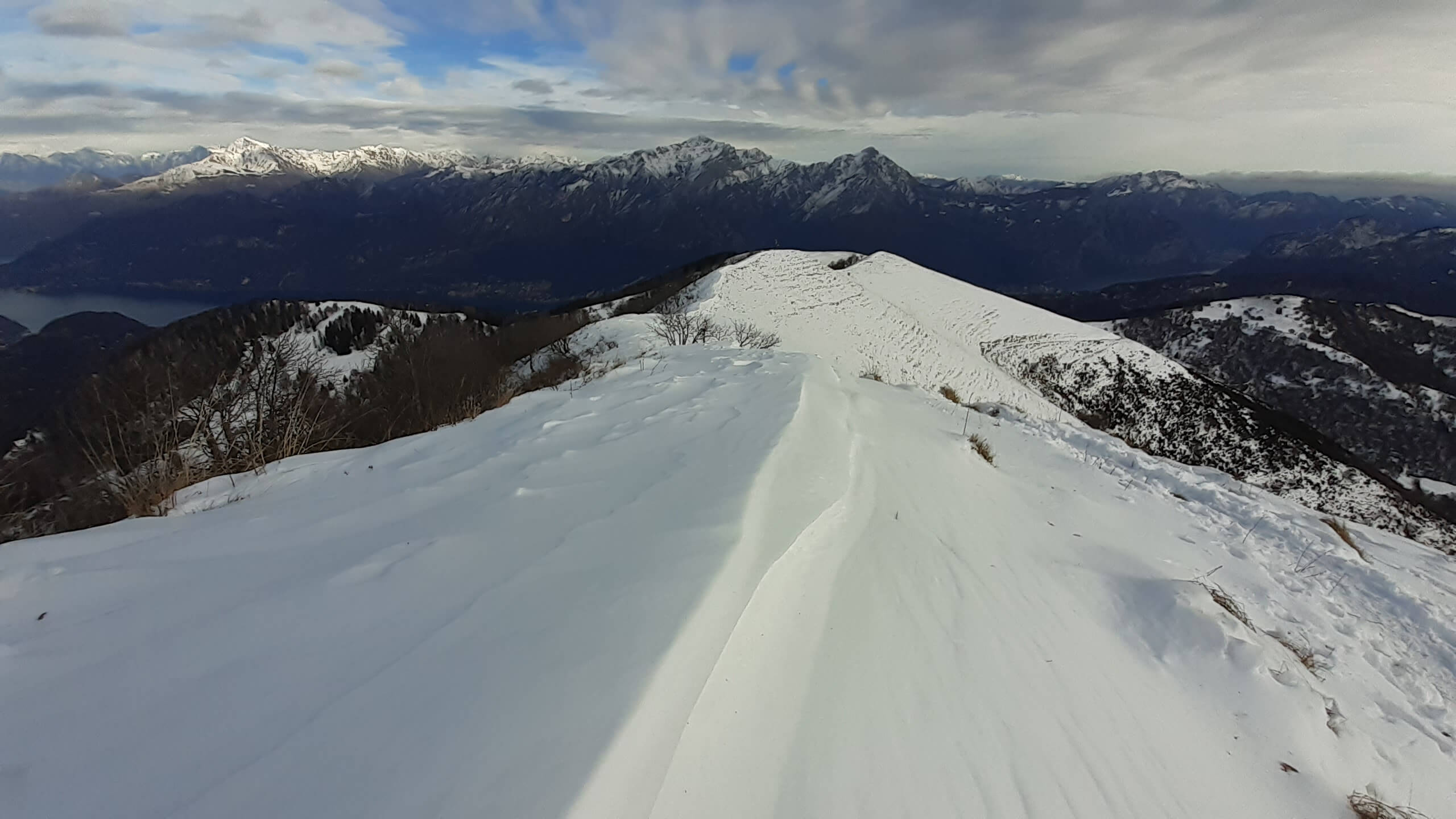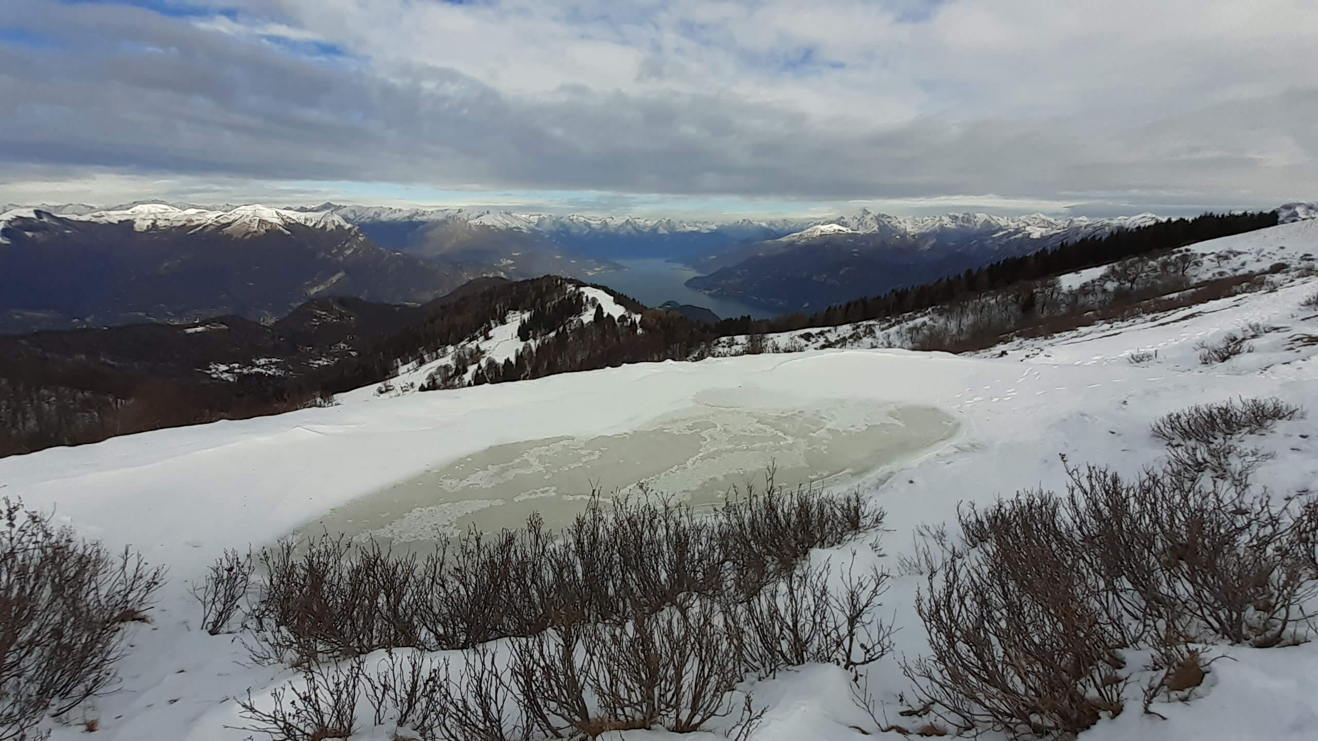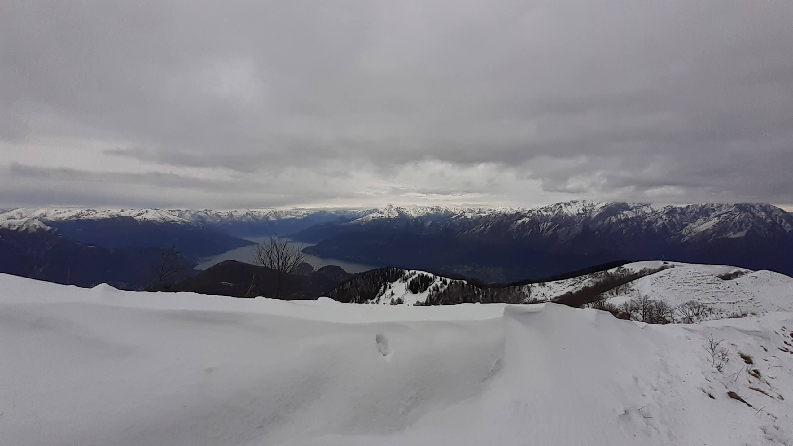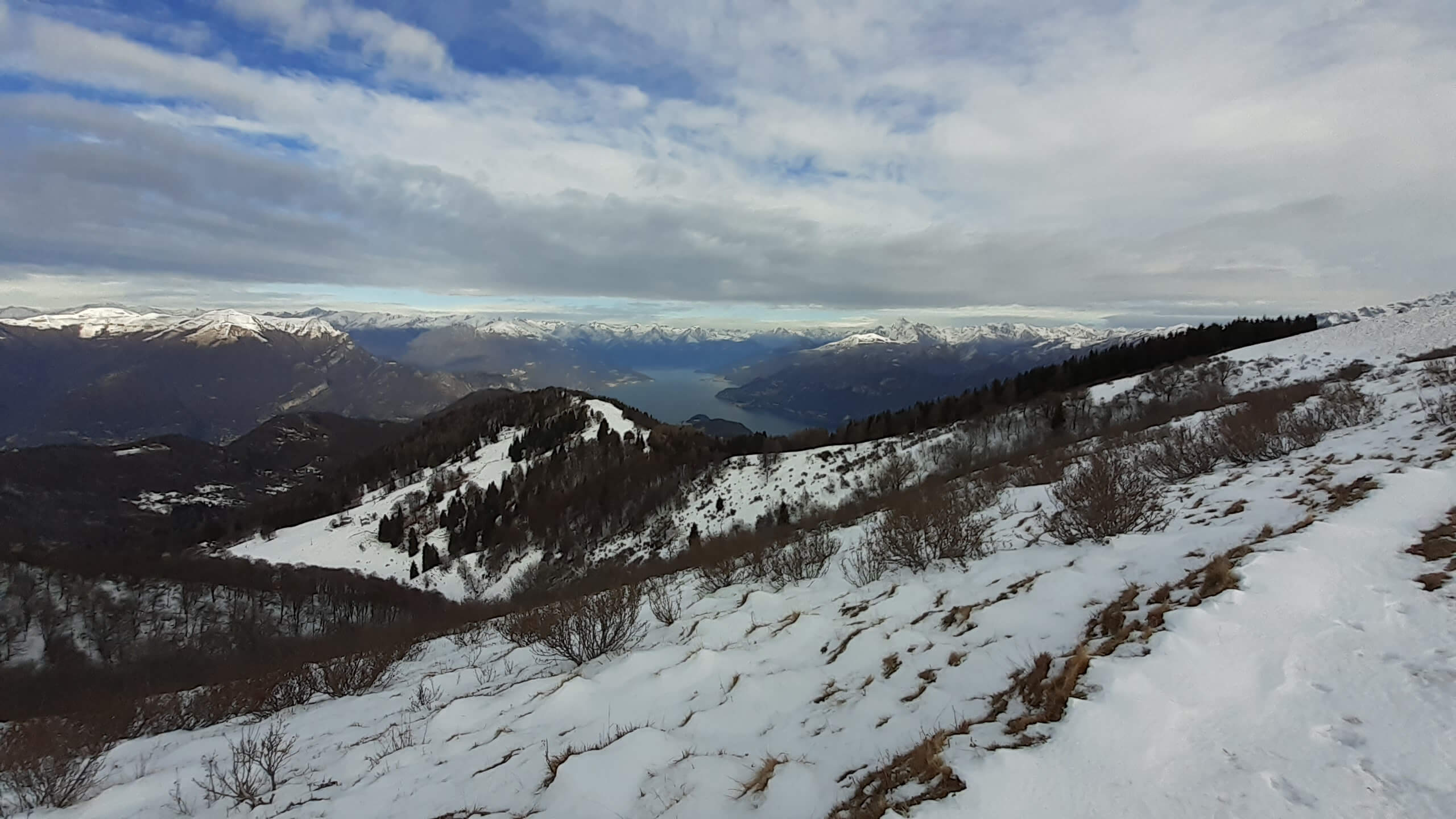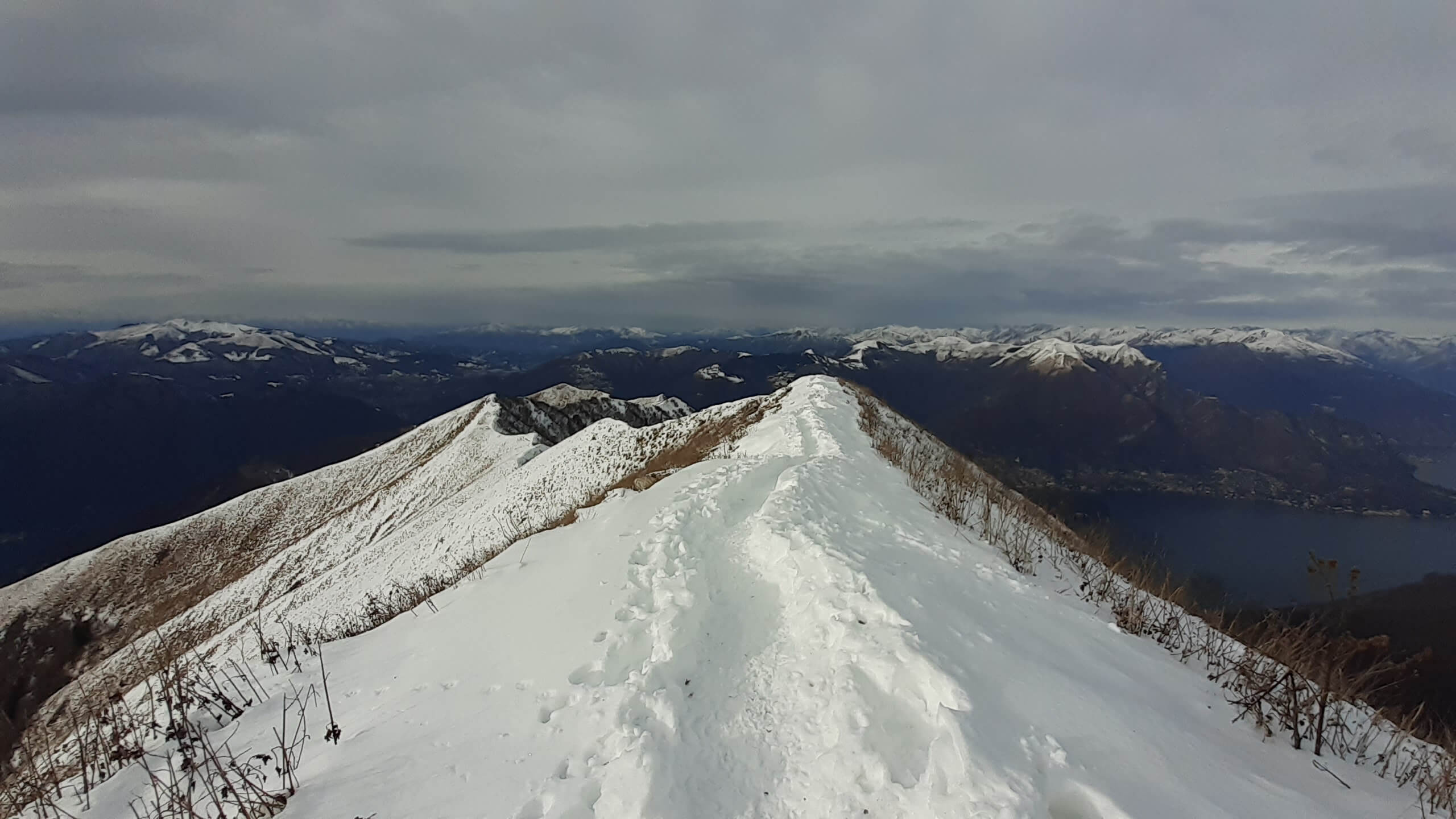Oggi organizziamo una salita nel percorso che io preferisco all’ interno del Triangolo Lariano… la “traversata” del Monte San Primo. Partiamo dalla Colma di Sormano (1120 m), dietro il bar. Troviamo subito un lastrone di ghiaccio compatto; proseguiamo solo con gli scarponi, ma ci fermiamo quasi subito per infilare i ramponi da ghiaccio… e, così, continuiamo più agevolmente (li terremo per tutto il percorso, sia in salita che in discesa). Arriviamo alla Colma del Bosco (1230 m) e poi alla Bocchetta di Spessola (1235 m). Ci fermiamo per scattare parecchie foto lungo il percorso… il panorama è stupendo e spazia dappertutto! La neve in alcuni tratti è morbida, in altri è ghiacciata e scivolosa… con i ramponi procediamo abbastanza tranquillamente. Raggiungiamo la Bocchetta di Terrabiotta (1430 m) e da qui è possibile salire direttamente sulla Cresta Est del Monte San Primo (“dorsale per cresta) o prendere a sinistra e seguire la “dorsale bassa”. Decidiamo di salire sulla Cresta Est, molto più panoramica anche se più impegnativa. Arriviamo alla Cima del Costone (1610 m) e cerchiamo un posticino, uscendo un po’ dal percorso, per mangiare il nostro panino (senza soffermarci troppo… fa davvero freddo!!) Proseguiamo e arriviamo alla vetta del Monte San Primo, con la sua croce (1680 m). Ammiro tutto il bellissimo panorama, anche portandolo all’ interno della fotocamera del mio cellulare. Non ci fermiamo tanto… il cielo si è coperto di nubi grigie ed è meglio iniziare subito la discesa. Ripercorriamo la Cresta Est (“dorsale per cresta”), passando per la Cima del Costone (1610 m), arriviamo alla Bocchetta di Terrabiotta (1430 m), alla Bocchetta di Spessola (1235 m) e, infine, torniamo alla Colma del Bosco (1230 m). Alla fine del percorso, eccoci di nuovo alla Colma di Sormano (1120 m) e alla nostra macchina. Giornata stupenda… e abbiamo rimesso i ramponi che erano fermi dall’ inverno scorso!
