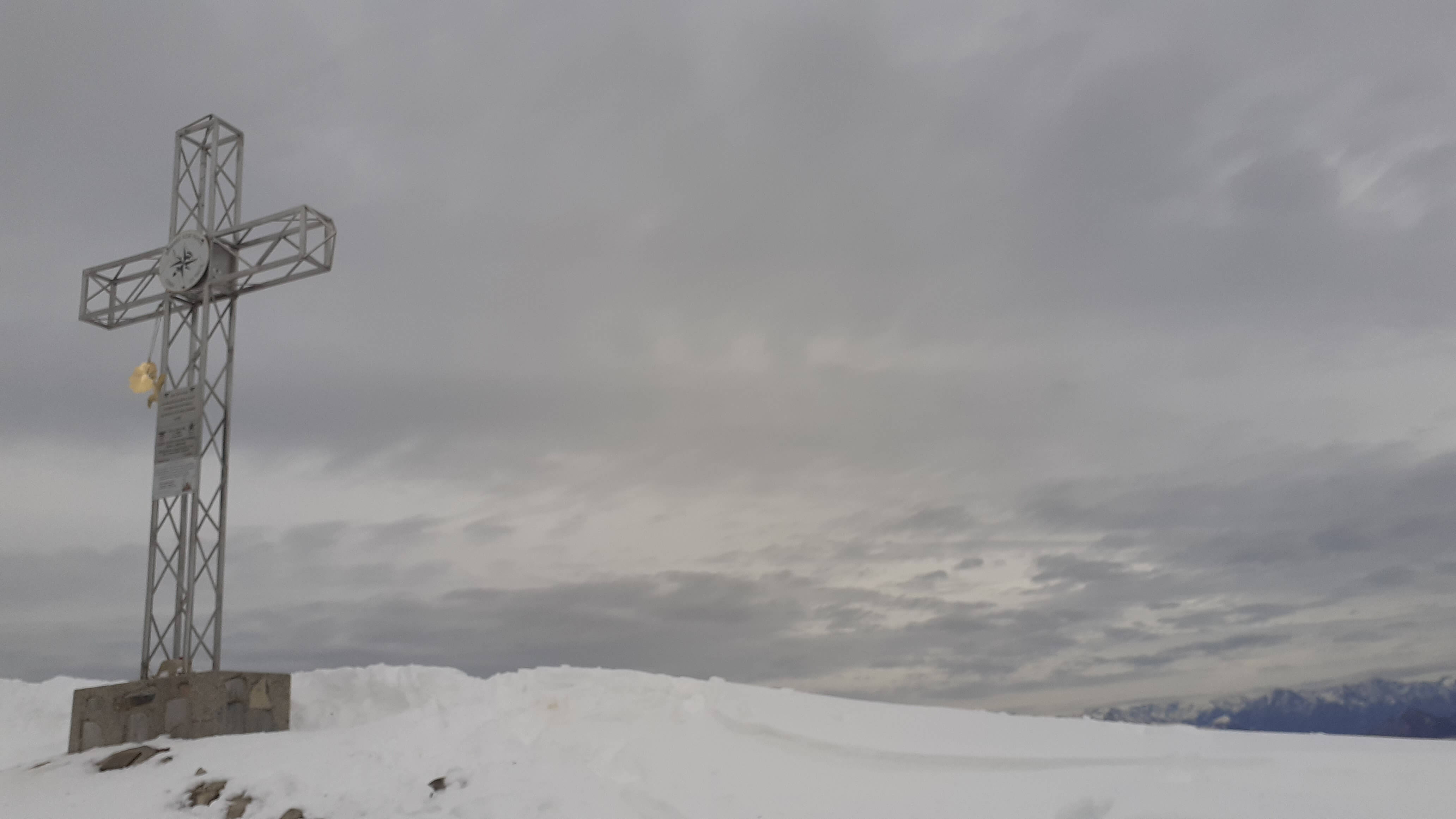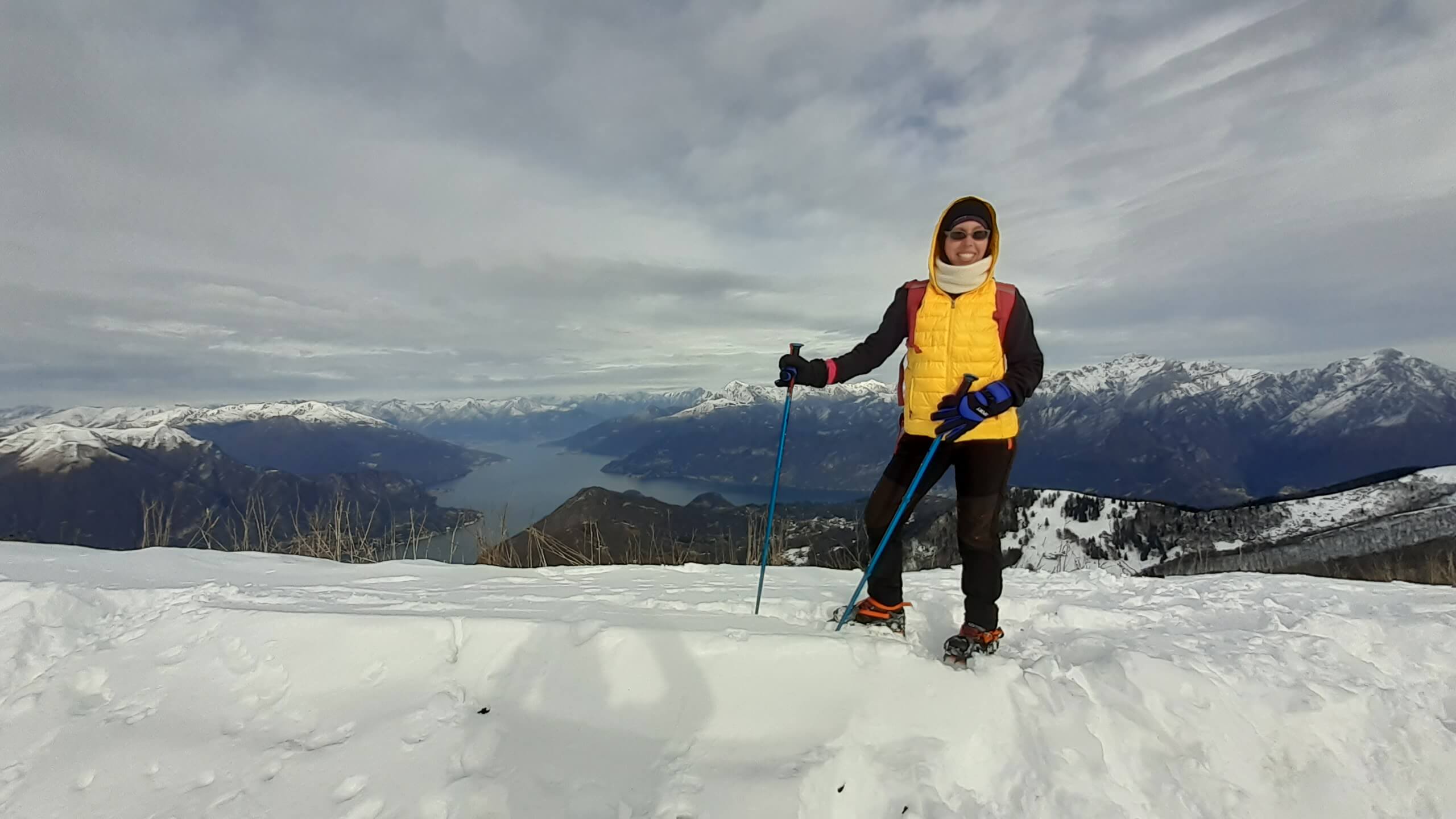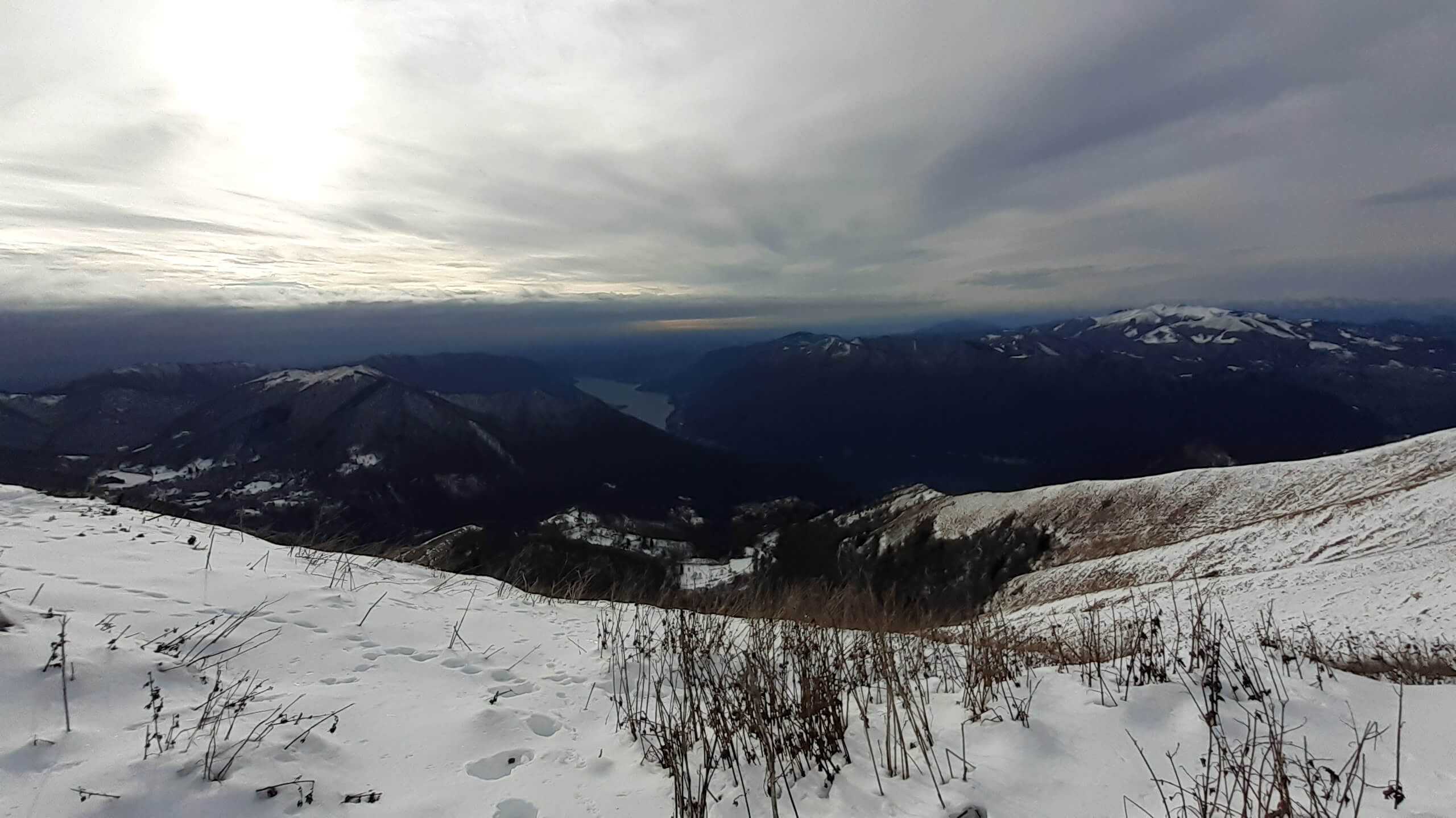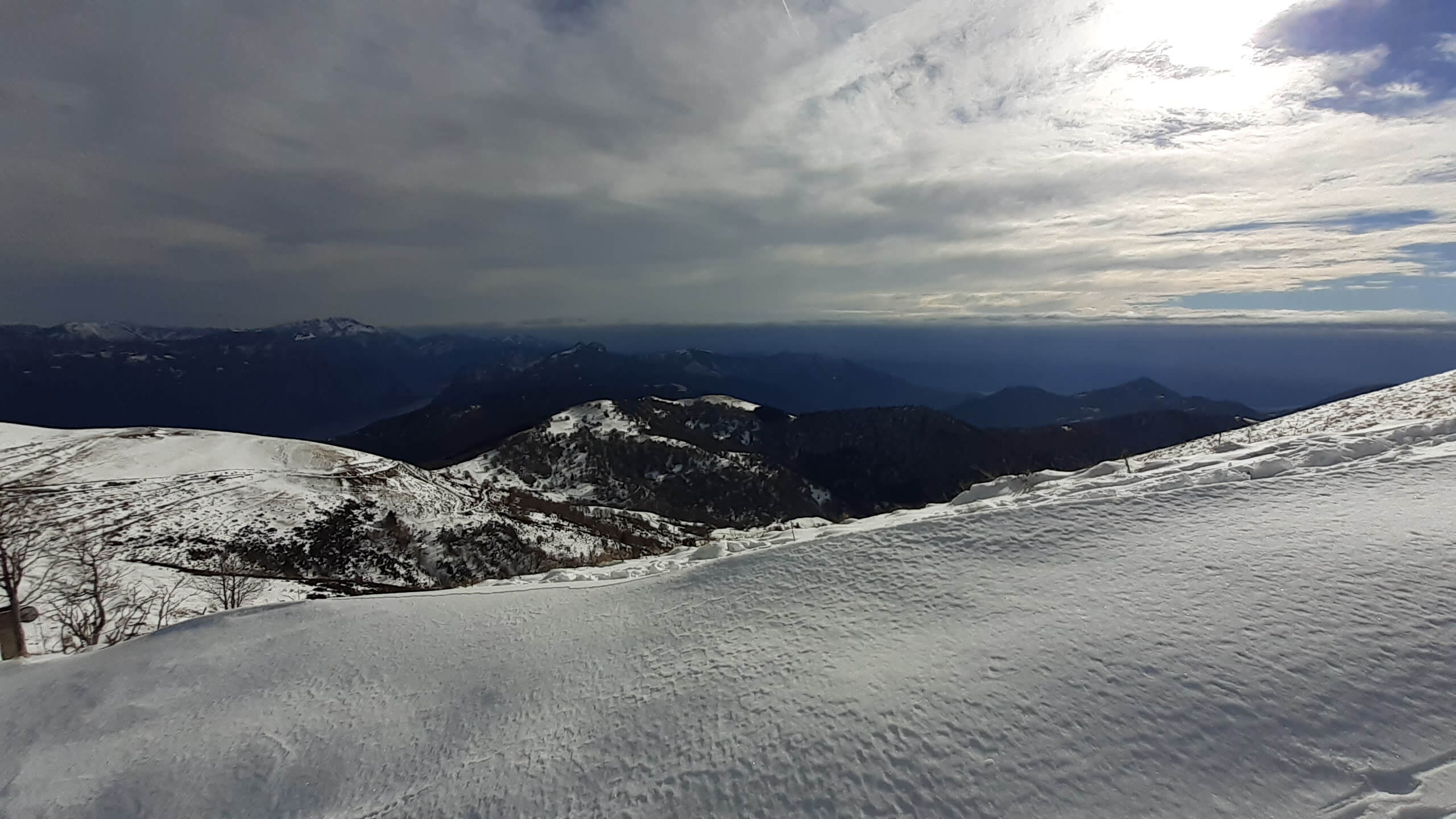 Oggi organizziamo una salita nel percorso che io preferisco all’ interno del Triangolo Lariano… la “traversata” del Monte San Primo. Partiamo dalla Colma di Sormano (1120 m), dietro il bar. Troviamo subito un lastrone di ghiaccio compatto; proseguiamo solo con gli scarponi, ma ci fermiamo quasi subito per infilare i ramponi da ghiaccio… e, così, continuiamo più agevolmente (li terremo per tutto il percorso, sia in salita che in discesa). Arriviamo alla Colma del Bosco (1230 m) e poi alla Bocchetta di Spessola (1235 m). Ci fermiamo per scattare parecchie foto lungo il percorso… il panorama è stupendo e spazia dappertutto! La neve in alcuni tratti è morbida, in altri è ghiacciata e scivolosa… con i ramponi procediamo abbastanza tranquillamente. Raggiungiamo la Bocchetta di Terrabiotta (1430 m) e da qui è possibile salire direttamente sulla Cresta Est del Monte San Primo (“dorsale per cresta) o prendere a sinistra e seguire la “dorsale bassa”. Decidiamo di salire sulla Cresta Est, molto più panoramica anche se più impegnativa. Arriviamo alla Cima del Costone (1610 m) e cerchiamo un posticino, uscendo un po’ dal percorso, per mangiare il nostro panino (senza soffermarci troppo… fa davvero freddo!!) Proseguiamo e arriviamo alla vetta del Monte San Primo, con la sua croce (1680 m). Ammiro tutto il bellissimo panorama, anche portandolo all’ interno della fotocamera del mio cellulare. Non ci fermiamo tanto… il cielo si è coperto di nubi grigie ed è meglio iniziare subito la discesa. Ripercorriamo la Cresta Est (“dorsale per cresta”), passando per la Cima del Costone (1610 m), arriviamo alla Bocchetta di Terrabiotta (1430 m), alla Bocchetta di Spessola (1235 m) e, infine, torniamo alla Colma del Bosco (1230 m). Alla fine del percorso, eccoci di nuovo alla Colma di Sormano (1120 m) e alla nostra macchina. Giornata stupenda… e abbiamo rimesso i ramponi che erano fermi dall’ inverno scorso!