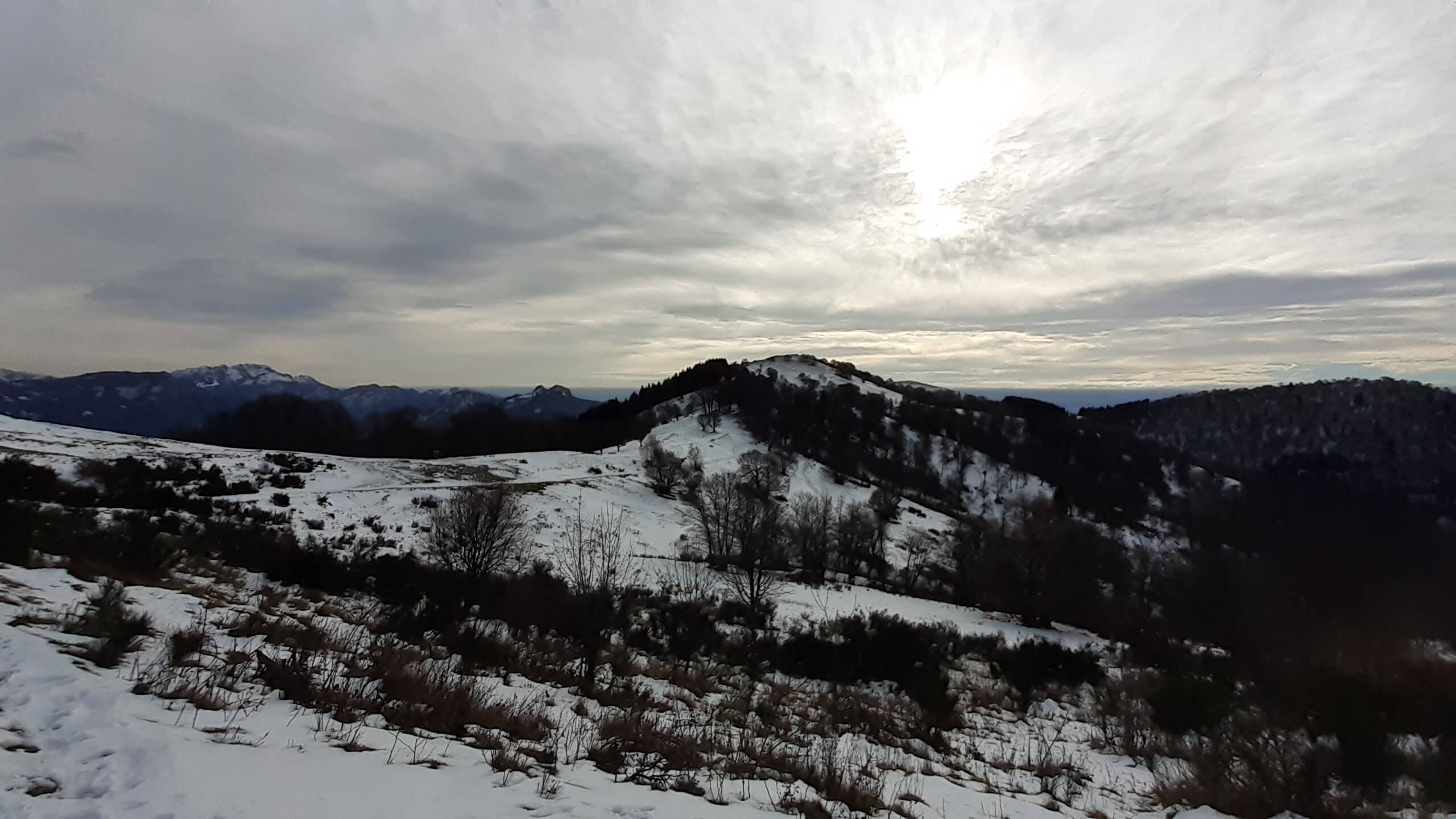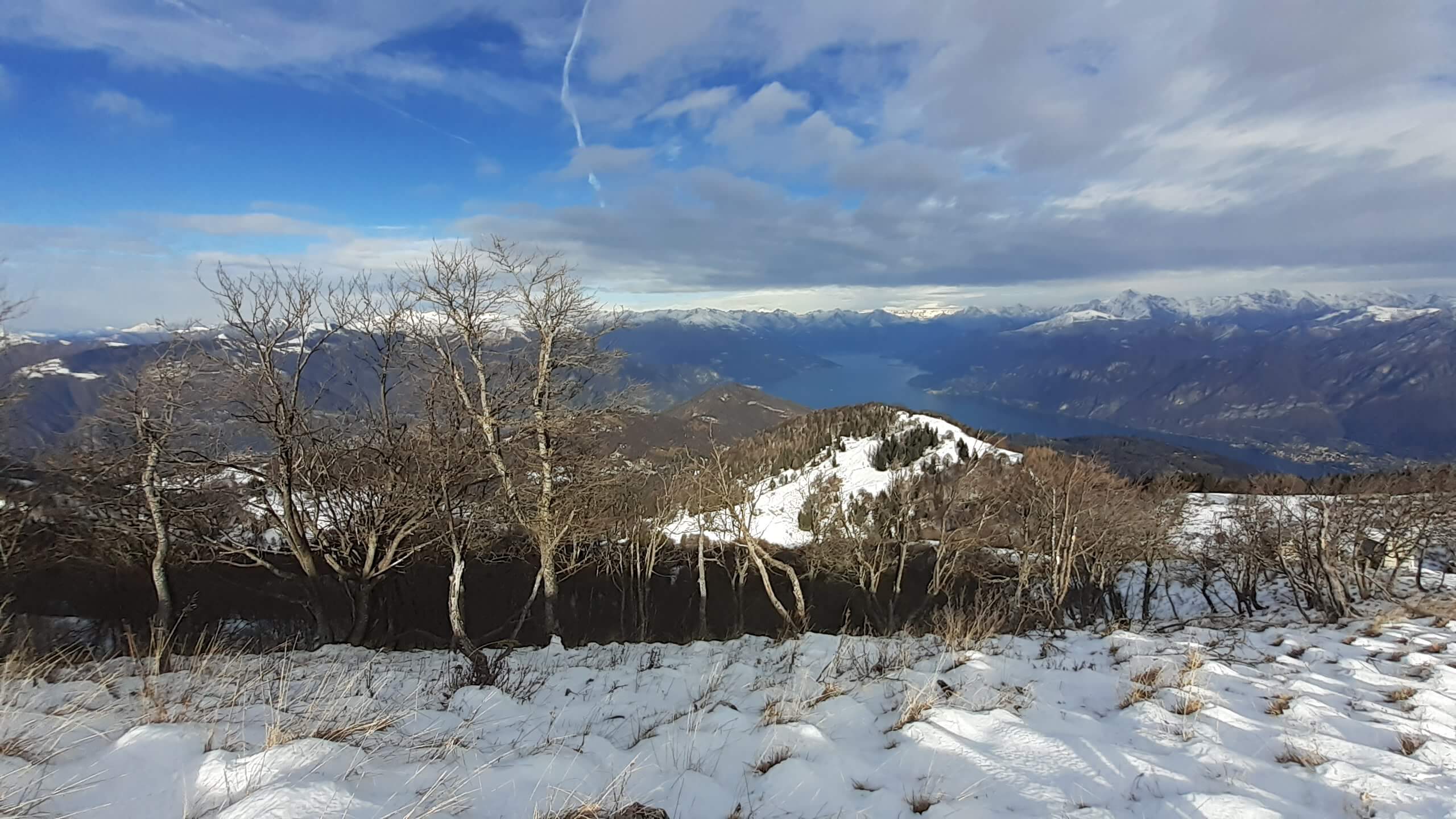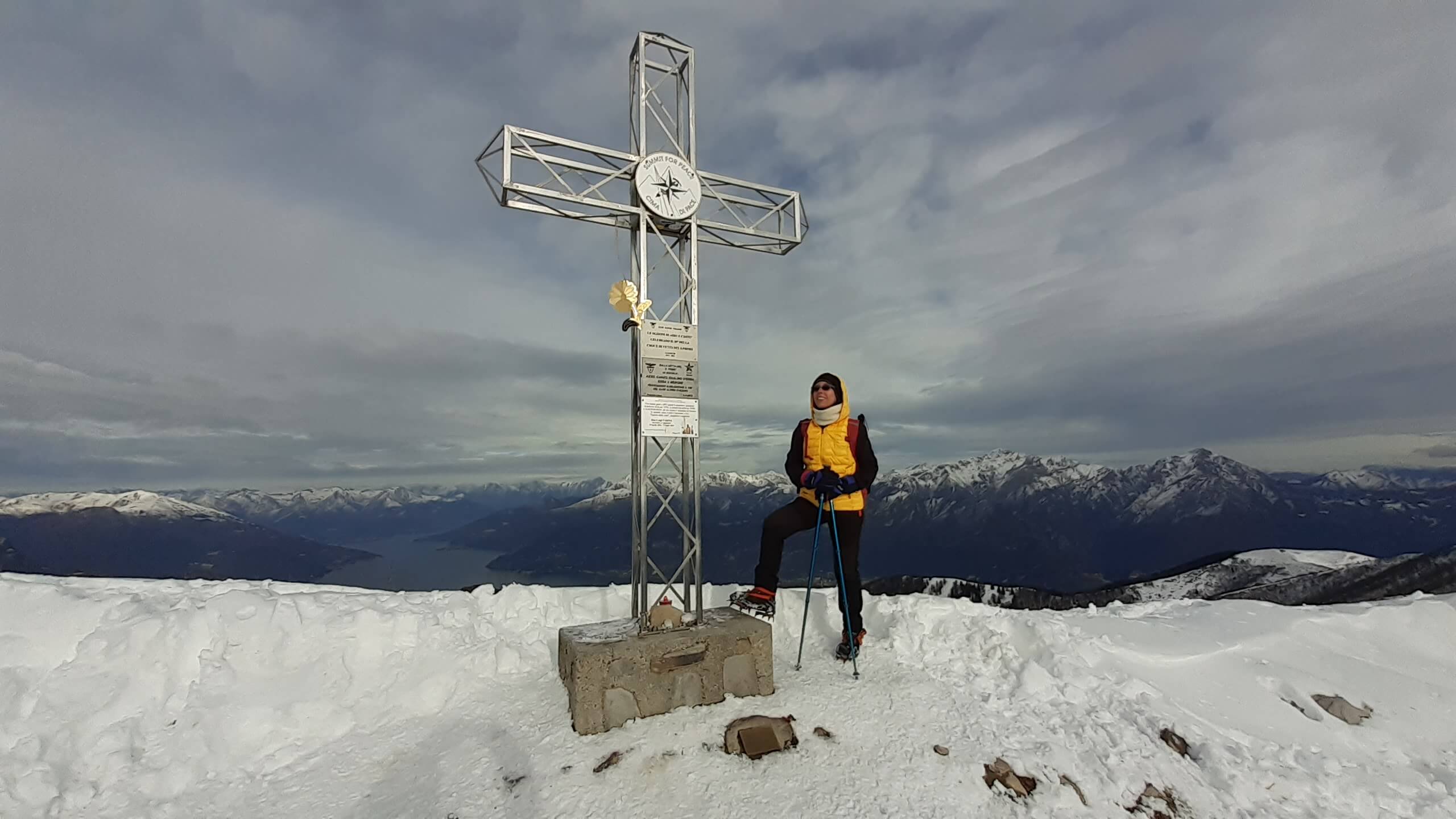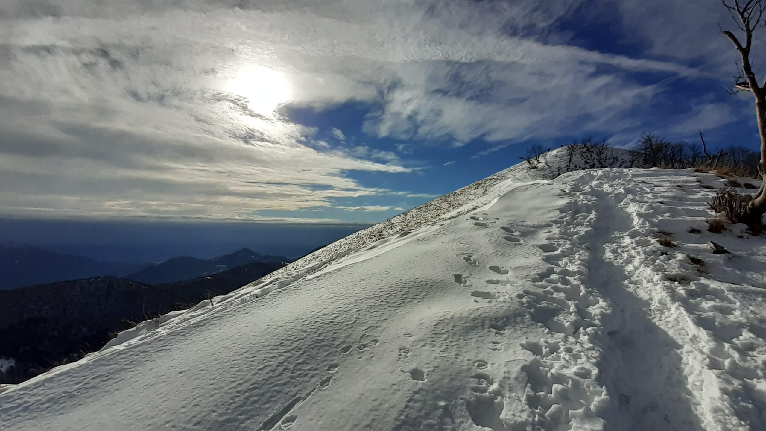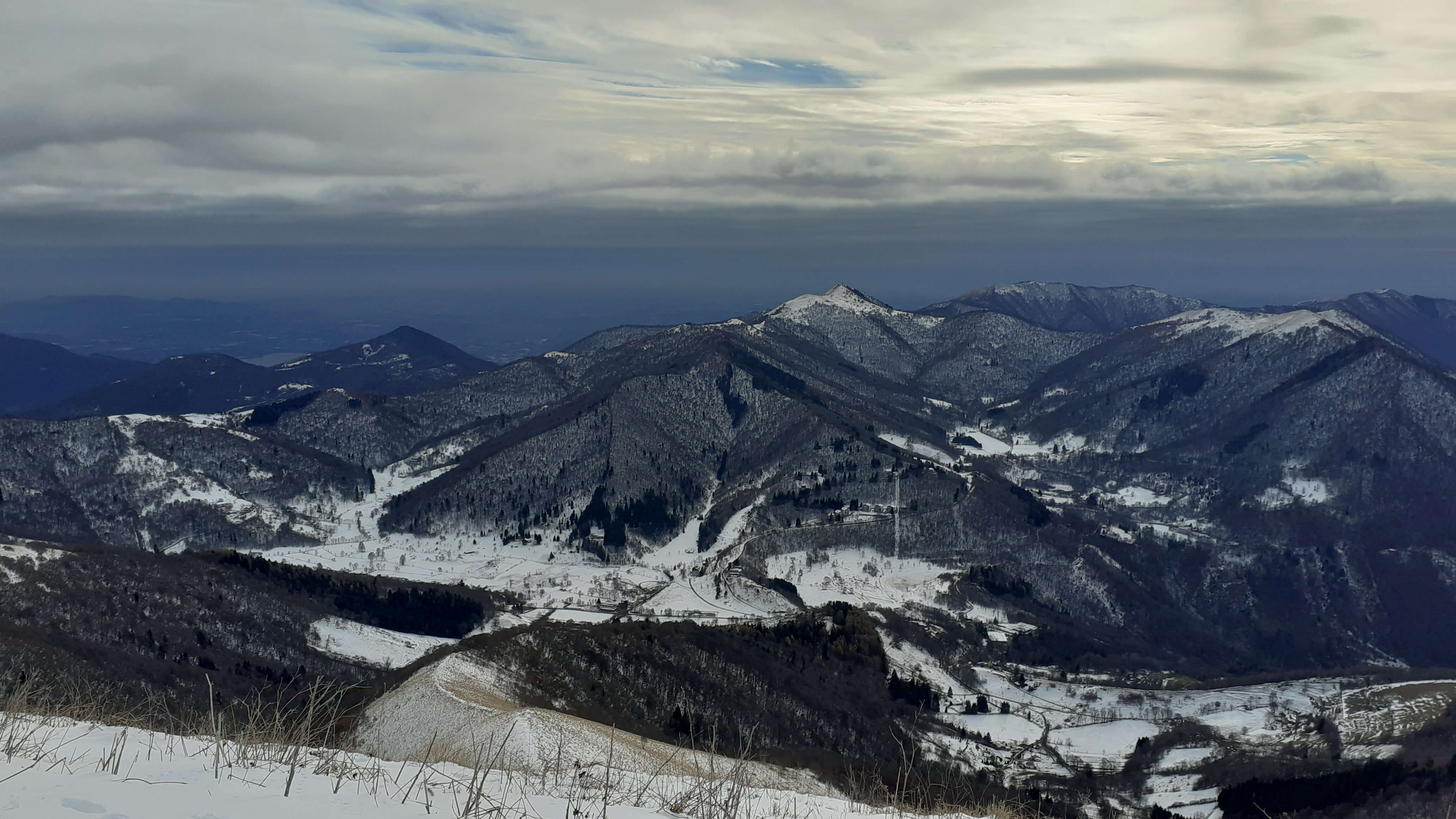 Oggi organizziamo una salita nel percorso che io preferisco all’ interno del Triangolo Lariano… la “traversata” del Monte San Primo. Partiamo dalla Colma di Sormano (1120 m), dietro il bar. Troviamo subito un lastrone di ghiaccio compatto; proseguiamo solo con gli scarponi, ma ci fermiamo quasi subito per infilare i ramponi da ghiaccio… e, così, continuiamo più agevolmente (li terremo per tutto il percorso, sia in salita che in discesa). Arriviamo alla Colma del Bosco (1230 m) e poi alla Bocchetta di Spessola (1235 m). Ci fermiamo per scattare parecchie foto lungo il percorso… il panorama è stupendo e spazia dappertutto! La neve in alcuni tratti è morbida, in altri è ghiacciata e scivolosa… con i ramponi procediamo abbastanza tranquillamente. Raggiungiamo la Bocchetta di Terrabiotta (1430 m) e da qui è possibile salire direttamente sulla Cresta Est del Monte San Primo (“dorsale per cresta) o prendere a sinistra e seguire la “dorsale bassa”. Decidiamo di salire sulla Cresta Est, molto più panoramica anche se più impegnativa. Arriviamo alla Cima del Costone (1610 m) e cerchiamo un posticino, uscendo un po’ dal percorso, per mangiare il nostro panino (senza soffermarci troppo… fa davvero freddo!!) Proseguiamo e arriviamo alla vetta del Monte San Primo, con la sua croce (1680 m). Ammiro tutto il bellissimo panorama, anche portandolo all’ interno della fotocamera del mio cellulare. Non ci fermiamo tanto… il cielo si è coperto di nubi grigie ed è meglio iniziare subito la discesa. Ripercorriamo la Cresta Est (“dorsale per cresta”), passando per la Cima del Costone (1610 m), arriviamo alla Bocchetta di Terrabiotta (1430 m), alla Bocchetta di Spessola (1235 m) e, infine, torniamo alla Colma del Bosco (1230 m). Alla fine del percorso, eccoci di nuovo alla Colma di Sormano (1120 m) e alla nostra macchina. Giornata stupenda… e abbiamo rimesso i ramponi che erano fermi dall’ inverno scorso!