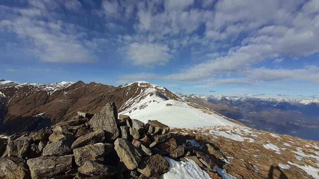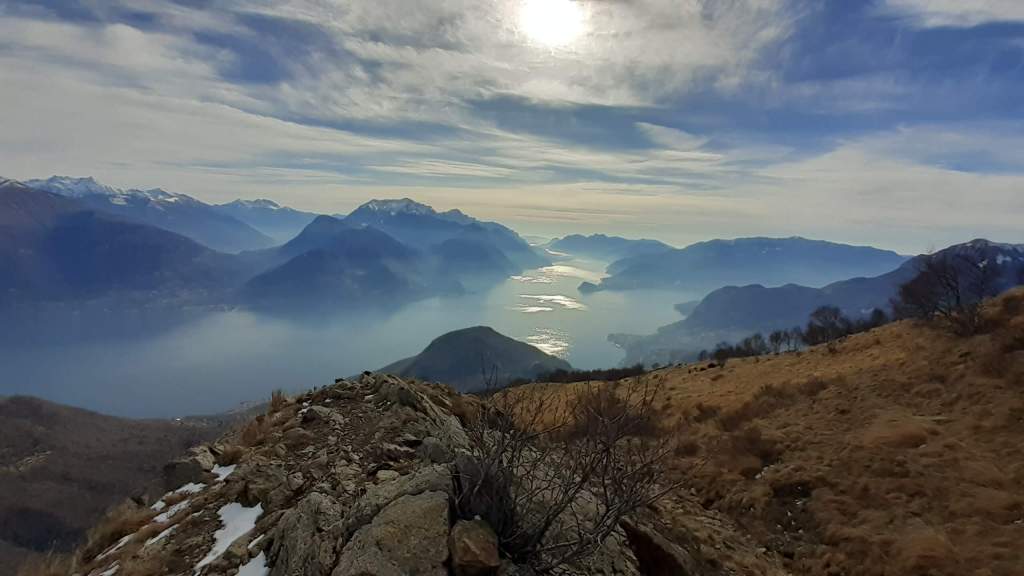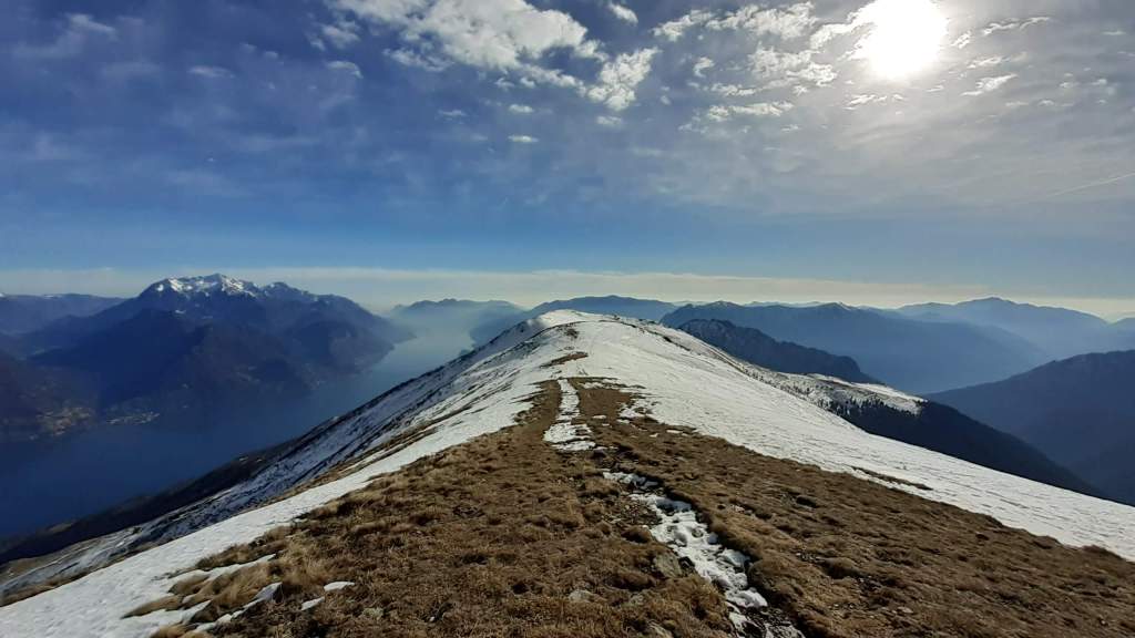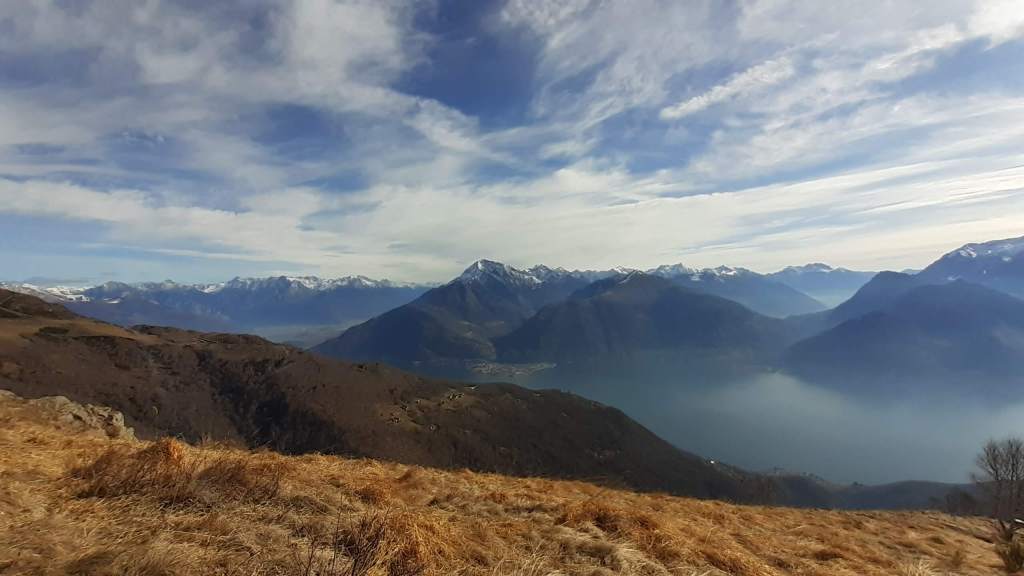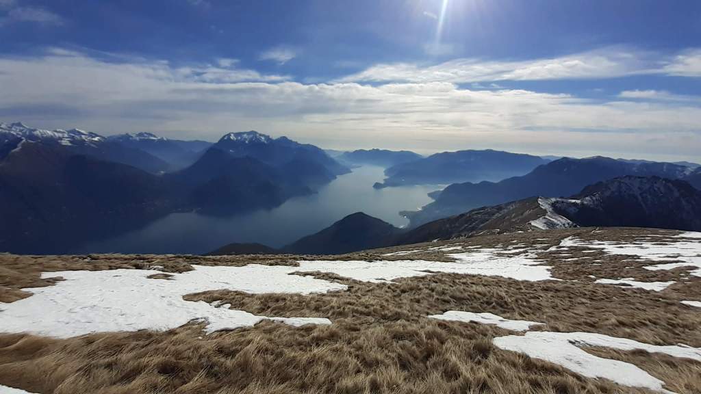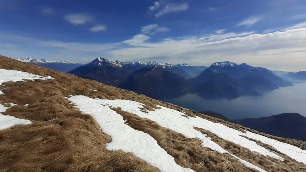 Oggi siamo nello stupendo scenario del Lago di Como. Partiamo da Breglia (730 m), sopra la cittadina di Menaggio. Saliamo fino a Monti di Breglia (990 m) e da qui seguiamo il percorso che ci porta ad un bivio : a sinistra il percorso porta al Rifugio Menaggio, a destra verso Sant’ Amate. Noi prendiamo a destra e, su percorso con ripidità costante, arriviamo alla piccola cappella di Sant’ Amate (1623 m). (P.S. l’ ultimo tratto, piuttosto esposto, presenta neve, ghiaccio e fango… quindi la difficoltà qui aumenta parecchio). Piccola pausa e poi saliamo al di là di Sant’ Amate. Il percorso è piuttosto lungo e raggiunge prima un’ anticima, in parte rocciosa, e poi la Vetta del Monte Bregagnino (1905 m). Qui inizia a soffiare un vento freddo con forti raffiche… cerchiamo un posticino dove mangiare il panino e poi proseguiamo. La neve, fino ad ora poca e aggirabile, da adesso diventa più presente, ma si sale anche solo con i ramponcini ed eccoci, dopo un’ altra piccola cima rocciosa, anche alla Vetta del Monte Bregagno (2107 m)! Il panorama stupendo che ci ha accompagnato per tutta la salita adesso si amplia e diventa spettacolare! Da qui si possono ammirare laghi e montagne… da non sapere dove guardare! Ammirazione… foto… e poi “attacchiamo” la discesa che ci porta di nuovo alla Vetta del Monte Bregagnino (1905 m), a Sant’ Amate (1623 m), a Monti di Breglia (990 m) e, infine, a Breglia (730 m). Giornata splendida, percorso spettacolare e panorami che sfiorano davvero l’ infinito!