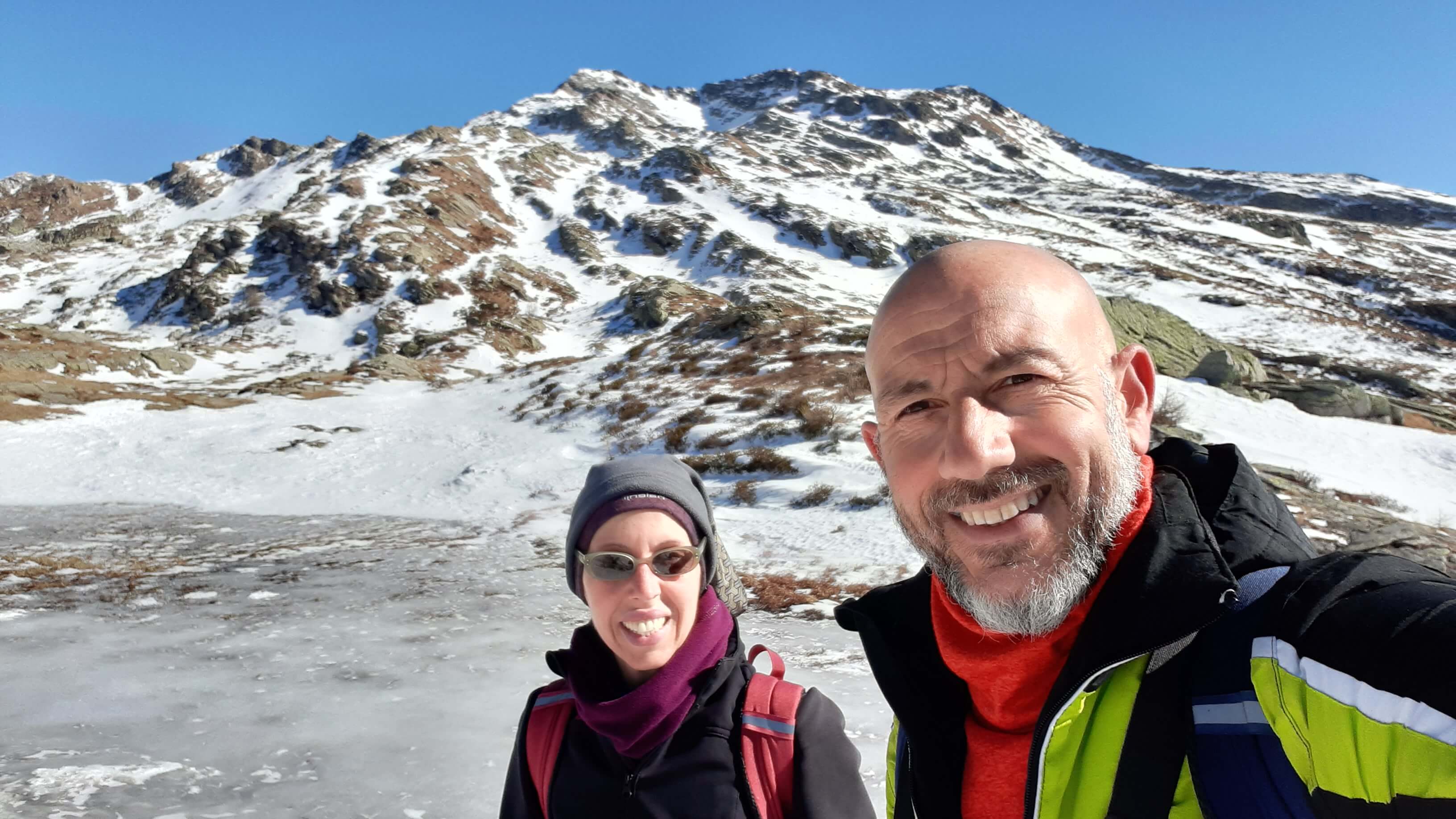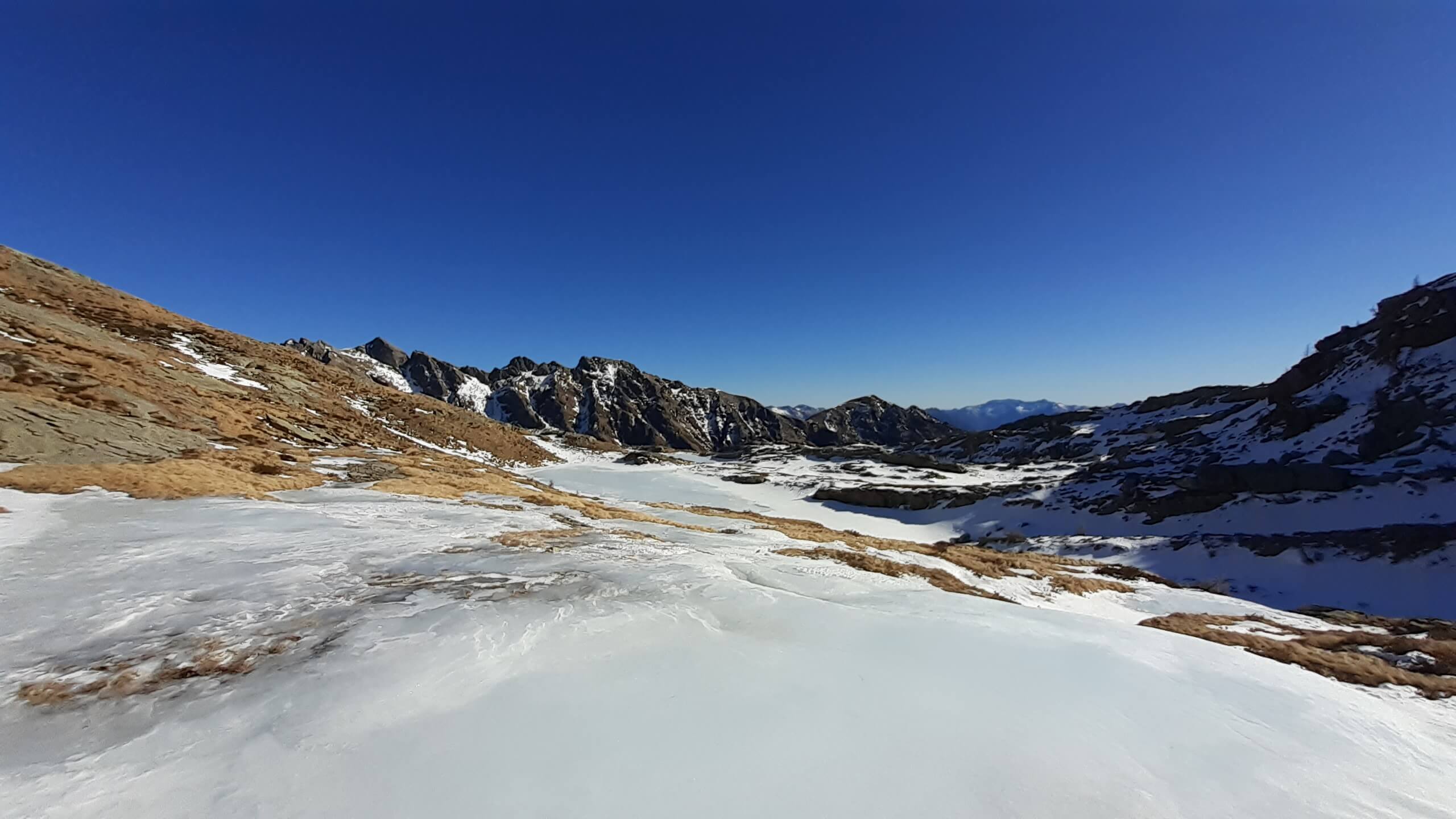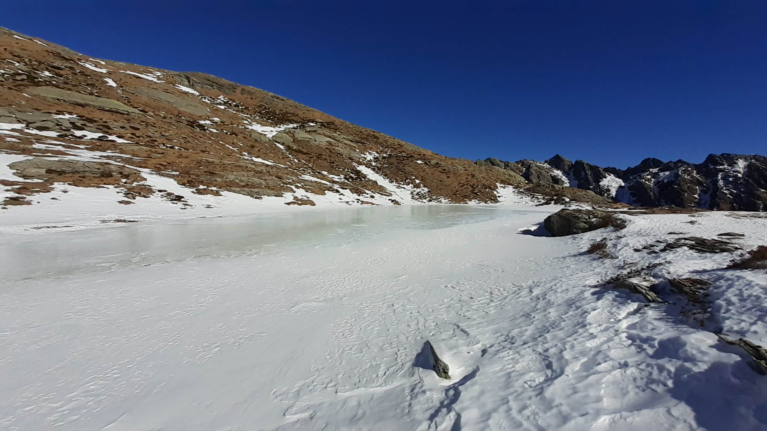 Oggi è una bella giornata di sole e decidiamo di fare un percorso piuttosto impegnativo che ci porterà alla scoperta di numerosi specchi d’ acqua tra neve e roccia… i Laghi di Variola in Alta Val Bognanco. Partiamo da San Bernardo (1630 m) e ci incamminiamo verso il Rifugio Il Dosso (1740 m), tagliando alcuni tornanti grazie alla “direttissima” nel bosco. Saliamo poi verso l’ Alpe Paione, il primo alpeggio di oggi (1790 m) e da qui prendiamo a destra, in direzione di alcune piccole casette, seguendo le indicazioni “Casariola/Alpe Dorca”. Perdiamo quota fino ad una bella cascata (1700 m) e da qui risaliamo fino all’ Alpe Casariola, il secondo alpeggio di oggi (1722 m)… qualche foto e poi proseguiamo, accompagnati da un grandioso panorama, fino al terzo alpeggio : l’ Alpe Dorca (1874 m). Piccola pausa fotografica e poi seguiamo il percorso, sempre segnato e visibile, fino ai ruderi abbandonati dell’ Alpe di Variola Inferiore (1880 m) e poi, sempre su percorso visibile (solo in prossimità di un ruscello ghiacciato usciamo di poco dal percorso per evitare il ghiaccio!), raggiungiamo l’ Alpe di Variola Superiore (1990 m). Da qui il percorso si complica e diventa piuttosto impegnativo… le indicazioni e i bolloni indicativi sulle pietre scompaiono e dobbiamo salire “un po’ a caso” usando senso dell’ orientamento e, soprattutto, il cellulare (con itinerario e percorsi). Saliamo tra rocce, paglioni e “canalini” di neve e riusciamo ad arrivare al Primo Lago di Variola (2100 m). I Laghi di Variola sono numerosi (3 i principali e almeno 4, 5 specchi d’ acqua minori) e vanno da un’ altitudine di 2100 m ad un’ altitudine di 2230 m. Sono davvero spettacolari!! Un mix perfetto di neve, ghiaccio e roccia! Infiliamo i ramponcini che ci permettono di compiere un bellissimo “anello dei Laghi di Variola”, riuscendo a raggiungere anche i 2 Laghi Superiori, passando lungo un paio di ripidi traversi su neve ghiacciata e tratti su neve morbida dove si sprofonda parecchio! P.S. : lungo questo “anello dei laghi” la neve è intatta (non è passato nessuno!) e dobbiamo aprire il percorso… con molta attenzione e molta cautela! Al Lago di Variola Superiore (2230 m) mangiamo il nostro panino… davanti al panorama stupendo del Pizzo del Rovale! Torniamo giù raggiungendo anche gli laghi e poi scendiamo in direzione dell’ Alpe di Variola Superiore (1990 m). Togliamo i ramponcini e ci apprestiamo a scendere lungo lo stesso percorso dell’ andata…. Alpe di Variola Inferiore (1880 m), Alpe Dorca (1874 m), Alpe Casariola (1722 m) e Alpe Paione (1790 m). Da qui una tranquilla discesa fino al Rifugio Il Dosso (1740 m) e poi, passando di nuovo sul ponte sul rio Rasiga, torniamo al parcheggio di San Bernardo (1630 m). Giornata FAVOLOSA in un ambiente da SOGNO…. un ambiente che, in tutte le sue immagini, è scritto indelebile nella mia memoria.