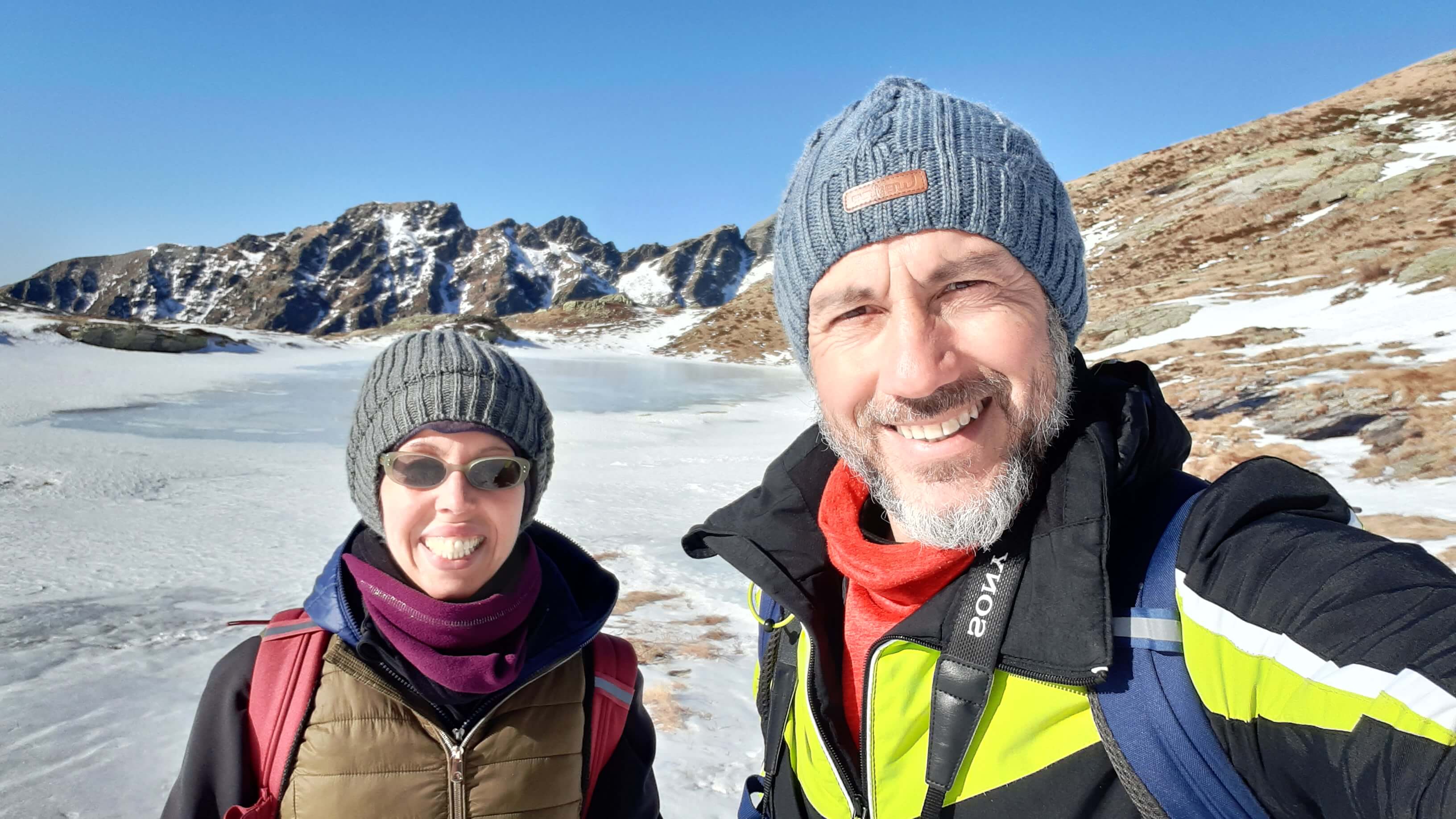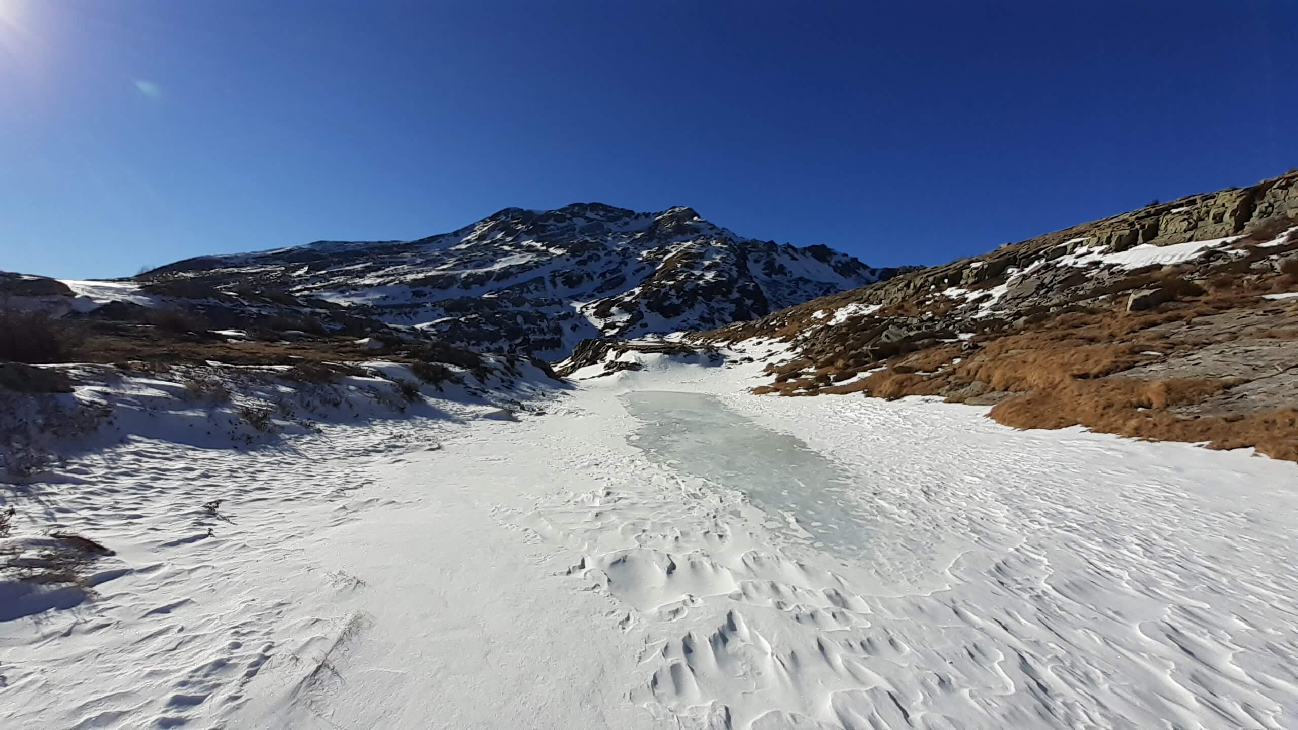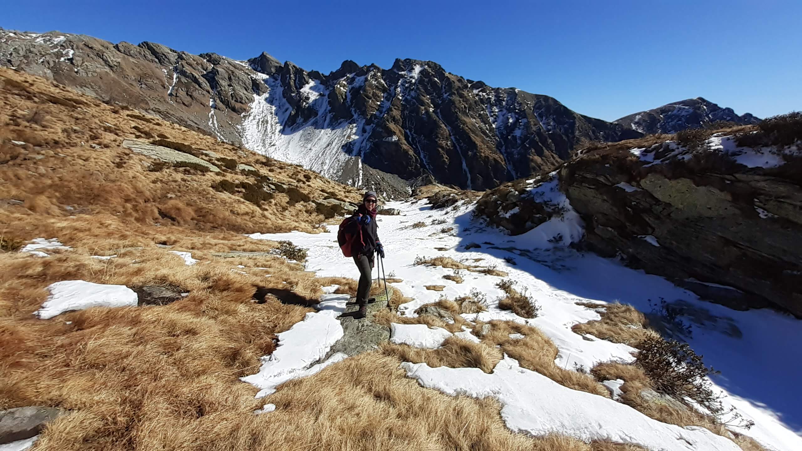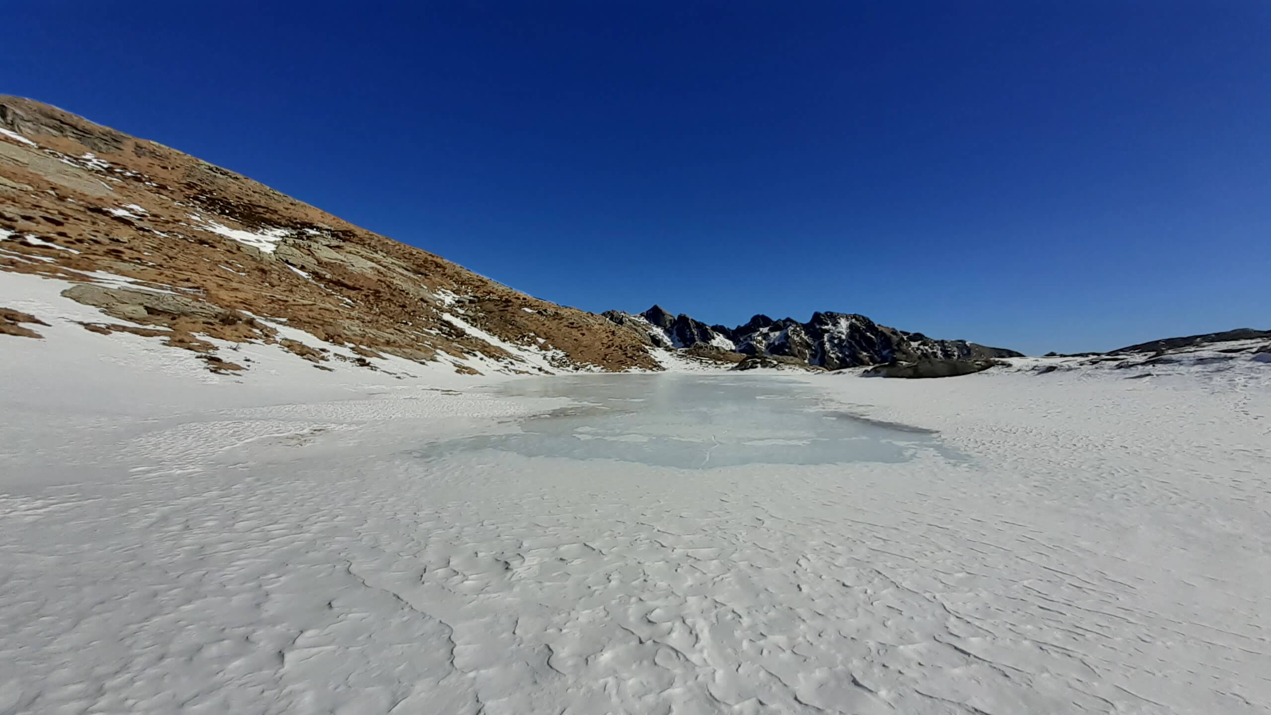 Oggi è una bella giornata di sole e decidiamo di fare un percorso piuttosto impegnativo che ci porterà alla scoperta di numerosi specchi d’ acqua tra neve e roccia… i Laghi di Variola in Alta Val Bognanco. Partiamo da San Bernardo (1630 m) e ci incamminiamo verso il Rifugio Il Dosso (1740 m), tagliando alcuni tornanti grazie alla “direttissima” nel bosco. Saliamo poi verso l’ Alpe Paione, il primo alpeggio di oggi (1790 m) e da qui prendiamo a destra, in direzione di alcune piccole casette, seguendo le indicazioni “Casariola/Alpe Dorca”. Perdiamo quota fino ad una bella cascata (1700 m) e da qui risaliamo fino all’ Alpe Casariola, il secondo alpeggio di oggi (1722 m)… qualche foto e poi proseguiamo, accompagnati da un grandioso panorama, fino al terzo alpeggio : l’ Alpe Dorca (1874 m). Piccola pausa fotografica e poi seguiamo il percorso, sempre segnato e visibile, fino ai ruderi abbandonati dell’ Alpe di Variola Inferiore (1880 m) e poi, sempre su percorso visibile (solo in prossimità di un ruscello ghiacciato usciamo di poco dal percorso per evitare il ghiaccio!), raggiungiamo l’ Alpe di Variola Superiore (1990 m). Da qui il percorso si complica e diventa piuttosto impegnativo… le indicazioni e i bolloni indicativi sulle pietre scompaiono e dobbiamo salire “un po’ a caso” usando senso dell’ orientamento e, soprattutto, il cellulare (con itinerario e percorsi). Saliamo tra rocce, paglioni e “canalini” di neve e riusciamo ad arrivare al Primo Lago di Variola (2100 m). I Laghi di Variola sono numerosi (3 i principali e almeno 4, 5 specchi d’ acqua minori) e vanno da un’ altitudine di 2100 m ad un’ altitudine di 2230 m. Sono davvero spettacolari!! Un mix perfetto di neve, ghiaccio e roccia! Infiliamo i ramponcini che ci permettono di compiere un bellissimo “anello dei Laghi di Variola”, riuscendo a raggiungere anche i 2 Laghi Superiori, passando lungo un paio di ripidi traversi su neve ghiacciata e tratti su neve morbida dove si sprofonda parecchio! P.S. : lungo questo “anello dei laghi” la neve è intatta (non è passato nessuno!) e dobbiamo aprire il percorso… con molta attenzione e molta cautela! Al Lago di Variola Superiore (2230 m) mangiamo il nostro panino… davanti al panorama stupendo del Pizzo del Rovale! Torniamo giù raggiungendo anche gli laghi e poi scendiamo in direzione dell’ Alpe di Variola Superiore (1990 m). Togliamo i ramponcini e ci apprestiamo a scendere lungo lo stesso percorso dell’ andata…. Alpe di Variola Inferiore (1880 m), Alpe Dorca (1874 m), Alpe Casariola (1722 m) e Alpe Paione (1790 m). Da qui una tranquilla discesa fino al Rifugio Il Dosso (1740 m) e poi, passando di nuovo sul ponte sul rio Rasiga, torniamo al parcheggio di San Bernardo (1630 m). Giornata FAVOLOSA in un ambiente da SOGNO…. un ambiente che, in tutte le sue immagini, è scritto indelebile nella mia memoria.