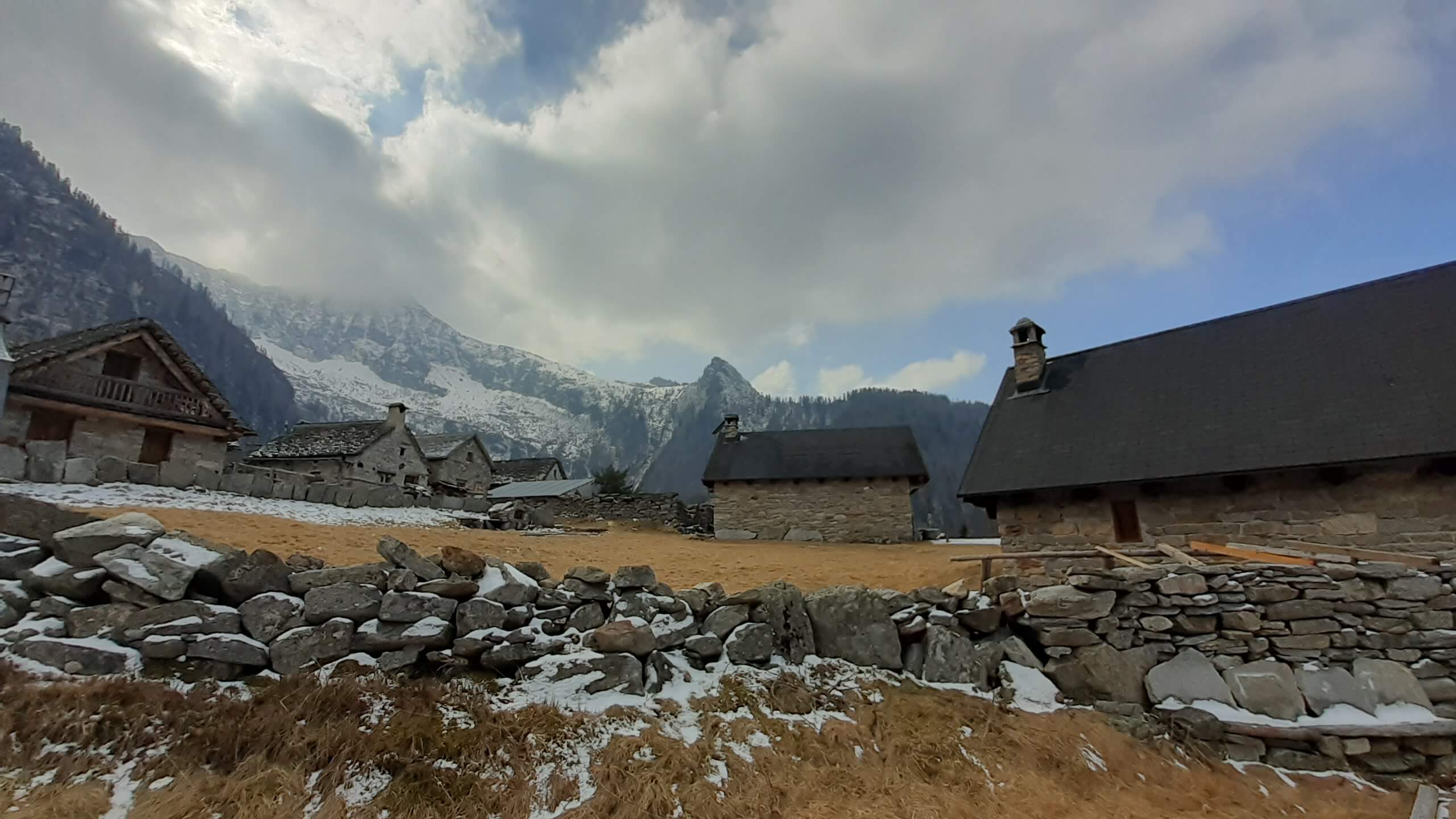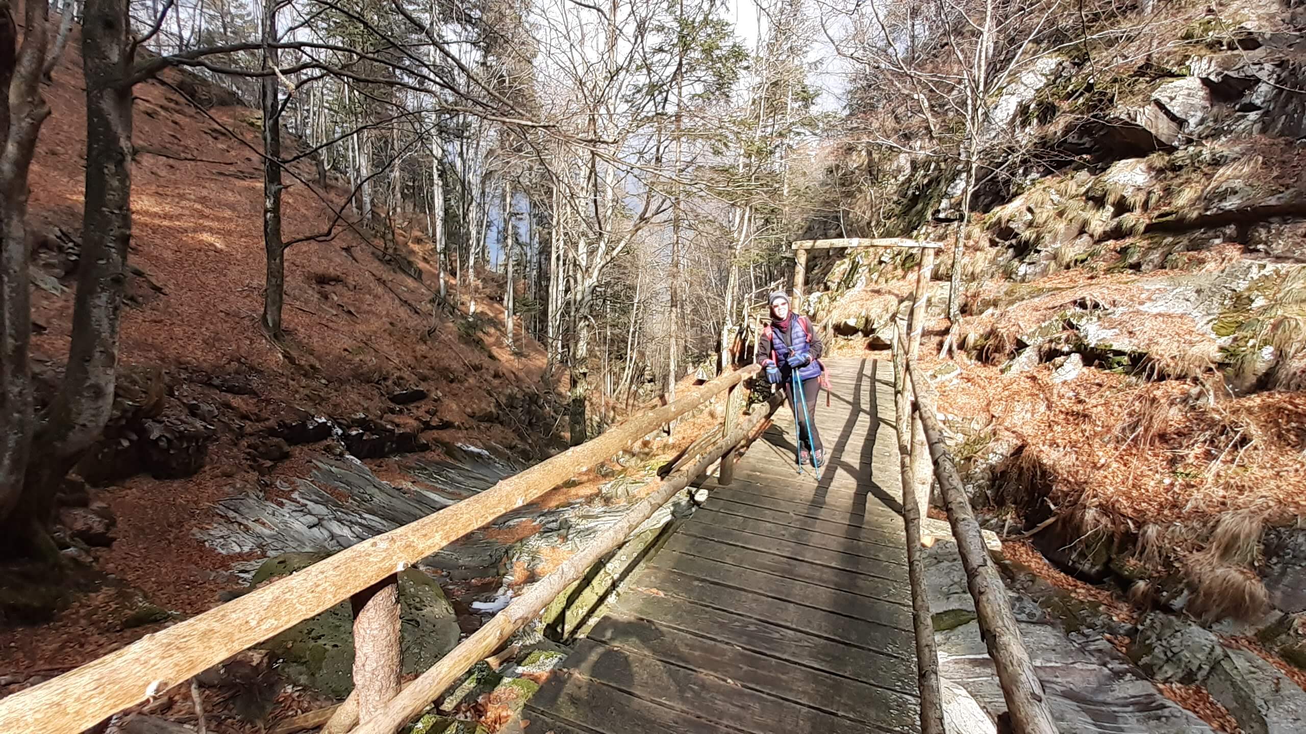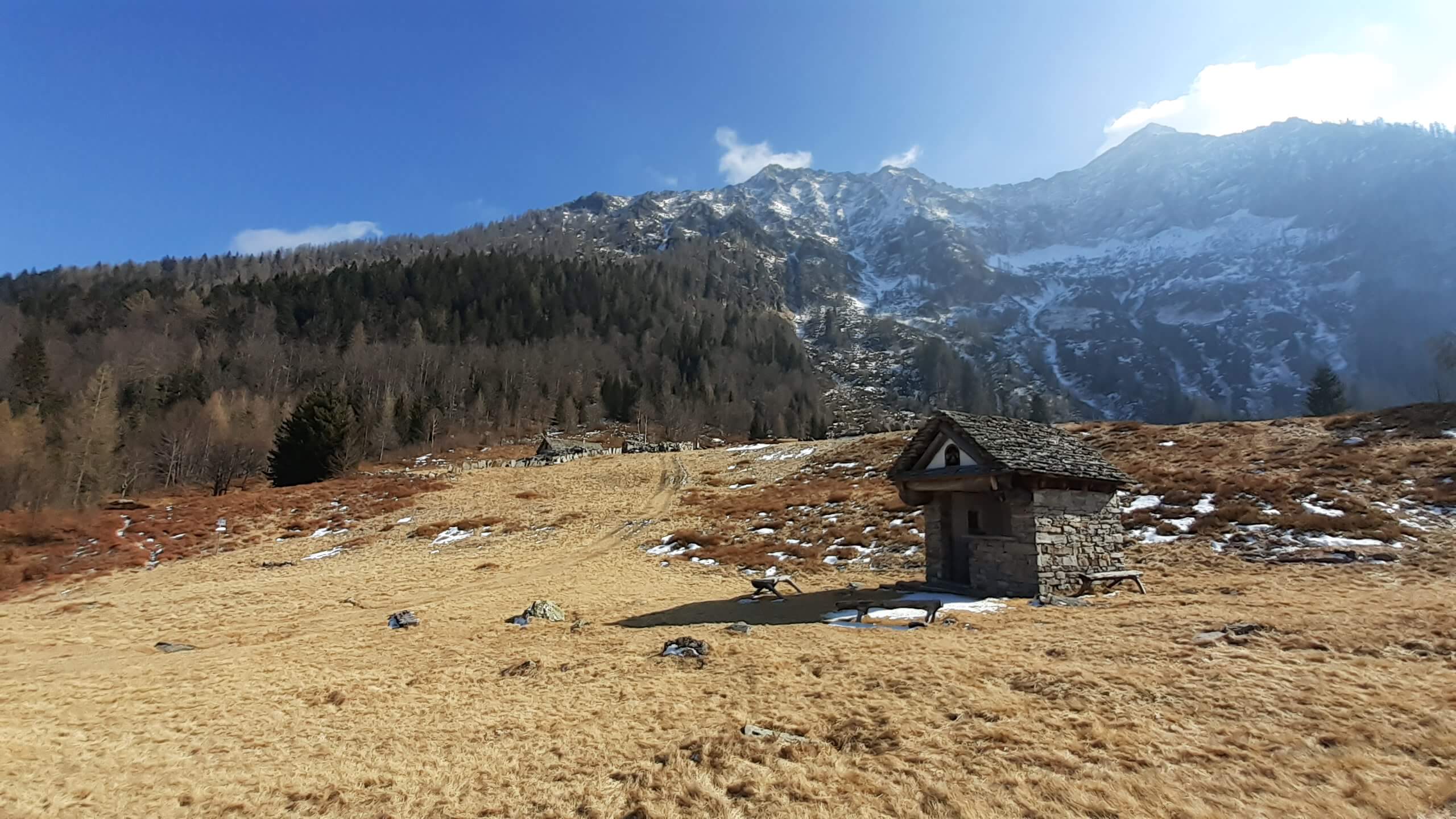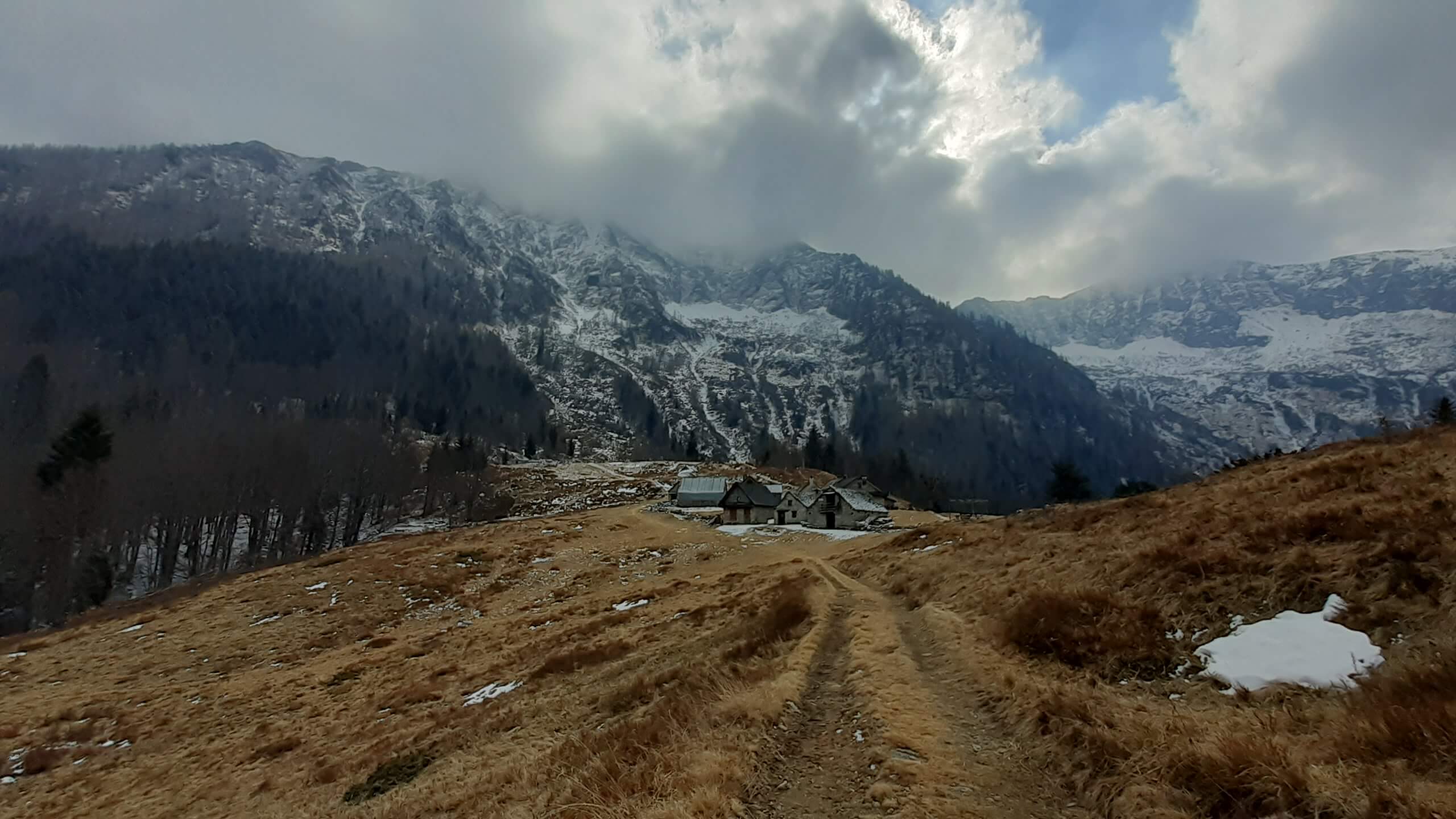 Ha nevicato nella notte e il tempo, questa mattina, non è dei migliori… quindi organizziamo una salita non particolarmente impegnativa ma bella e gratificante… Alpe Campra in Val Vigezzo. Arriviamo a Gagnone/Orcesco (località de comune di Druogno) e parcheggiamo davanti alla Chiesa di San Defendente di Gagnone (780 m); da qui raggiungiamo il vicino paesino di Orcesco, fino alla località Crotta (835 m). Qui è presente un bivio; a destra si sale su tornanti, ampi, comodi e meno ripidi… ma un po’ più lunghi; a sinistra si sale su mulattiera, un po’ più ripida e un po’ più corta. Scegliamo la mulattiera e saliamo nel bosco… in alcuni tratti è ancora presente la neve scesa nella notte. Arriviamo così al ponte sul Rio Lupo… molto bello e suggestivo e poi ad una grande casa ristrutturata; poi, su un breve sentiero, si arriva ai ruderi dell’ Alpe La Motta (1340 m). Da qui prendiamo a sinistra e, in pochi minuti, eccoci alla staccionata di legno dell’ ingresso dell’ Alpe Campra. Ancora qualche passo e… siamo davanti all’ Alpe Campra (1390 m)…. bellissima! Giriamo un po’ per l’ alpeggio e poi cerchiamo un posticino dove mangiare… oggi ci concediamo una pausa pranzo più lunga del solito! Raggiungiamo anche la Cascata di neve e ghiaccio e poi salutiamo l’ Alpe Campra (1390 m) e ci apprestiamo a scendere verso l’ Alpe La Motta (1340 m). Da qui decidiamo di scendere lungo i tornanti fino a tornare alla località Crotta di Orcesco (835 m). Da qui poi torniamo alla Chiesa di San Defendente a Gagnone (780 m). Giornata rilassante, gratificante… in compagnia della bellezza delle montagne.