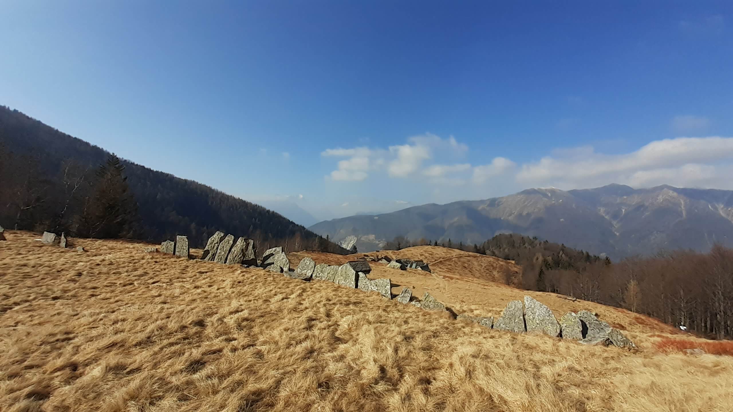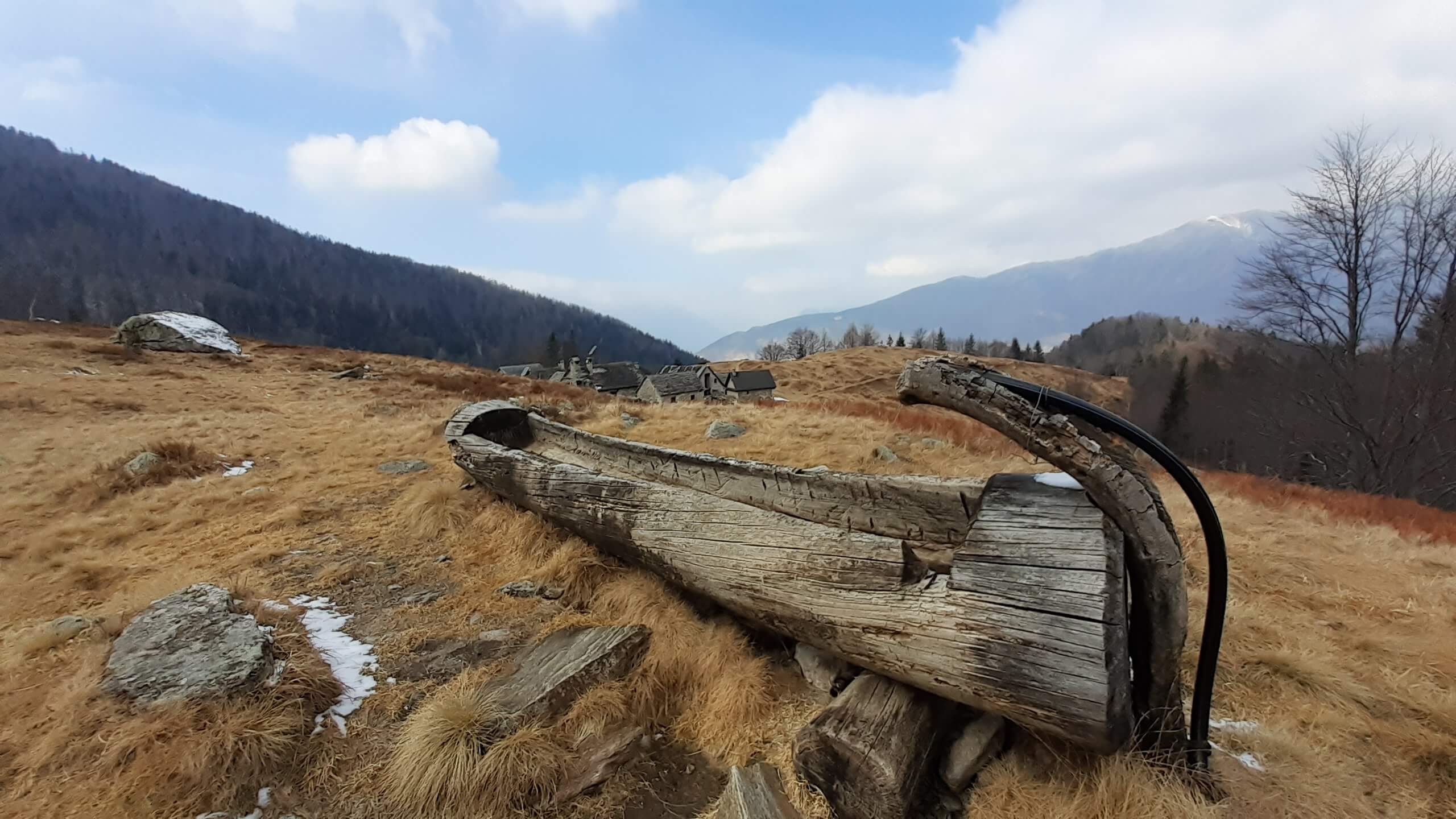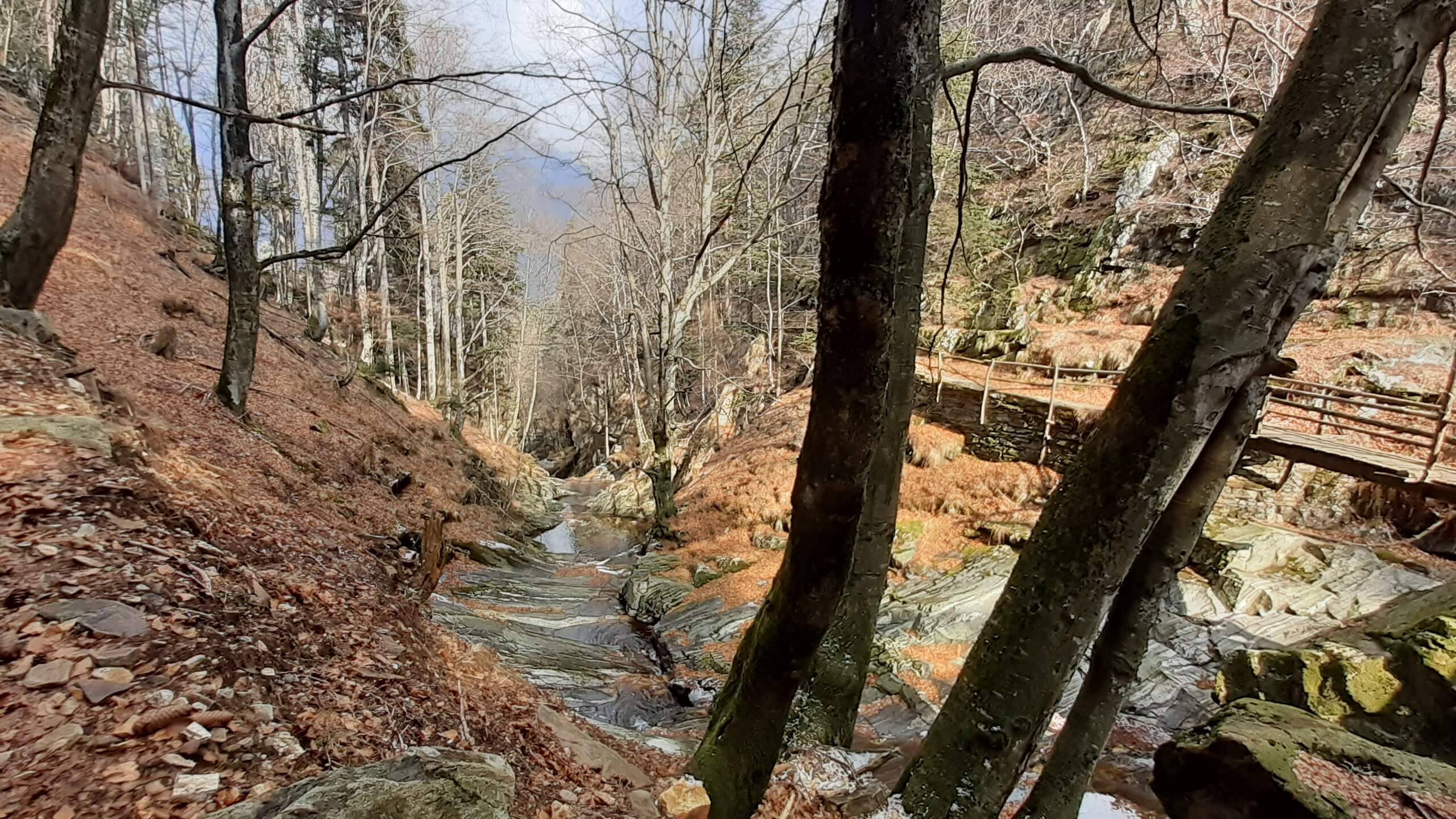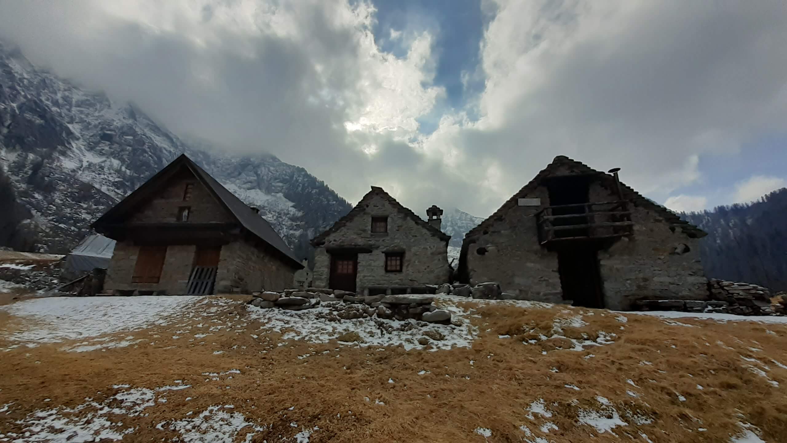 Ha nevicato nella notte e il tempo, questa mattina, non è dei migliori… quindi organizziamo una salita non particolarmente impegnativa ma bella e gratificante… Alpe Campra in Val Vigezzo. Arriviamo a Gagnone/Orcesco (località de comune di Druogno) e parcheggiamo davanti alla Chiesa di San Defendente di Gagnone (780 m); da qui raggiungiamo il vicino paesino di Orcesco, fino alla località Crotta (835 m). Qui è presente un bivio; a destra si sale su tornanti, ampi, comodi e meno ripidi… ma un po’ più lunghi; a sinistra si sale su mulattiera, un po’ più ripida e un po’ più corta. Scegliamo la mulattiera e saliamo nel bosco… in alcuni tratti è ancora presente la neve scesa nella notte. Arriviamo così al ponte sul Rio Lupo… molto bello e suggestivo e poi ad una grande casa ristrutturata; poi, su un breve sentiero, si arriva ai ruderi dell’ Alpe La Motta (1340 m). Da qui prendiamo a sinistra e, in pochi minuti, eccoci alla staccionata di legno dell’ ingresso dell’ Alpe Campra. Ancora qualche passo e… siamo davanti all’ Alpe Campra (1390 m)…. bellissima! Giriamo un po’ per l’ alpeggio e poi cerchiamo un posticino dove mangiare… oggi ci concediamo una pausa pranzo più lunga del solito! Raggiungiamo anche la Cascata di neve e ghiaccio e poi salutiamo l’ Alpe Campra (1390 m) e ci apprestiamo a scendere verso l’ Alpe La Motta (1340 m). Da qui decidiamo di scendere lungo i tornanti fino a tornare alla località Crotta di Orcesco (835 m). Da qui poi torniamo alla Chiesa di San Defendente a Gagnone (780 m). Giornata rilassante, gratificante… in compagnia della bellezza delle montagne.