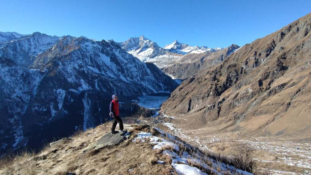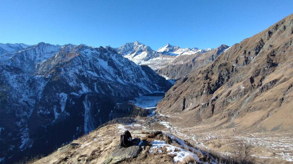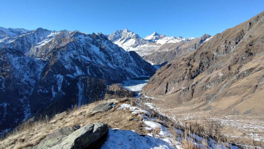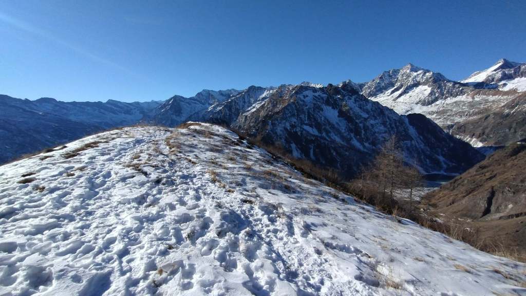 Oggi siamo in Valle Antrona. Partiamo dall’ Alpe Cheggio (1500 m) e, salendo sul versante del Passo del Fornalino, raggiungiamo l’ Alpe Meri (1750 m). Fin qui pochissima neve; un po’ di più prima dell’ Alpe Meri. Dall’ Alpe Meri, invece, si sale su poca neve “portante”… si sale bene anche solo con gli scarponi. Arriviamo al Cavallo di Ro (1895 m); pausa panino e poi scendiamo alla vicina Alpe Ro (1820 m); risaliamo al Cavallo di Ro (1895 m) e poi iniziamo la discesa… Alpe Meri (1750 m) e ritorno all’ Alpe Cheggio (1500 m). Continuiamo verso la Diga del Lago dei Cavalli e poi, in macchina, facciamo una sosta anche al Lago di Antrona per una breve camminata su un “tappeto di neve” bianchissima!
