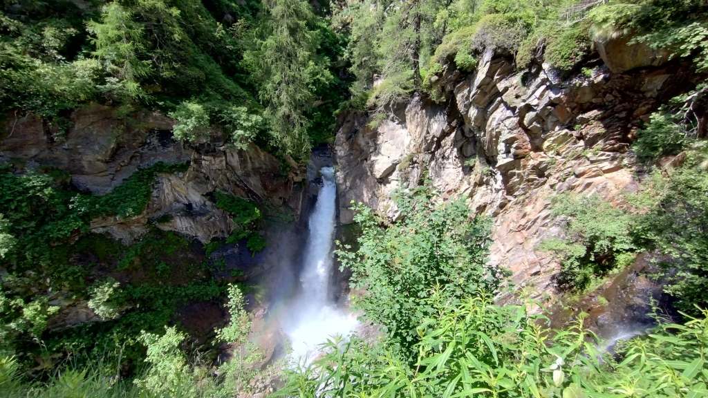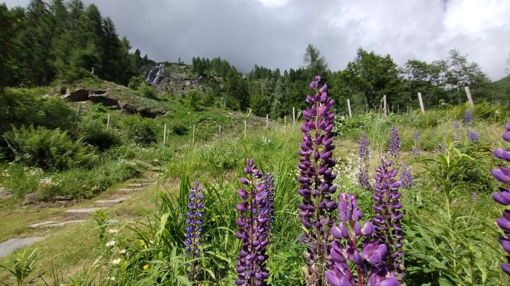Oggi siamo ad Alagna Valsesia, frazione Wold (1250 m) e da qui partiamo per raggiungere la Cascata dell’ Acqua Bianca (1500 m)… bellissimo “salto” carico di acqua spumeggiante! Da qui proseguiamo verso l’ Alpe Fum Bitz (1590 m), con una breve sosta alla Caldaia del Sesia… una bellissima cascata che scende tra le rocce! Dall’ Alpe Fum Bitz proseguiamo in direzione ‘Rifugio Barba Ferrero’ ma, a quota 1860 m, compaiono nuvoloni grigi e minacciosi… quindi… panino veloce e poi iniziamo a scendere. Decidiamo di “tagliare il percorso”, passando per l’ Alpe Safeiaz ma ci ritroviamo a “ravanare” tra erba e alberi, senza percorso e con ripidità piuttosto accentuata! Riusciamo ad intercettare il sentiero che ci porta alla trattorabile che seguiamo per salire all’ Alpe Mittlentail di qua e Mittlentail di là (1920 m). Iniziamo poi la discesa verso l’ Alpe Fum Bitz (1590 m) con breve visita al suo Giardino Botanico e poi al Rifugio Pastore (1575 m), dove facciamo una piccola pausa con vista Cascata dell’ Acqua Bianca da lontano, per poi continuare la discesa, lungo lo stesso percorso della salita, fino a tornare a Wold di Alagna Valsesia (1250 m).